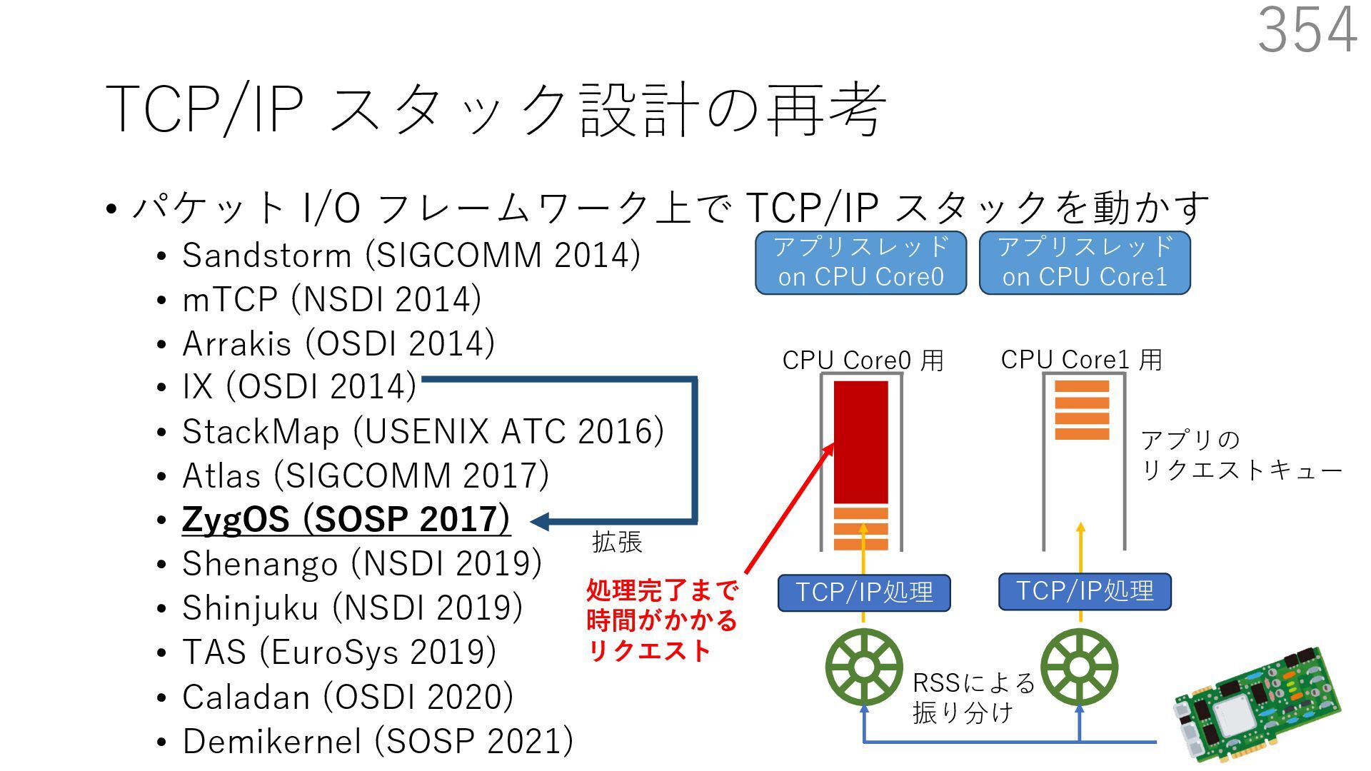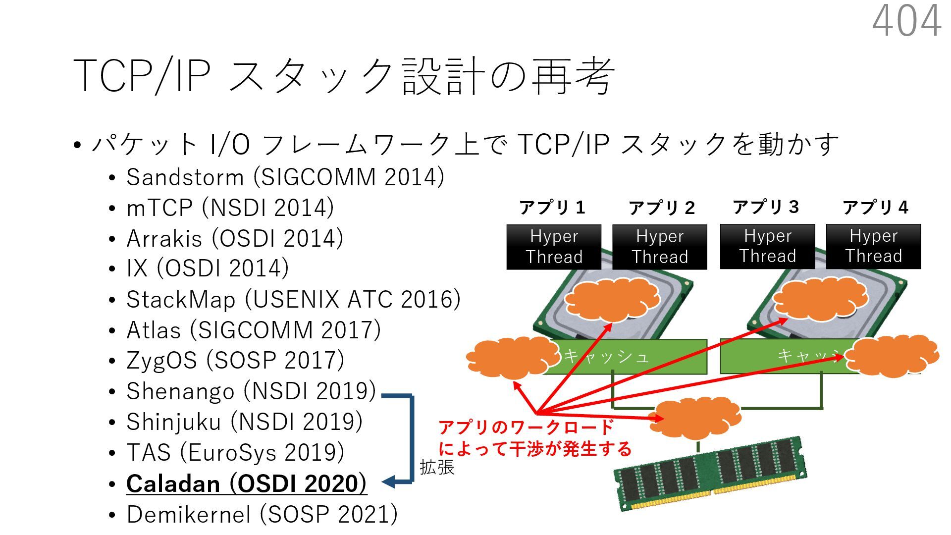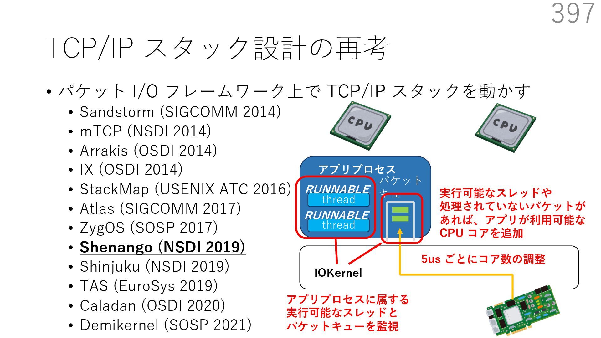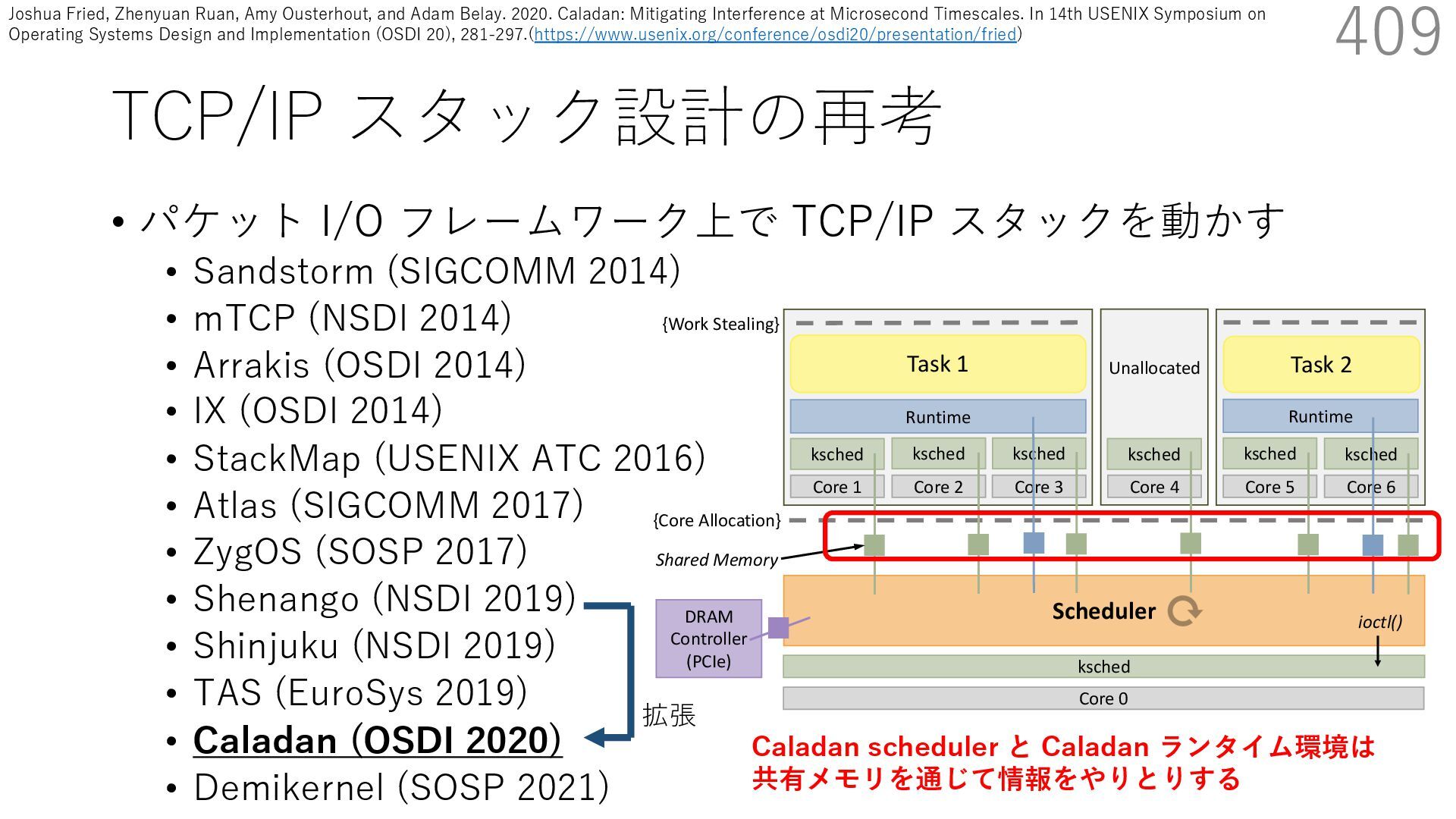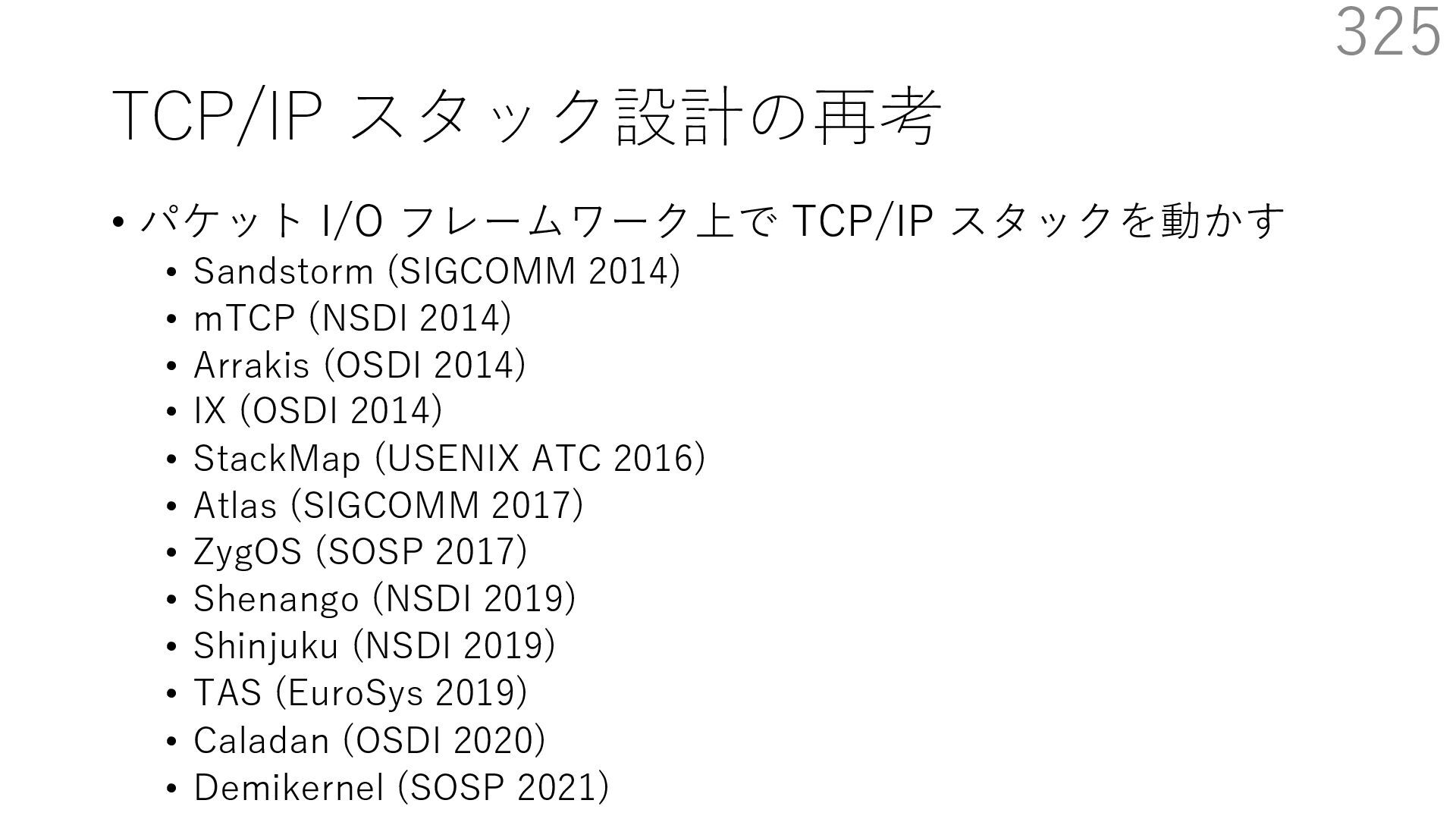 (SIGCOMM 2014) • mTCP (NSDI 2014) • Arrakis (OSDI 2014) • IX (OSDI 2014) • StackMap (USENIX ATC 2016) • Atlas (SIGCOMM 2017) • ZygOS (SOSP 2017) • Shenango (NSDI 2019) • Shinjuku (NSDI 2019) • TAS (EuroSys 2019) • Caladan (OSDI 2020) • Demikernel (SOSP 2021) 427 into a single library for both devices (e.g., RDMAxSPDK). We implemented the bulk of our library OS code in Rust. We initially prototyped several libOSes in C++; however, we found that Rust performs competitively with C++ and achieves ns-scale latencies while offering additional benefits. First, Rust enforces memory safety through language fea- tures and its compiler. Though our libOSes use unsafe code to bind to C/C++ kernel-bypass libraries and applications, User-space Software Kernel-space Software I/O Hardware I/O Device ??? libFuture ??? DPDK User I/O Buf. Mgmt libRDMA RDMA User I/O Buf. Mgmt Net. Trans. OS Kernel Control Path Demikernel Datapath Architecture App libPOSIX libDPDK SPDK User I/O Buf. Mgmt libSPDK Future Demikernel PDPIX Datapath API Figure 3. Demikernel kernel-bypass architecture. Demikernel ac- commodates heterogenous kernel-bypass devices, including poten- tial future hardware, with a flexible library OS-based datapath ar- chitecture.We include a libOS that goes through the OS kernel for 提案:異なるタイプのデバイスへ 共通のインターフェースからアクセス可能にする Irene Zhang, Amanda Raybuck, Pratyush Patel, Kirk Olynyk, Jacob Nelson, Omar S. Navarro Leija, Ashlie Martinez, Jing Liu, Anna Kornfeld Simpson, Sujay Jayakar, Pedro Henrique Penna, Max Demoulin, Piali Choudhury, and Anirudh Badam. 2021. The Demikernel Datapath OS Architecture for Microsecond-Scale Datacenter Systems. In Proceedings of the ACM Sigops 28th Symposium on Operating Systems Principles (SOSP ʼ21), 195-211.(https://doi.org/10.1145/3477132.3483569)