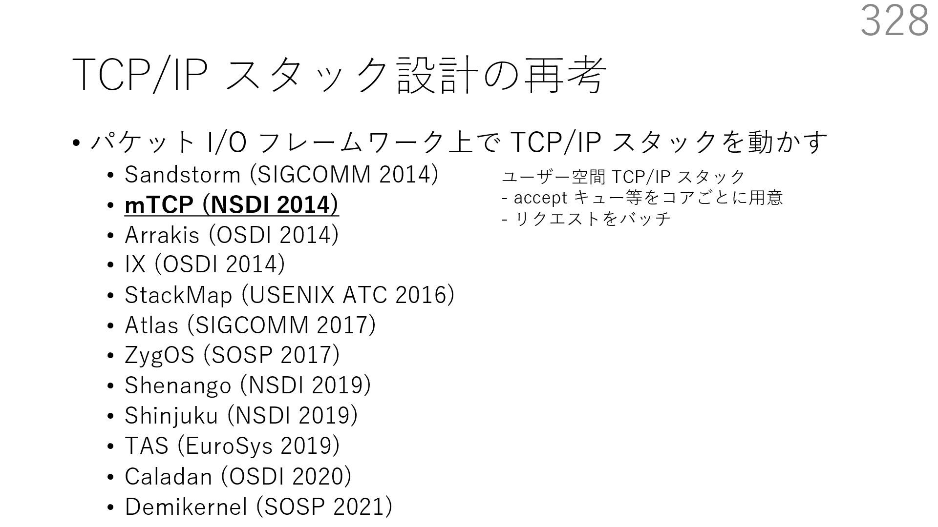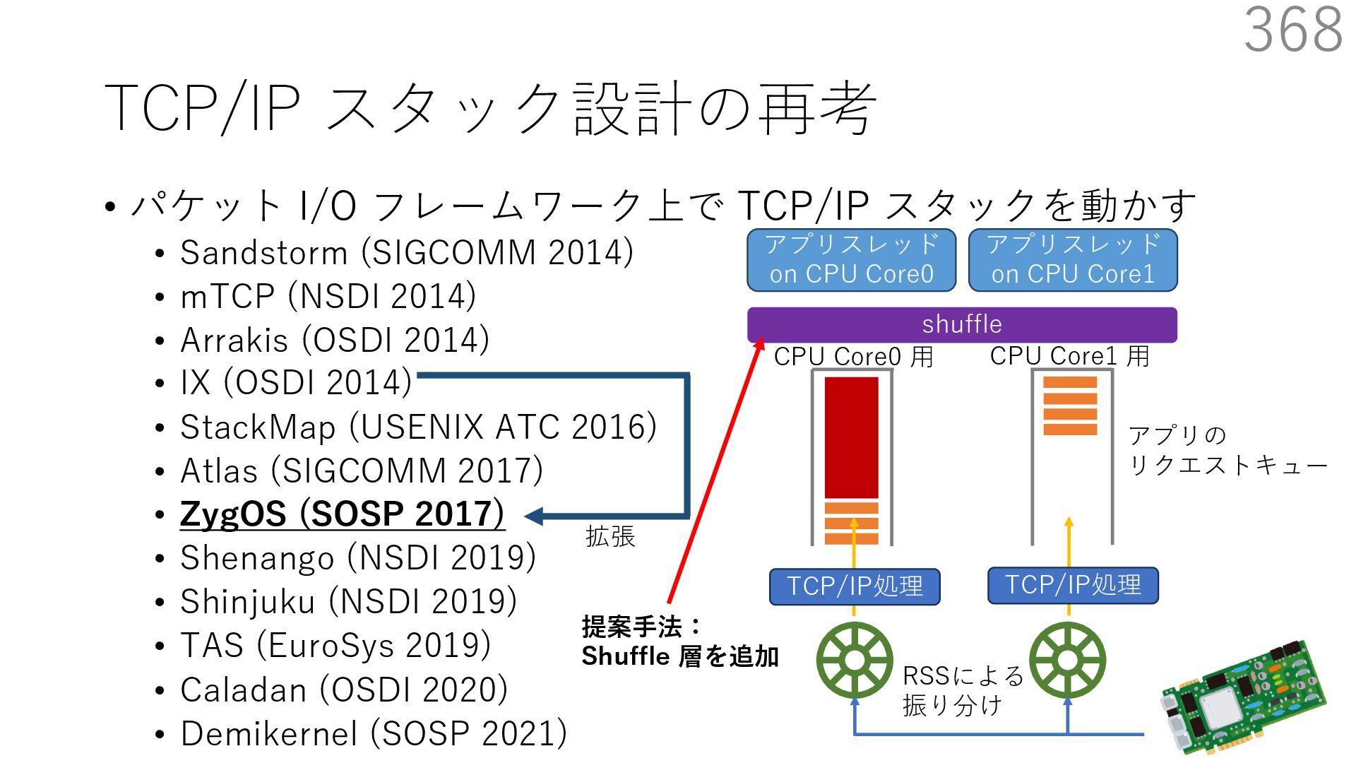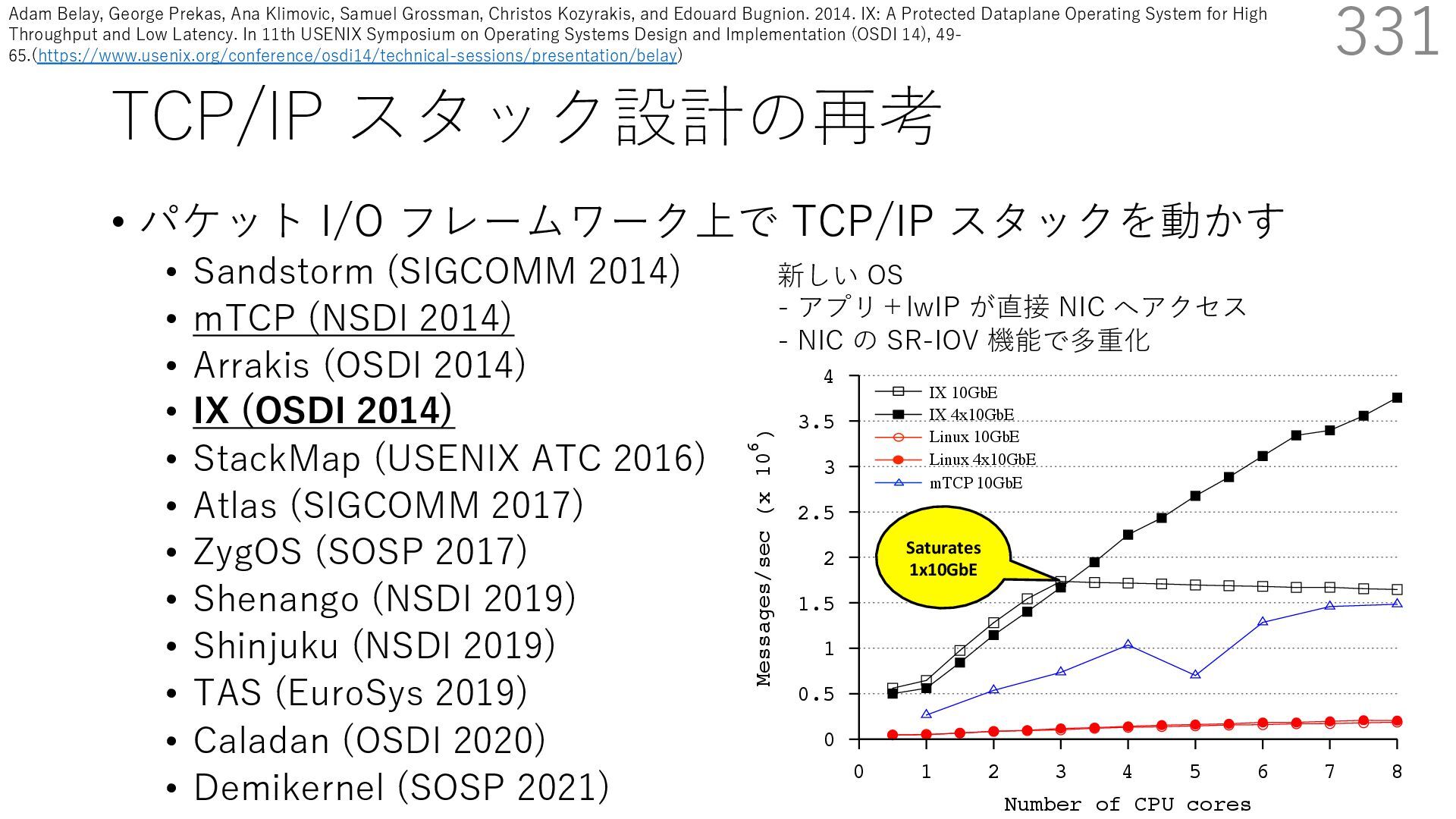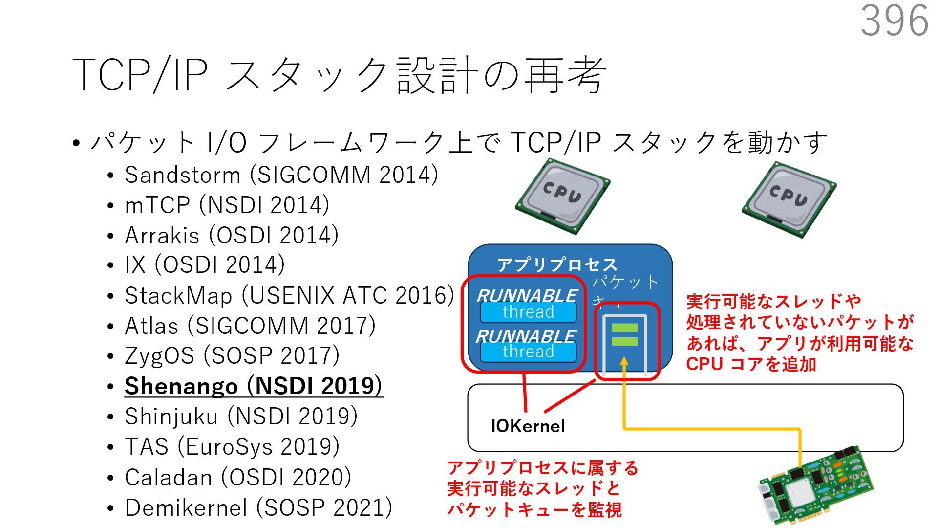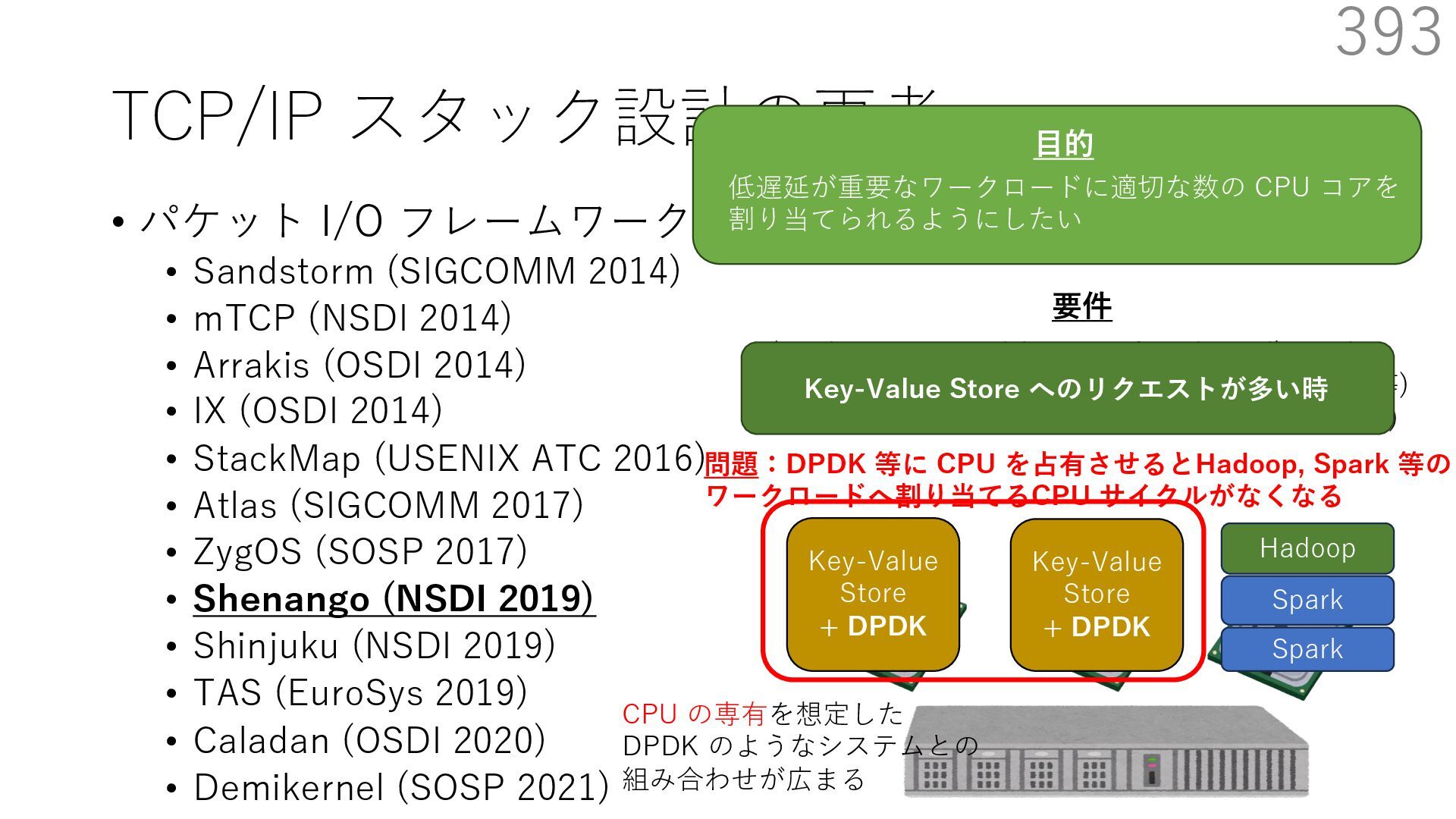 (SIGCOMM 2014) • mTCP (NSDI 2014) • Arrakis (OSDI 2014) • IX (OSDI 2014) • StackMap (USENIX ATC 2016) • Atlas (SIGCOMM 2017) • ZygOS (SOSP 2017) • Shenango (NSDI 2019) • Shinjuku (NSDI 2019) • TAS (EuroSys 2019) • Caladan (OSDI 2020) • Demikernel (SOSP 2021) 427 into a single library for both devices (e.g., RDMAxSPDK). We implemented the bulk of our library OS code in Rust. We initially prototyped several libOSes in C++; however, we found that Rust performs competitively with C++ and achieves ns-scale latencies while offering additional benefits. First, Rust enforces memory safety through language fea- tures and its compiler. Though our libOSes use unsafe code to bind to C/C++ kernel-bypass libraries and applications, User-space Software Kernel-space Software I/O Hardware I/O Device ??? libFuture ??? DPDK User I/O Buf. Mgmt libRDMA RDMA User I/O Buf. Mgmt Net. Trans. OS Kernel Control Path Demikernel Datapath Architecture App libPOSIX libDPDK SPDK User I/O Buf. Mgmt libSPDK Future Demikernel PDPIX Datapath API Figure 3. Demikernel kernel-bypass architecture. Demikernel ac- commodates heterogenous kernel-bypass devices, including poten- tial future hardware, with a flexible library OS-based datapath ar- chitecture.We include a libOS that goes through the OS kernel for 提案:異なるタイプのデバイスへ 共通のインターフェースからアクセス可能にする Irene Zhang, Amanda Raybuck, Pratyush Patel, Kirk Olynyk, Jacob Nelson, Omar S. Navarro Leija, Ashlie Martinez, Jing Liu, Anna Kornfeld Simpson, Sujay Jayakar, Pedro Henrique Penna, Max Demoulin, Piali Choudhury, and Anirudh Badam. 2021. The Demikernel Datapath OS Architecture for Microsecond-Scale Datacenter Systems. In Proceedings of the ACM Sigops 28th Symposium on Operating Systems Principles (SOSP ʼ21), 195-211.(https://doi.org/10.1145/3477132.3483569)