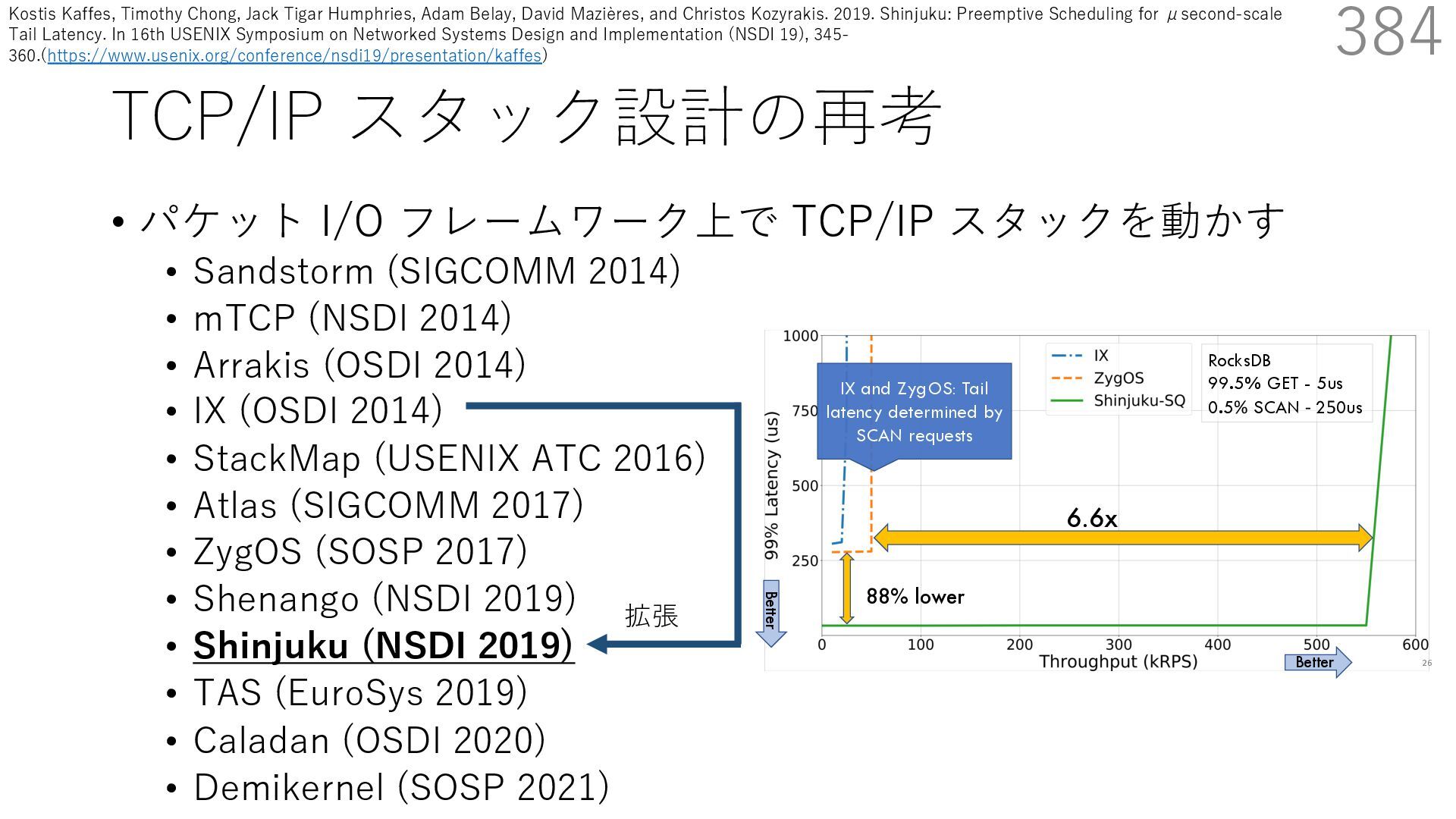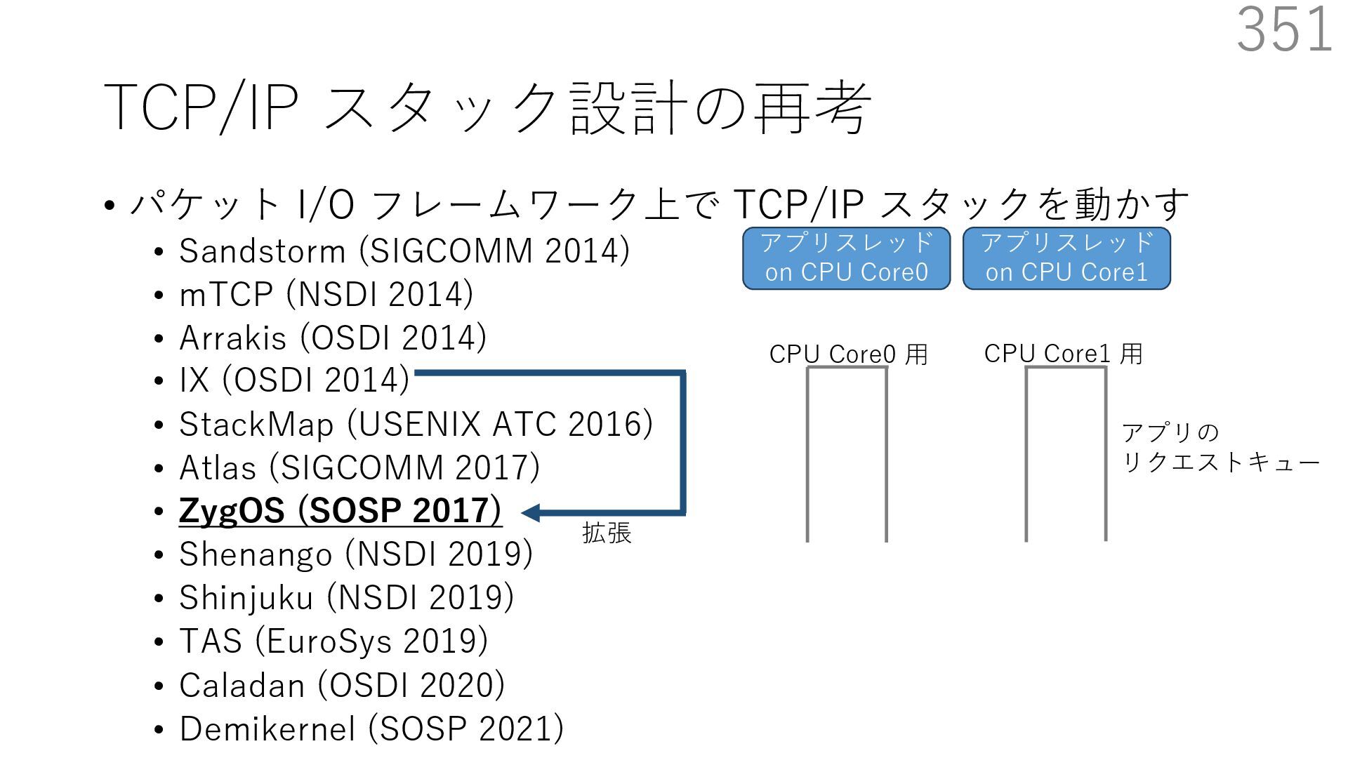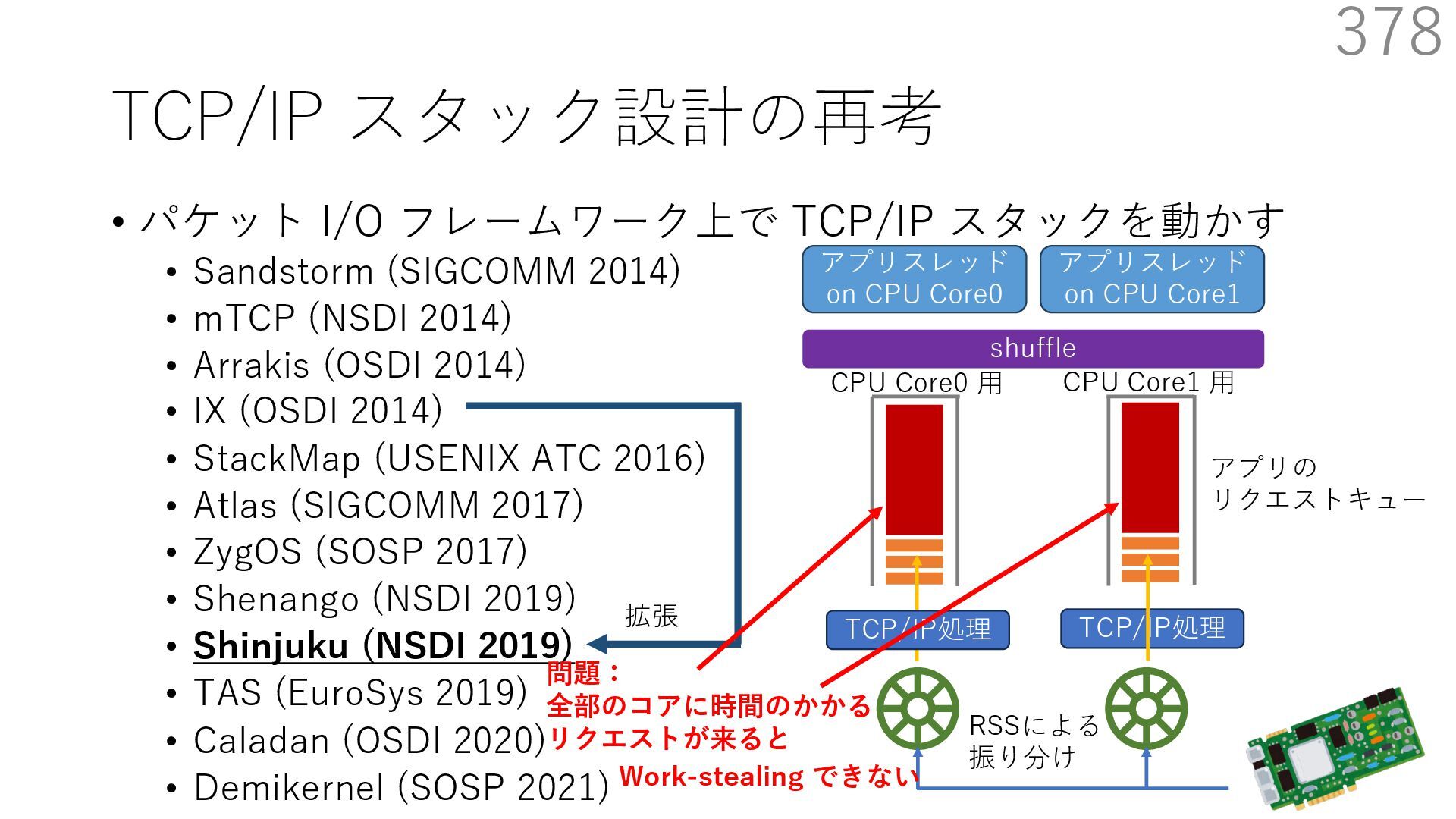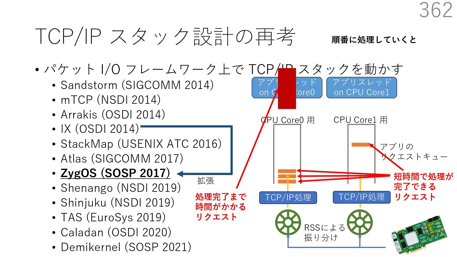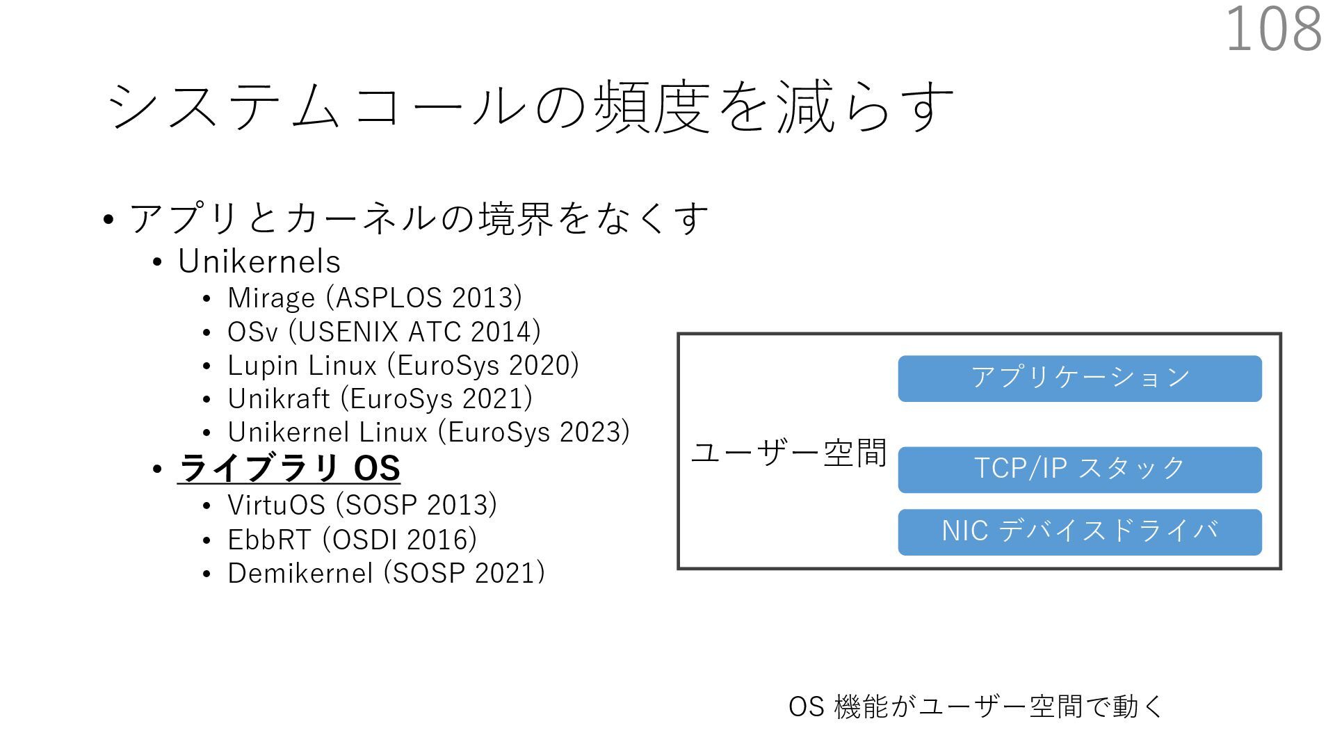 (SIGCOMM 2014) • mTCP (NSDI 2014) • Arrakis (OSDI 2014) • IX (OSDI 2014) • StackMap (USENIX ATC 2016) • Atlas (SIGCOMM 2017) • ZygOS (SOSP 2017) • Shenango (NSDI 2019) • Shinjuku (NSDI 2019) • TAS (EuroSys 2019) • Caladan (OSDI 2020) • Demikernel (SOSP 2021) 427 into a single library for both devices (e.g., RDMAxSPDK). We implemented the bulk of our library OS code in Rust. We initially prototyped several libOSes in C++; however, we found that Rust performs competitively with C++ and achieves ns-scale latencies while offering additional benefits. First, Rust enforces memory safety through language fea- tures and its compiler. Though our libOSes use unsafe code to bind to C/C++ kernel-bypass libraries and applications, User-space Software Kernel-space Software I/O Hardware I/O Device ??? libFuture ??? DPDK User I/O Buf. Mgmt libRDMA RDMA User I/O Buf. Mgmt Net. Trans. OS Kernel Control Path Demikernel Datapath Architecture App libPOSIX libDPDK SPDK User I/O Buf. Mgmt libSPDK Future Demikernel PDPIX Datapath API Figure 3. Demikernel kernel-bypass architecture. Demikernel ac- commodates heterogenous kernel-bypass devices, including poten- tial future hardware, with a flexible library OS-based datapath ar- chitecture.We include a libOS that goes through the OS kernel for 提案:異なるタイプのデバイスへ 共通のインターフェースからアクセス可能にする Irene Zhang, Amanda Raybuck, Pratyush Patel, Kirk Olynyk, Jacob Nelson, Omar S. Navarro Leija, Ashlie Martinez, Jing Liu, Anna Kornfeld Simpson, Sujay Jayakar, Pedro Henrique Penna, Max Demoulin, Piali Choudhury, and Anirudh Badam. 2021. The Demikernel Datapath OS Architecture for Microsecond-Scale Datacenter Systems. In Proceedings of the ACM Sigops 28th Symposium on Operating Systems Principles (SOSP ʼ21), 195-211.(https://doi.org/10.1145/3477132.3483569)
