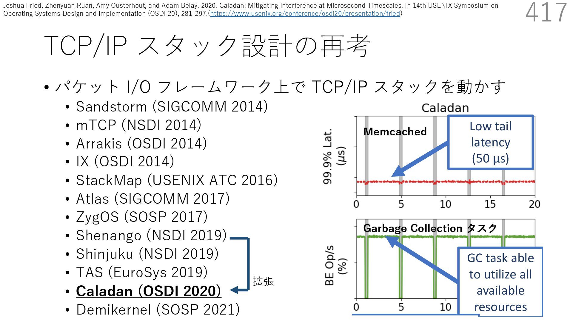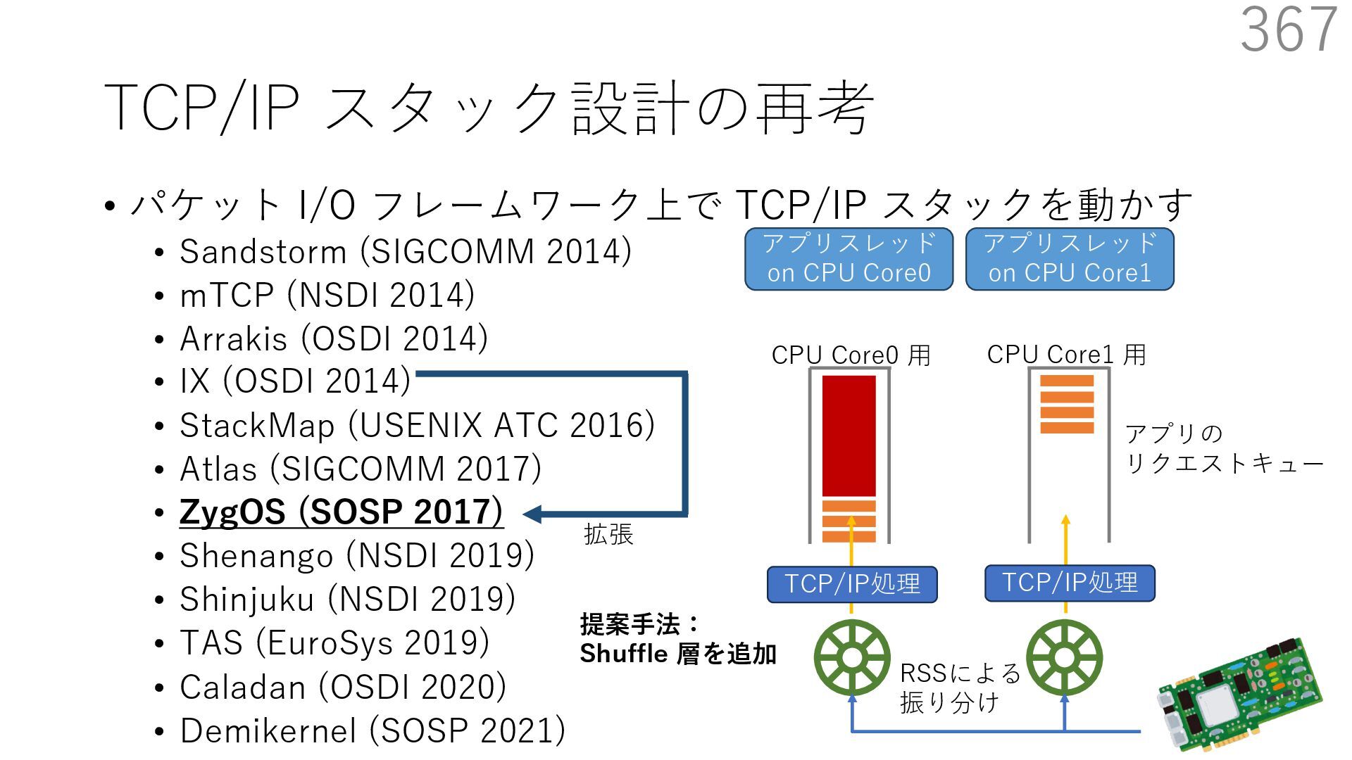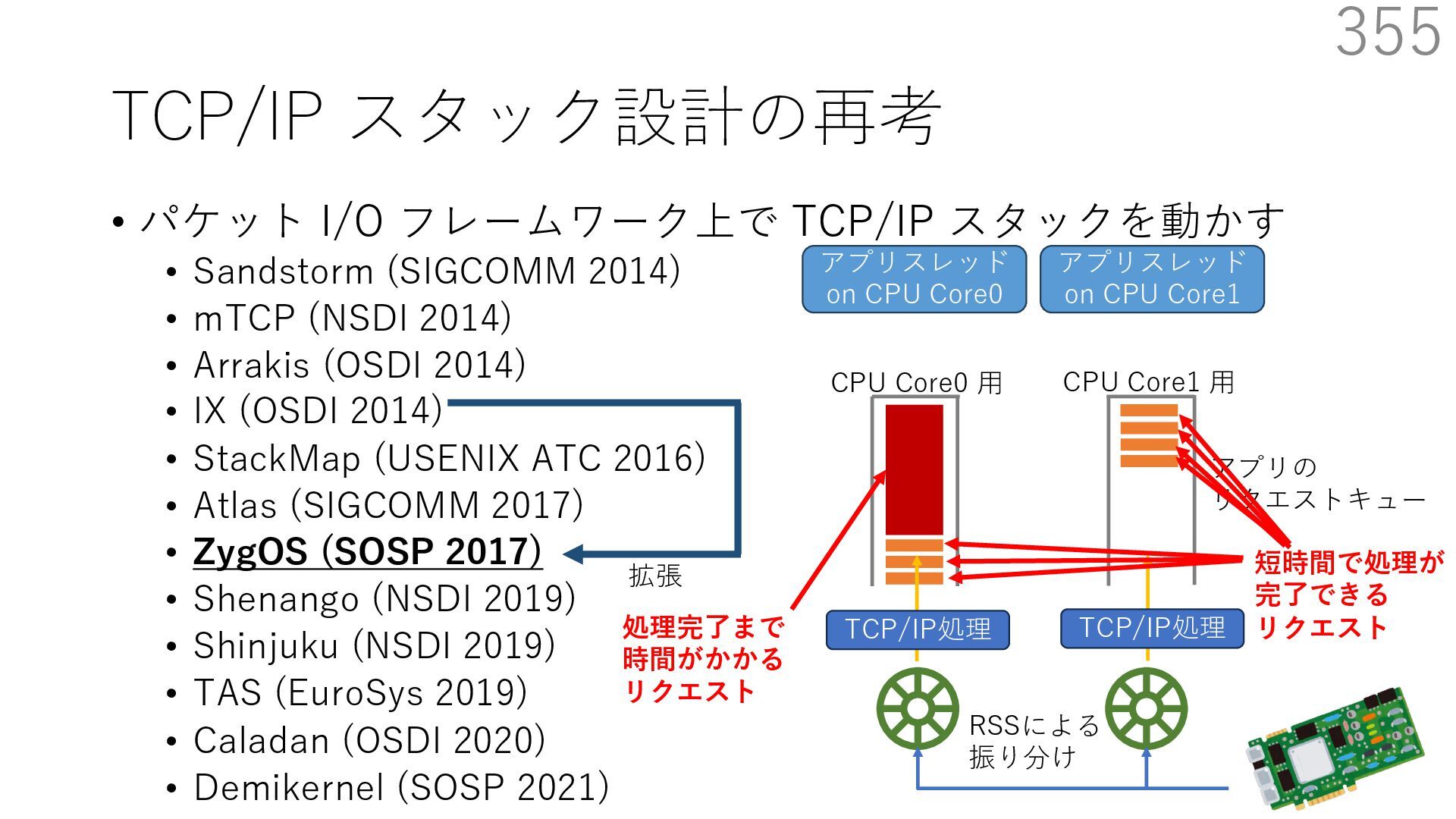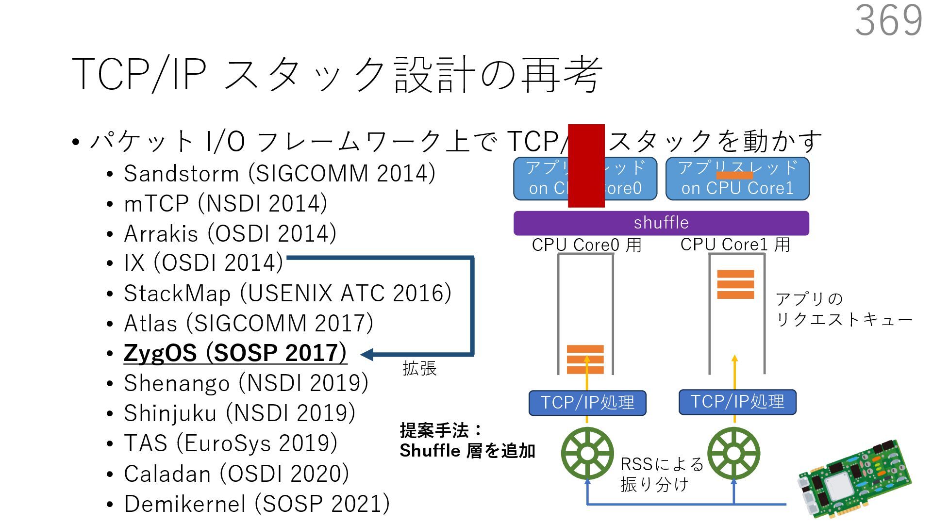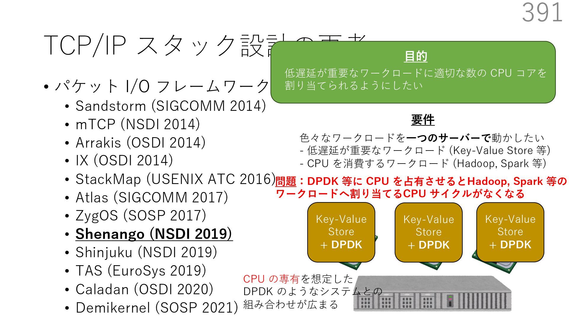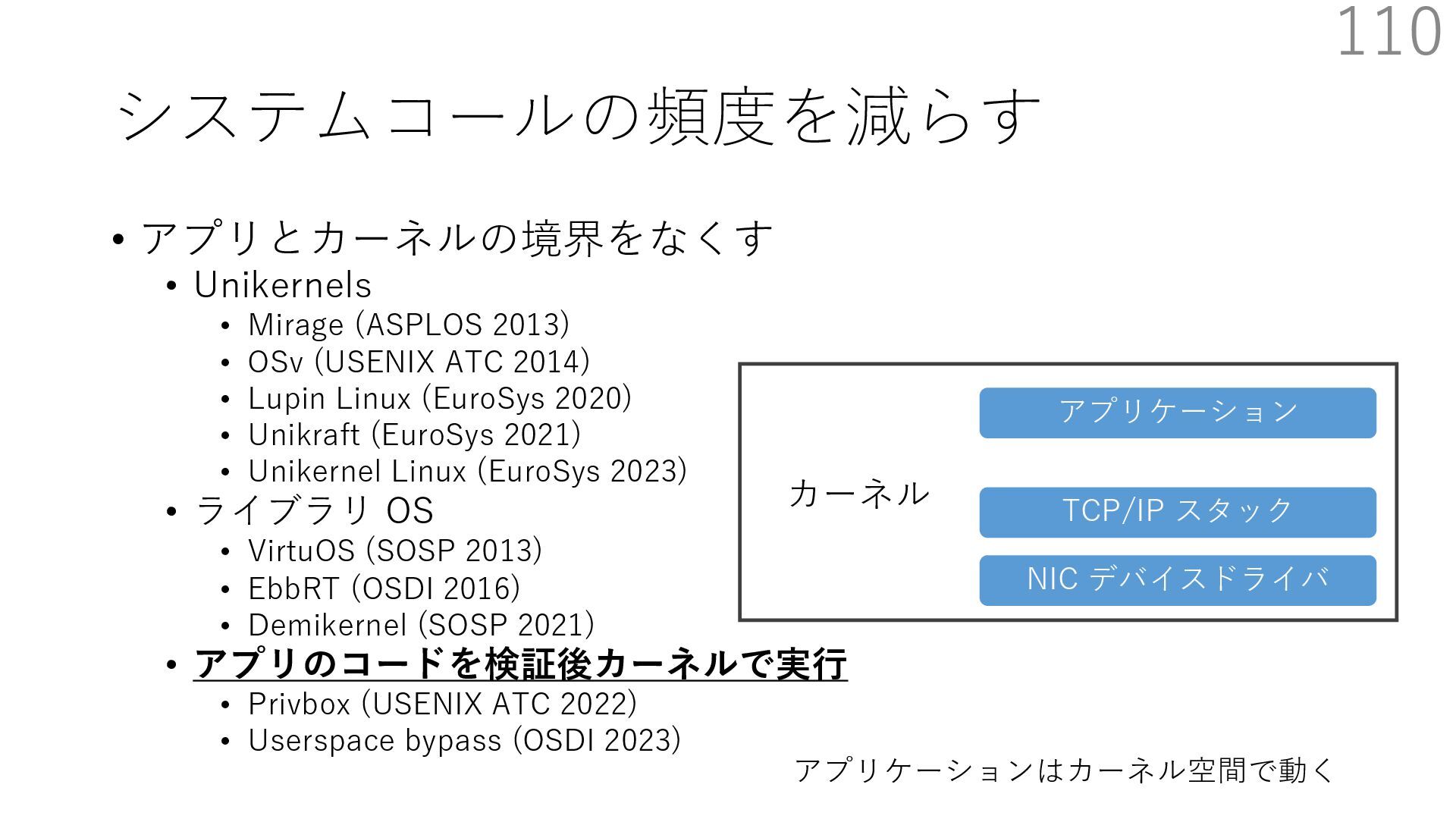 (SIGCOMM 2014) • mTCP (NSDI 2014) • Arrakis (OSDI 2014) • IX (OSDI 2014) • StackMap (USENIX ATC 2016) • Atlas (SIGCOMM 2017) • ZygOS (SOSP 2017) • Shenango (NSDI 2019) • Shinjuku (NSDI 2019) • TAS (EuroSys 2019) • Caladan (OSDI 2020) • Demikernel (SOSP 2021) 427 into a single library for both devices (e.g., RDMAxSPDK). We implemented the bulk of our library OS code in Rust. We initially prototyped several libOSes in C++; however, we found that Rust performs competitively with C++ and achieves ns-scale latencies while offering additional benefits. First, Rust enforces memory safety through language fea- tures and its compiler. Though our libOSes use unsafe code to bind to C/C++ kernel-bypass libraries and applications, User-space Software Kernel-space Software I/O Hardware I/O Device ??? libFuture ??? DPDK User I/O Buf. Mgmt libRDMA RDMA User I/O Buf. Mgmt Net. Trans. OS Kernel Control Path Demikernel Datapath Architecture App libPOSIX libDPDK SPDK User I/O Buf. Mgmt libSPDK Future Demikernel PDPIX Datapath API Figure 3. Demikernel kernel-bypass architecture. Demikernel ac- commodates heterogenous kernel-bypass devices, including poten- tial future hardware, with a flexible library OS-based datapath ar- chitecture.We include a libOS that goes through the OS kernel for 提案:異なるタイプのデバイスへ 共通のインターフェースからアクセス可能にする Irene Zhang, Amanda Raybuck, Pratyush Patel, Kirk Olynyk, Jacob Nelson, Omar S. Navarro Leija, Ashlie Martinez, Jing Liu, Anna Kornfeld Simpson, Sujay Jayakar, Pedro Henrique Penna, Max Demoulin, Piali Choudhury, and Anirudh Badam. 2021. The Demikernel Datapath OS Architecture for Microsecond-Scale Datacenter Systems. In Proceedings of the ACM Sigops 28th Symposium on Operating Systems Principles (SOSP ʼ21), 195-211.(https://doi.org/10.1145/3477132.3483569)