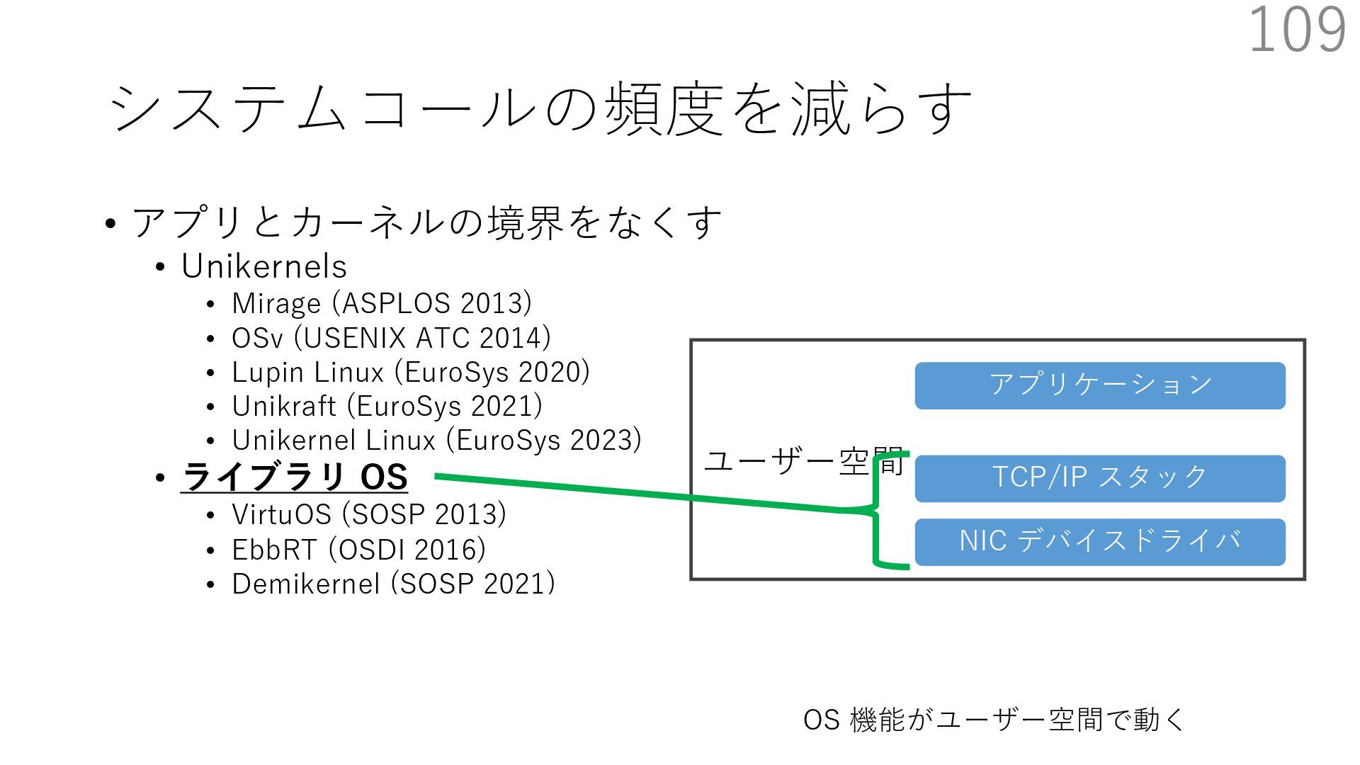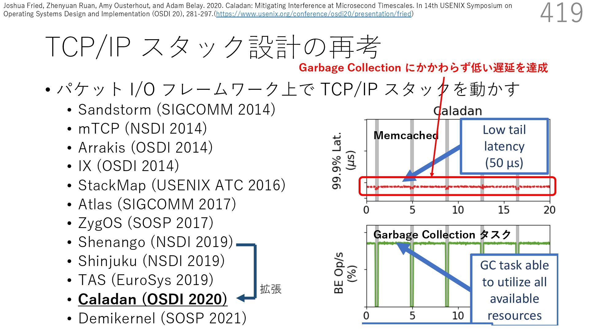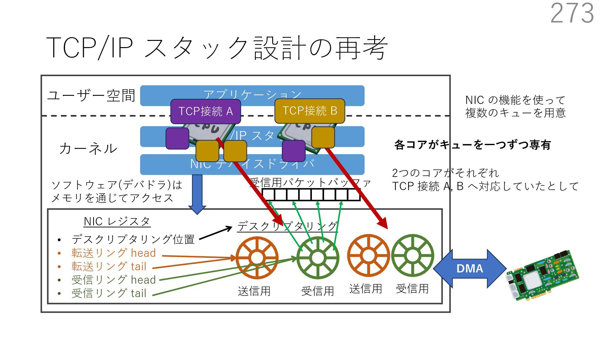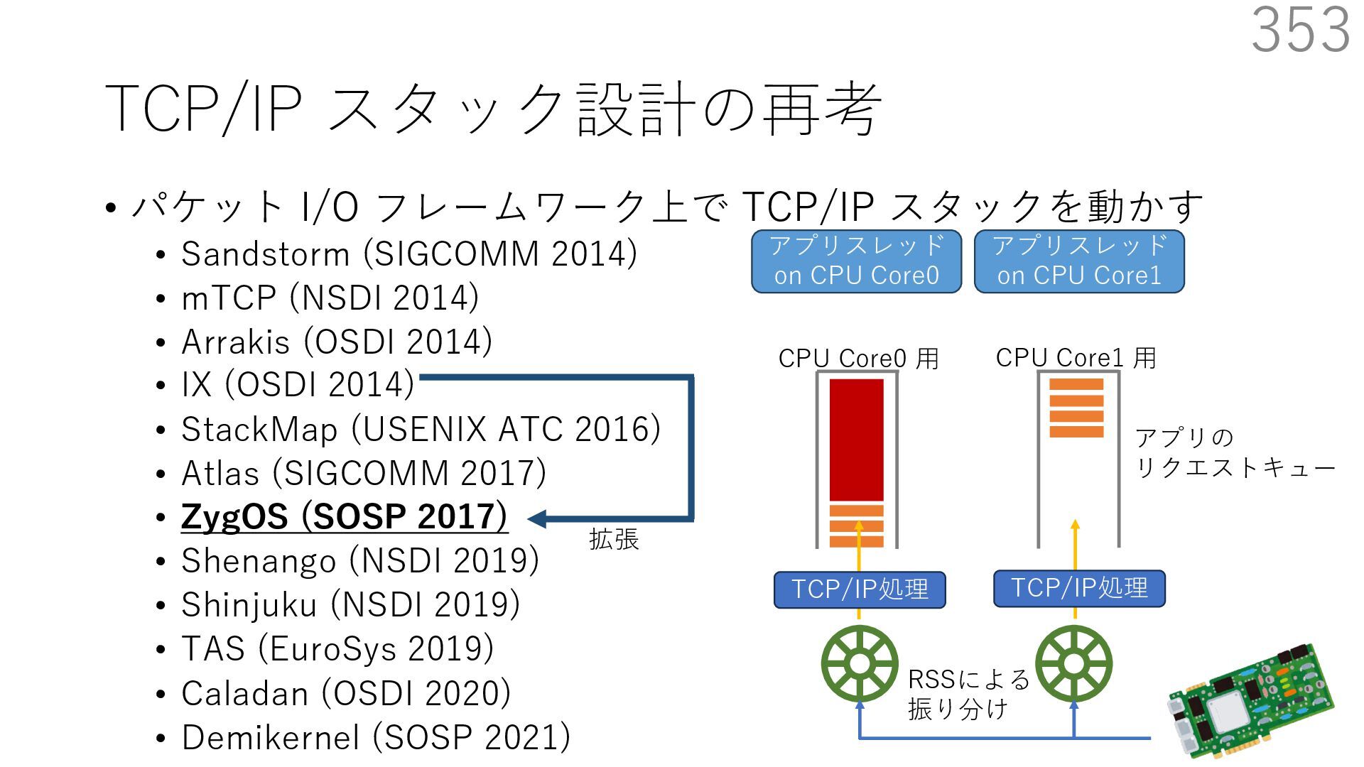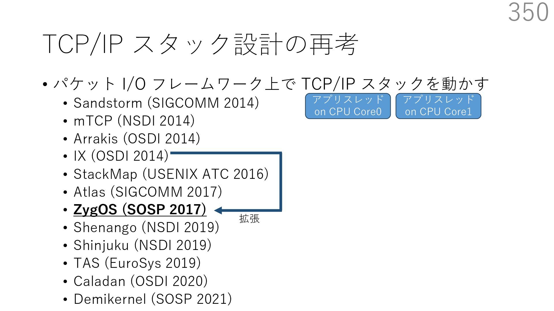 (SIGCOMM 2014) • mTCP (NSDI 2014) • Arrakis (OSDI 2014) • IX (OSDI 2014) • StackMap (USENIX ATC 2016) • Atlas (SIGCOMM 2017) • ZygOS (SOSP 2017) • Shenango (NSDI 2019) • Shinjuku (NSDI 2019) • TAS (EuroSys 2019) • Caladan (OSDI 2020) • Demikernel (SOSP 2021) 427 into a single library for both devices (e.g., RDMAxSPDK). We implemented the bulk of our library OS code in Rust. We initially prototyped several libOSes in C++; however, we found that Rust performs competitively with C++ and achieves ns-scale latencies while offering additional benefits. First, Rust enforces memory safety through language fea- tures and its compiler. Though our libOSes use unsafe code to bind to C/C++ kernel-bypass libraries and applications, User-space Software Kernel-space Software I/O Hardware I/O Device ??? libFuture ??? DPDK User I/O Buf. Mgmt libRDMA RDMA User I/O Buf. Mgmt Net. Trans. OS Kernel Control Path Demikernel Datapath Architecture App libPOSIX libDPDK SPDK User I/O Buf. Mgmt libSPDK Future Demikernel PDPIX Datapath API Figure 3. Demikernel kernel-bypass architecture. Demikernel ac- commodates heterogenous kernel-bypass devices, including poten- tial future hardware, with a flexible library OS-based datapath ar- chitecture.We include a libOS that goes through the OS kernel for 提案:異なるタイプのデバイスへ 共通のインターフェースからアクセス可能にする Irene Zhang, Amanda Raybuck, Pratyush Patel, Kirk Olynyk, Jacob Nelson, Omar S. Navarro Leija, Ashlie Martinez, Jing Liu, Anna Kornfeld Simpson, Sujay Jayakar, Pedro Henrique Penna, Max Demoulin, Piali Choudhury, and Anirudh Badam. 2021. The Demikernel Datapath OS Architecture for Microsecond-Scale Datacenter Systems. In Proceedings of the ACM Sigops 28th Symposium on Operating Systems Principles (SOSP ʼ21), 195-211.(https://doi.org/10.1145/3477132.3483569)
