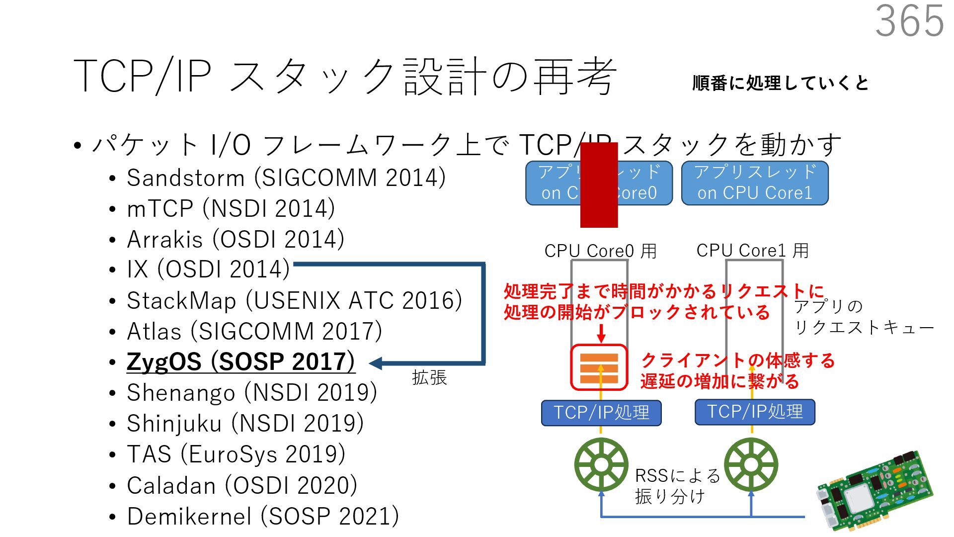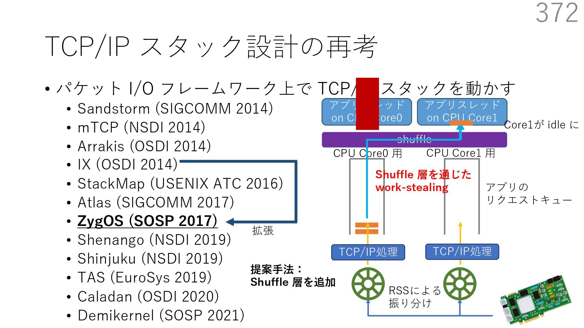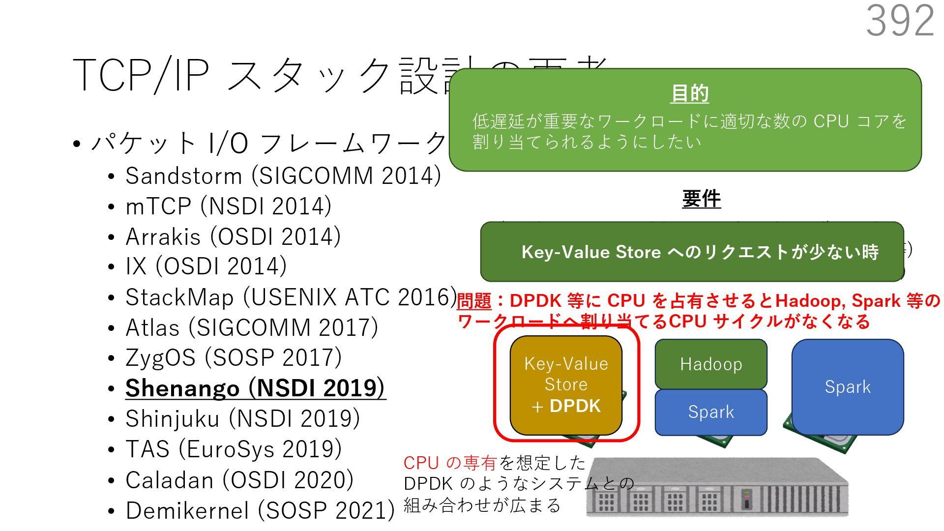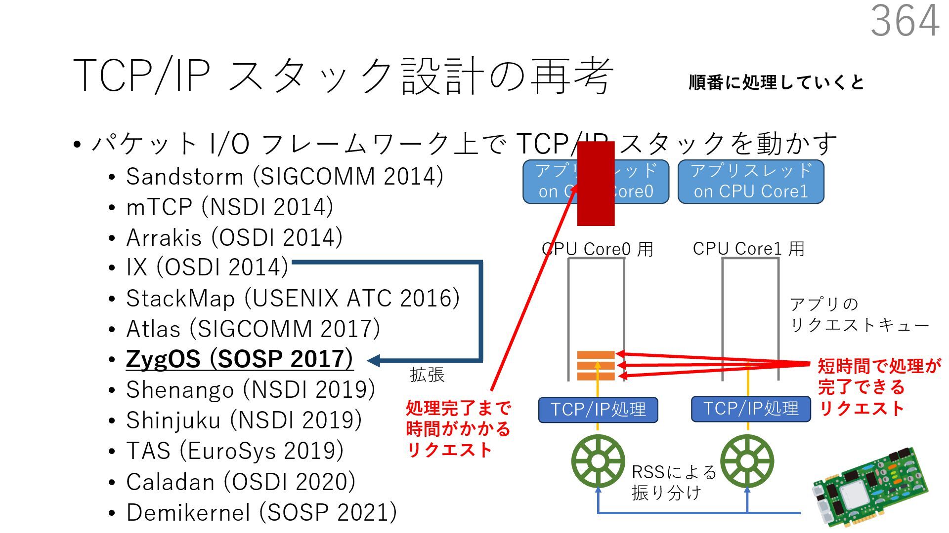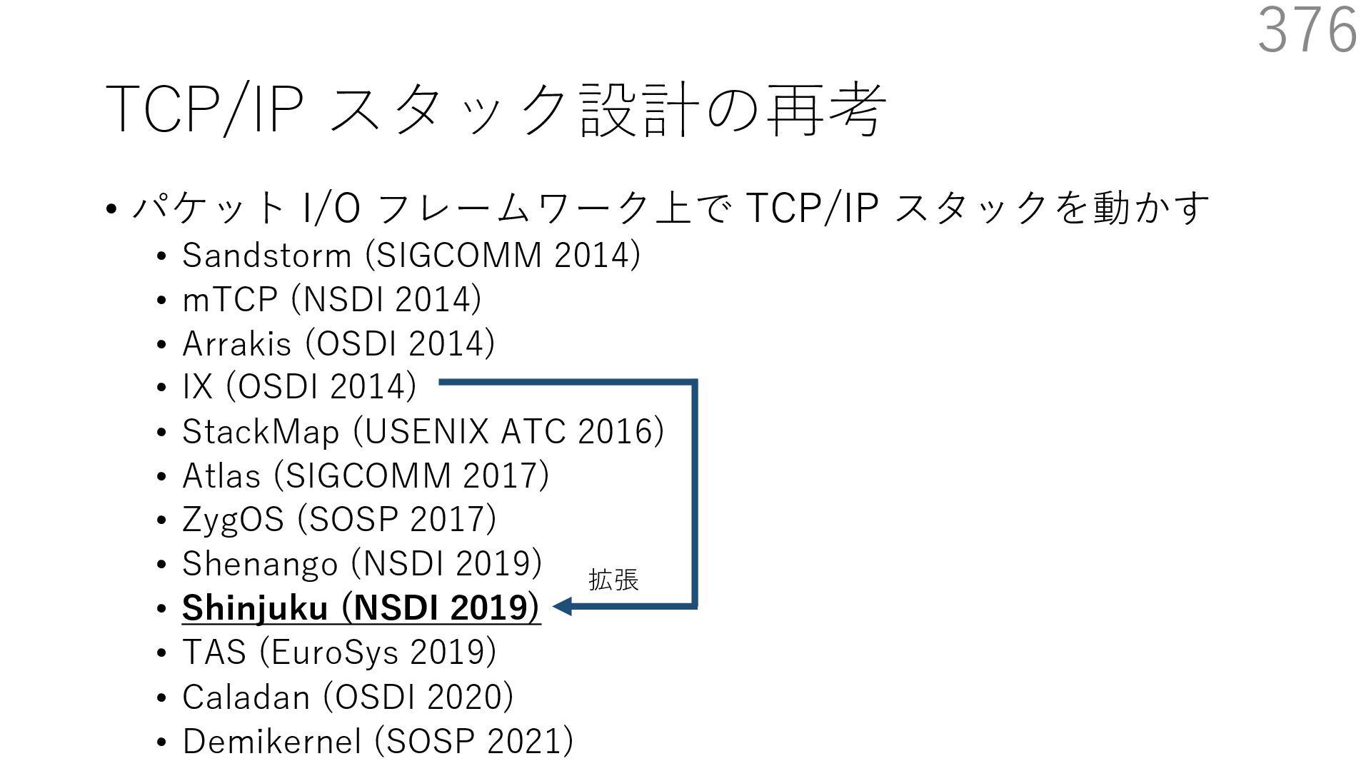 (SIGCOMM 2014) • mTCP (NSDI 2014) • Arrakis (OSDI 2014) • IX (OSDI 2014) • StackMap (USENIX ATC 2016) • Atlas (SIGCOMM 2017) • ZygOS (SOSP 2017) • Shenango (NSDI 2019) • Shinjuku (NSDI 2019) • TAS (EuroSys 2019) • Caladan (OSDI 2020) • Demikernel (SOSP 2021) 427 into a single library for both devices (e.g., RDMAxSPDK). We implemented the bulk of our library OS code in Rust. We initially prototyped several libOSes in C++; however, we found that Rust performs competitively with C++ and achieves ns-scale latencies while offering additional benefits. First, Rust enforces memory safety through language fea- tures and its compiler. Though our libOSes use unsafe code to bind to C/C++ kernel-bypass libraries and applications, User-space Software Kernel-space Software I/O Hardware I/O Device ??? libFuture ??? DPDK User I/O Buf. Mgmt libRDMA RDMA User I/O Buf. Mgmt Net. Trans. OS Kernel Control Path Demikernel Datapath Architecture App libPOSIX libDPDK SPDK User I/O Buf. Mgmt libSPDK Future Demikernel PDPIX Datapath API Figure 3. Demikernel kernel-bypass architecture. Demikernel ac- commodates heterogenous kernel-bypass devices, including poten- tial future hardware, with a flexible library OS-based datapath ar- chitecture.We include a libOS that goes through the OS kernel for 提案:異なるタイプのデバイスへ 共通のインターフェースからアクセス可能にする Irene Zhang, Amanda Raybuck, Pratyush Patel, Kirk Olynyk, Jacob Nelson, Omar S. Navarro Leija, Ashlie Martinez, Jing Liu, Anna Kornfeld Simpson, Sujay Jayakar, Pedro Henrique Penna, Max Demoulin, Piali Choudhury, and Anirudh Badam. 2021. The Demikernel Datapath OS Architecture for Microsecond-Scale Datacenter Systems. In Proceedings of the ACM Sigops 28th Symposium on Operating Systems Principles (SOSP ʼ21), 195-211.(https://doi.org/10.1145/3477132.3483569)