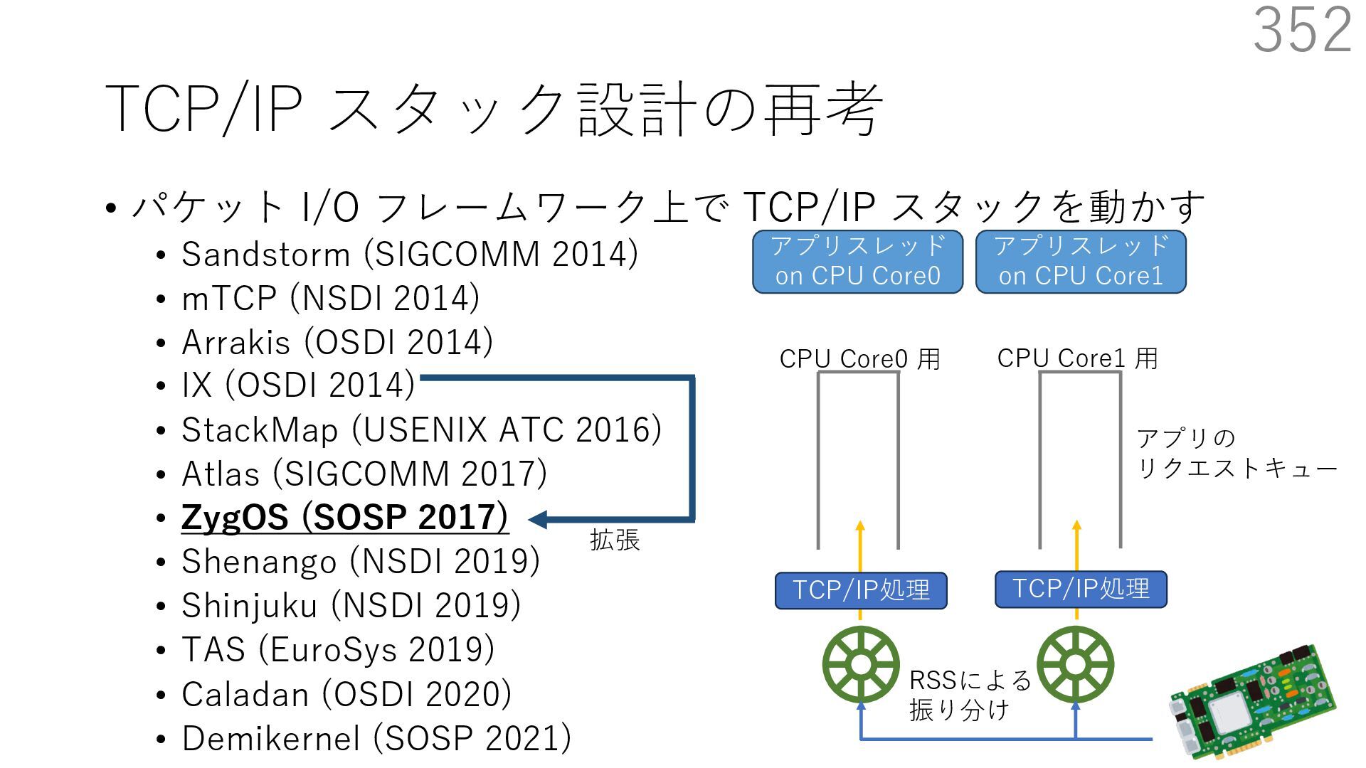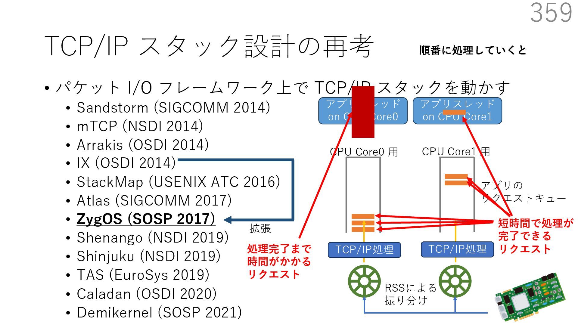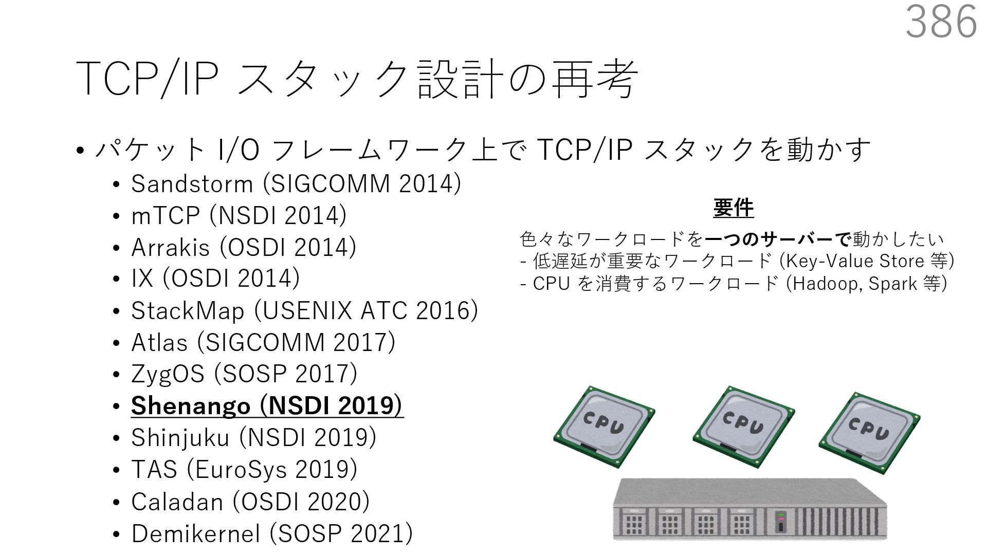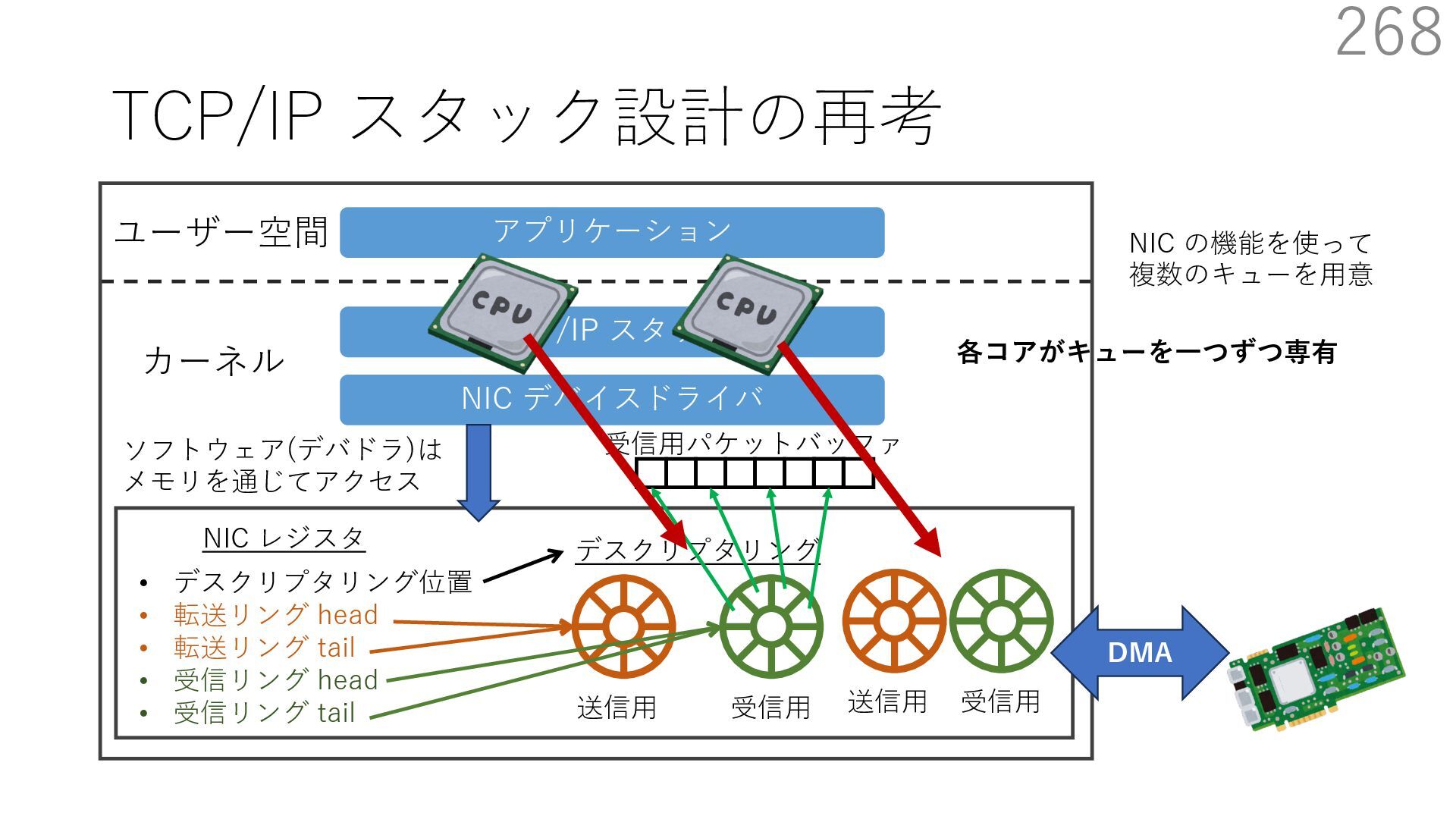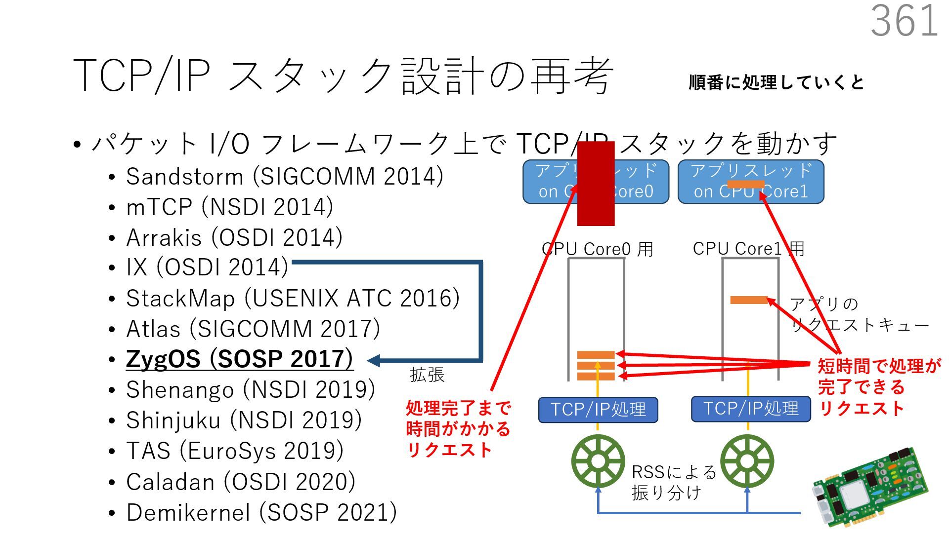 (SIGCOMM 2014) • mTCP (NSDI 2014) • Arrakis (OSDI 2014) • IX (OSDI 2014) • StackMap (USENIX ATC 2016) • Atlas (SIGCOMM 2017) • ZygOS (SOSP 2017) • Shenango (NSDI 2019) • Shinjuku (NSDI 2019) • TAS (EuroSys 2019) • Caladan (OSDI 2020) • Demikernel (SOSP 2021) 427 into a single library for both devices (e.g., RDMAxSPDK). We implemented the bulk of our library OS code in Rust. We initially prototyped several libOSes in C++; however, we found that Rust performs competitively with C++ and achieves ns-scale latencies while offering additional benefits. First, Rust enforces memory safety through language fea- tures and its compiler. Though our libOSes use unsafe code to bind to C/C++ kernel-bypass libraries and applications, User-space Software Kernel-space Software I/O Hardware I/O Device ??? libFuture ??? DPDK User I/O Buf. Mgmt libRDMA RDMA User I/O Buf. Mgmt Net. Trans. OS Kernel Control Path Demikernel Datapath Architecture App libPOSIX libDPDK SPDK User I/O Buf. Mgmt libSPDK Future Demikernel PDPIX Datapath API Figure 3. Demikernel kernel-bypass architecture. Demikernel ac- commodates heterogenous kernel-bypass devices, including poten- tial future hardware, with a flexible library OS-based datapath ar- chitecture.We include a libOS that goes through the OS kernel for 提案:異なるタイプのデバイスへ 共通のインターフェースからアクセス可能にする Irene Zhang, Amanda Raybuck, Pratyush Patel, Kirk Olynyk, Jacob Nelson, Omar S. Navarro Leija, Ashlie Martinez, Jing Liu, Anna Kornfeld Simpson, Sujay Jayakar, Pedro Henrique Penna, Max Demoulin, Piali Choudhury, and Anirudh Badam. 2021. The Demikernel Datapath OS Architecture for Microsecond-Scale Datacenter Systems. In Proceedings of the ACM Sigops 28th Symposium on Operating Systems Principles (SOSP ʼ21), 195-211.(https://doi.org/10.1145/3477132.3483569)