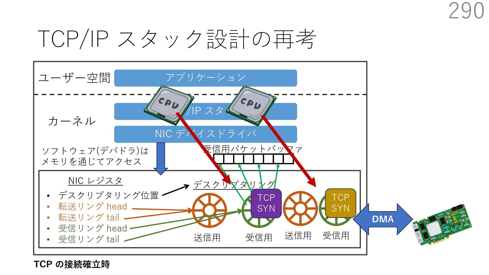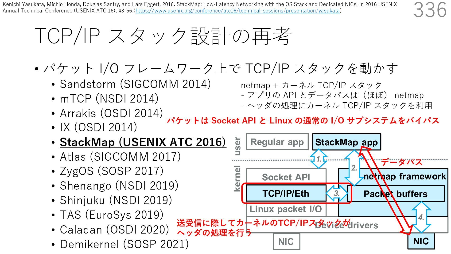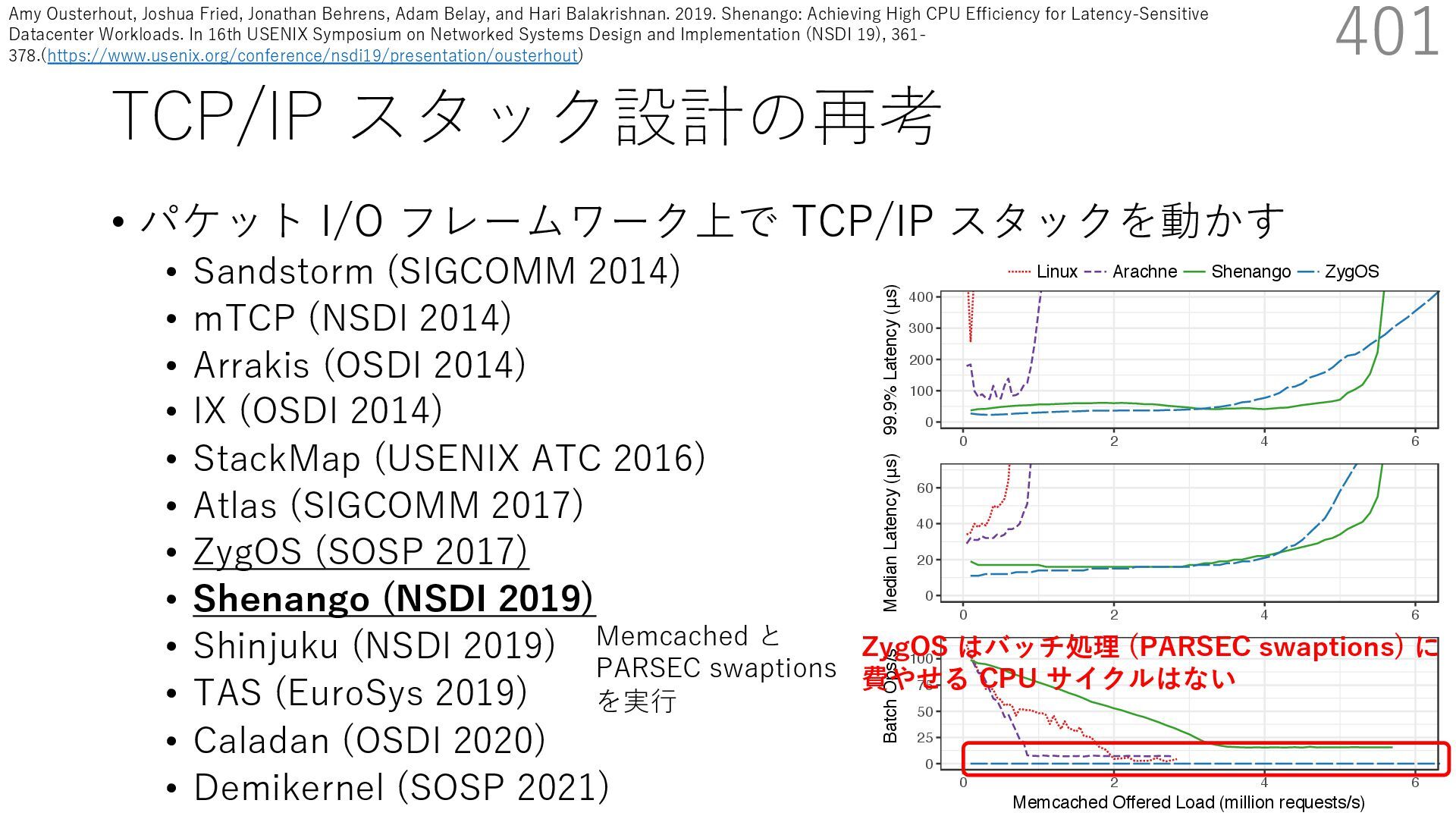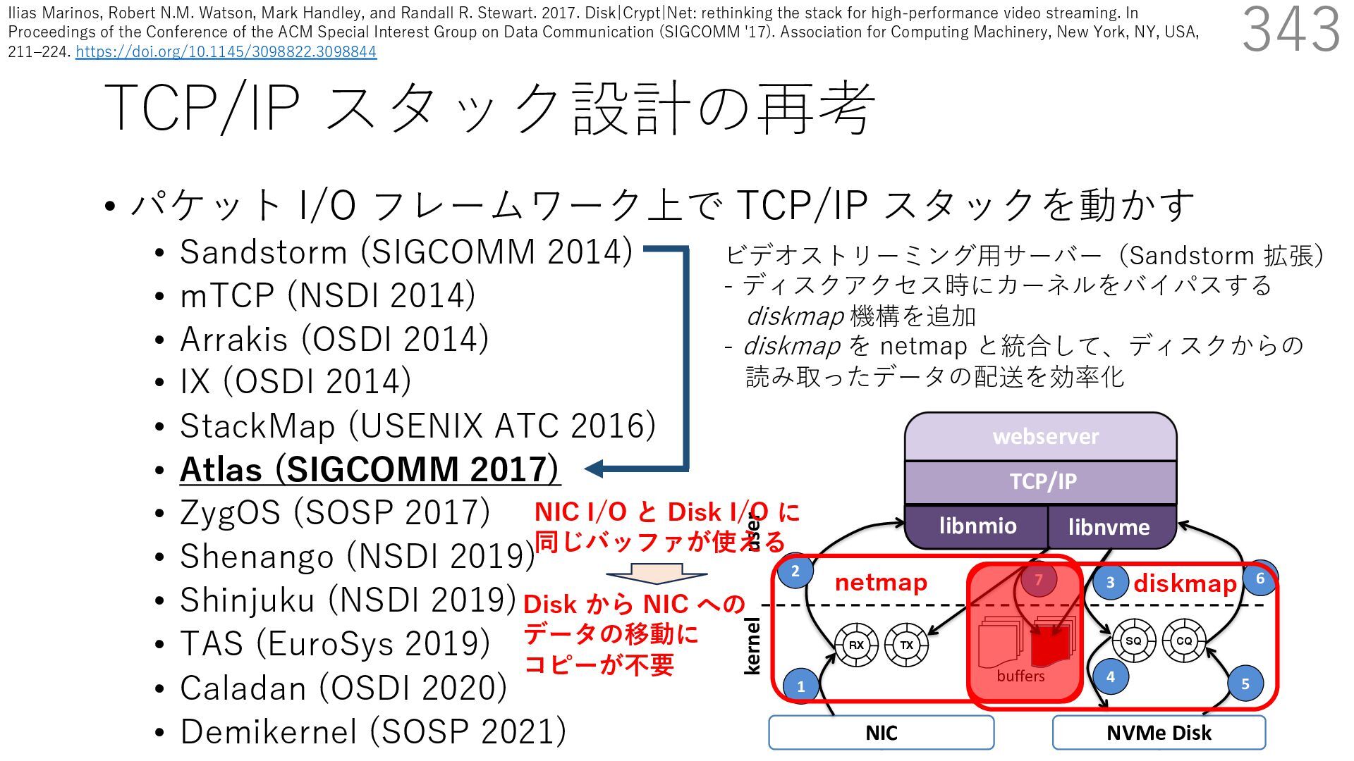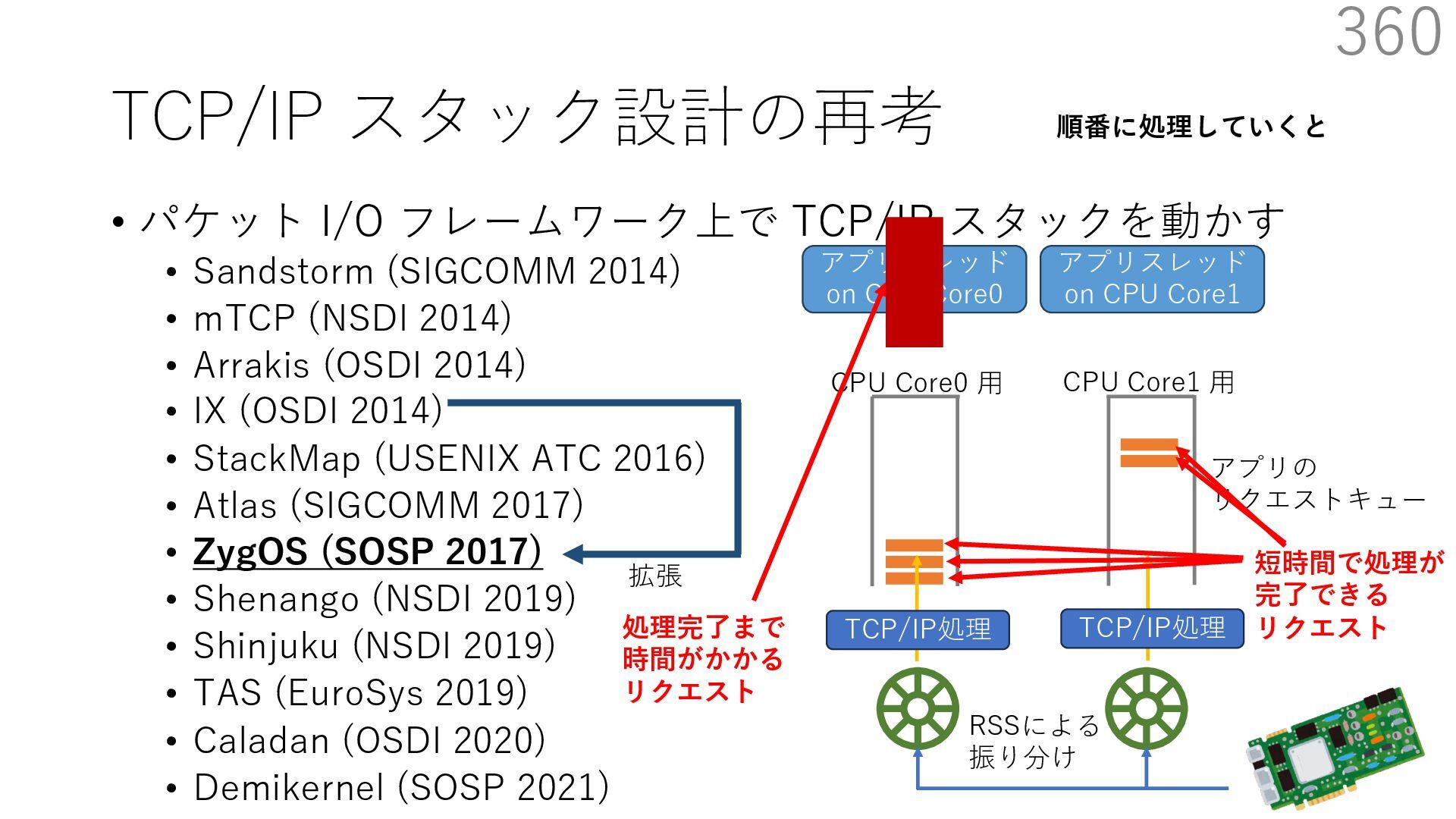 (SIGCOMM 2014) • mTCP (NSDI 2014) • Arrakis (OSDI 2014) • IX (OSDI 2014) • StackMap (USENIX ATC 2016) • Atlas (SIGCOMM 2017) • ZygOS (SOSP 2017) • Shenango (NSDI 2019) • Shinjuku (NSDI 2019) • TAS (EuroSys 2019) • Caladan (OSDI 2020) • Demikernel (SOSP 2021) 427 into a single library for both devices (e.g., RDMAxSPDK). We implemented the bulk of our library OS code in Rust. We initially prototyped several libOSes in C++; however, we found that Rust performs competitively with C++ and achieves ns-scale latencies while offering additional benefits. First, Rust enforces memory safety through language fea- tures and its compiler. Though our libOSes use unsafe code to bind to C/C++ kernel-bypass libraries and applications, User-space Software Kernel-space Software I/O Hardware I/O Device ??? libFuture ??? DPDK User I/O Buf. Mgmt libRDMA RDMA User I/O Buf. Mgmt Net. Trans. OS Kernel Control Path Demikernel Datapath Architecture App libPOSIX libDPDK SPDK User I/O Buf. Mgmt libSPDK Future Demikernel PDPIX Datapath API Figure 3. Demikernel kernel-bypass architecture. Demikernel ac- commodates heterogenous kernel-bypass devices, including poten- tial future hardware, with a flexible library OS-based datapath ar- chitecture.We include a libOS that goes through the OS kernel for 提案:異なるタイプのデバイスへ 共通のインターフェースからアクセス可能にする Irene Zhang, Amanda Raybuck, Pratyush Patel, Kirk Olynyk, Jacob Nelson, Omar S. Navarro Leija, Ashlie Martinez, Jing Liu, Anna Kornfeld Simpson, Sujay Jayakar, Pedro Henrique Penna, Max Demoulin, Piali Choudhury, and Anirudh Badam. 2021. The Demikernel Datapath OS Architecture for Microsecond-Scale Datacenter Systems. In Proceedings of the ACM Sigops 28th Symposium on Operating Systems Principles (SOSP ʼ21), 195-211.(https://doi.org/10.1145/3477132.3483569)