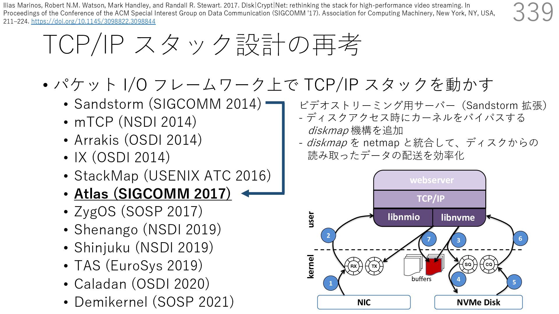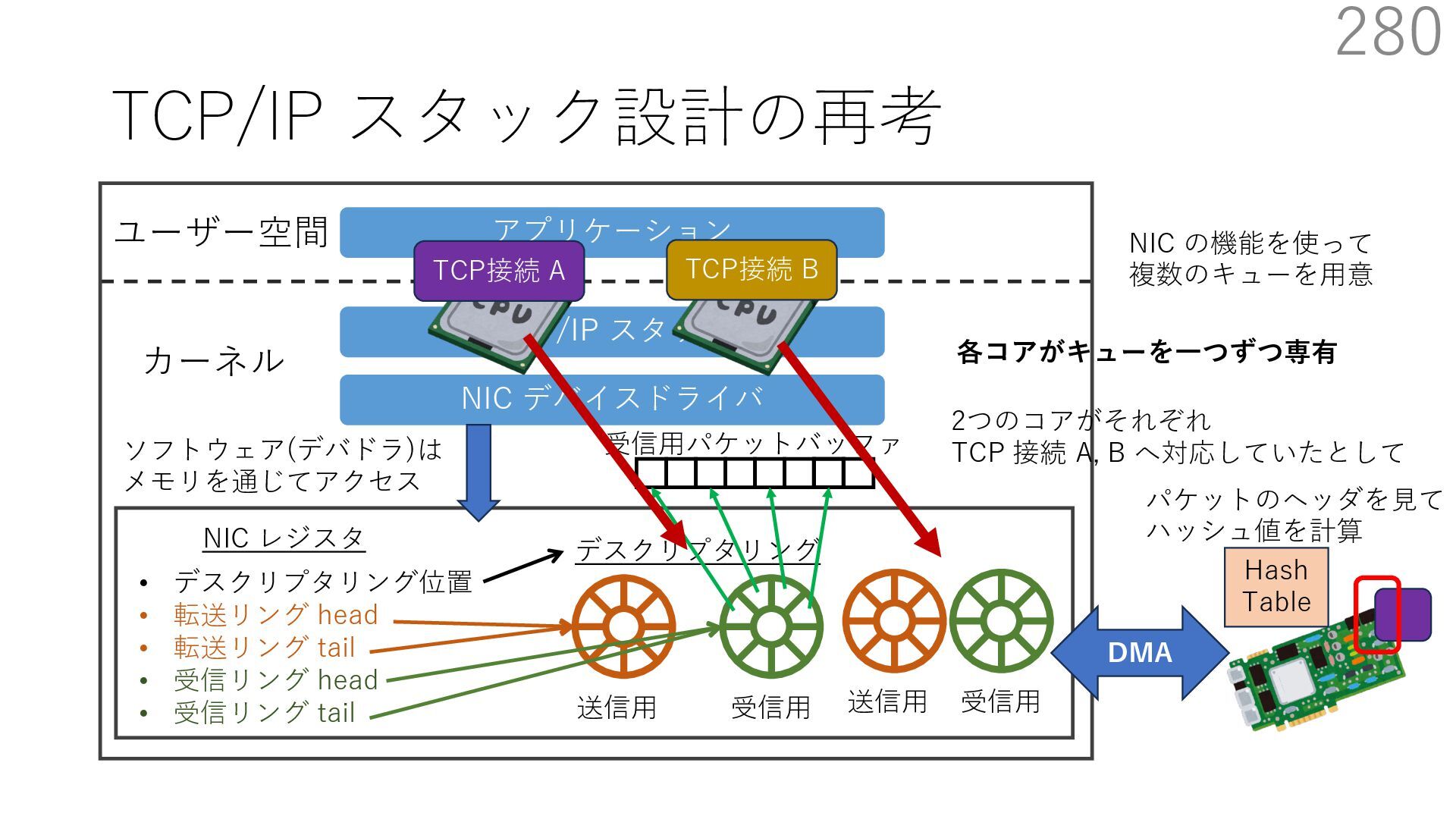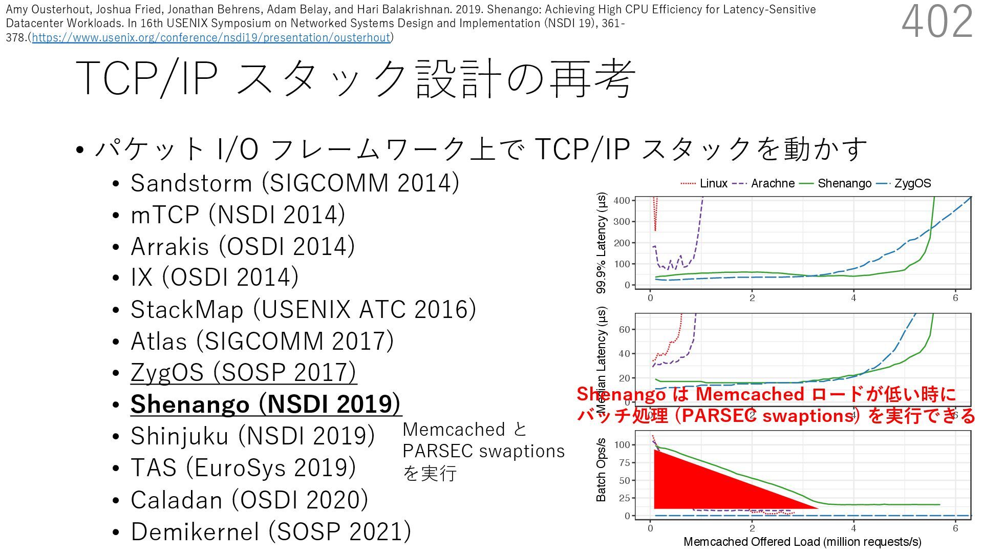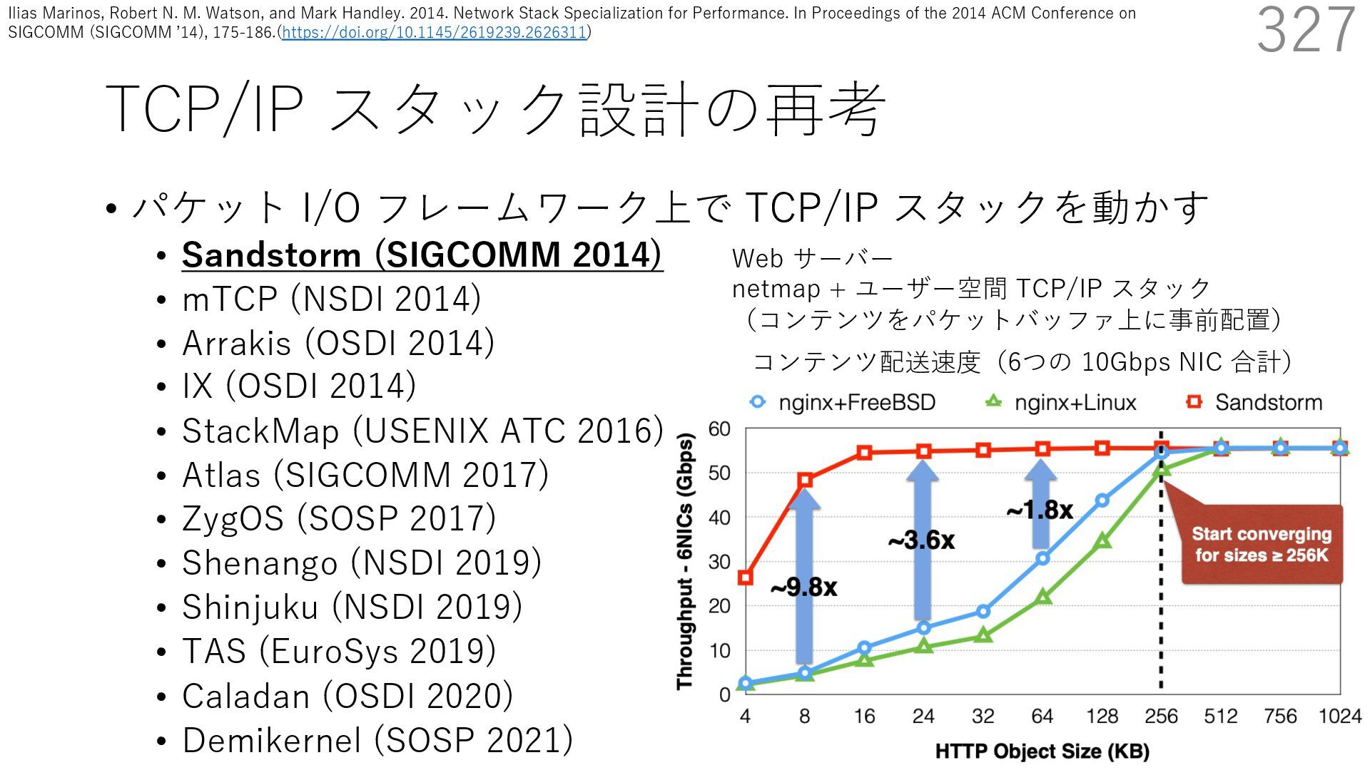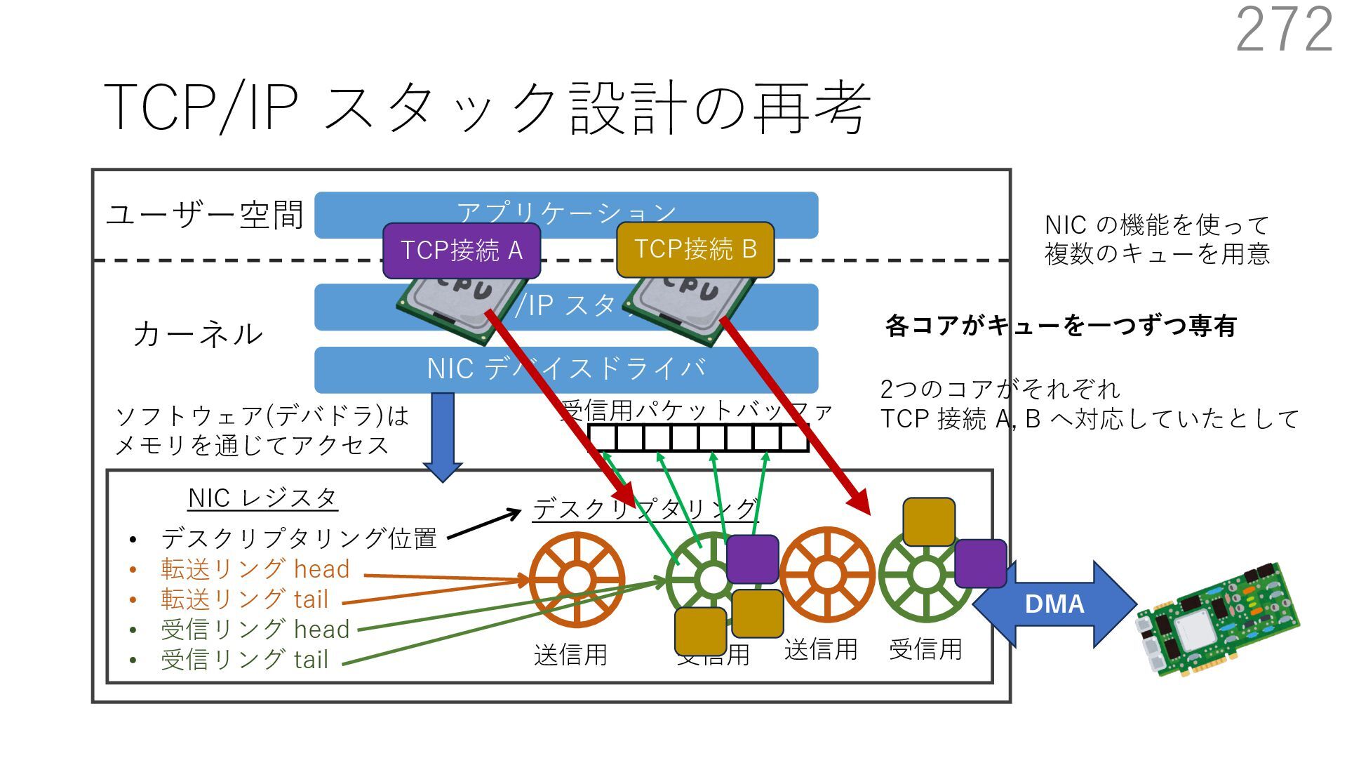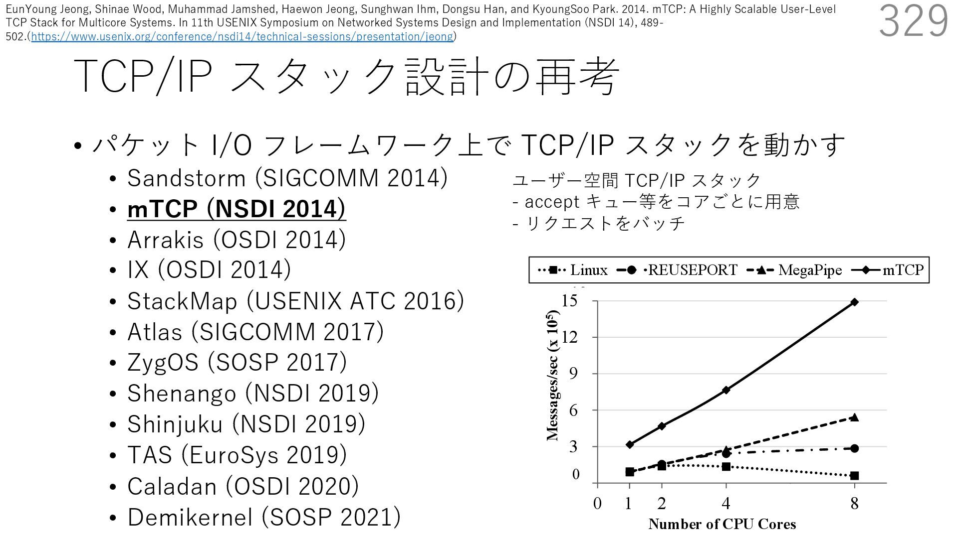 (SIGCOMM 2014) • mTCP (NSDI 2014) • Arrakis (OSDI 2014) • IX (OSDI 2014) • StackMap (USENIX ATC 2016) • Atlas (SIGCOMM 2017) • ZygOS (SOSP 2017) • Shenango (NSDI 2019) • Shinjuku (NSDI 2019) • TAS (EuroSys 2019) • Caladan (OSDI 2020) • Demikernel (SOSP 2021) 427 into a single library for both devices (e.g., RDMAxSPDK). We implemented the bulk of our library OS code in Rust. We initially prototyped several libOSes in C++; however, we found that Rust performs competitively with C++ and achieves ns-scale latencies while offering additional benefits. First, Rust enforces memory safety through language fea- tures and its compiler. Though our libOSes use unsafe code to bind to C/C++ kernel-bypass libraries and applications, User-space Software Kernel-space Software I/O Hardware I/O Device ??? libFuture ??? DPDK User I/O Buf. Mgmt libRDMA RDMA User I/O Buf. Mgmt Net. Trans. OS Kernel Control Path Demikernel Datapath Architecture App libPOSIX libDPDK SPDK User I/O Buf. Mgmt libSPDK Future Demikernel PDPIX Datapath API Figure 3. Demikernel kernel-bypass architecture. Demikernel ac- commodates heterogenous kernel-bypass devices, including poten- tial future hardware, with a flexible library OS-based datapath ar- chitecture.We include a libOS that goes through the OS kernel for 提案:異なるタイプのデバイスへ 共通のインターフェースからアクセス可能にする Irene Zhang, Amanda Raybuck, Pratyush Patel, Kirk Olynyk, Jacob Nelson, Omar S. Navarro Leija, Ashlie Martinez, Jing Liu, Anna Kornfeld Simpson, Sujay Jayakar, Pedro Henrique Penna, Max Demoulin, Piali Choudhury, and Anirudh Badam. 2021. The Demikernel Datapath OS Architecture for Microsecond-Scale Datacenter Systems. In Proceedings of the ACM Sigops 28th Symposium on Operating Systems Principles (SOSP ʼ21), 195-211.(https://doi.org/10.1145/3477132.3483569)