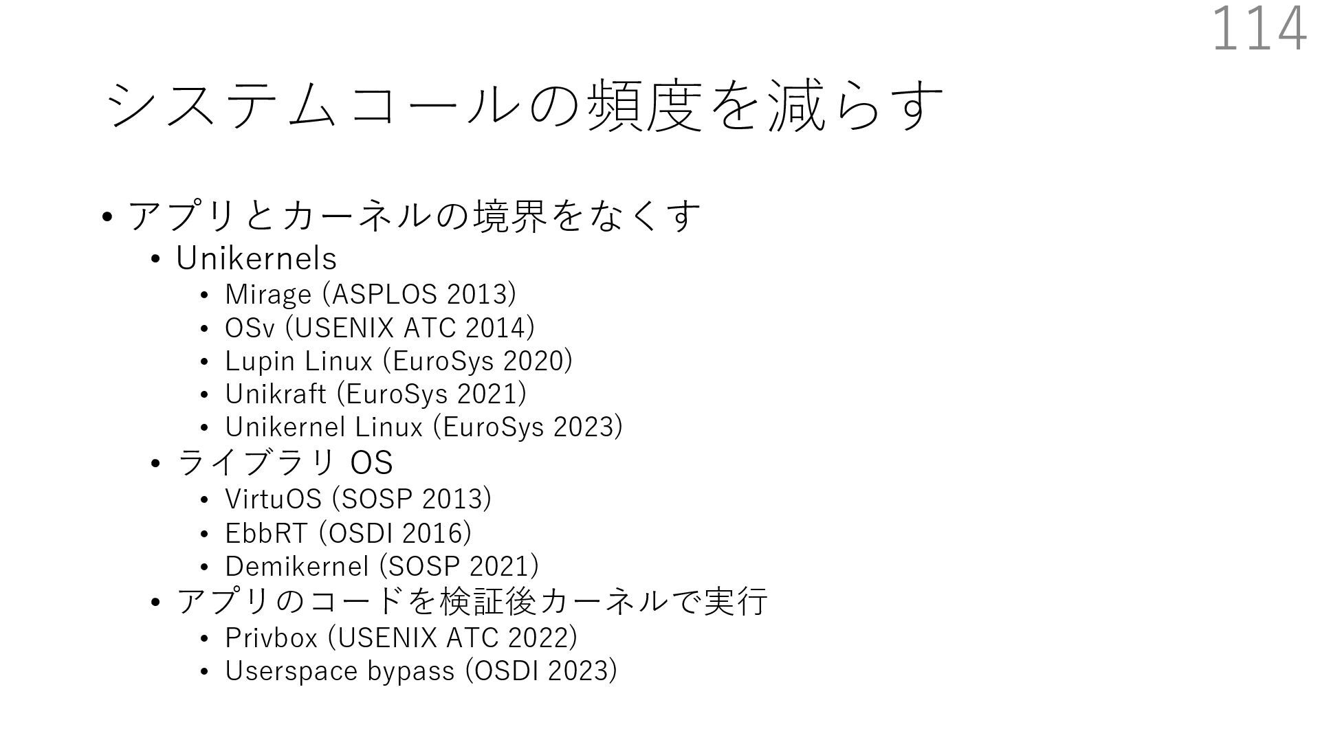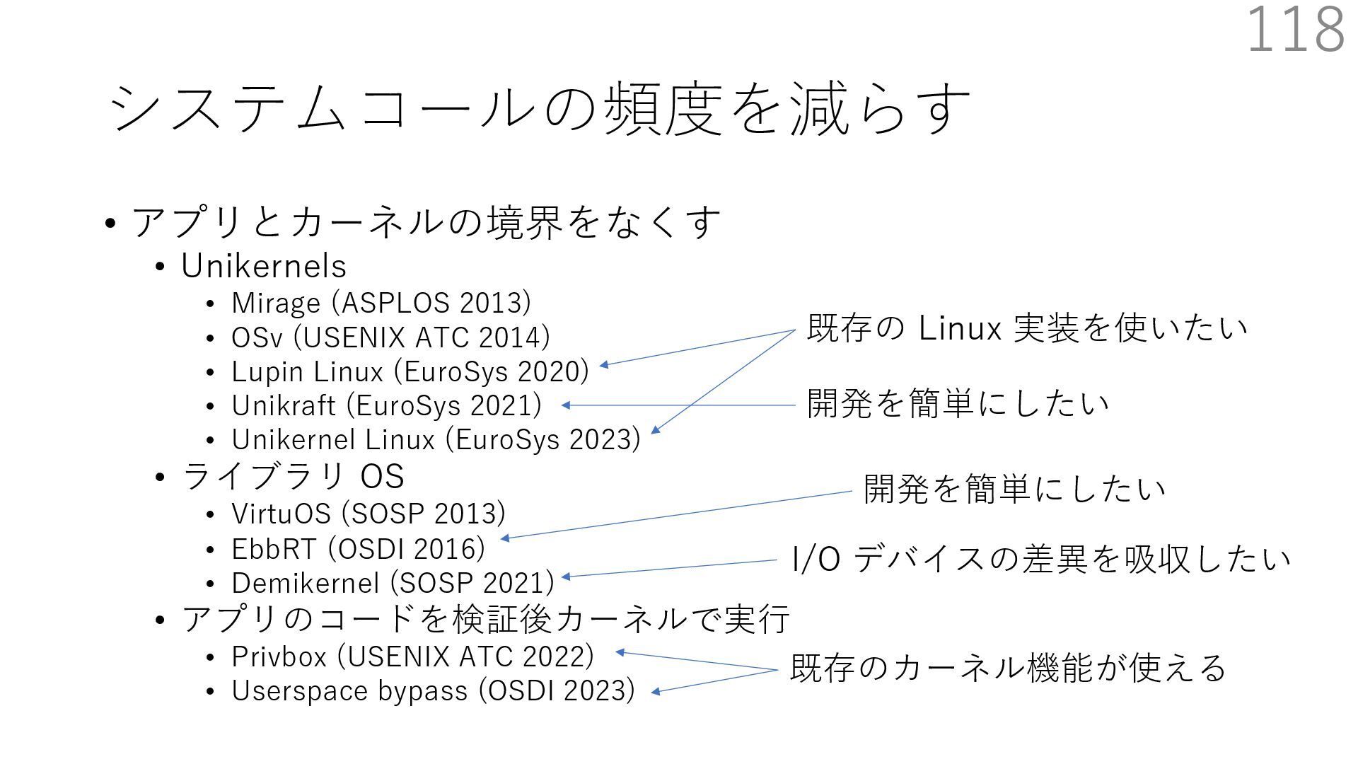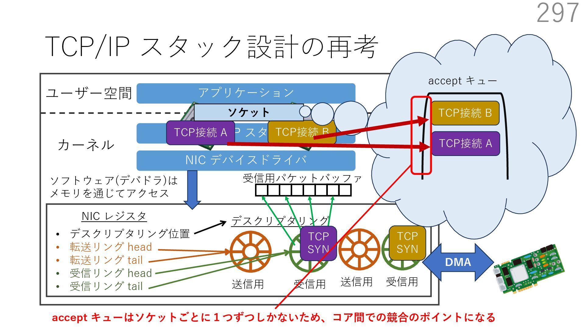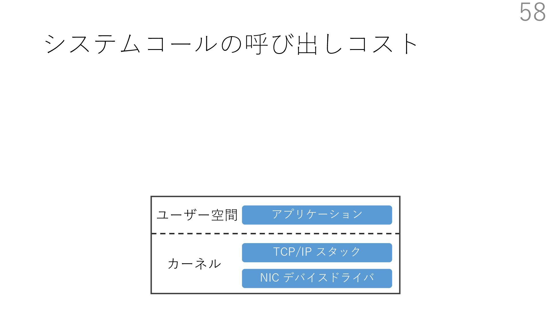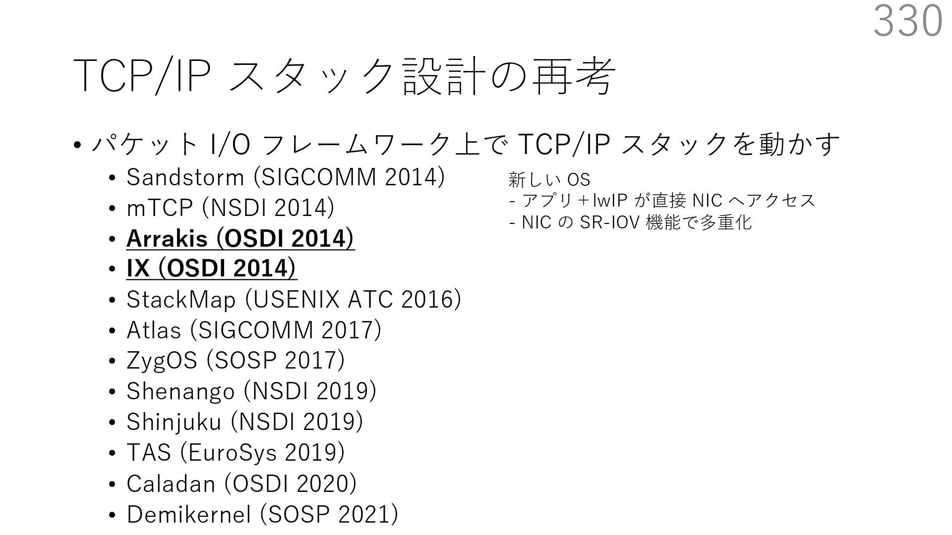 (SIGCOMM 2014) • mTCP (NSDI 2014) • Arrakis (OSDI 2014) • IX (OSDI 2014) • StackMap (USENIX ATC 2016) • Atlas (SIGCOMM 2017) • ZygOS (SOSP 2017) • Shenango (NSDI 2019) • Shinjuku (NSDI 2019) • TAS (EuroSys 2019) • Caladan (OSDI 2020) • Demikernel (SOSP 2021) 427 into a single library for both devices (e.g., RDMAxSPDK). We implemented the bulk of our library OS code in Rust. We initially prototyped several libOSes in C++; however, we found that Rust performs competitively with C++ and achieves ns-scale latencies while offering additional benefits. First, Rust enforces memory safety through language fea- tures and its compiler. Though our libOSes use unsafe code to bind to C/C++ kernel-bypass libraries and applications, User-space Software Kernel-space Software I/O Hardware I/O Device ??? libFuture ??? DPDK User I/O Buf. Mgmt libRDMA RDMA User I/O Buf. Mgmt Net. Trans. OS Kernel Control Path Demikernel Datapath Architecture App libPOSIX libDPDK SPDK User I/O Buf. Mgmt libSPDK Future Demikernel PDPIX Datapath API Figure 3. Demikernel kernel-bypass architecture. Demikernel ac- commodates heterogenous kernel-bypass devices, including poten- tial future hardware, with a flexible library OS-based datapath ar- chitecture.We include a libOS that goes through the OS kernel for 提案:異なるタイプのデバイスへ 共通のインターフェースからアクセス可能にする Irene Zhang, Amanda Raybuck, Pratyush Patel, Kirk Olynyk, Jacob Nelson, Omar S. Navarro Leija, Ashlie Martinez, Jing Liu, Anna Kornfeld Simpson, Sujay Jayakar, Pedro Henrique Penna, Max Demoulin, Piali Choudhury, and Anirudh Badam. 2021. The Demikernel Datapath OS Architecture for Microsecond-Scale Datacenter Systems. In Proceedings of the ACM Sigops 28th Symposium on Operating Systems Principles (SOSP ʼ21), 195-211.(https://doi.org/10.1145/3477132.3483569)
