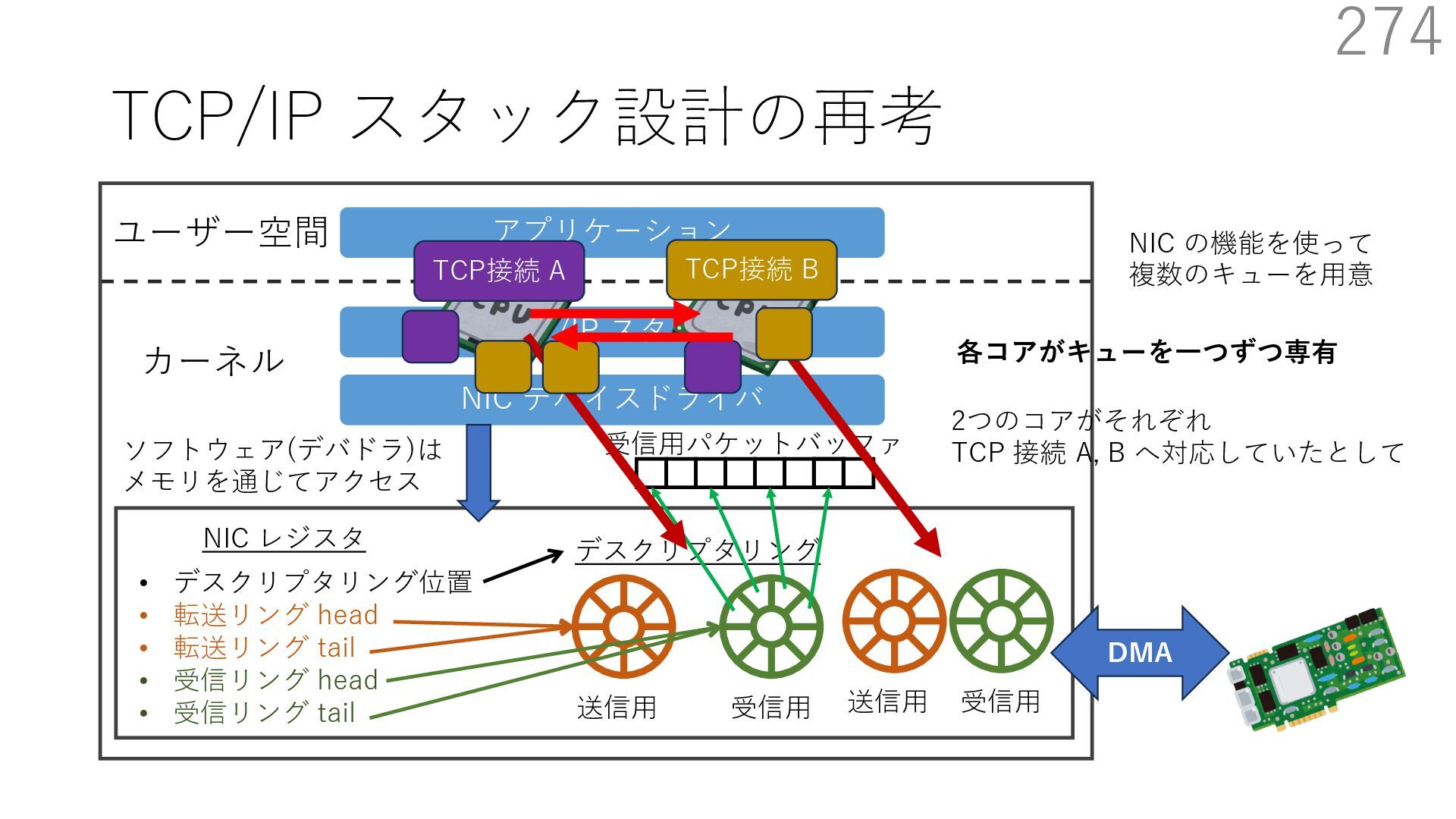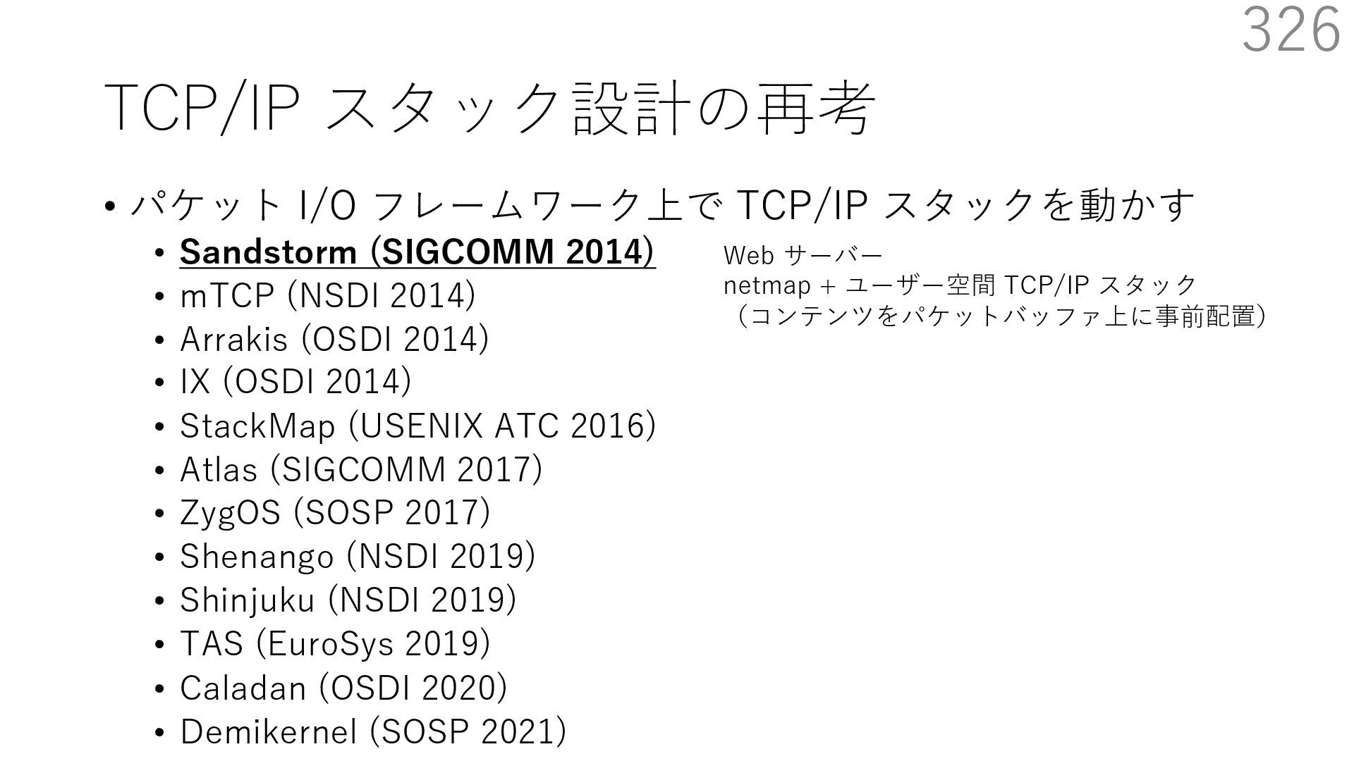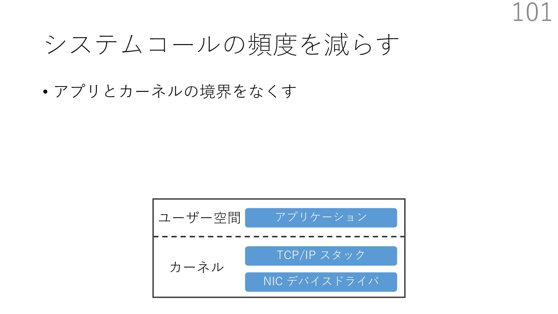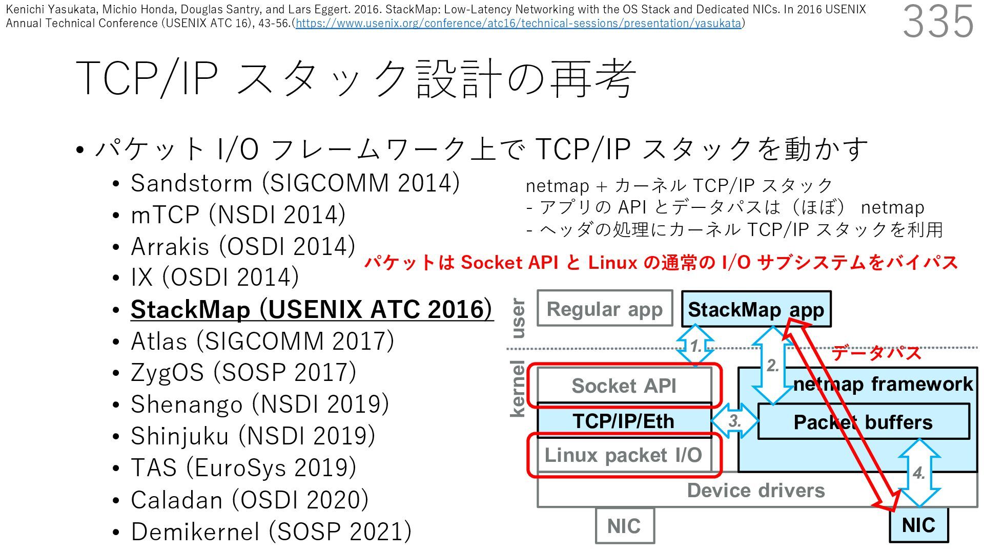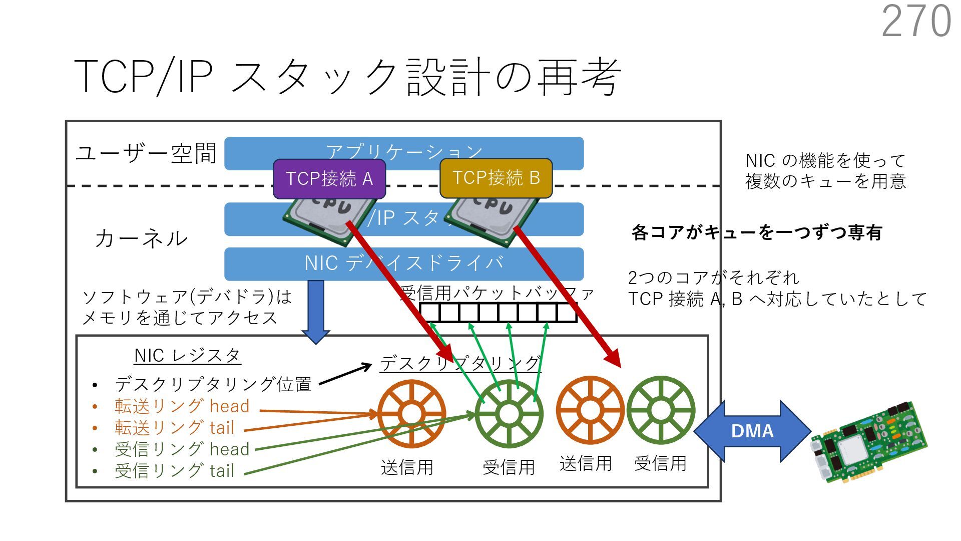 (SIGCOMM 2014) • mTCP (NSDI 2014) • Arrakis (OSDI 2014) • IX (OSDI 2014) • StackMap (USENIX ATC 2016) • Atlas (SIGCOMM 2017) • ZygOS (SOSP 2017) • Shenango (NSDI 2019) • Shinjuku (NSDI 2019) • TAS (EuroSys 2019) • Caladan (OSDI 2020) • Demikernel (SOSP 2021) 427 into a single library for both devices (e.g., RDMAxSPDK). We implemented the bulk of our library OS code in Rust. We initially prototyped several libOSes in C++; however, we found that Rust performs competitively with C++ and achieves ns-scale latencies while offering additional benefits. First, Rust enforces memory safety through language fea- tures and its compiler. Though our libOSes use unsafe code to bind to C/C++ kernel-bypass libraries and applications, User-space Software Kernel-space Software I/O Hardware I/O Device ??? libFuture ??? DPDK User I/O Buf. Mgmt libRDMA RDMA User I/O Buf. Mgmt Net. Trans. OS Kernel Control Path Demikernel Datapath Architecture App libPOSIX libDPDK SPDK User I/O Buf. Mgmt libSPDK Future Demikernel PDPIX Datapath API Figure 3. Demikernel kernel-bypass architecture. Demikernel ac- commodates heterogenous kernel-bypass devices, including poten- tial future hardware, with a flexible library OS-based datapath ar- chitecture.We include a libOS that goes through the OS kernel for 提案:異なるタイプのデバイスへ 共通のインターフェースからアクセス可能にする Irene Zhang, Amanda Raybuck, Pratyush Patel, Kirk Olynyk, Jacob Nelson, Omar S. Navarro Leija, Ashlie Martinez, Jing Liu, Anna Kornfeld Simpson, Sujay Jayakar, Pedro Henrique Penna, Max Demoulin, Piali Choudhury, and Anirudh Badam. 2021. The Demikernel Datapath OS Architecture for Microsecond-Scale Datacenter Systems. In Proceedings of the ACM Sigops 28th Symposium on Operating Systems Principles (SOSP ʼ21), 195-211.(https://doi.org/10.1145/3477132.3483569)