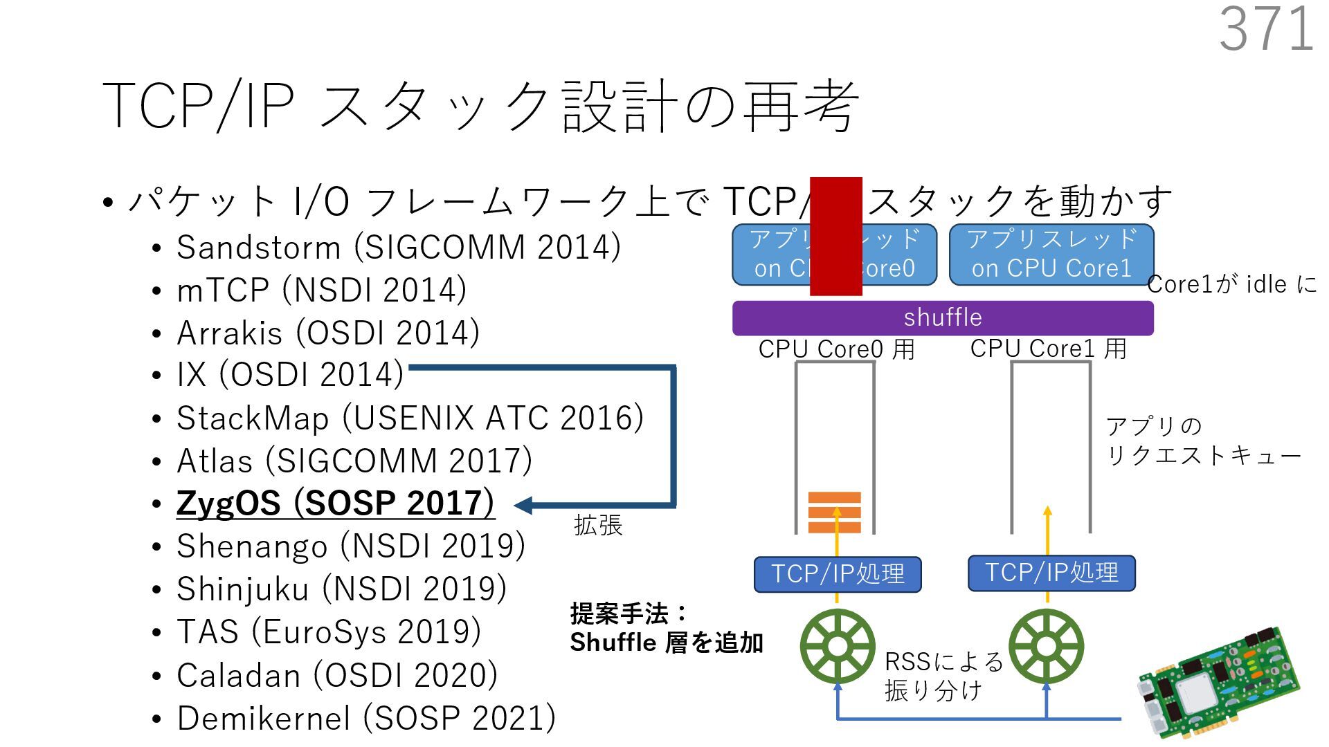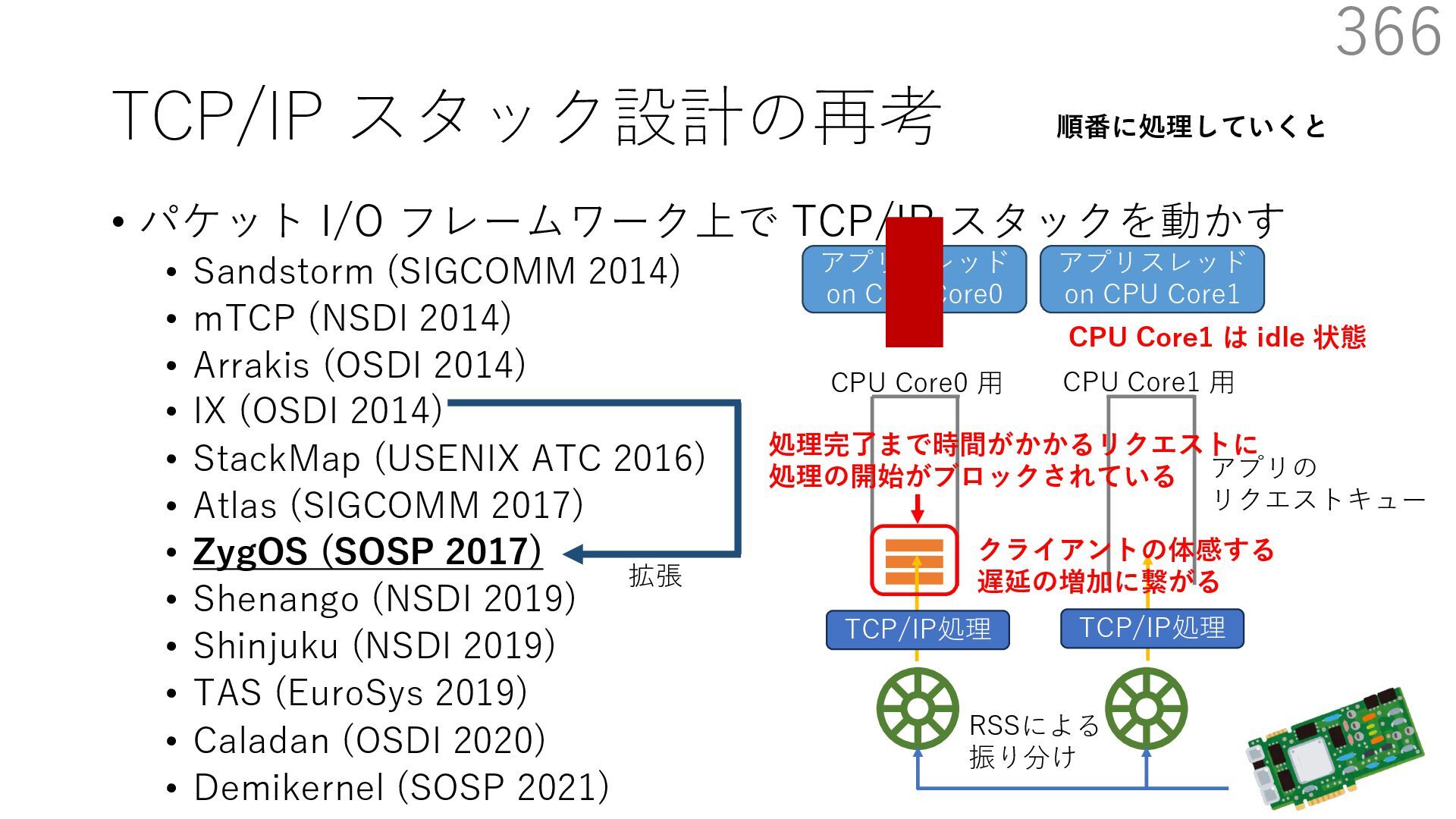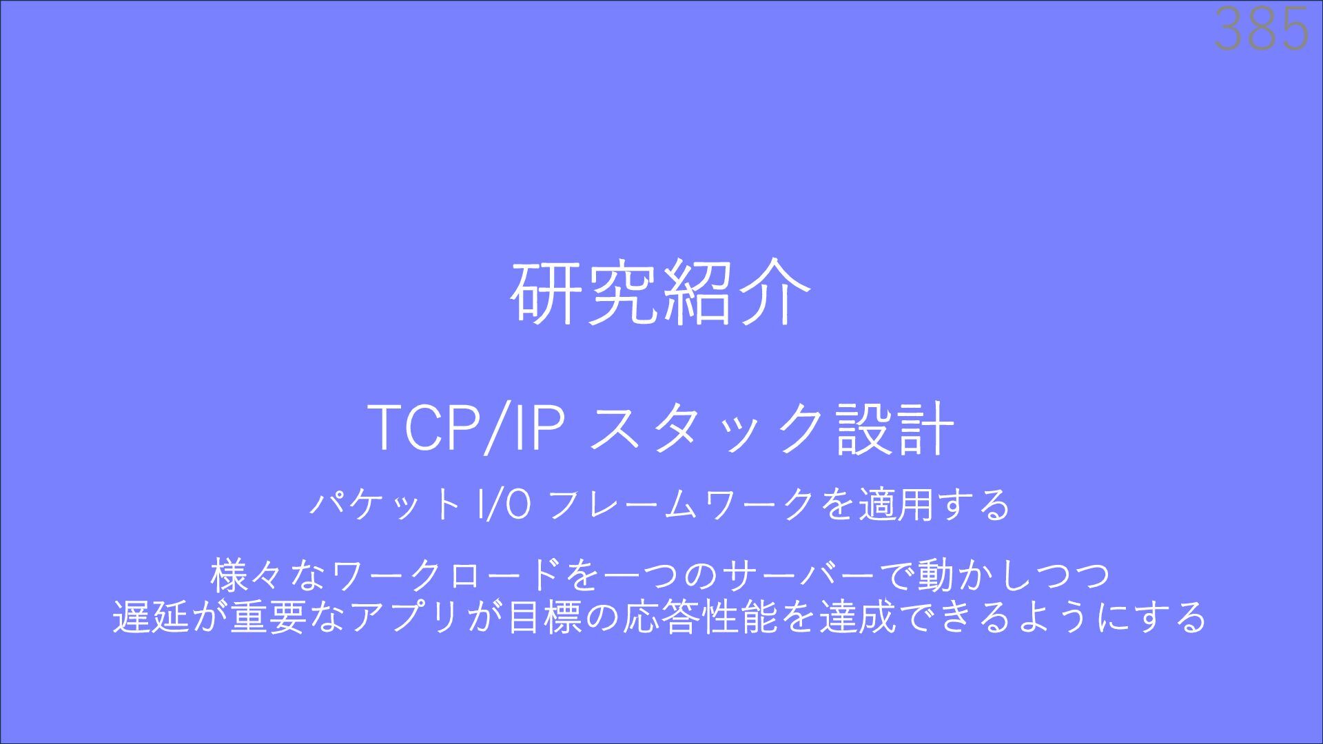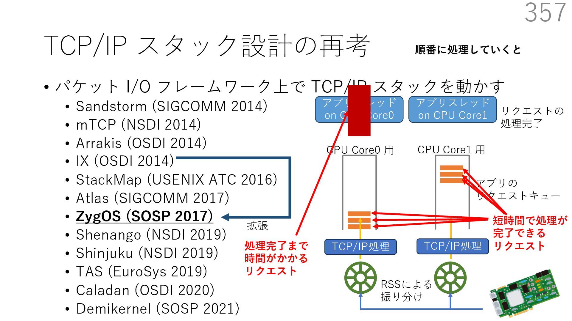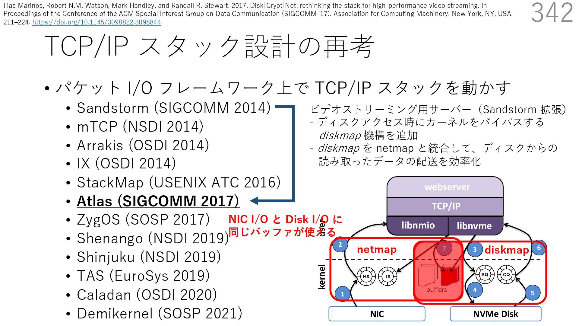 (SIGCOMM 2014) • mTCP (NSDI 2014) • Arrakis (OSDI 2014) • IX (OSDI 2014) • StackMap (USENIX ATC 2016) • Atlas (SIGCOMM 2017) • ZygOS (SOSP 2017) • Shenango (NSDI 2019) • Shinjuku (NSDI 2019) • TAS (EuroSys 2019) • Caladan (OSDI 2020) • Demikernel (SOSP 2021) 427 into a single library for both devices (e.g., RDMAxSPDK). We implemented the bulk of our library OS code in Rust. We initially prototyped several libOSes in C++; however, we found that Rust performs competitively with C++ and achieves ns-scale latencies while offering additional benefits. First, Rust enforces memory safety through language fea- tures and its compiler. Though our libOSes use unsafe code to bind to C/C++ kernel-bypass libraries and applications, User-space Software Kernel-space Software I/O Hardware I/O Device ??? libFuture ??? DPDK User I/O Buf. Mgmt libRDMA RDMA User I/O Buf. Mgmt Net. Trans. OS Kernel Control Path Demikernel Datapath Architecture App libPOSIX libDPDK SPDK User I/O Buf. Mgmt libSPDK Future Demikernel PDPIX Datapath API Figure 3. Demikernel kernel-bypass architecture. Demikernel ac- commodates heterogenous kernel-bypass devices, including poten- tial future hardware, with a flexible library OS-based datapath ar- chitecture.We include a libOS that goes through the OS kernel for 提案:異なるタイプのデバイスへ 共通のインターフェースからアクセス可能にする Irene Zhang, Amanda Raybuck, Pratyush Patel, Kirk Olynyk, Jacob Nelson, Omar S. Navarro Leija, Ashlie Martinez, Jing Liu, Anna Kornfeld Simpson, Sujay Jayakar, Pedro Henrique Penna, Max Demoulin, Piali Choudhury, and Anirudh Badam. 2021. The Demikernel Datapath OS Architecture for Microsecond-Scale Datacenter Systems. In Proceedings of the ACM Sigops 28th Symposium on Operating Systems Principles (SOSP ʼ21), 195-211.(https://doi.org/10.1145/3477132.3483569)
