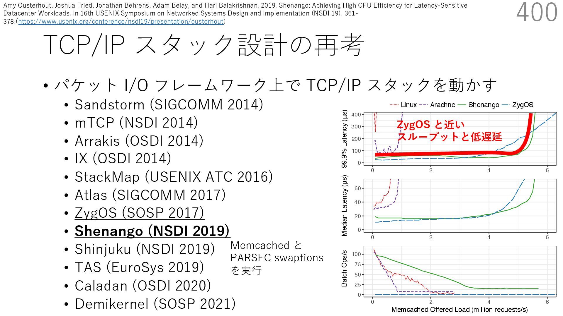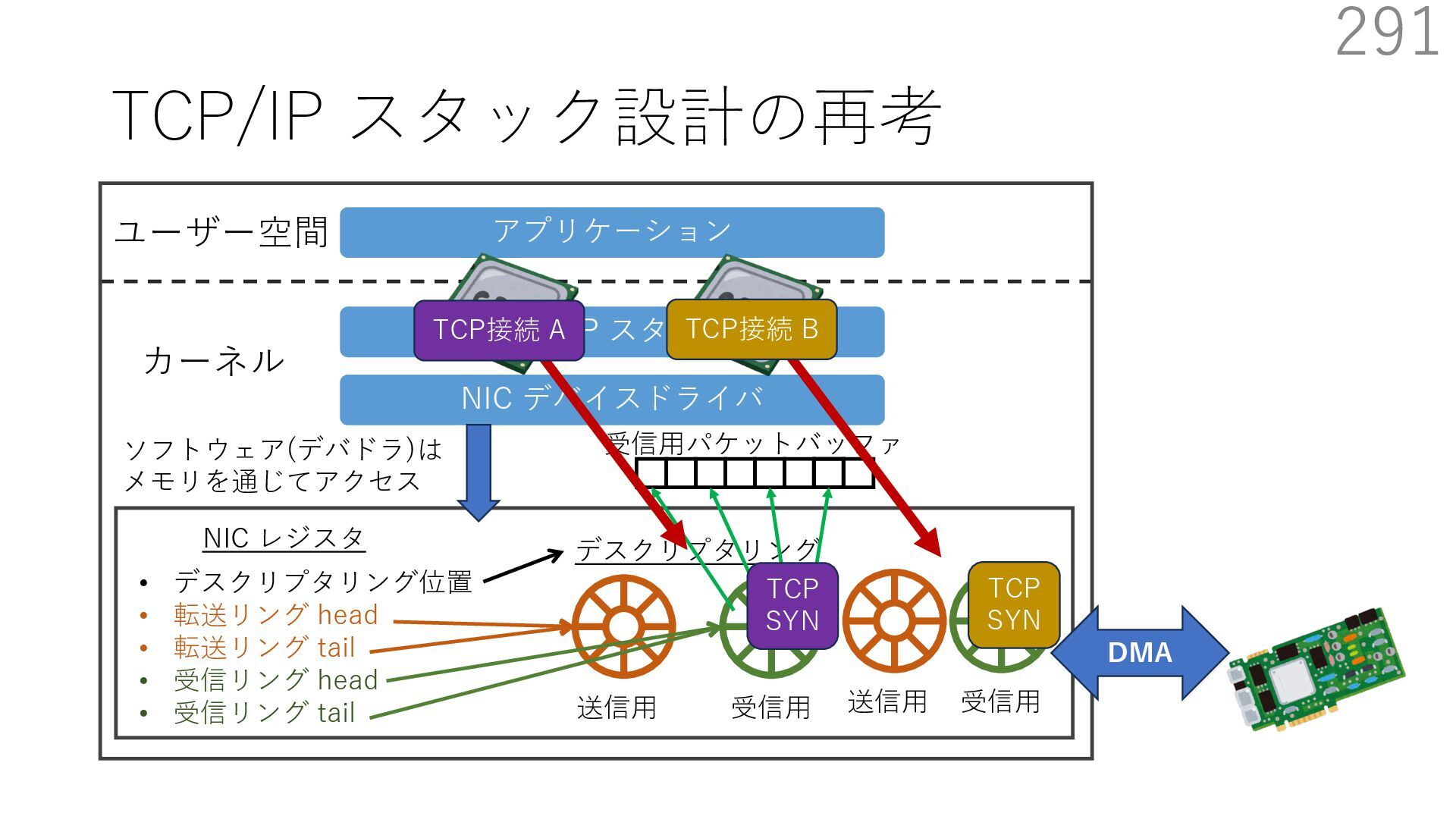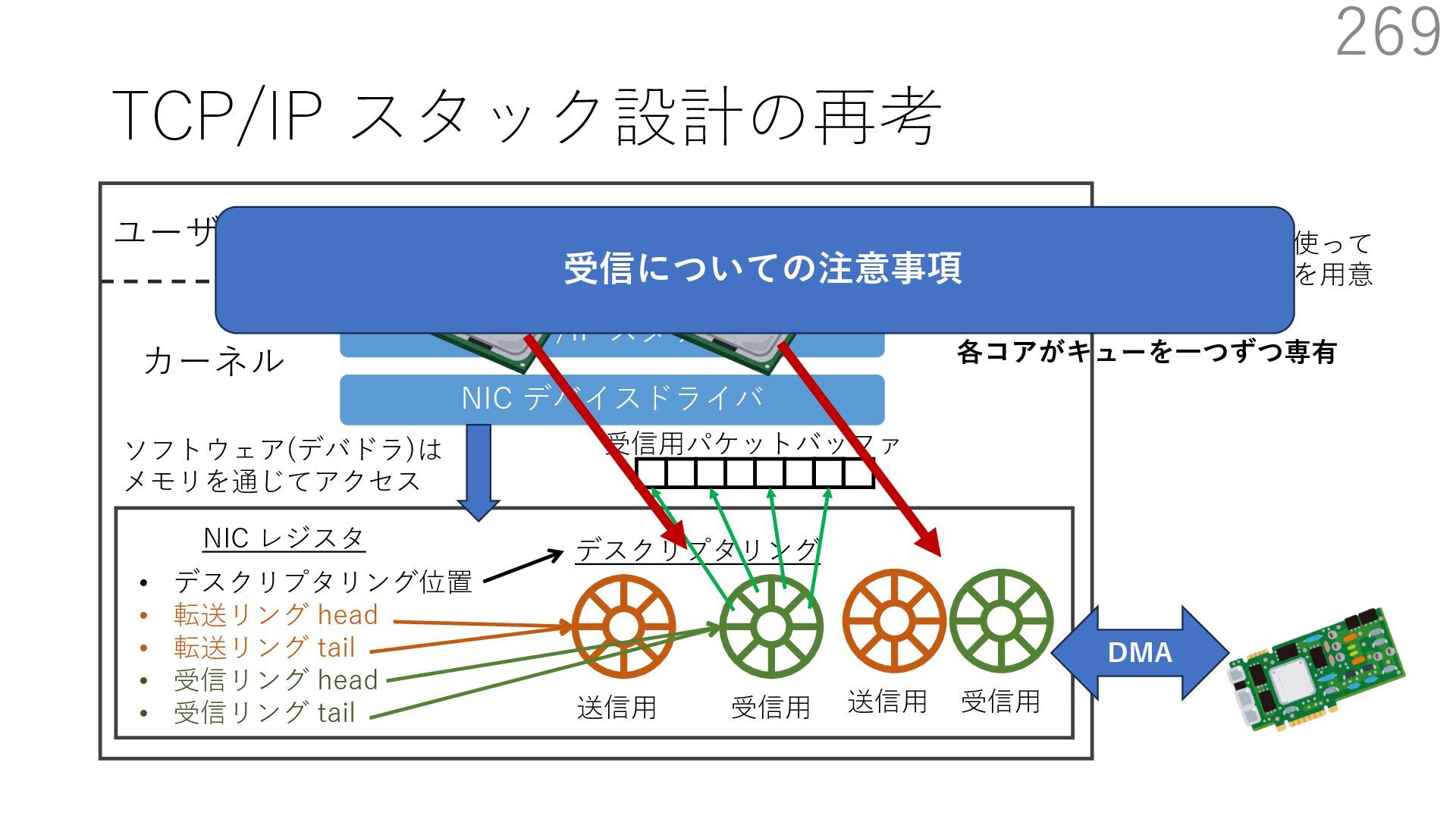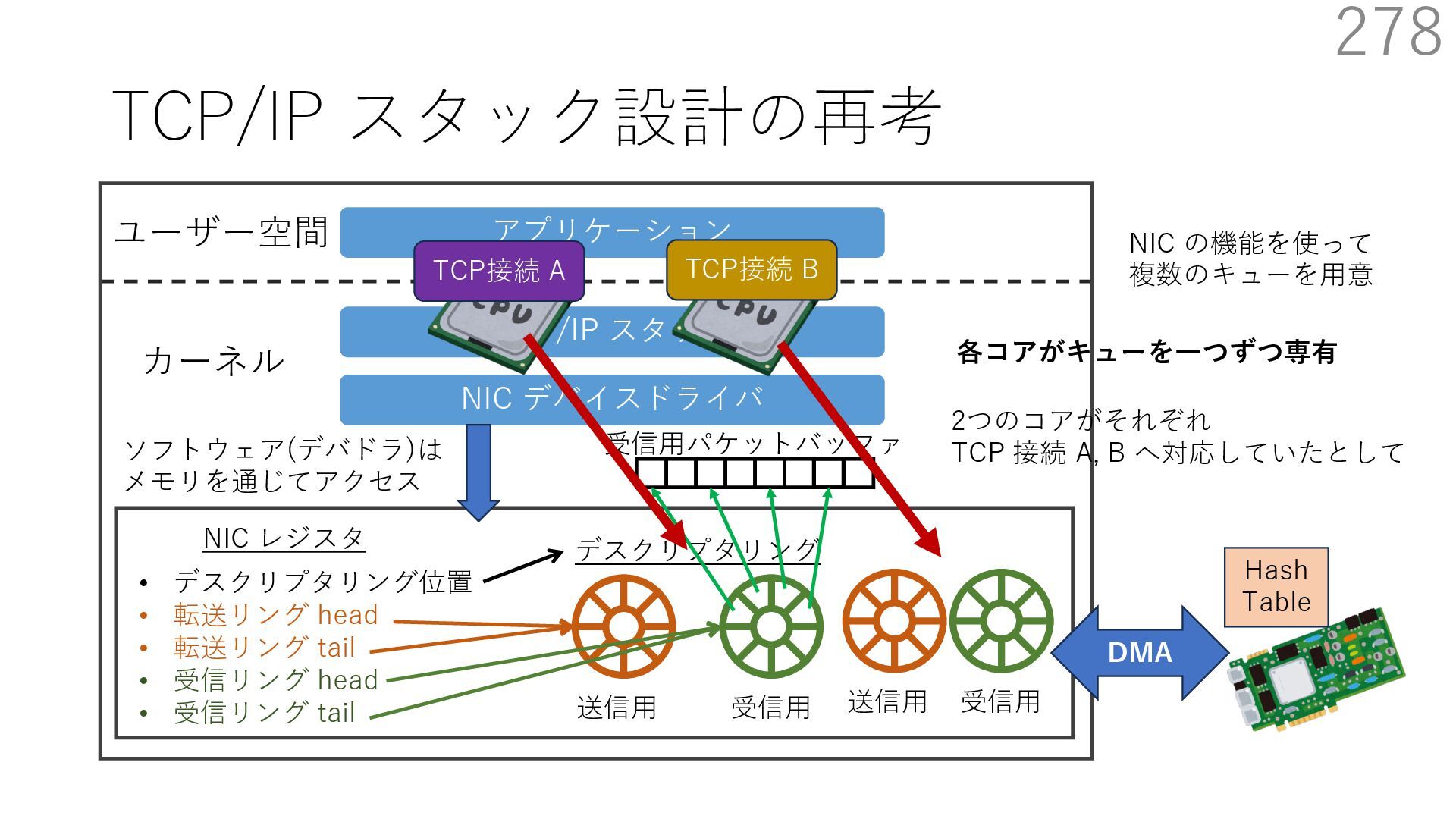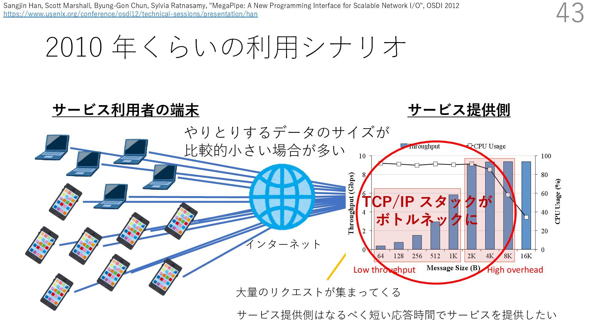 (SIGCOMM 2014) • mTCP (NSDI 2014) • Arrakis (OSDI 2014) • IX (OSDI 2014) • StackMap (USENIX ATC 2016) • Atlas (SIGCOMM 2017) • ZygOS (SOSP 2017) • Shenango (NSDI 2019) • Shinjuku (NSDI 2019) • TAS (EuroSys 2019) • Caladan (OSDI 2020) • Demikernel (SOSP 2021) 427 into a single library for both devices (e.g., RDMAxSPDK). We implemented the bulk of our library OS code in Rust. We initially prototyped several libOSes in C++; however, we found that Rust performs competitively with C++ and achieves ns-scale latencies while offering additional benefits. First, Rust enforces memory safety through language fea- tures and its compiler. Though our libOSes use unsafe code to bind to C/C++ kernel-bypass libraries and applications, User-space Software Kernel-space Software I/O Hardware I/O Device ??? libFuture ??? DPDK User I/O Buf. Mgmt libRDMA RDMA User I/O Buf. Mgmt Net. Trans. OS Kernel Control Path Demikernel Datapath Architecture App libPOSIX libDPDK SPDK User I/O Buf. Mgmt libSPDK Future Demikernel PDPIX Datapath API Figure 3. Demikernel kernel-bypass architecture. Demikernel ac- commodates heterogenous kernel-bypass devices, including poten- tial future hardware, with a flexible library OS-based datapath ar- chitecture.We include a libOS that goes through the OS kernel for 提案:異なるタイプのデバイスへ 共通のインターフェースからアクセス可能にする Irene Zhang, Amanda Raybuck, Pratyush Patel, Kirk Olynyk, Jacob Nelson, Omar S. Navarro Leija, Ashlie Martinez, Jing Liu, Anna Kornfeld Simpson, Sujay Jayakar, Pedro Henrique Penna, Max Demoulin, Piali Choudhury, and Anirudh Badam. 2021. The Demikernel Datapath OS Architecture for Microsecond-Scale Datacenter Systems. In Proceedings of the ACM Sigops 28th Symposium on Operating Systems Principles (SOSP ʼ21), 195-211.(https://doi.org/10.1145/3477132.3483569)