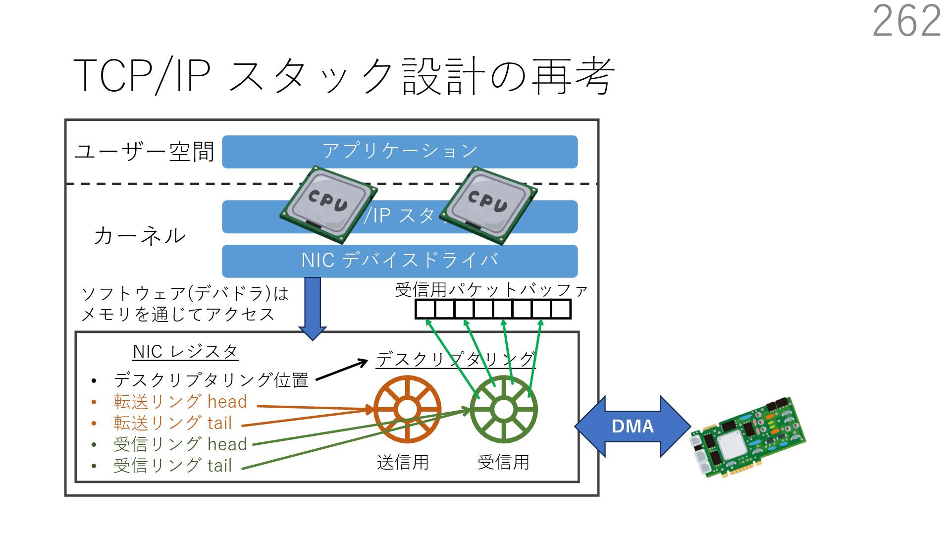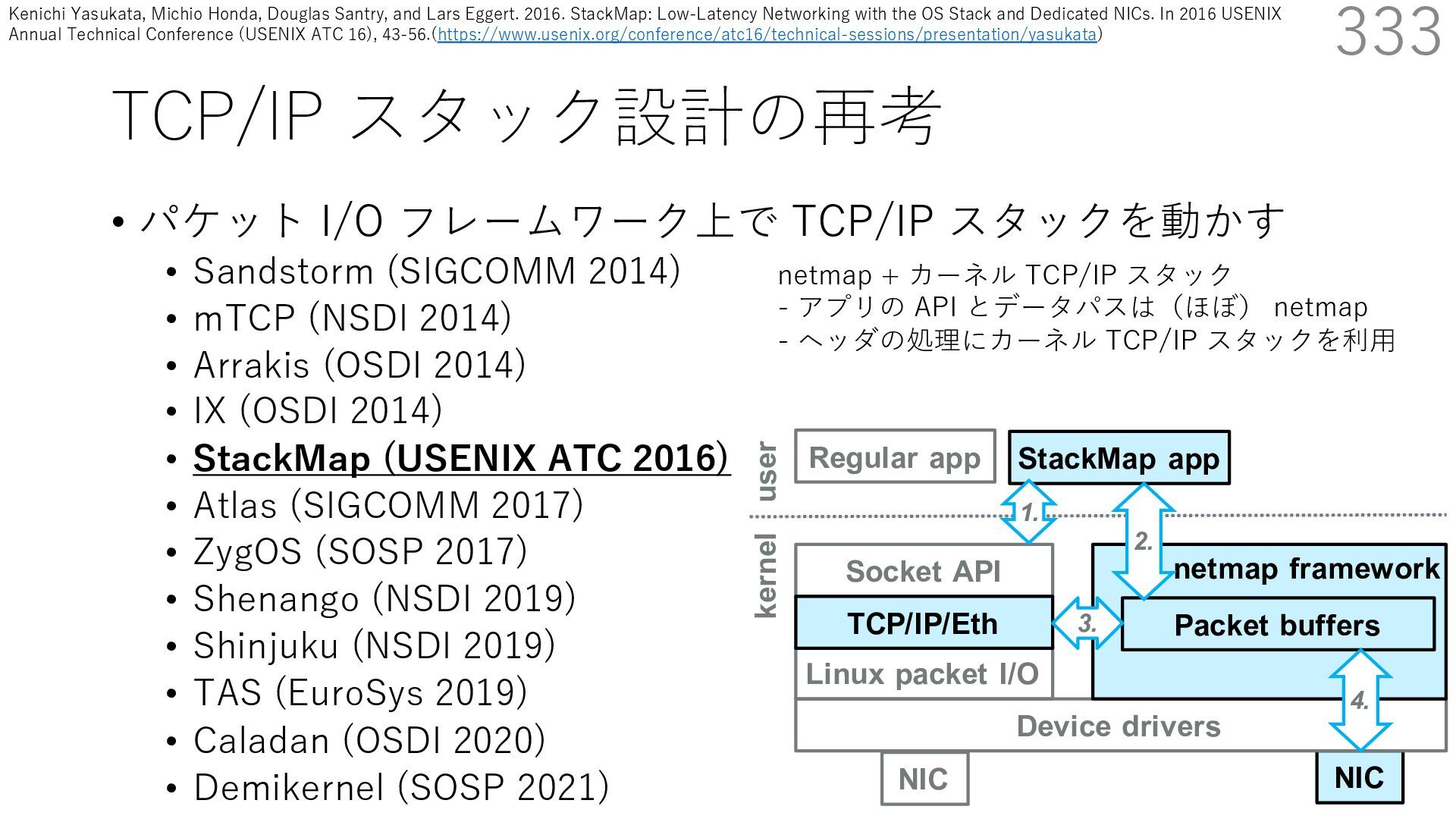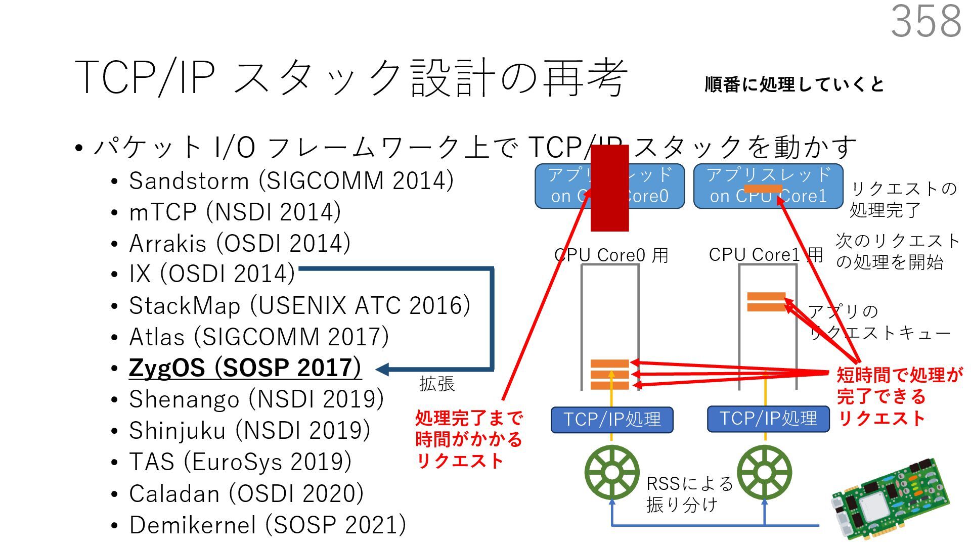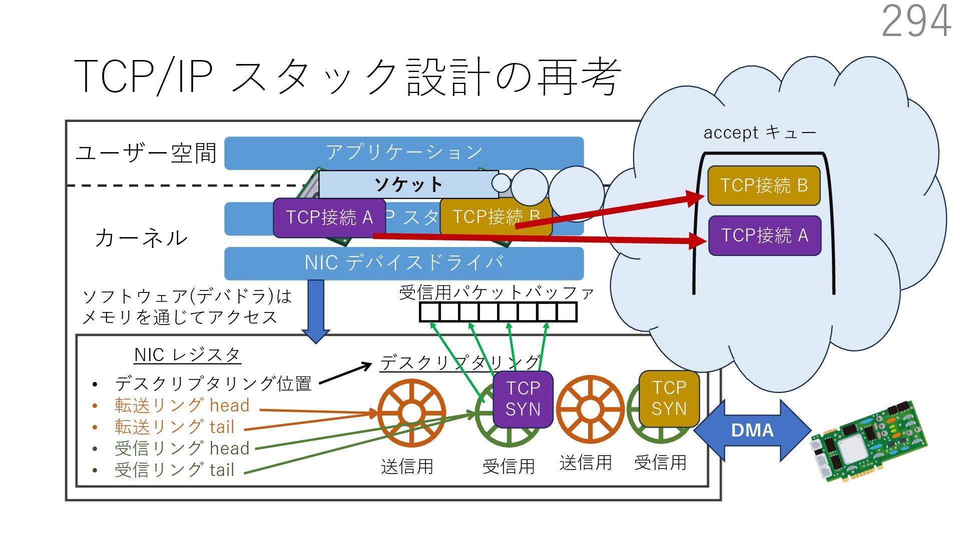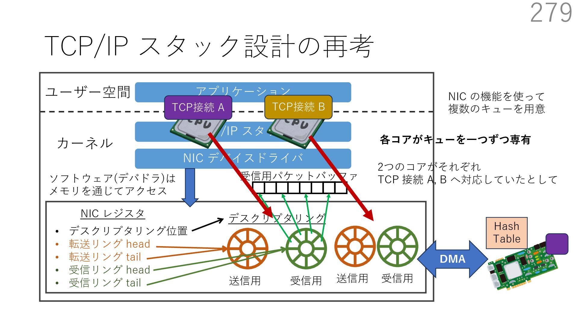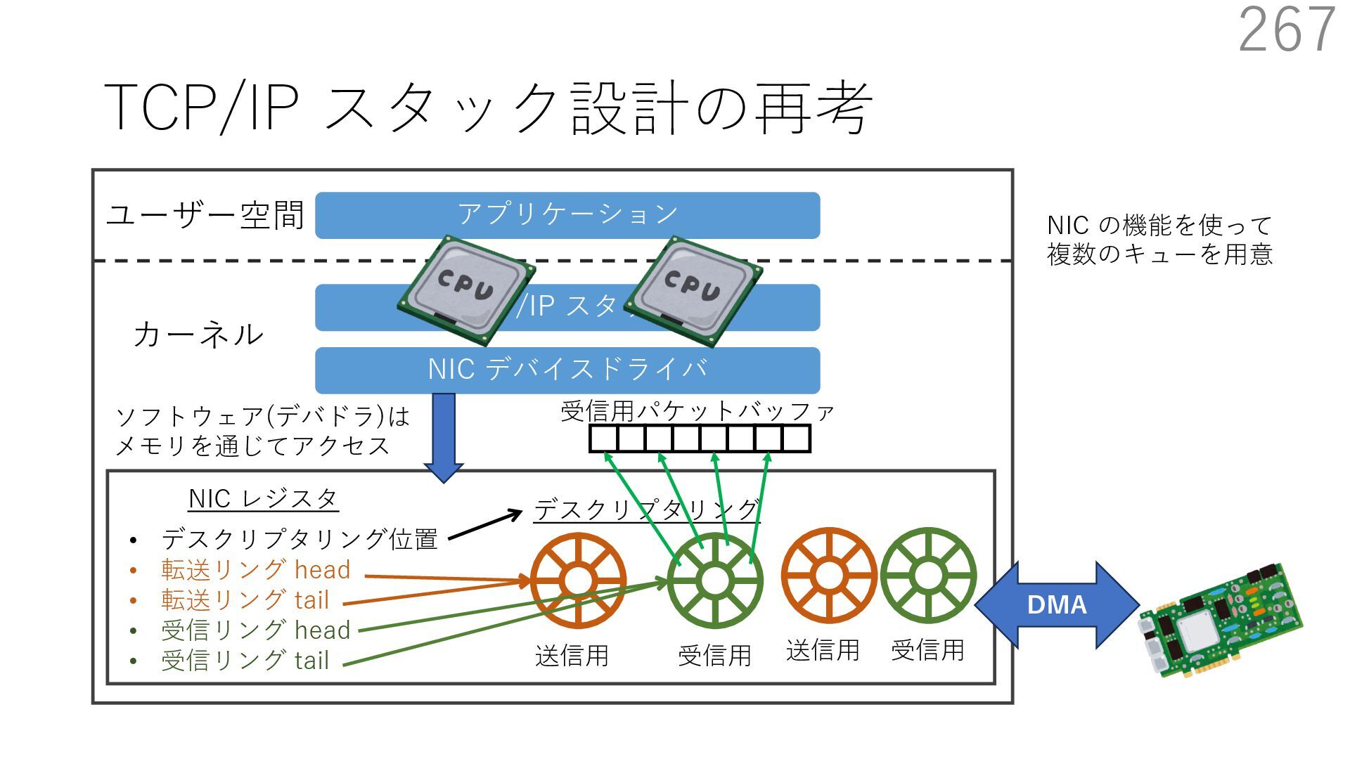 (SIGCOMM 2014) • mTCP (NSDI 2014) • Arrakis (OSDI 2014) • IX (OSDI 2014) • StackMap (USENIX ATC 2016) • Atlas (SIGCOMM 2017) • ZygOS (SOSP 2017) • Shenango (NSDI 2019) • Shinjuku (NSDI 2019) • TAS (EuroSys 2019) • Caladan (OSDI 2020) • Demikernel (SOSP 2021) 427 into a single library for both devices (e.g., RDMAxSPDK). We implemented the bulk of our library OS code in Rust. We initially prototyped several libOSes in C++; however, we found that Rust performs competitively with C++ and achieves ns-scale latencies while offering additional benefits. First, Rust enforces memory safety through language fea- tures and its compiler. Though our libOSes use unsafe code to bind to C/C++ kernel-bypass libraries and applications, User-space Software Kernel-space Software I/O Hardware I/O Device ??? libFuture ??? DPDK User I/O Buf. Mgmt libRDMA RDMA User I/O Buf. Mgmt Net. Trans. OS Kernel Control Path Demikernel Datapath Architecture App libPOSIX libDPDK SPDK User I/O Buf. Mgmt libSPDK Future Demikernel PDPIX Datapath API Figure 3. Demikernel kernel-bypass architecture. Demikernel ac- commodates heterogenous kernel-bypass devices, including poten- tial future hardware, with a flexible library OS-based datapath ar- chitecture.We include a libOS that goes through the OS kernel for 提案:異なるタイプのデバイスへ 共通のインターフェースからアクセス可能にする Irene Zhang, Amanda Raybuck, Pratyush Patel, Kirk Olynyk, Jacob Nelson, Omar S. Navarro Leija, Ashlie Martinez, Jing Liu, Anna Kornfeld Simpson, Sujay Jayakar, Pedro Henrique Penna, Max Demoulin, Piali Choudhury, and Anirudh Badam. 2021. The Demikernel Datapath OS Architecture for Microsecond-Scale Datacenter Systems. In Proceedings of the ACM Sigops 28th Symposium on Operating Systems Principles (SOSP ʼ21), 195-211.(https://doi.org/10.1145/3477132.3483569)