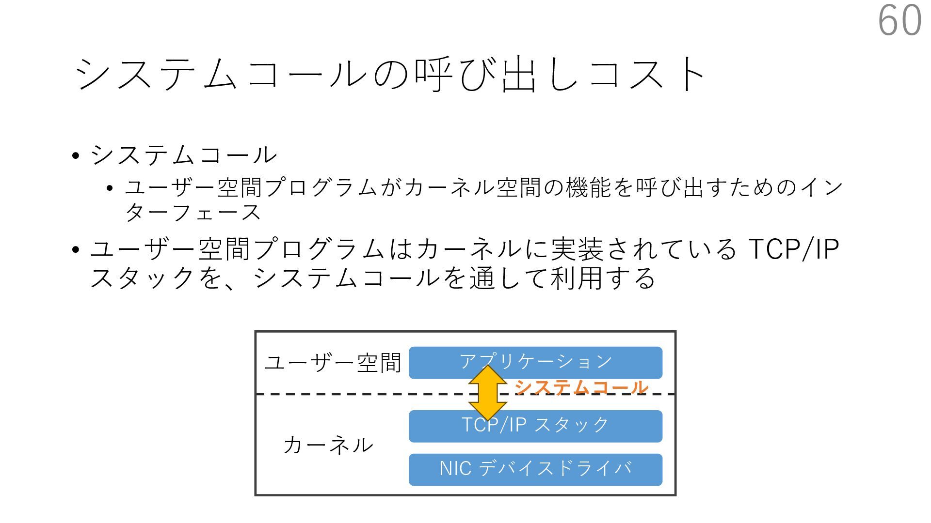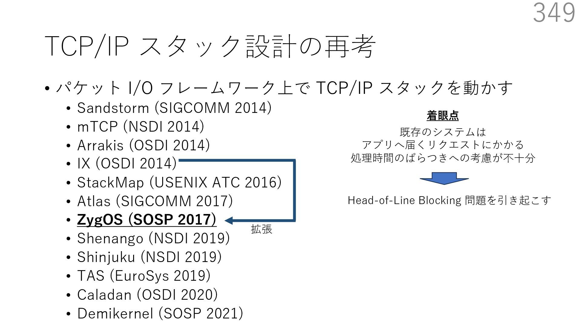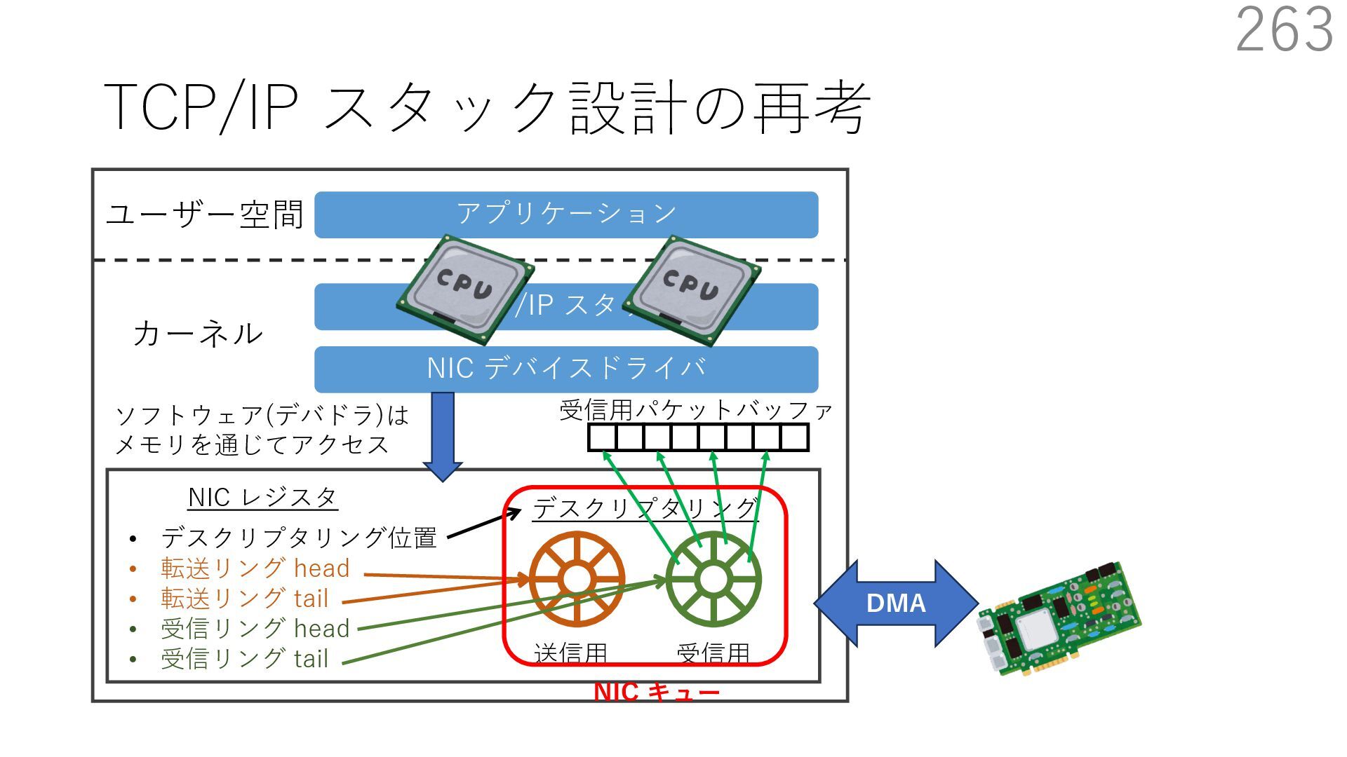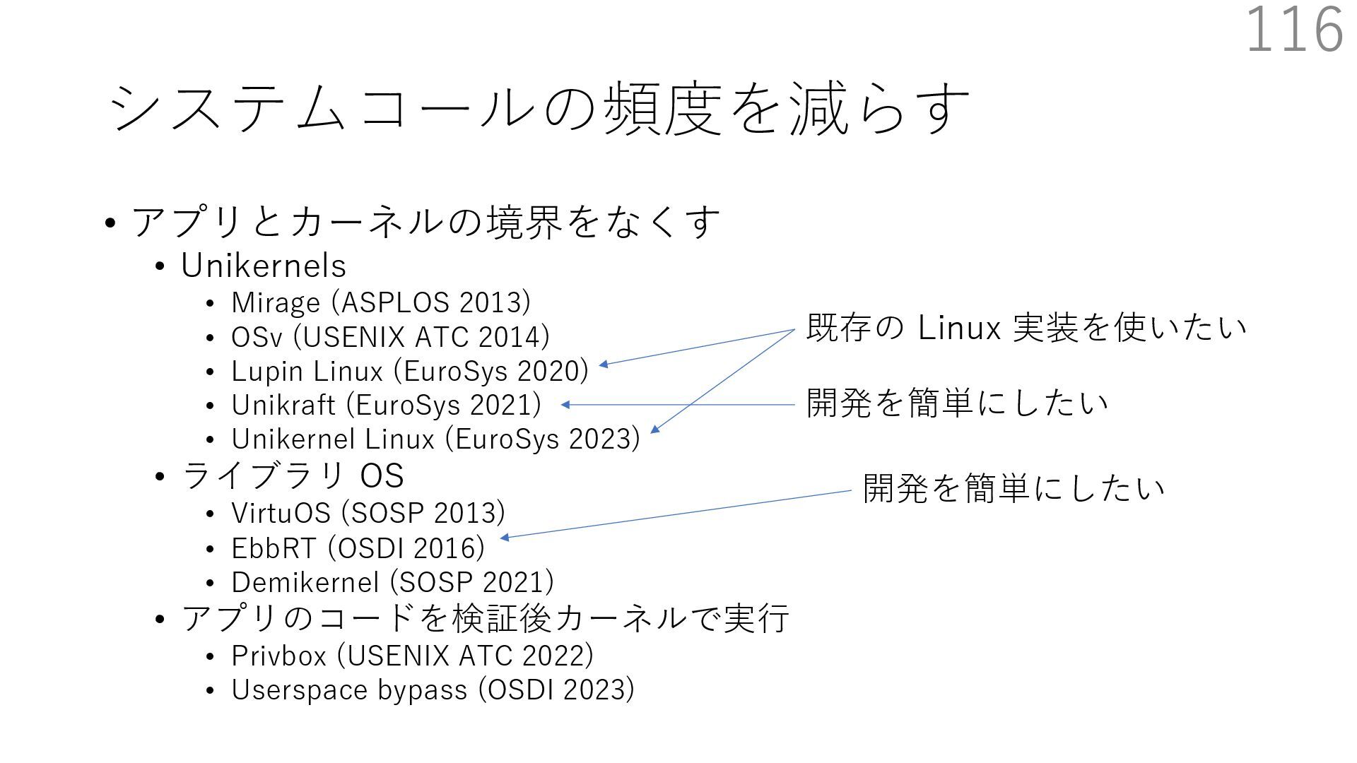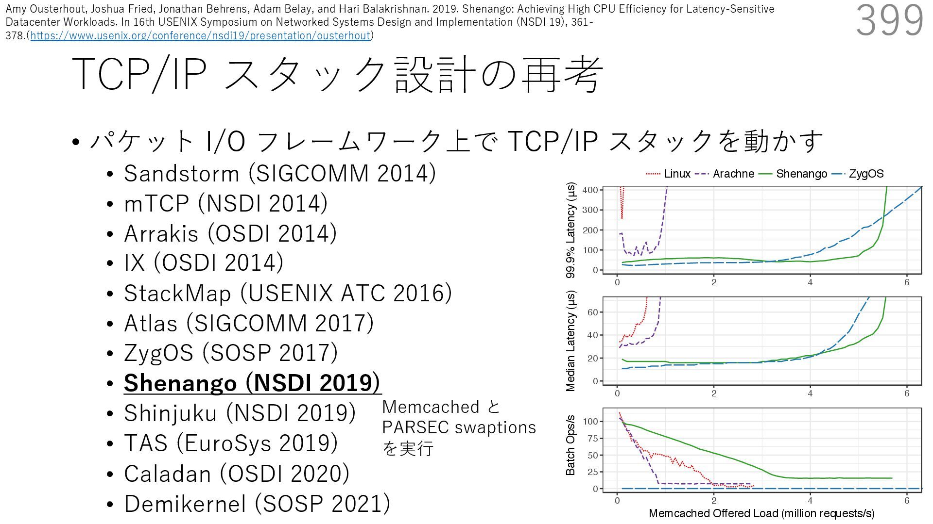 (SIGCOMM 2014) • mTCP (NSDI 2014) • Arrakis (OSDI 2014) • IX (OSDI 2014) • StackMap (USENIX ATC 2016) • Atlas (SIGCOMM 2017) • ZygOS (SOSP 2017) • Shenango (NSDI 2019) • Shinjuku (NSDI 2019) • TAS (EuroSys 2019) • Caladan (OSDI 2020) • Demikernel (SOSP 2021) 427 into a single library for both devices (e.g., RDMAxSPDK). We implemented the bulk of our library OS code in Rust. We initially prototyped several libOSes in C++; however, we found that Rust performs competitively with C++ and achieves ns-scale latencies while offering additional benefits. First, Rust enforces memory safety through language fea- tures and its compiler. Though our libOSes use unsafe code to bind to C/C++ kernel-bypass libraries and applications, User-space Software Kernel-space Software I/O Hardware I/O Device ??? libFuture ??? DPDK User I/O Buf. Mgmt libRDMA RDMA User I/O Buf. Mgmt Net. Trans. OS Kernel Control Path Demikernel Datapath Architecture App libPOSIX libDPDK SPDK User I/O Buf. Mgmt libSPDK Future Demikernel PDPIX Datapath API Figure 3. Demikernel kernel-bypass architecture. Demikernel ac- commodates heterogenous kernel-bypass devices, including poten- tial future hardware, with a flexible library OS-based datapath ar- chitecture.We include a libOS that goes through the OS kernel for 提案:異なるタイプのデバイスへ 共通のインターフェースからアクセス可能にする Irene Zhang, Amanda Raybuck, Pratyush Patel, Kirk Olynyk, Jacob Nelson, Omar S. Navarro Leija, Ashlie Martinez, Jing Liu, Anna Kornfeld Simpson, Sujay Jayakar, Pedro Henrique Penna, Max Demoulin, Piali Choudhury, and Anirudh Badam. 2021. The Demikernel Datapath OS Architecture for Microsecond-Scale Datacenter Systems. In Proceedings of the ACM Sigops 28th Symposium on Operating Systems Principles (SOSP ʼ21), 195-211.(https://doi.org/10.1145/3477132.3483569)