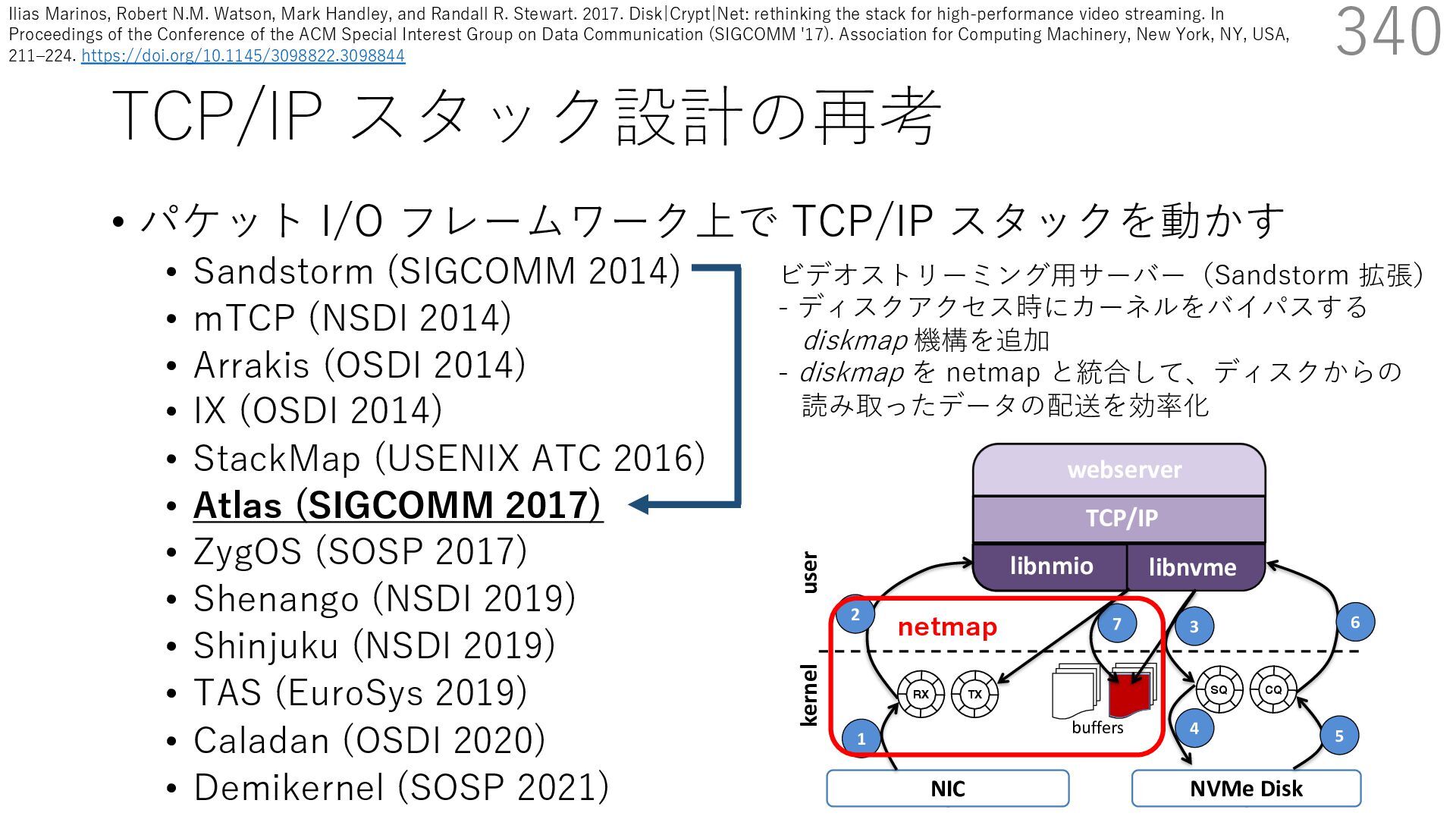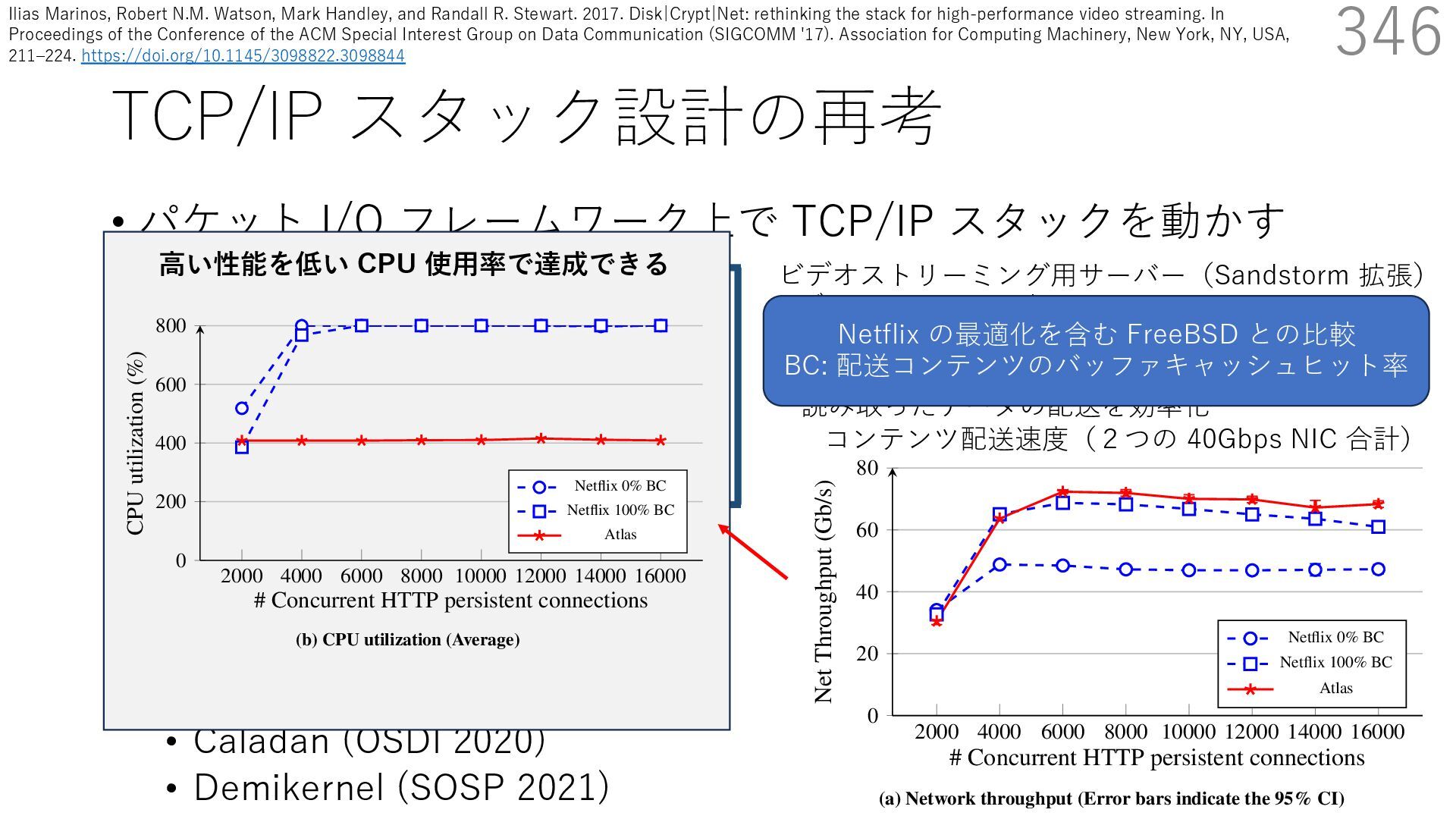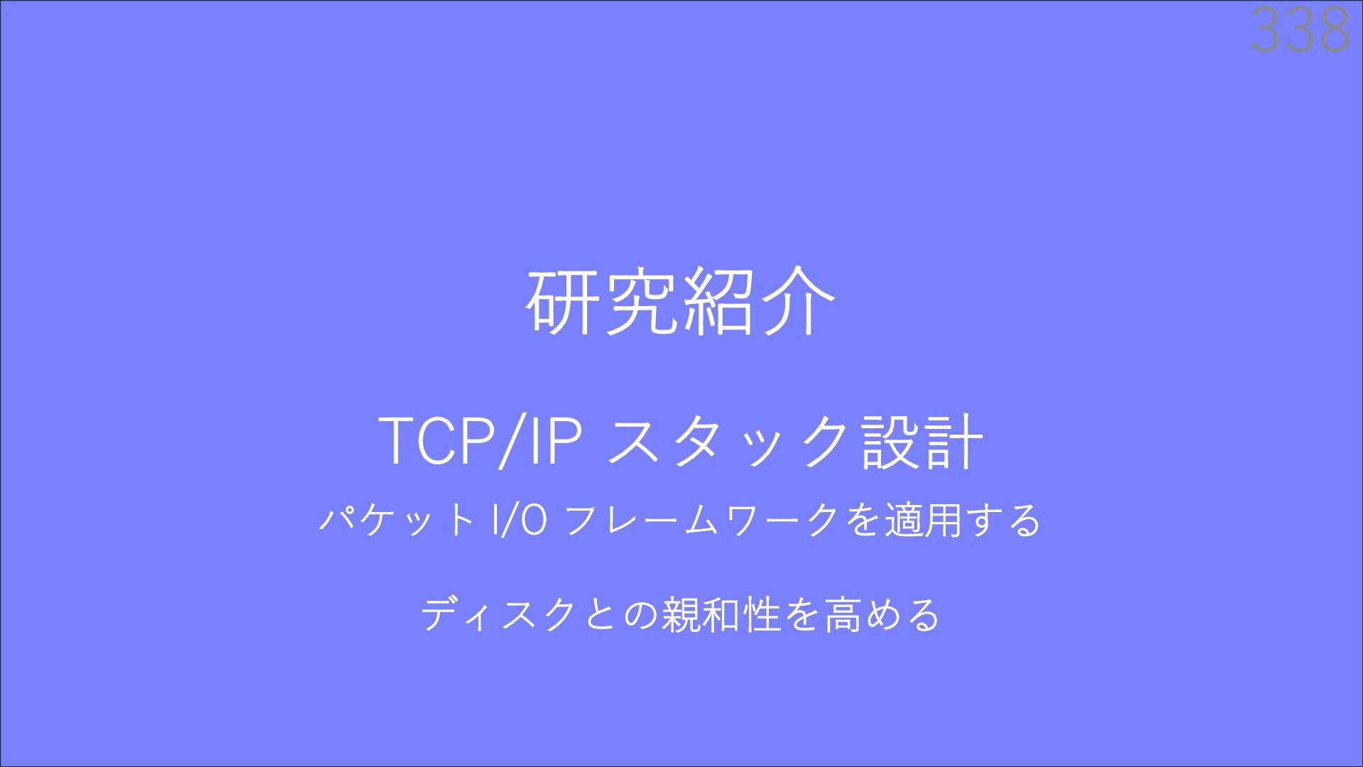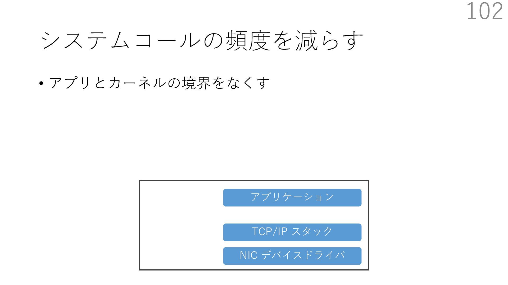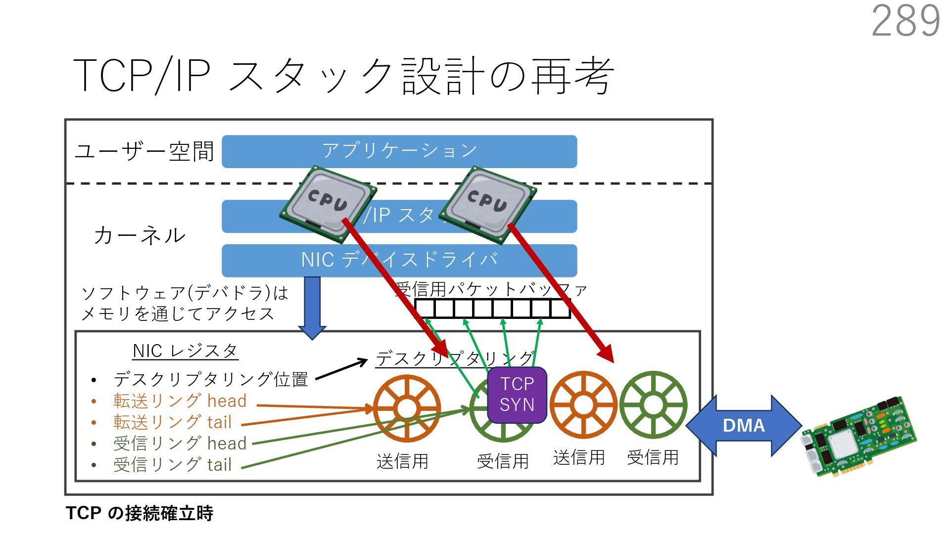 (SIGCOMM 2014) • mTCP (NSDI 2014) • Arrakis (OSDI 2014) • IX (OSDI 2014) • StackMap (USENIX ATC 2016) • Atlas (SIGCOMM 2017) • ZygOS (SOSP 2017) • Shenango (NSDI 2019) • Shinjuku (NSDI 2019) • TAS (EuroSys 2019) • Caladan (OSDI 2020) • Demikernel (SOSP 2021) 427 into a single library for both devices (e.g., RDMAxSPDK). We implemented the bulk of our library OS code in Rust. We initially prototyped several libOSes in C++; however, we found that Rust performs competitively with C++ and achieves ns-scale latencies while offering additional benefits. First, Rust enforces memory safety through language fea- tures and its compiler. Though our libOSes use unsafe code to bind to C/C++ kernel-bypass libraries and applications, User-space Software Kernel-space Software I/O Hardware I/O Device ??? libFuture ??? DPDK User I/O Buf. Mgmt libRDMA RDMA User I/O Buf. Mgmt Net. Trans. OS Kernel Control Path Demikernel Datapath Architecture App libPOSIX libDPDK SPDK User I/O Buf. Mgmt libSPDK Future Demikernel PDPIX Datapath API Figure 3. Demikernel kernel-bypass architecture. Demikernel ac- commodates heterogenous kernel-bypass devices, including poten- tial future hardware, with a flexible library OS-based datapath ar- chitecture.We include a libOS that goes through the OS kernel for 提案:異なるタイプのデバイスへ 共通のインターフェースからアクセス可能にする Irene Zhang, Amanda Raybuck, Pratyush Patel, Kirk Olynyk, Jacob Nelson, Omar S. Navarro Leija, Ashlie Martinez, Jing Liu, Anna Kornfeld Simpson, Sujay Jayakar, Pedro Henrique Penna, Max Demoulin, Piali Choudhury, and Anirudh Badam. 2021. The Demikernel Datapath OS Architecture for Microsecond-Scale Datacenter Systems. In Proceedings of the ACM Sigops 28th Symposium on Operating Systems Principles (SOSP ʼ21), 195-211.(https://doi.org/10.1145/3477132.3483569)