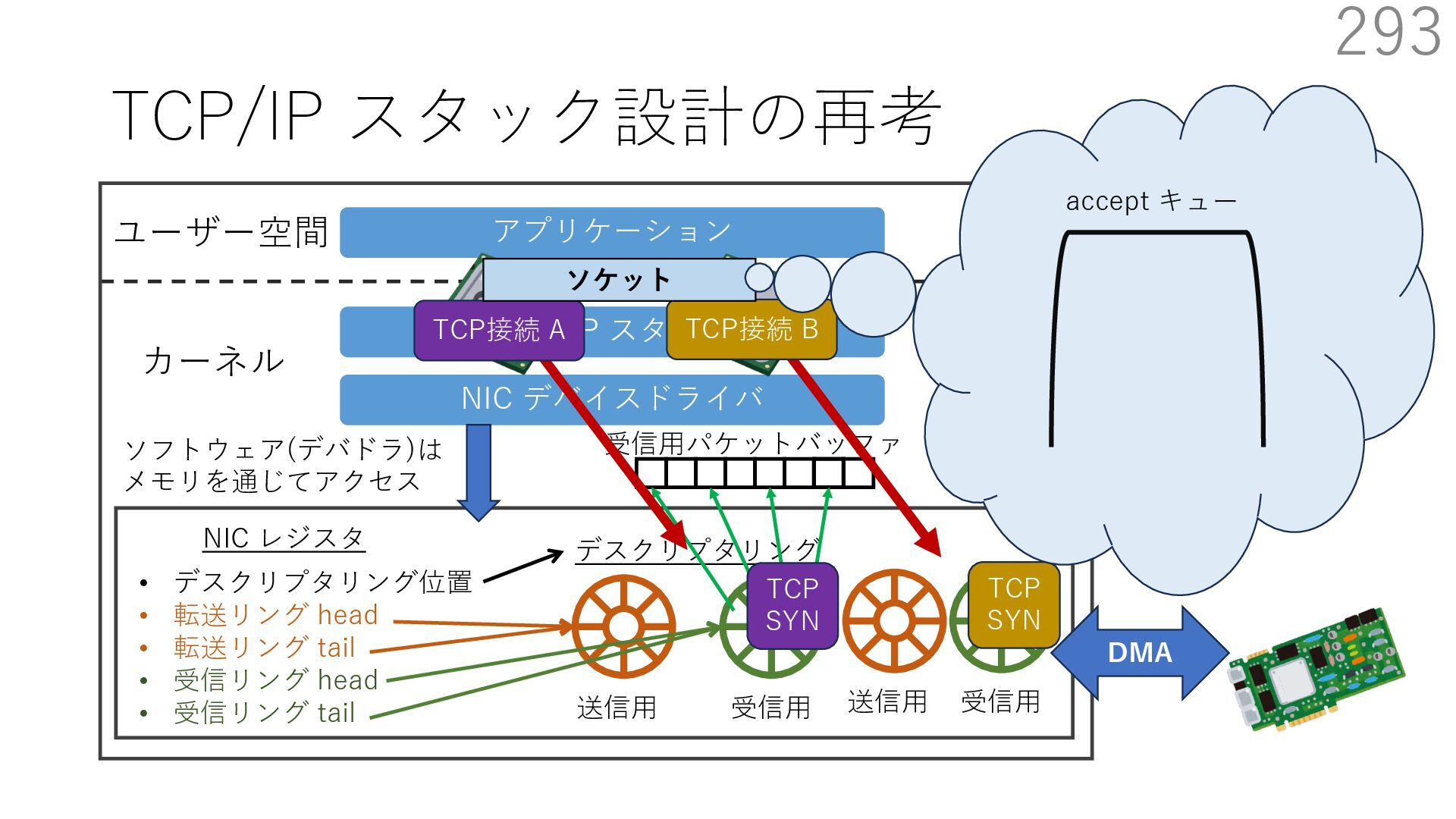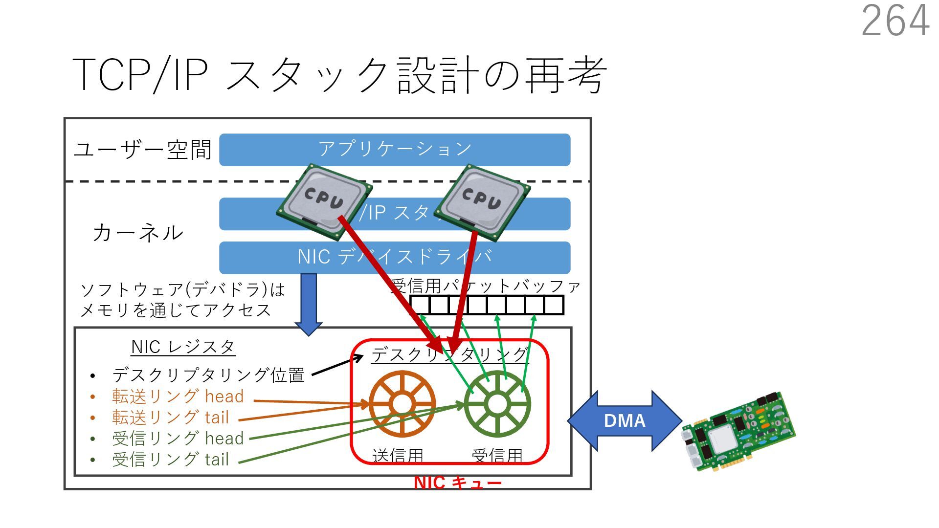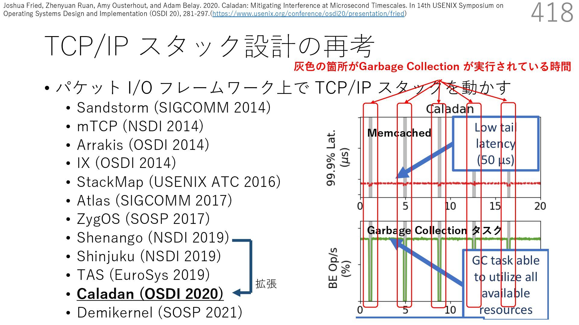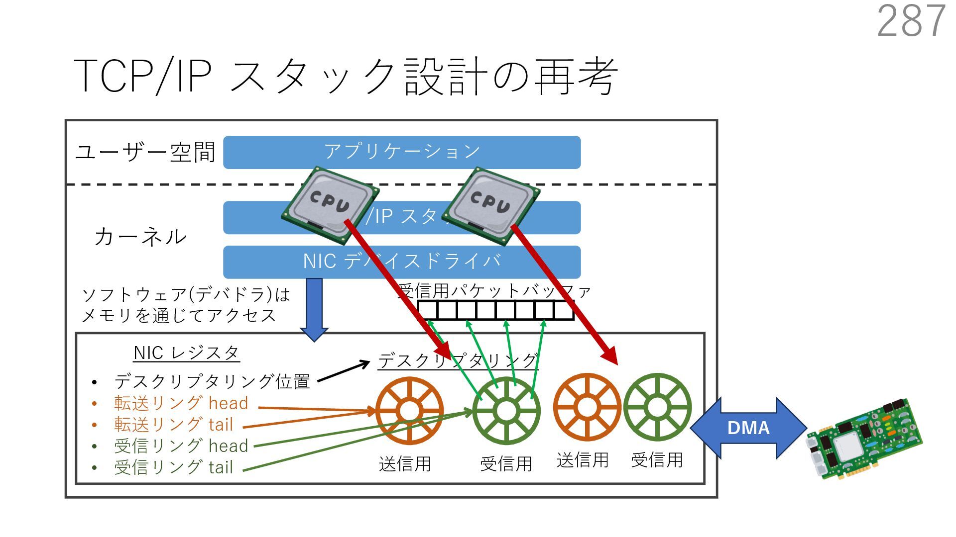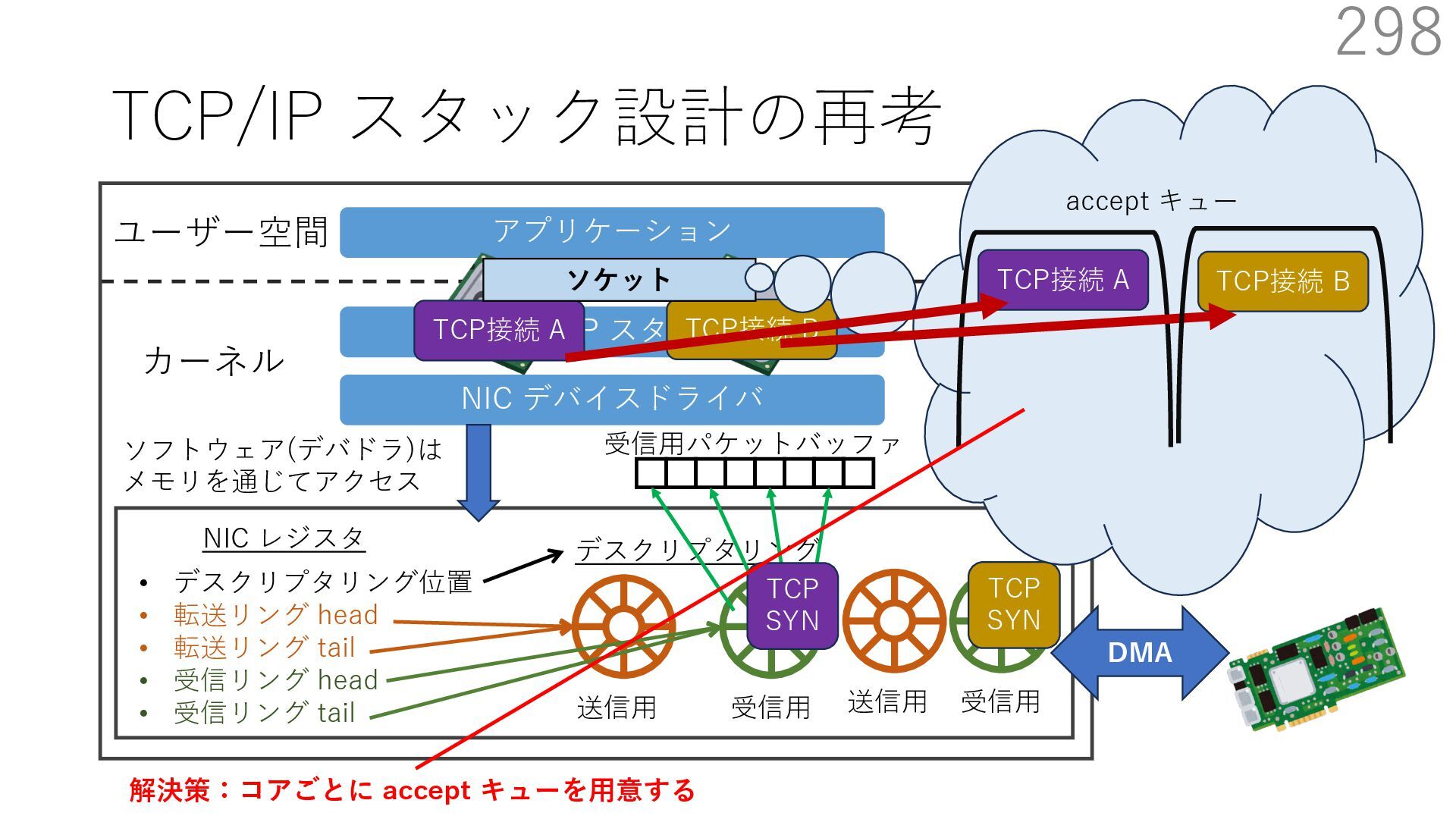 (SIGCOMM 2014) • mTCP (NSDI 2014) • Arrakis (OSDI 2014) • IX (OSDI 2014) • StackMap (USENIX ATC 2016) • Atlas (SIGCOMM 2017) • ZygOS (SOSP 2017) • Shenango (NSDI 2019) • Shinjuku (NSDI 2019) • TAS (EuroSys 2019) • Caladan (OSDI 2020) • Demikernel (SOSP 2021) 427 into a single library for both devices (e.g., RDMAxSPDK). We implemented the bulk of our library OS code in Rust. We initially prototyped several libOSes in C++; however, we found that Rust performs competitively with C++ and achieves ns-scale latencies while offering additional benefits. First, Rust enforces memory safety through language fea- tures and its compiler. Though our libOSes use unsafe code to bind to C/C++ kernel-bypass libraries and applications, User-space Software Kernel-space Software I/O Hardware I/O Device ??? libFuture ??? DPDK User I/O Buf. Mgmt libRDMA RDMA User I/O Buf. Mgmt Net. Trans. OS Kernel Control Path Demikernel Datapath Architecture App libPOSIX libDPDK SPDK User I/O Buf. Mgmt libSPDK Future Demikernel PDPIX Datapath API Figure 3. Demikernel kernel-bypass architecture. Demikernel ac- commodates heterogenous kernel-bypass devices, including poten- tial future hardware, with a flexible library OS-based datapath ar- chitecture.We include a libOS that goes through the OS kernel for 提案:異なるタイプのデバイスへ 共通のインターフェースからアクセス可能にする Irene Zhang, Amanda Raybuck, Pratyush Patel, Kirk Olynyk, Jacob Nelson, Omar S. Navarro Leija, Ashlie Martinez, Jing Liu, Anna Kornfeld Simpson, Sujay Jayakar, Pedro Henrique Penna, Max Demoulin, Piali Choudhury, and Anirudh Badam. 2021. The Demikernel Datapath OS Architecture for Microsecond-Scale Datacenter Systems. In Proceedings of the ACM Sigops 28th Symposium on Operating Systems Principles (SOSP ʼ21), 195-211.(https://doi.org/10.1145/3477132.3483569)