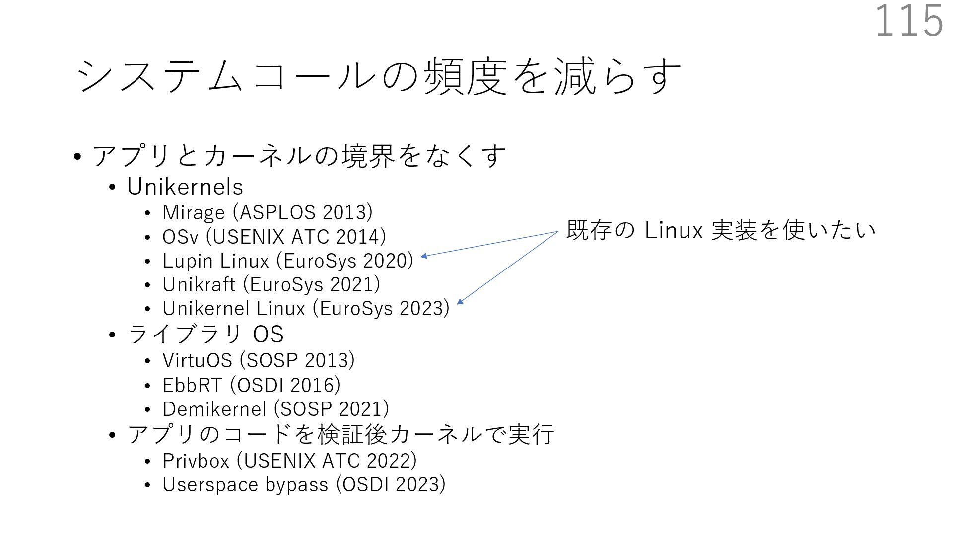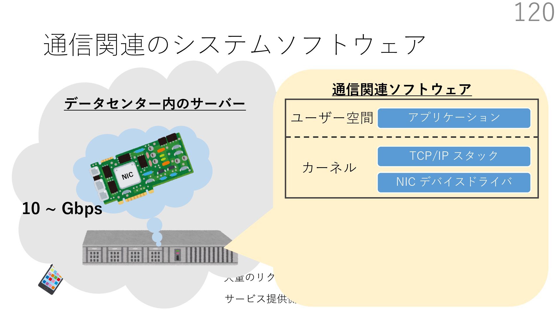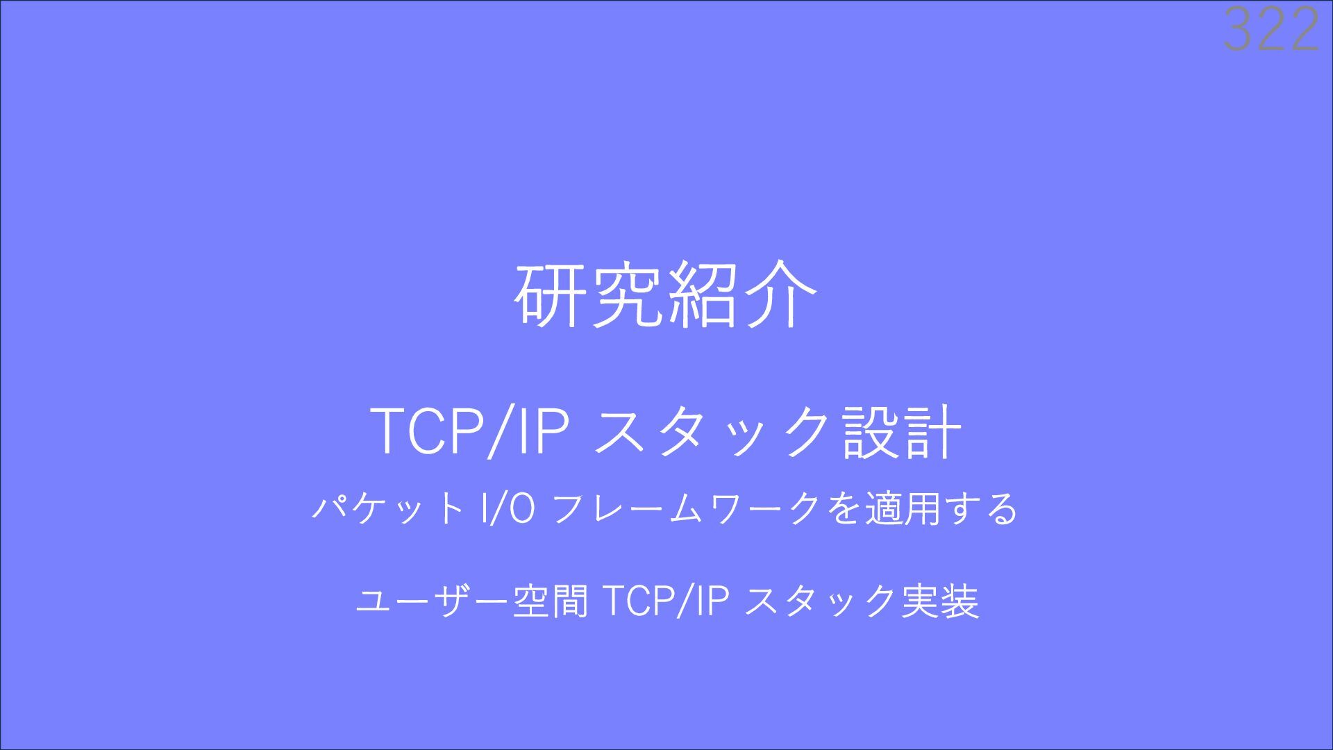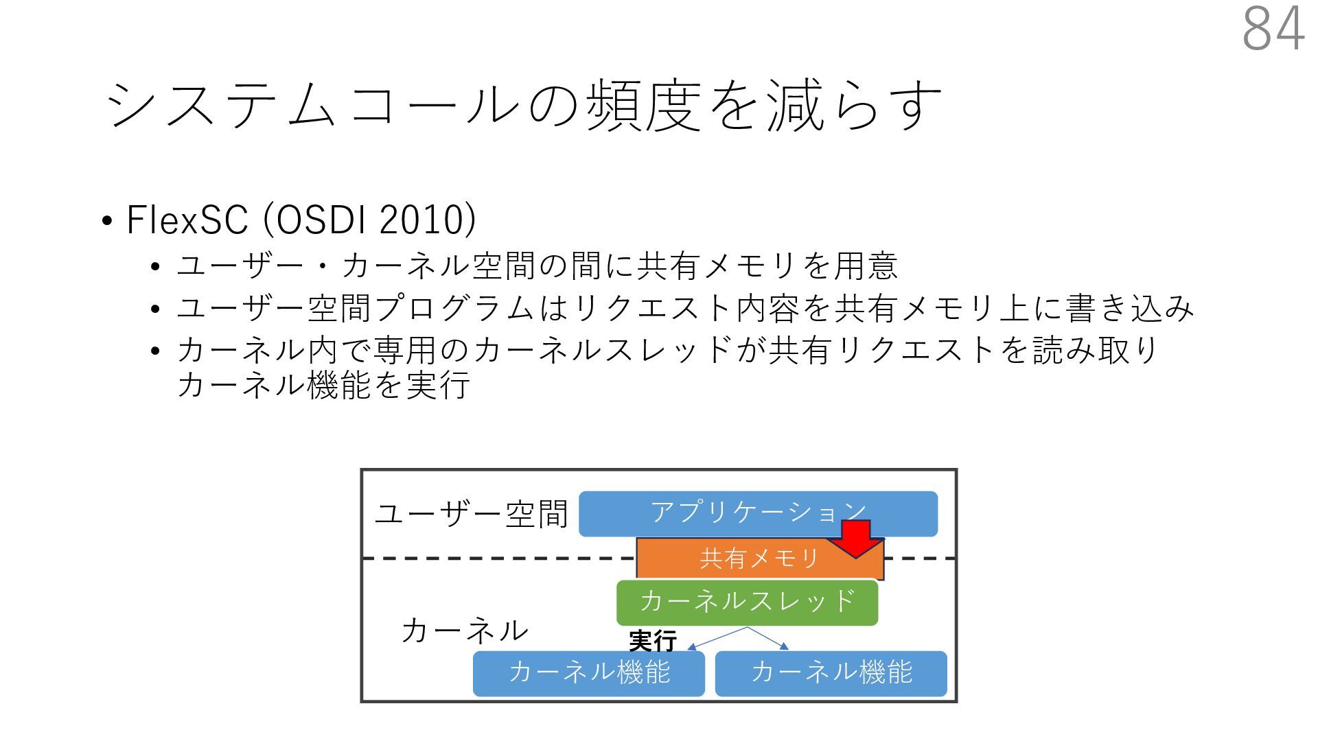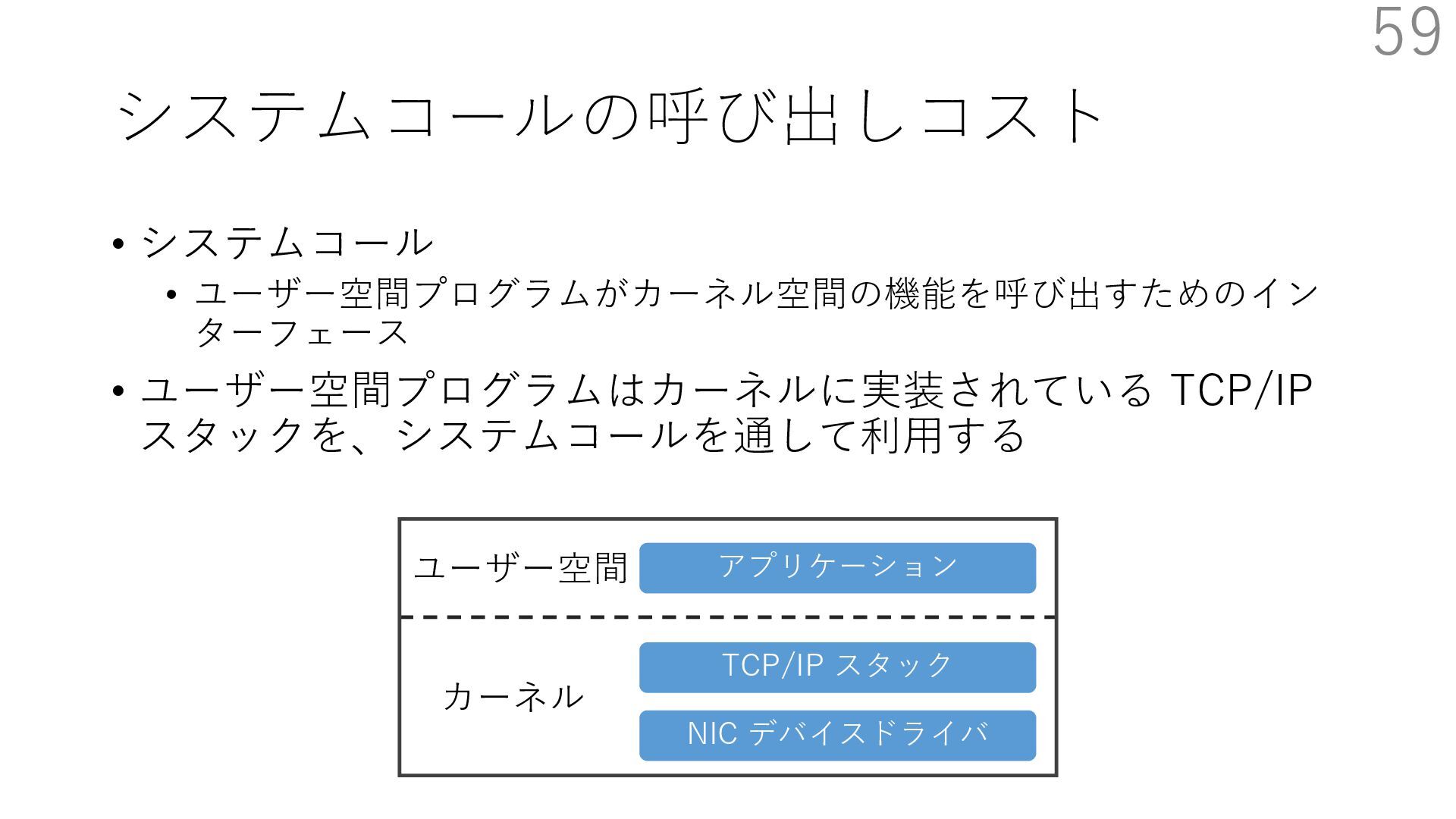(SIGCOMM 2014) • mTCP (NSDI 2014) • Arrakis (OSDI 2014) • IX (OSDI 2014) • StackMap (USENIX ATC 2016) • Atlas (SIGCOMM 2017) • ZygOS (SOSP 2017) • Shenango (NSDI 2019) • Shinjuku (NSDI 2019) • TAS (EuroSys 2019) • Caladan (OSDI 2020) • Demikernel (SOSP 2021) 427 into a single library for both devices (e.g., RDMAxSPDK). We implemented the bulk of our library OS code in Rust. We initially prototyped several libOSes in C++; however, we found that Rust performs competitively with C++ and achieves ns-scale latencies while offering additional benefits. First, Rust enforces memory safety through language fea- tures and its compiler. Though our libOSes use unsafe code to bind to C/C++ kernel-bypass libraries and applications, User-space Software Kernel-space Software I/O Hardware I/O Device ??? libFuture ??? DPDK User I/O Buf. Mgmt libRDMA RDMA User I/O Buf. Mgmt Net. Trans. OS Kernel Control Path Demikernel Datapath Architecture App libPOSIX libDPDK SPDK User I/O Buf. Mgmt libSPDK Future Demikernel PDPIX Datapath API Figure 3. Demikernel kernel-bypass architecture. Demikernel ac- commodates heterogenous kernel-bypass devices, including poten- tial future hardware, with a flexible library OS-based datapath ar- chitecture.We include a libOS that goes through the OS kernel for 提案:異なるタイプのデバイスへ 共通のインターフェースからアクセス可能にする Irene Zhang, Amanda Raybuck, Pratyush Patel, Kirk Olynyk, Jacob Nelson, Omar S. Navarro Leija, Ashlie Martinez, Jing Liu, Anna Kornfeld Simpson, Sujay Jayakar, Pedro Henrique Penna, Max Demoulin, Piali Choudhury, and Anirudh Badam. 2021. The Demikernel Datapath OS Architecture for Microsecond-Scale Datacenter Systems. In Proceedings of the ACM Sigops 28th Symposium on Operating Systems Principles (SOSP ʼ21), 195-211.(https://doi.org/10.1145/3477132.3483569)