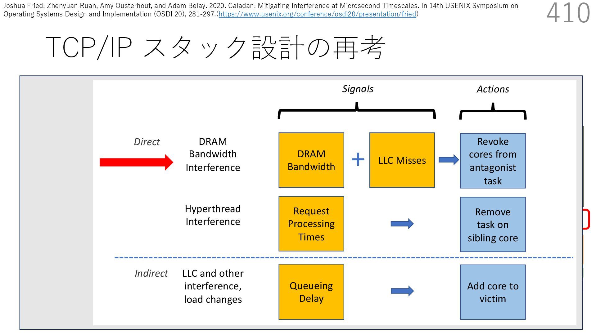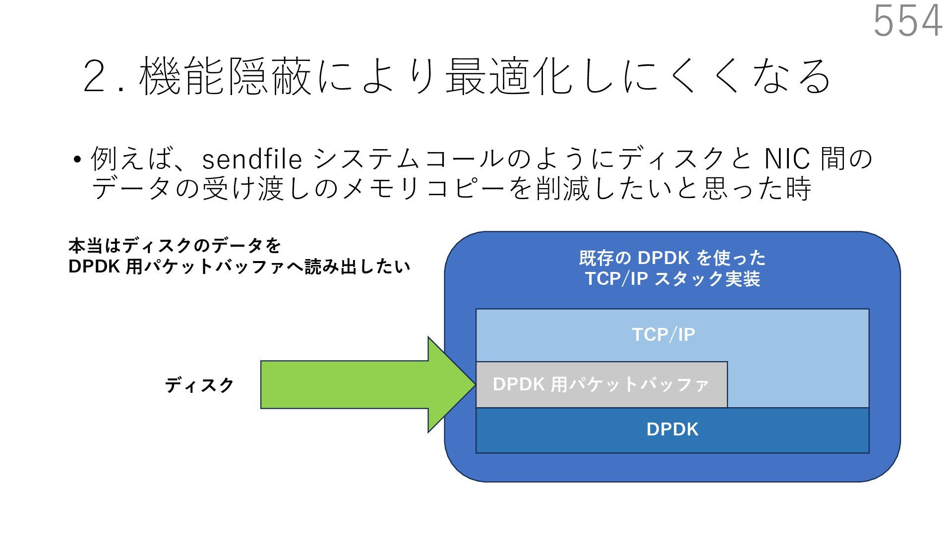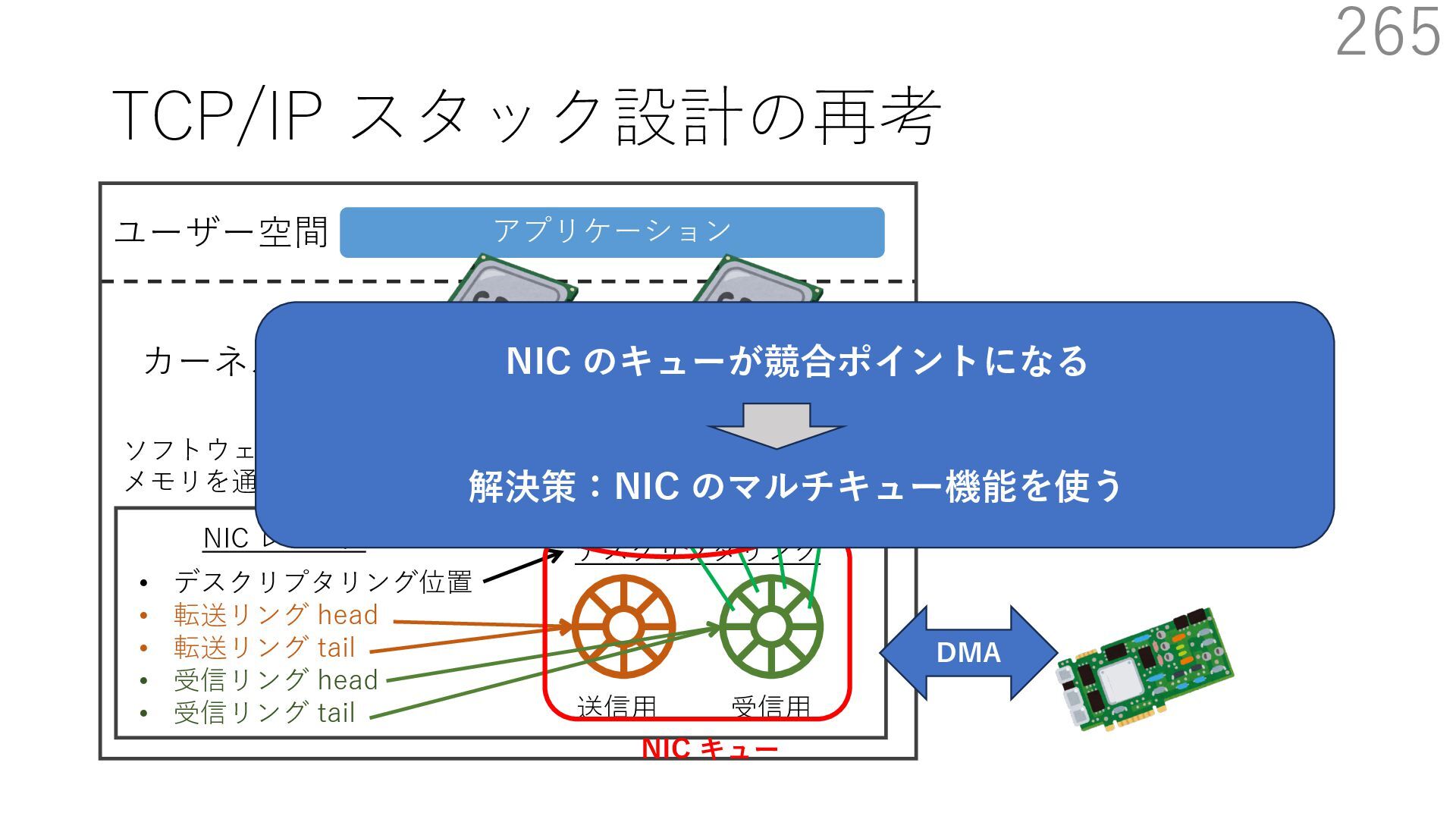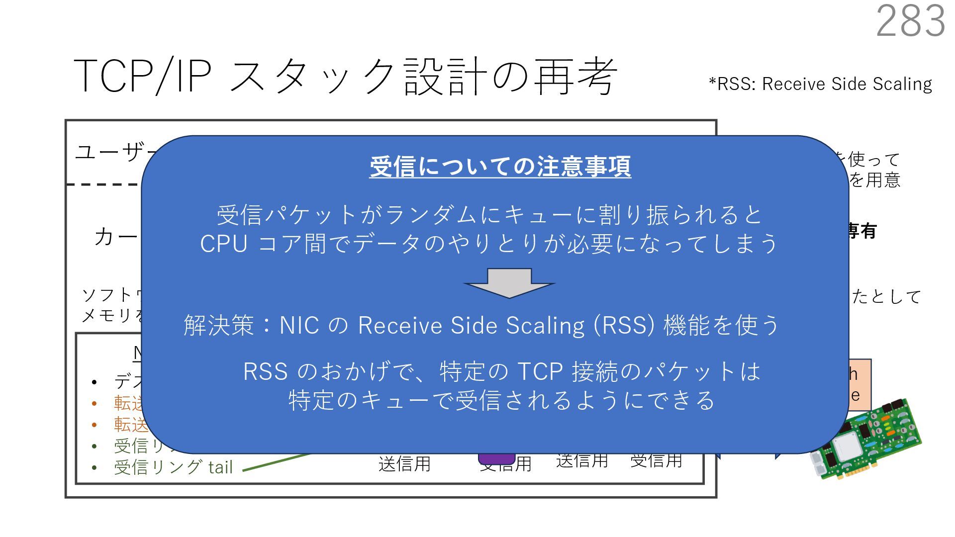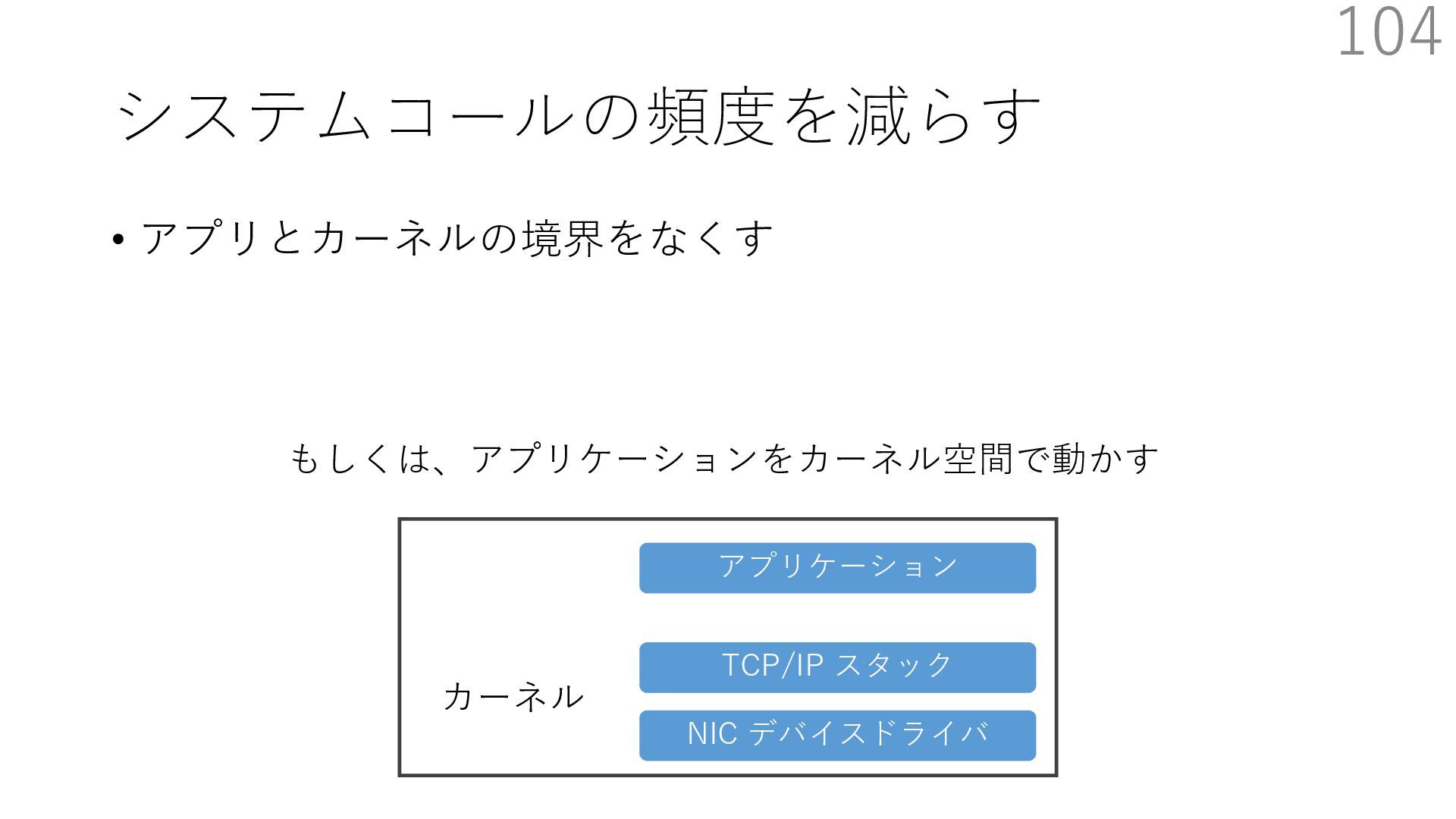 (SIGCOMM 2014) • mTCP (NSDI 2014) • Arrakis (OSDI 2014) • IX (OSDI 2014) • StackMap (USENIX ATC 2016) • Atlas (SIGCOMM 2017) • ZygOS (SOSP 2017) • Shenango (NSDI 2019) • Shinjuku (NSDI 2019) • TAS (EuroSys 2019) • Caladan (OSDI 2020) • Demikernel (SOSP 2021) 427 into a single library for both devices (e.g., RDMAxSPDK). We implemented the bulk of our library OS code in Rust. We initially prototyped several libOSes in C++; however, we found that Rust performs competitively with C++ and achieves ns-scale latencies while offering additional benefits. First, Rust enforces memory safety through language fea- tures and its compiler. Though our libOSes use unsafe code to bind to C/C++ kernel-bypass libraries and applications, User-space Software Kernel-space Software I/O Hardware I/O Device ??? libFuture ??? DPDK User I/O Buf. Mgmt libRDMA RDMA User I/O Buf. Mgmt Net. Trans. OS Kernel Control Path Demikernel Datapath Architecture App libPOSIX libDPDK SPDK User I/O Buf. Mgmt libSPDK Future Demikernel PDPIX Datapath API Figure 3. Demikernel kernel-bypass architecture. Demikernel ac- commodates heterogenous kernel-bypass devices, including poten- tial future hardware, with a flexible library OS-based datapath ar- chitecture.We include a libOS that goes through the OS kernel for 提案:異なるタイプのデバイスへ 共通のインターフェースからアクセス可能にする Irene Zhang, Amanda Raybuck, Pratyush Patel, Kirk Olynyk, Jacob Nelson, Omar S. Navarro Leija, Ashlie Martinez, Jing Liu, Anna Kornfeld Simpson, Sujay Jayakar, Pedro Henrique Penna, Max Demoulin, Piali Choudhury, and Anirudh Badam. 2021. The Demikernel Datapath OS Architecture for Microsecond-Scale Datacenter Systems. In Proceedings of the ACM Sigops 28th Symposium on Operating Systems Principles (SOSP ʼ21), 195-211.(https://doi.org/10.1145/3477132.3483569)