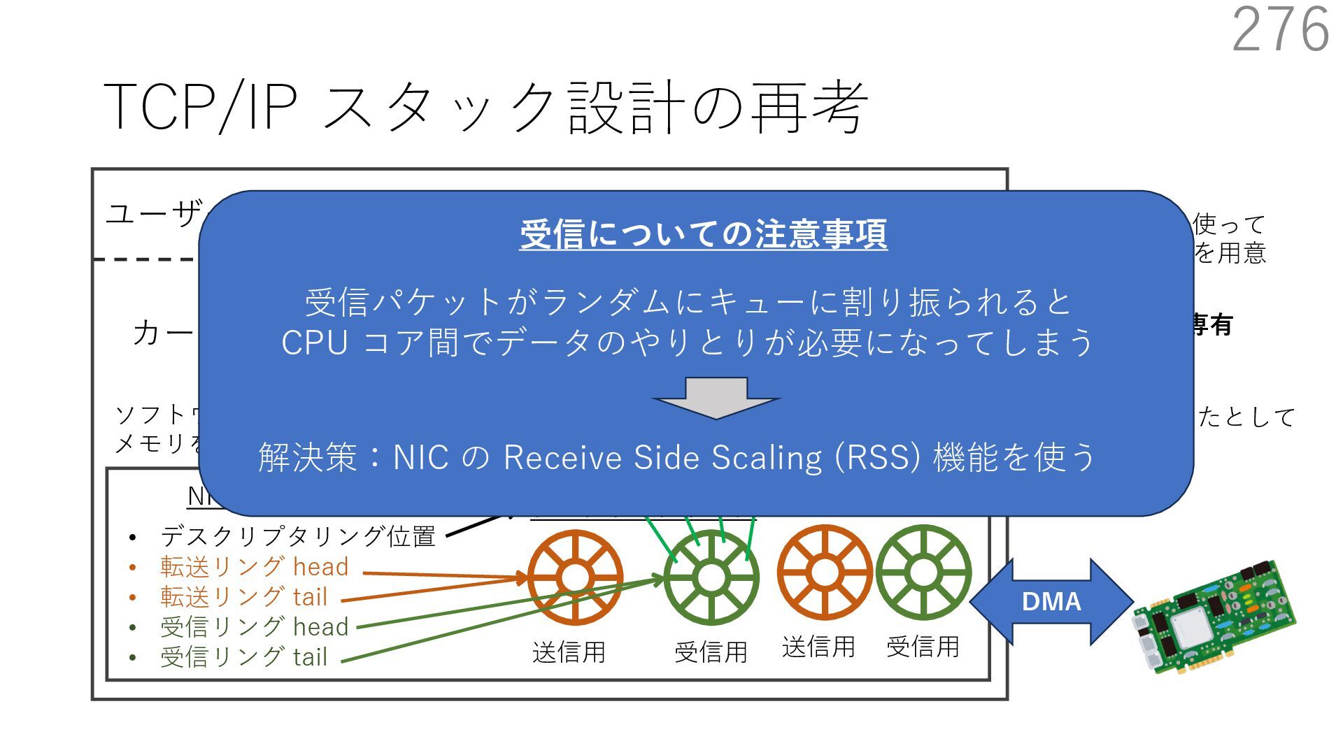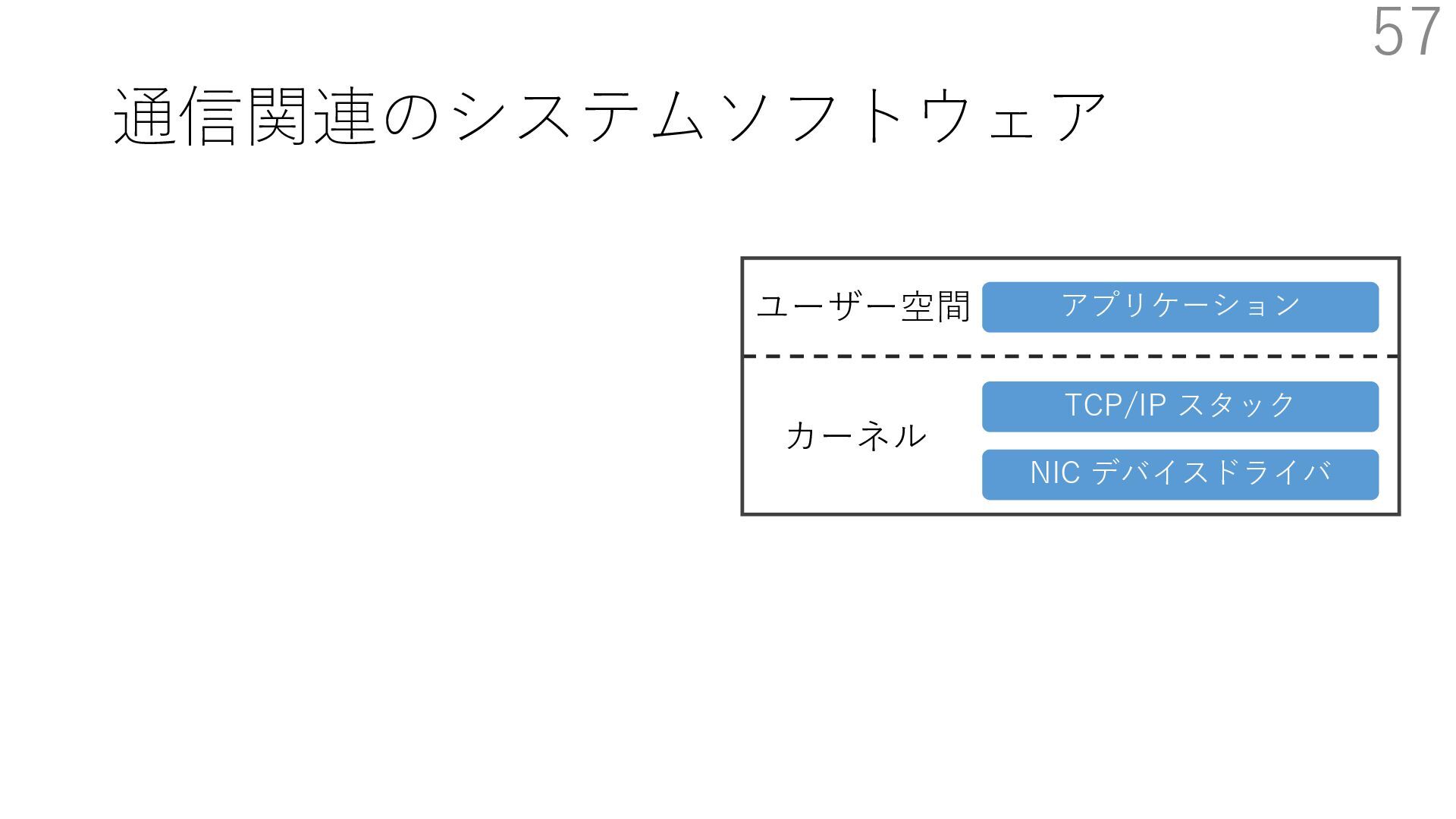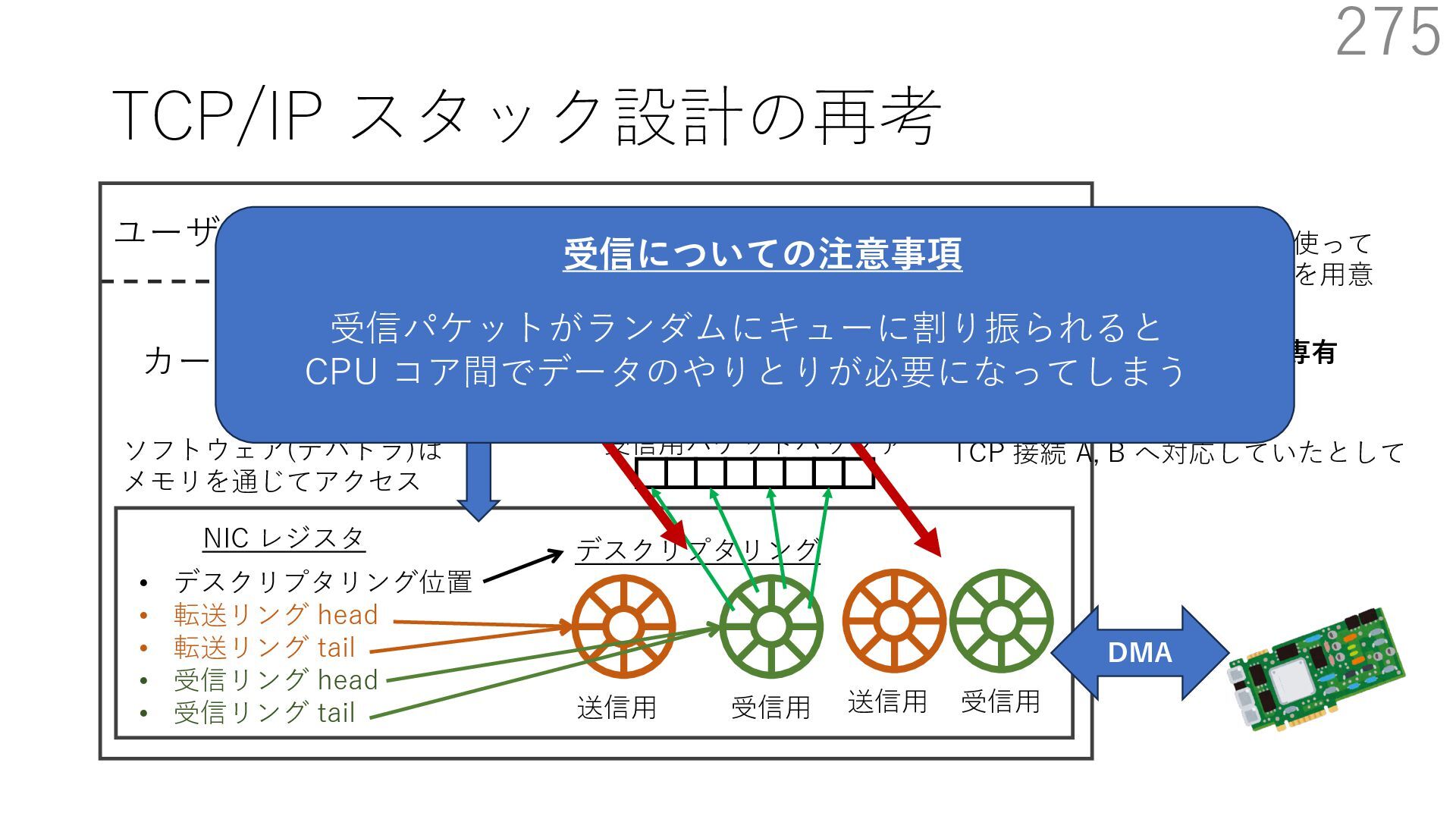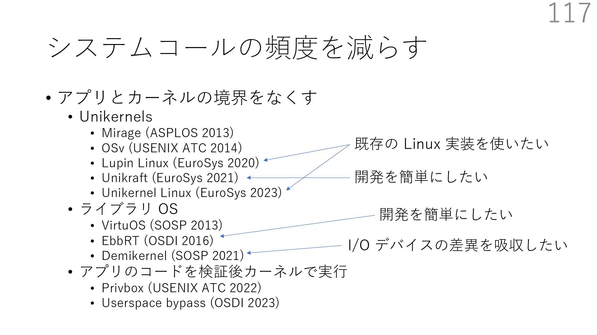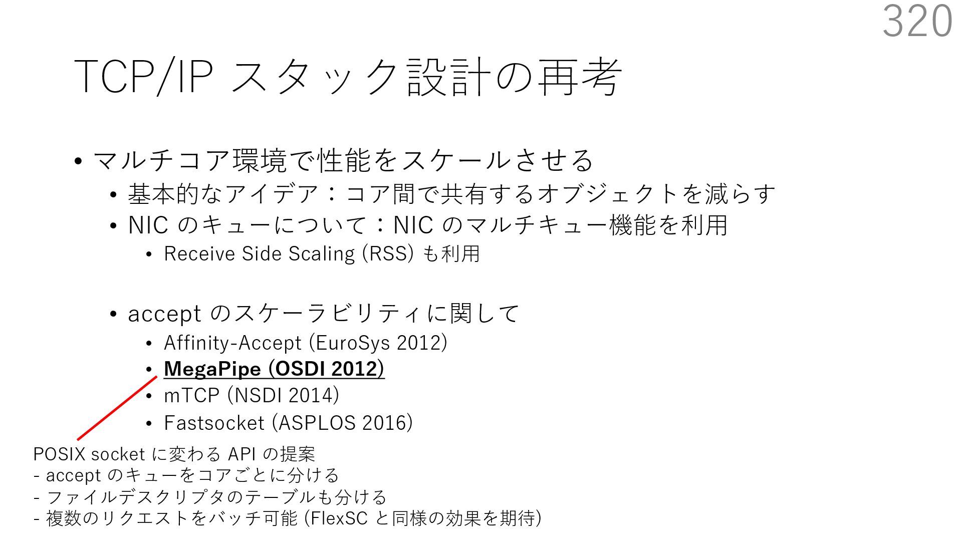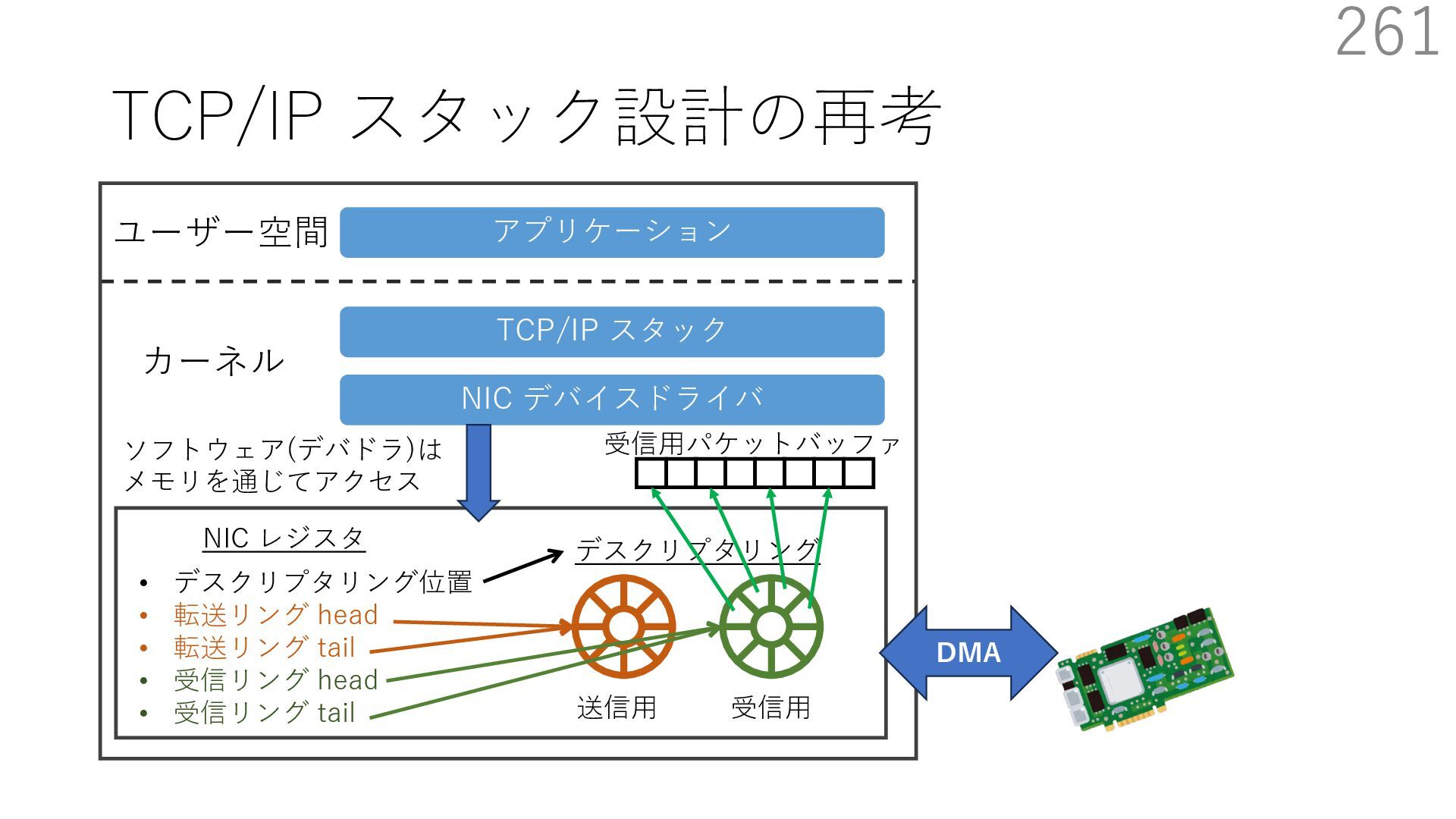 (SIGCOMM 2014) • mTCP (NSDI 2014) • Arrakis (OSDI 2014) • IX (OSDI 2014) • StackMap (USENIX ATC 2016) • Atlas (SIGCOMM 2017) • ZygOS (SOSP 2017) • Shenango (NSDI 2019) • Shinjuku (NSDI 2019) • TAS (EuroSys 2019) • Caladan (OSDI 2020) • Demikernel (SOSP 2021) 427 into a single library for both devices (e.g., RDMAxSPDK). We implemented the bulk of our library OS code in Rust. We initially prototyped several libOSes in C++; however, we found that Rust performs competitively with C++ and achieves ns-scale latencies while offering additional benefits. First, Rust enforces memory safety through language fea- tures and its compiler. Though our libOSes use unsafe code to bind to C/C++ kernel-bypass libraries and applications, User-space Software Kernel-space Software I/O Hardware I/O Device ??? libFuture ??? DPDK User I/O Buf. Mgmt libRDMA RDMA User I/O Buf. Mgmt Net. Trans. OS Kernel Control Path Demikernel Datapath Architecture App libPOSIX libDPDK SPDK User I/O Buf. Mgmt libSPDK Future Demikernel PDPIX Datapath API Figure 3. Demikernel kernel-bypass architecture. Demikernel ac- commodates heterogenous kernel-bypass devices, including poten- tial future hardware, with a flexible library OS-based datapath ar- chitecture.We include a libOS that goes through the OS kernel for 提案:異なるタイプのデバイスへ 共通のインターフェースからアクセス可能にする Irene Zhang, Amanda Raybuck, Pratyush Patel, Kirk Olynyk, Jacob Nelson, Omar S. Navarro Leija, Ashlie Martinez, Jing Liu, Anna Kornfeld Simpson, Sujay Jayakar, Pedro Henrique Penna, Max Demoulin, Piali Choudhury, and Anirudh Badam. 2021. The Demikernel Datapath OS Architecture for Microsecond-Scale Datacenter Systems. In Proceedings of the ACM Sigops 28th Symposium on Operating Systems Principles (SOSP ʼ21), 195-211.(https://doi.org/10.1145/3477132.3483569)