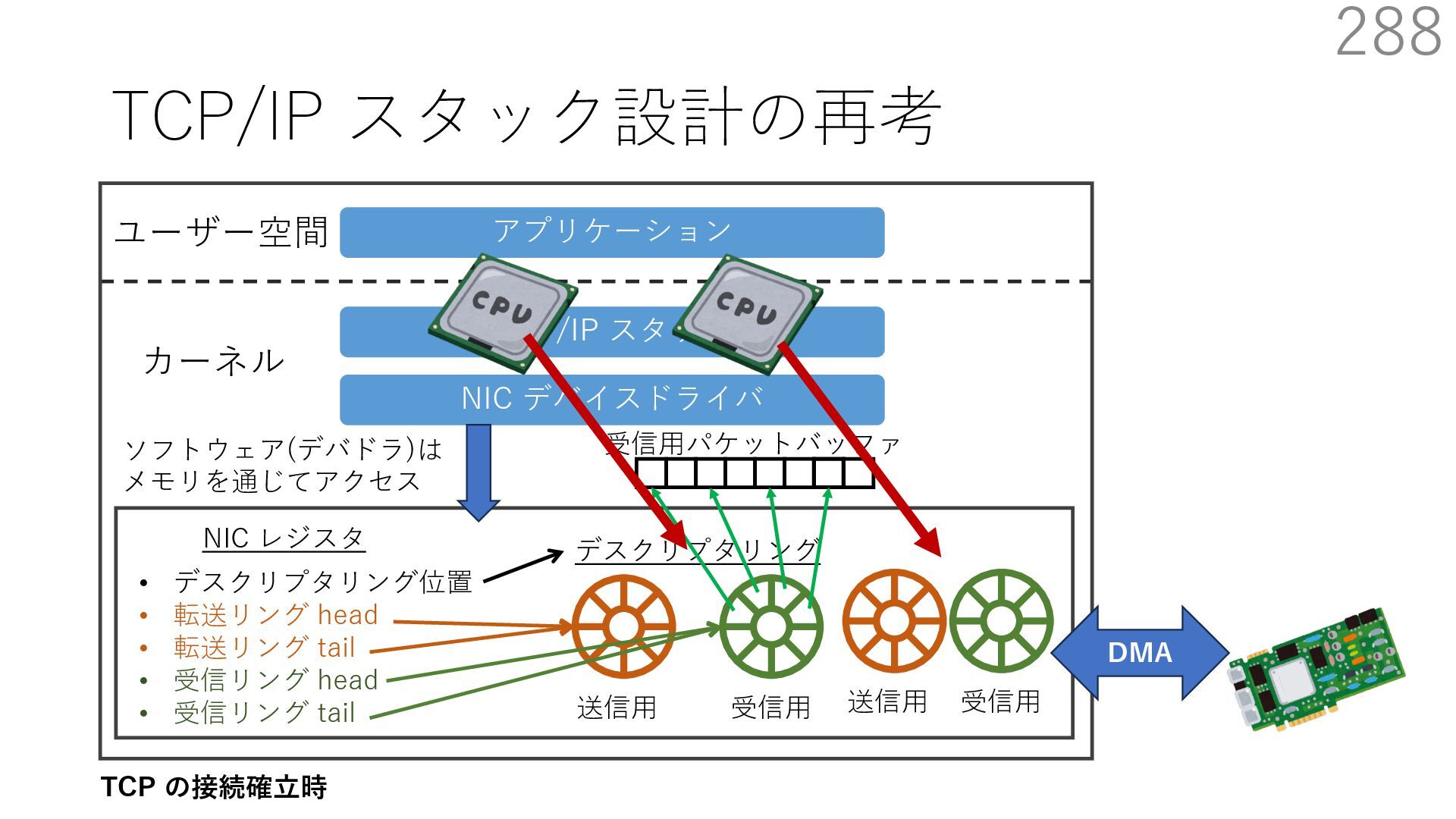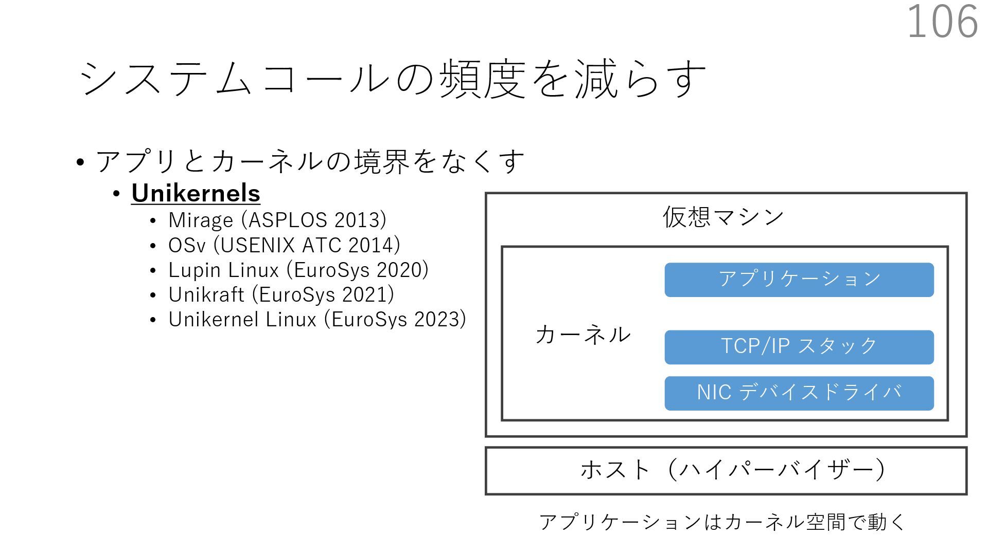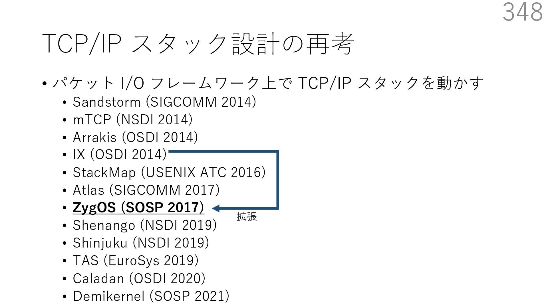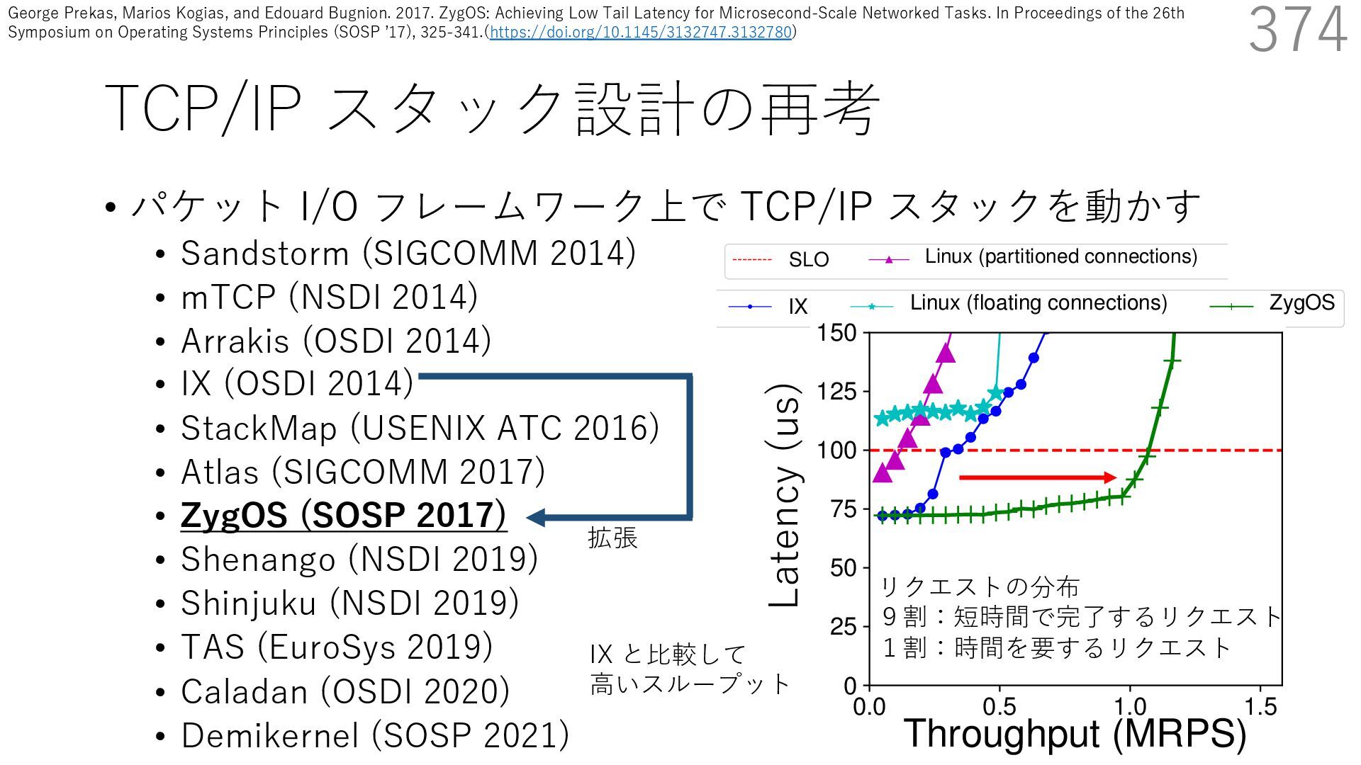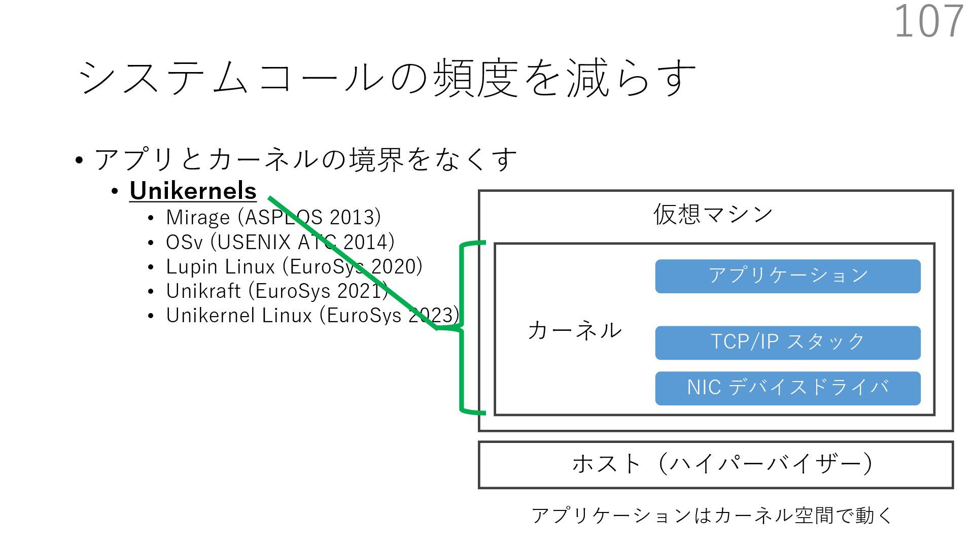 (SIGCOMM 2014) • mTCP (NSDI 2014) • Arrakis (OSDI 2014) • IX (OSDI 2014) • StackMap (USENIX ATC 2016) • Atlas (SIGCOMM 2017) • ZygOS (SOSP 2017) • Shenango (NSDI 2019) • Shinjuku (NSDI 2019) • TAS (EuroSys 2019) • Caladan (OSDI 2020) • Demikernel (SOSP 2021) 427 into a single library for both devices (e.g., RDMAxSPDK). We implemented the bulk of our library OS code in Rust. We initially prototyped several libOSes in C++; however, we found that Rust performs competitively with C++ and achieves ns-scale latencies while offering additional benefits. First, Rust enforces memory safety through language fea- tures and its compiler. Though our libOSes use unsafe code to bind to C/C++ kernel-bypass libraries and applications, User-space Software Kernel-space Software I/O Hardware I/O Device ??? libFuture ??? DPDK User I/O Buf. Mgmt libRDMA RDMA User I/O Buf. Mgmt Net. Trans. OS Kernel Control Path Demikernel Datapath Architecture App libPOSIX libDPDK SPDK User I/O Buf. Mgmt libSPDK Future Demikernel PDPIX Datapath API Figure 3. Demikernel kernel-bypass architecture. Demikernel ac- commodates heterogenous kernel-bypass devices, including poten- tial future hardware, with a flexible library OS-based datapath ar- chitecture.We include a libOS that goes through the OS kernel for 提案:異なるタイプのデバイスへ 共通のインターフェースからアクセス可能にする Irene Zhang, Amanda Raybuck, Pratyush Patel, Kirk Olynyk, Jacob Nelson, Omar S. Navarro Leija, Ashlie Martinez, Jing Liu, Anna Kornfeld Simpson, Sujay Jayakar, Pedro Henrique Penna, Max Demoulin, Piali Choudhury, and Anirudh Badam. 2021. The Demikernel Datapath OS Architecture for Microsecond-Scale Datacenter Systems. In Proceedings of the ACM Sigops 28th Symposium on Operating Systems Principles (SOSP ʼ21), 195-211.(https://doi.org/10.1145/3477132.3483569)
