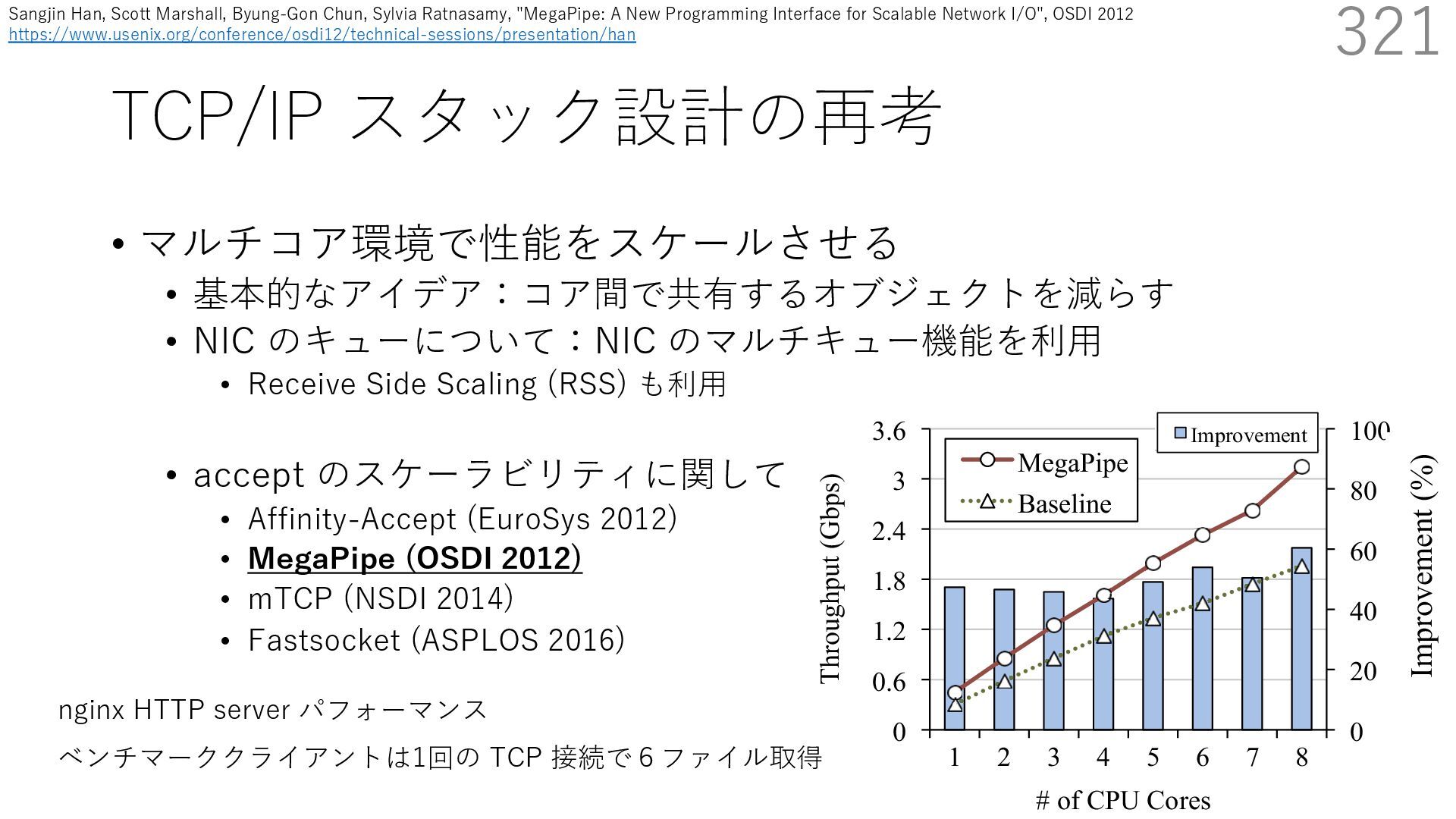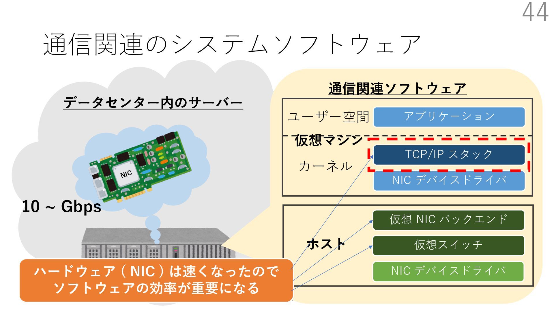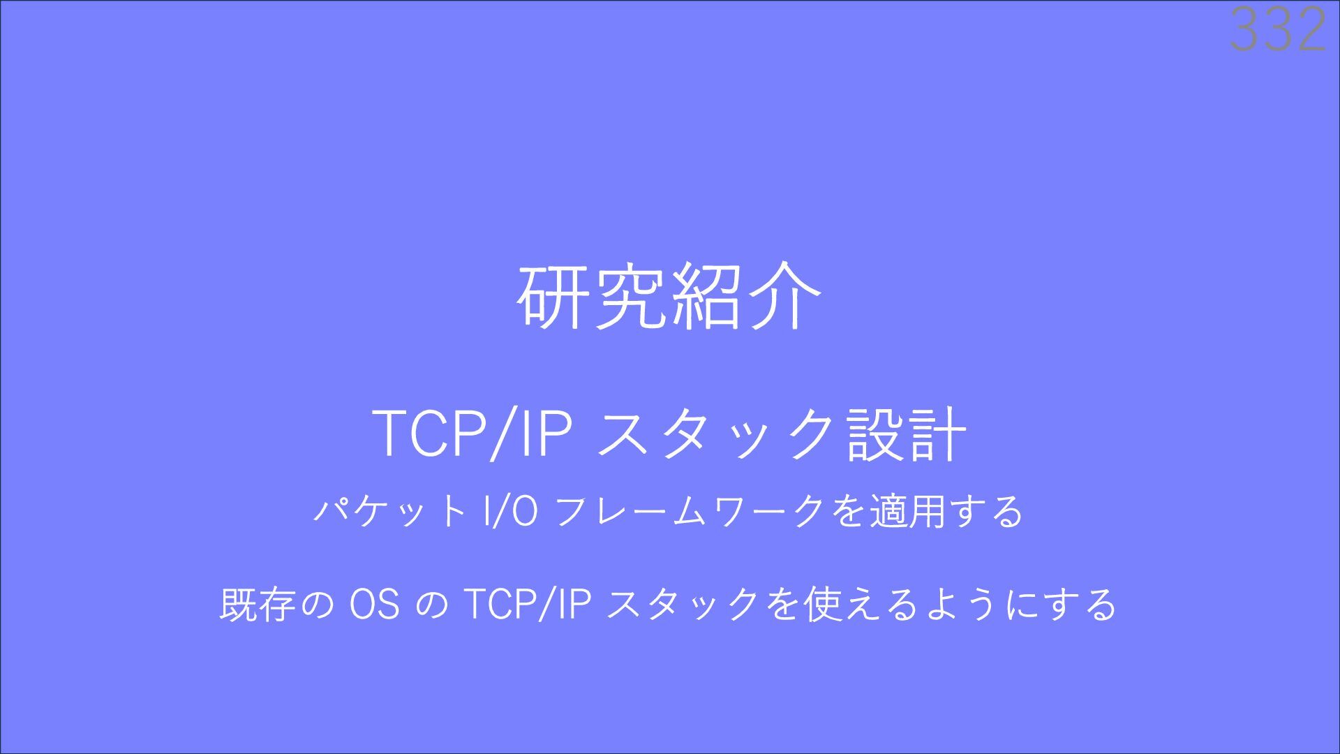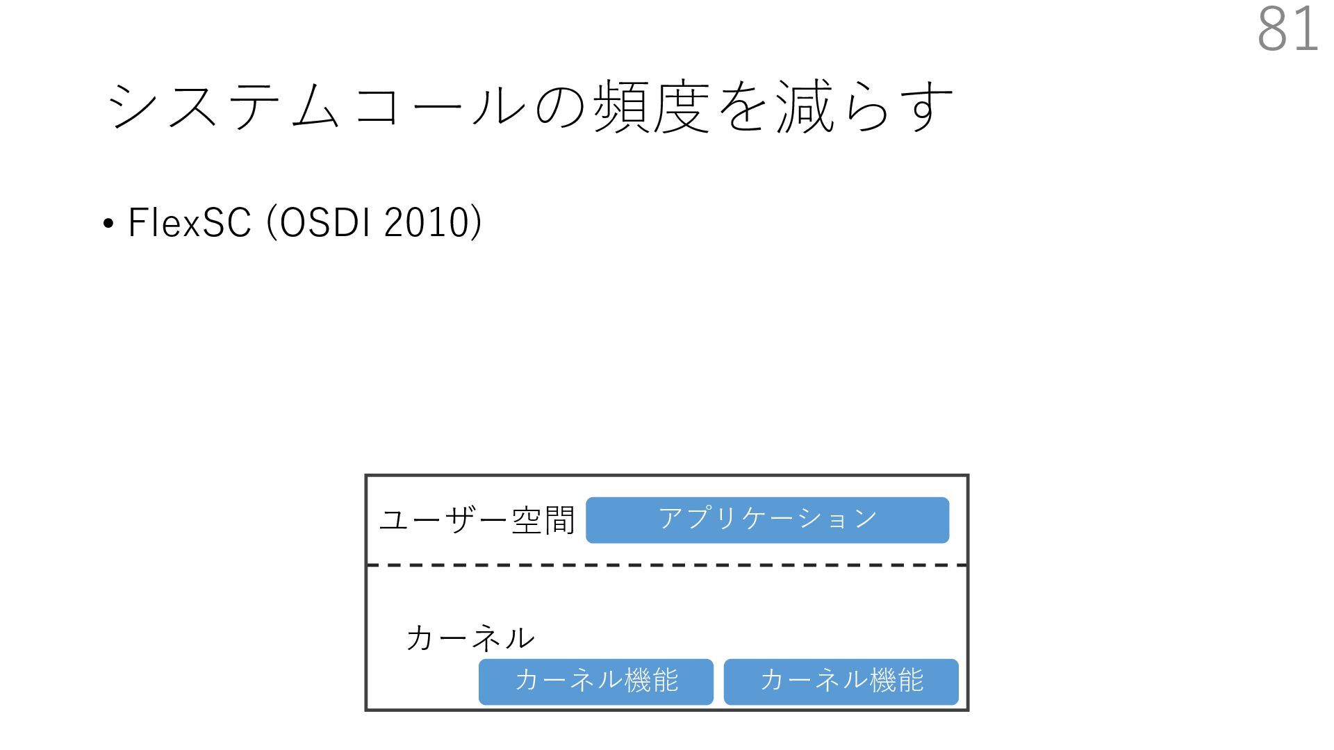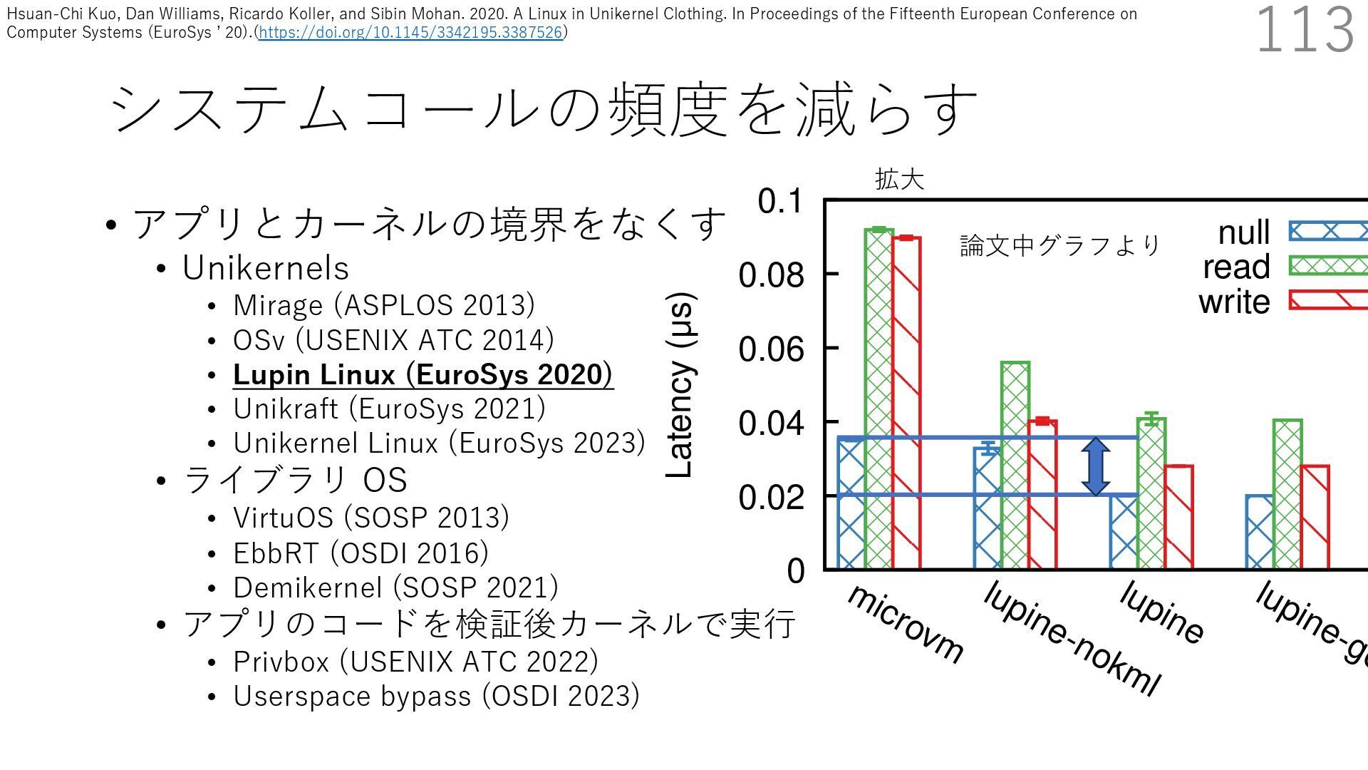 (SIGCOMM 2014) • mTCP (NSDI 2014) • Arrakis (OSDI 2014) • IX (OSDI 2014) • StackMap (USENIX ATC 2016) • Atlas (SIGCOMM 2017) • ZygOS (SOSP 2017) • Shenango (NSDI 2019) • Shinjuku (NSDI 2019) • TAS (EuroSys 2019) • Caladan (OSDI 2020) • Demikernel (SOSP 2021) 427 into a single library for both devices (e.g., RDMAxSPDK). We implemented the bulk of our library OS code in Rust. We initially prototyped several libOSes in C++; however, we found that Rust performs competitively with C++ and achieves ns-scale latencies while offering additional benefits. First, Rust enforces memory safety through language fea- tures and its compiler. Though our libOSes use unsafe code to bind to C/C++ kernel-bypass libraries and applications, User-space Software Kernel-space Software I/O Hardware I/O Device ??? libFuture ??? DPDK User I/O Buf. Mgmt libRDMA RDMA User I/O Buf. Mgmt Net. Trans. OS Kernel Control Path Demikernel Datapath Architecture App libPOSIX libDPDK SPDK User I/O Buf. Mgmt libSPDK Future Demikernel PDPIX Datapath API Figure 3. Demikernel kernel-bypass architecture. Demikernel ac- commodates heterogenous kernel-bypass devices, including poten- tial future hardware, with a flexible library OS-based datapath ar- chitecture.We include a libOS that goes through the OS kernel for 提案:異なるタイプのデバイスへ 共通のインターフェースからアクセス可能にする Irene Zhang, Amanda Raybuck, Pratyush Patel, Kirk Olynyk, Jacob Nelson, Omar S. Navarro Leija, Ashlie Martinez, Jing Liu, Anna Kornfeld Simpson, Sujay Jayakar, Pedro Henrique Penna, Max Demoulin, Piali Choudhury, and Anirudh Badam. 2021. The Demikernel Datapath OS Architecture for Microsecond-Scale Datacenter Systems. In Proceedings of the ACM Sigops 28th Symposium on Operating Systems Principles (SOSP ʼ21), 195-211.(https://doi.org/10.1145/3477132.3483569)