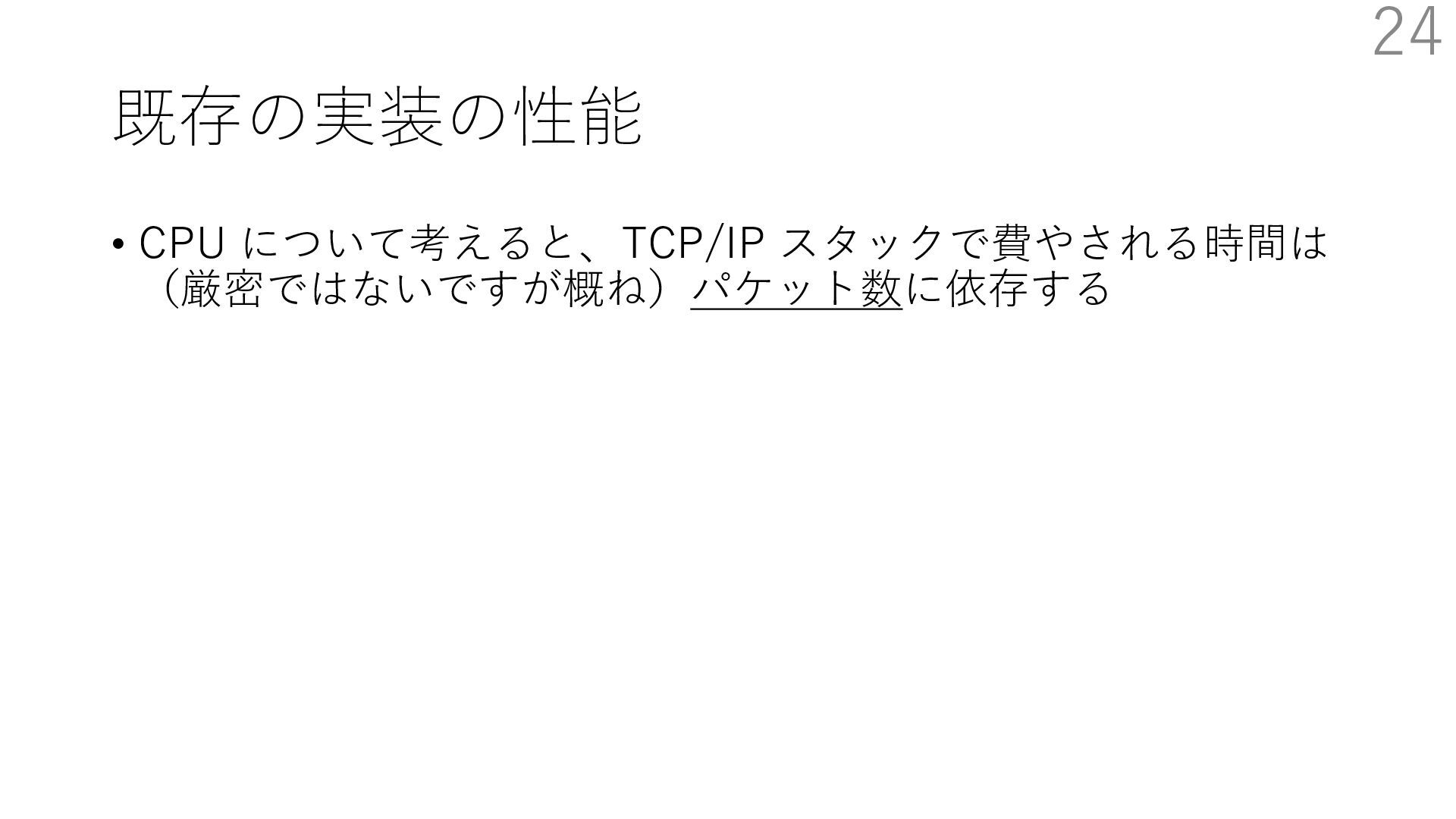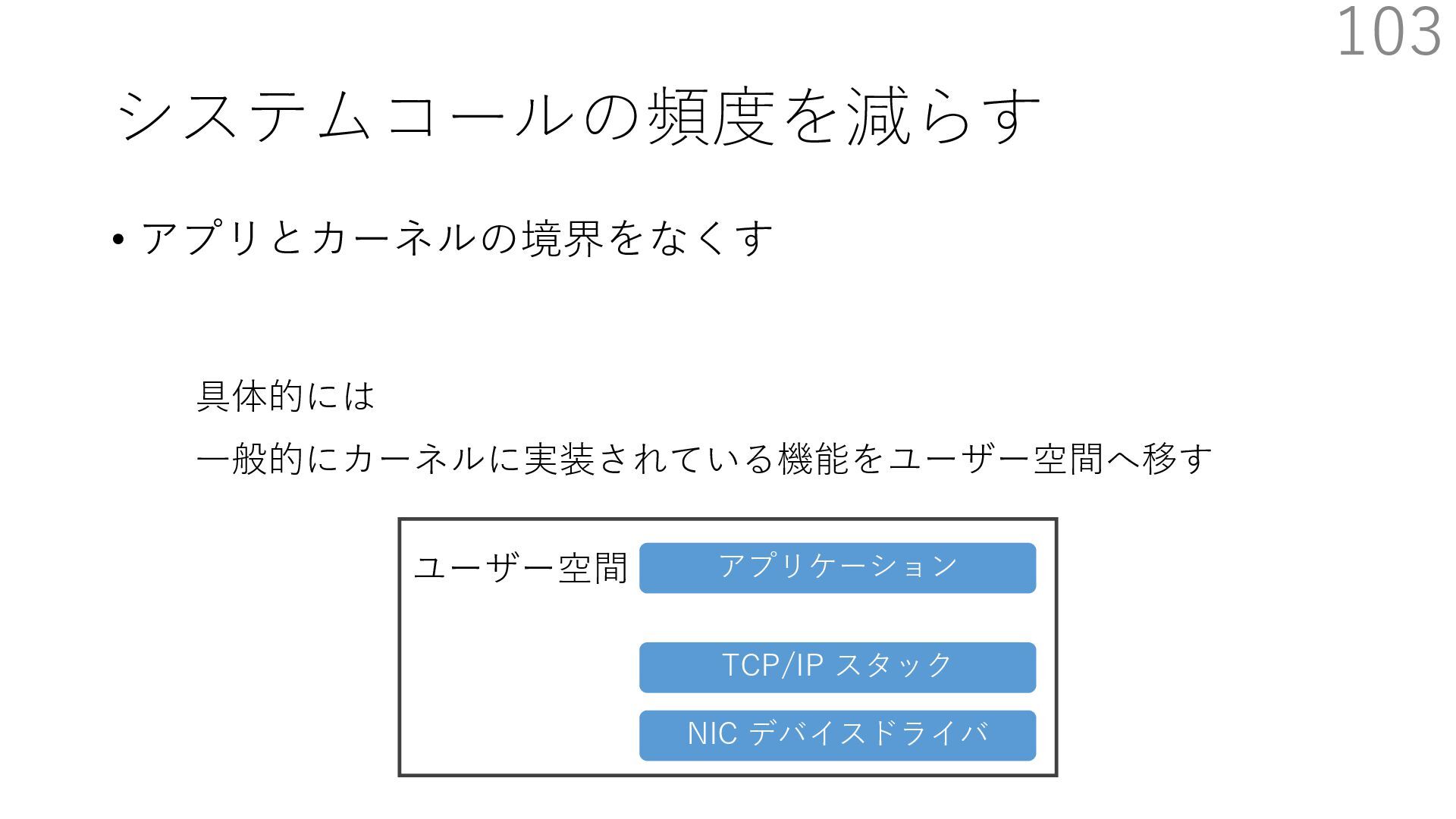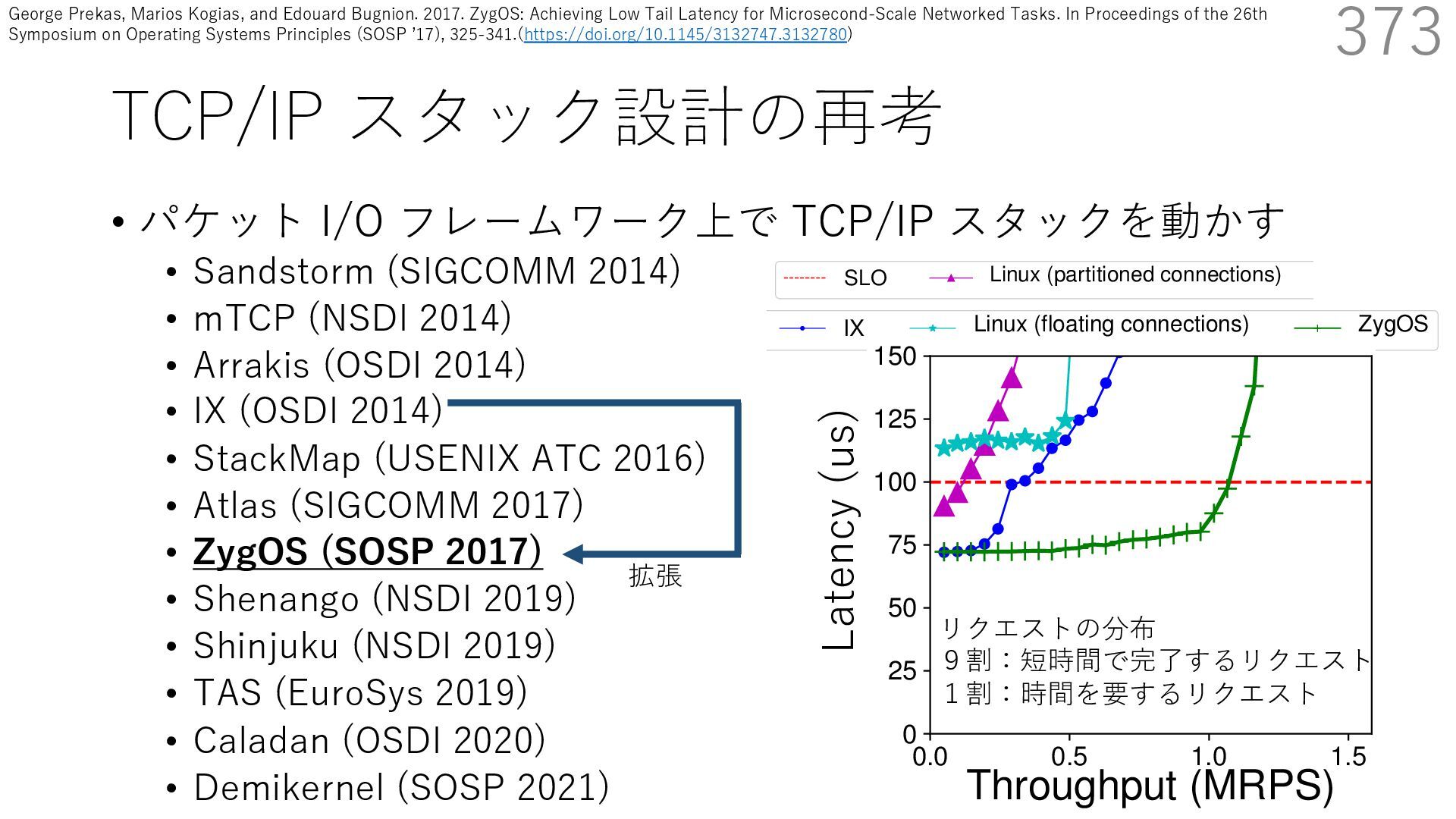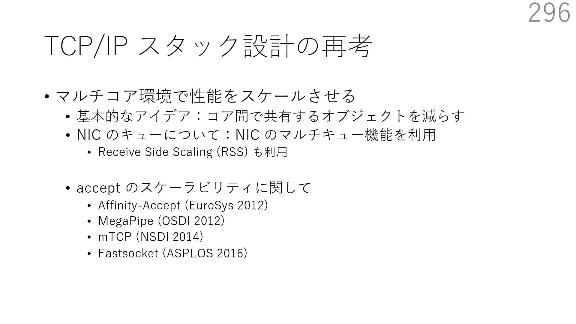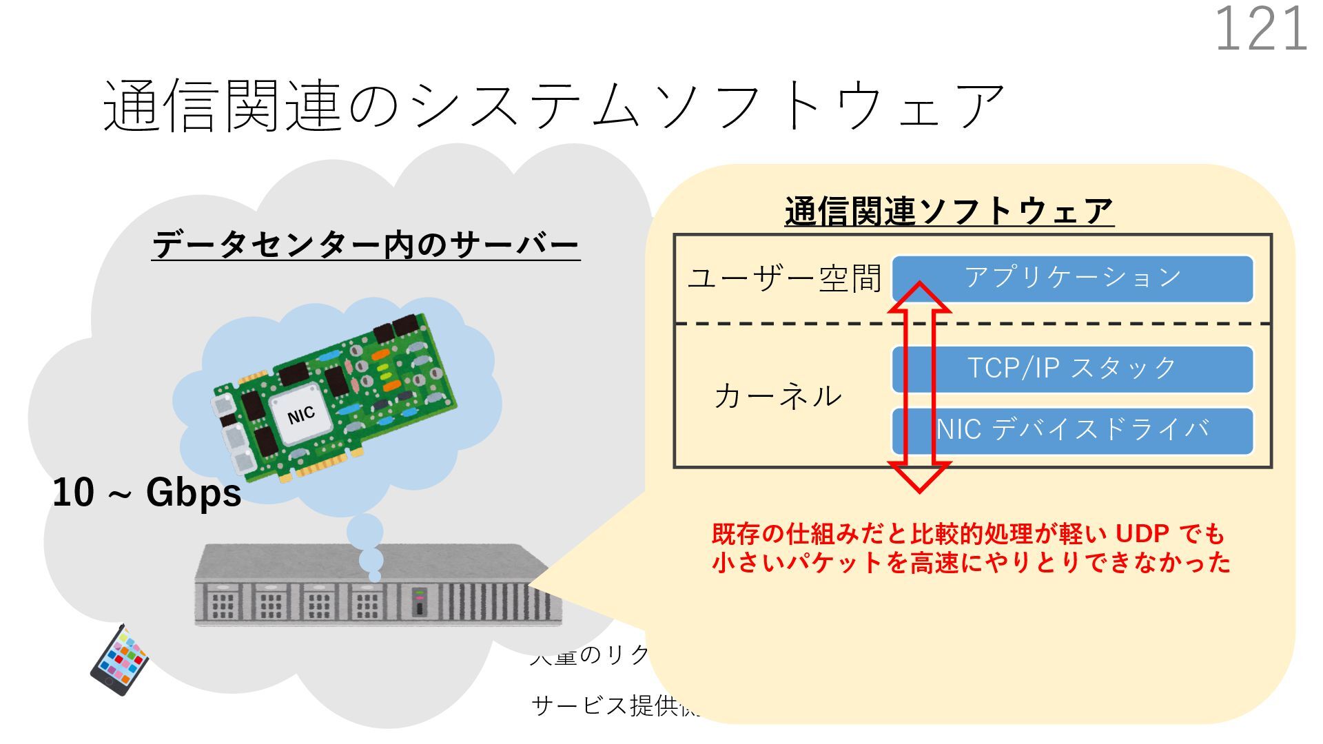 (SIGCOMM 2014) • mTCP (NSDI 2014) • Arrakis (OSDI 2014) • IX (OSDI 2014) • StackMap (USENIX ATC 2016) • Atlas (SIGCOMM 2017) • ZygOS (SOSP 2017) • Shenango (NSDI 2019) • Shinjuku (NSDI 2019) • TAS (EuroSys 2019) • Caladan (OSDI 2020) • Demikernel (SOSP 2021) 427 into a single library for both devices (e.g., RDMAxSPDK). We implemented the bulk of our library OS code in Rust. We initially prototyped several libOSes in C++; however, we found that Rust performs competitively with C++ and achieves ns-scale latencies while offering additional benefits. First, Rust enforces memory safety through language fea- tures and its compiler. Though our libOSes use unsafe code to bind to C/C++ kernel-bypass libraries and applications, User-space Software Kernel-space Software I/O Hardware I/O Device ??? libFuture ??? DPDK User I/O Buf. Mgmt libRDMA RDMA User I/O Buf. Mgmt Net. Trans. OS Kernel Control Path Demikernel Datapath Architecture App libPOSIX libDPDK SPDK User I/O Buf. Mgmt libSPDK Future Demikernel PDPIX Datapath API Figure 3. Demikernel kernel-bypass architecture. Demikernel ac- commodates heterogenous kernel-bypass devices, including poten- tial future hardware, with a flexible library OS-based datapath ar- chitecture.We include a libOS that goes through the OS kernel for 提案:異なるタイプのデバイスへ 共通のインターフェースからアクセス可能にする Irene Zhang, Amanda Raybuck, Pratyush Patel, Kirk Olynyk, Jacob Nelson, Omar S. Navarro Leija, Ashlie Martinez, Jing Liu, Anna Kornfeld Simpson, Sujay Jayakar, Pedro Henrique Penna, Max Demoulin, Piali Choudhury, and Anirudh Badam. 2021. The Demikernel Datapath OS Architecture for Microsecond-Scale Datacenter Systems. In Proceedings of the ACM Sigops 28th Symposium on Operating Systems Principles (SOSP ʼ21), 195-211.(https://doi.org/10.1145/3477132.3483569)