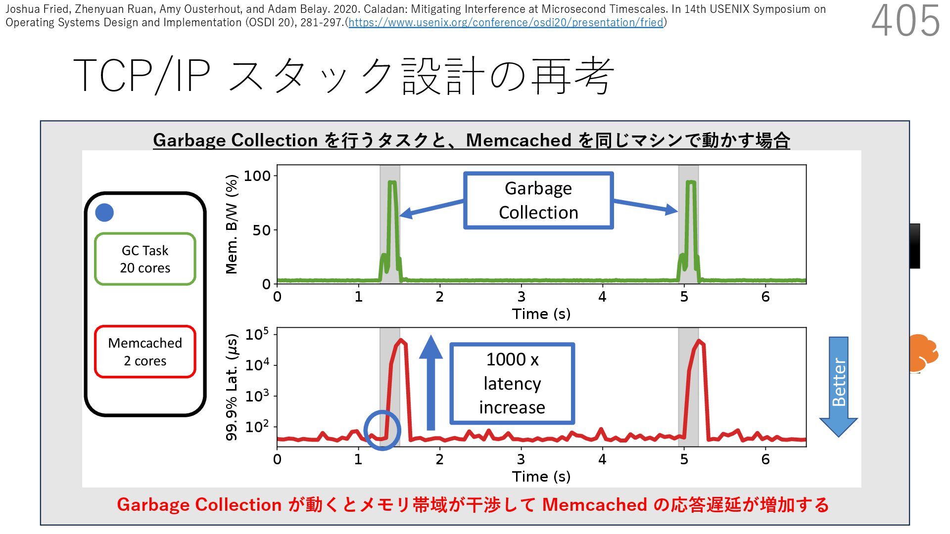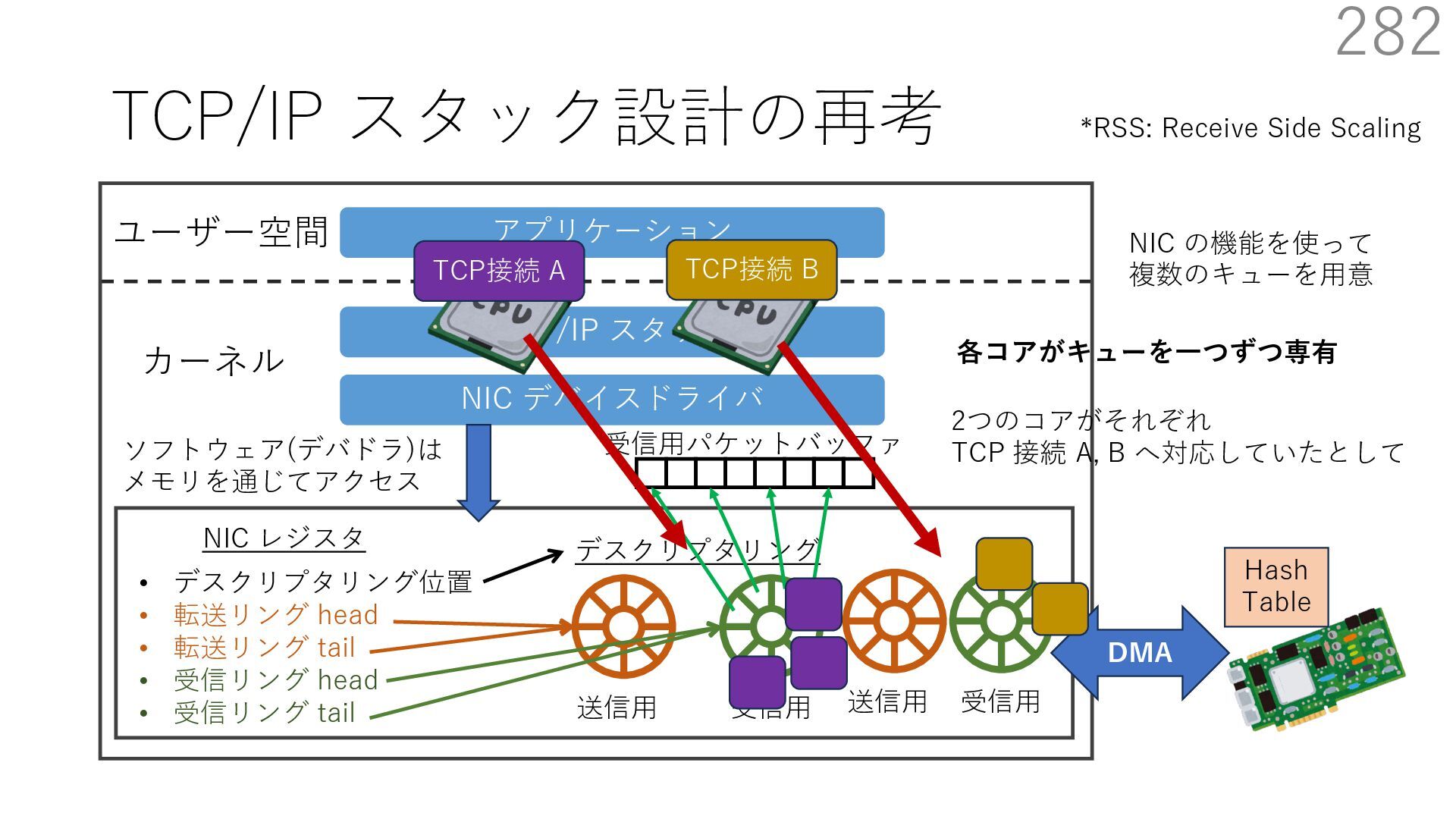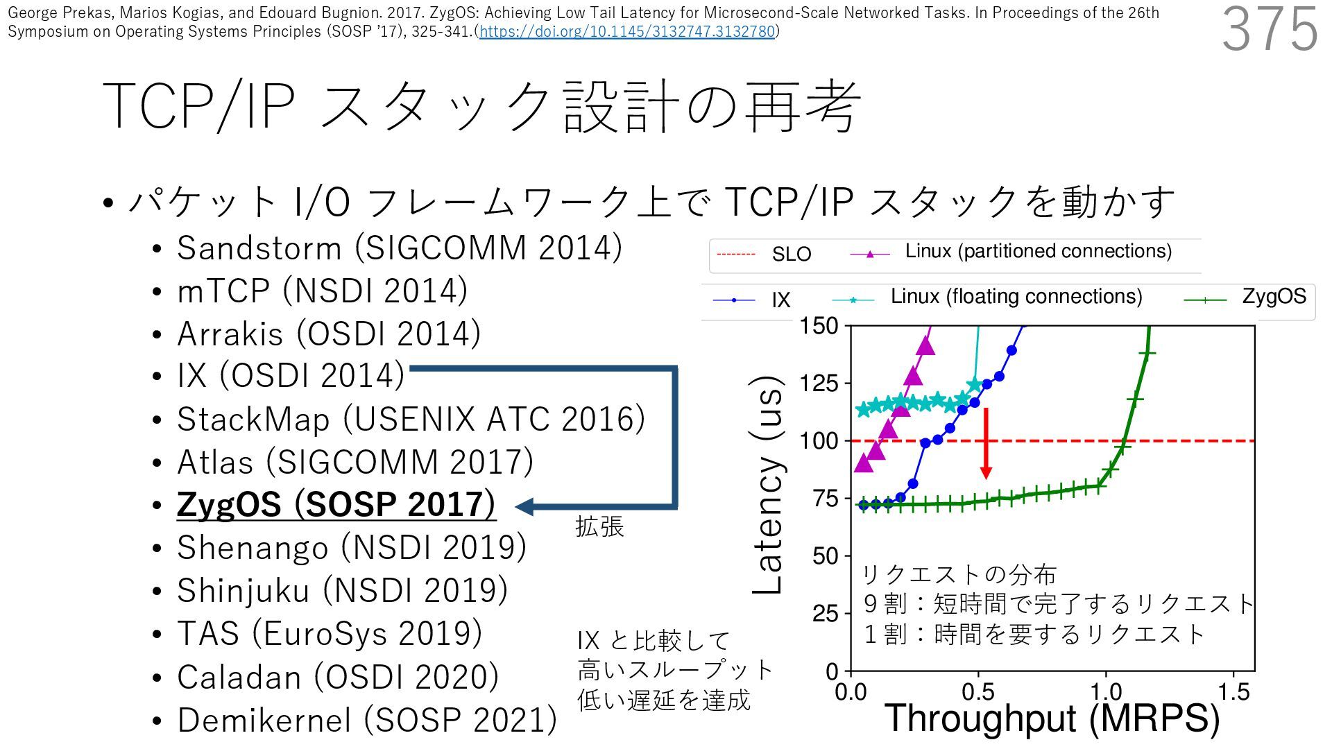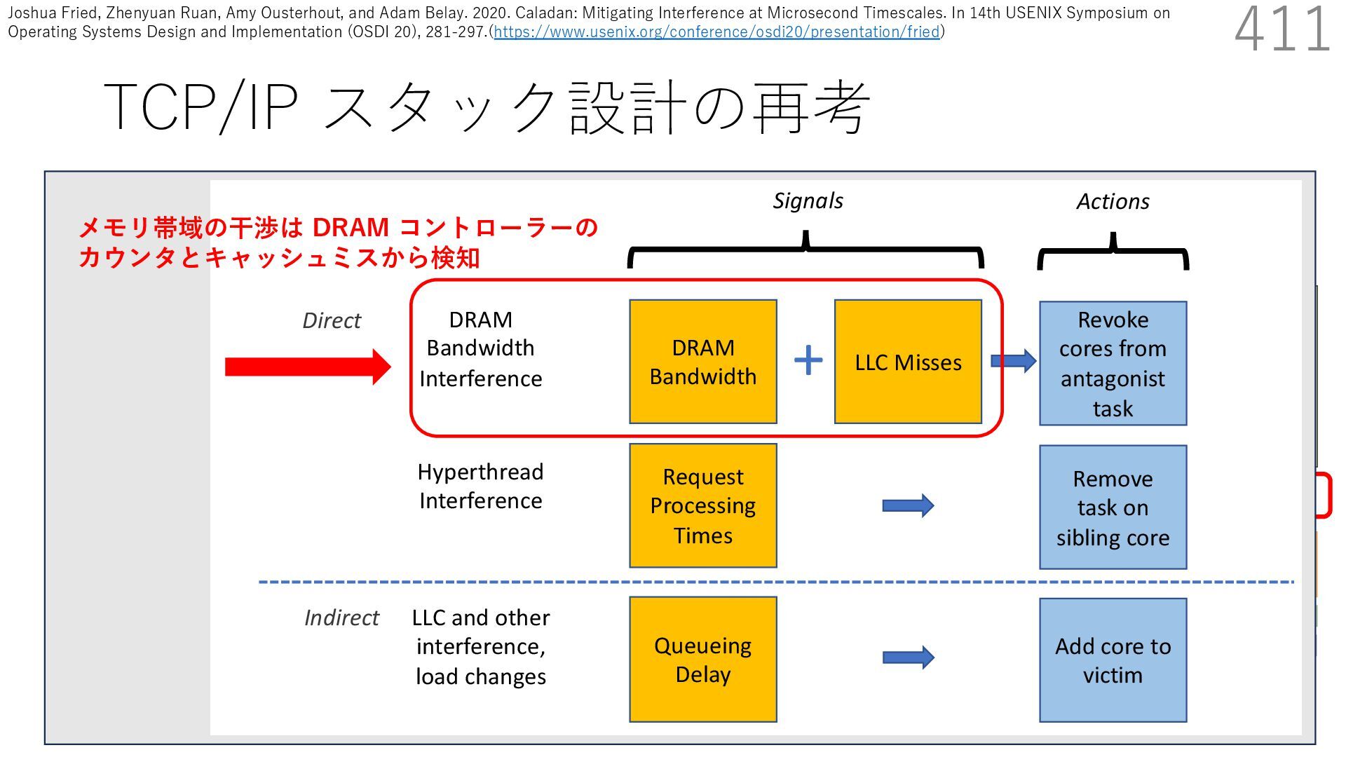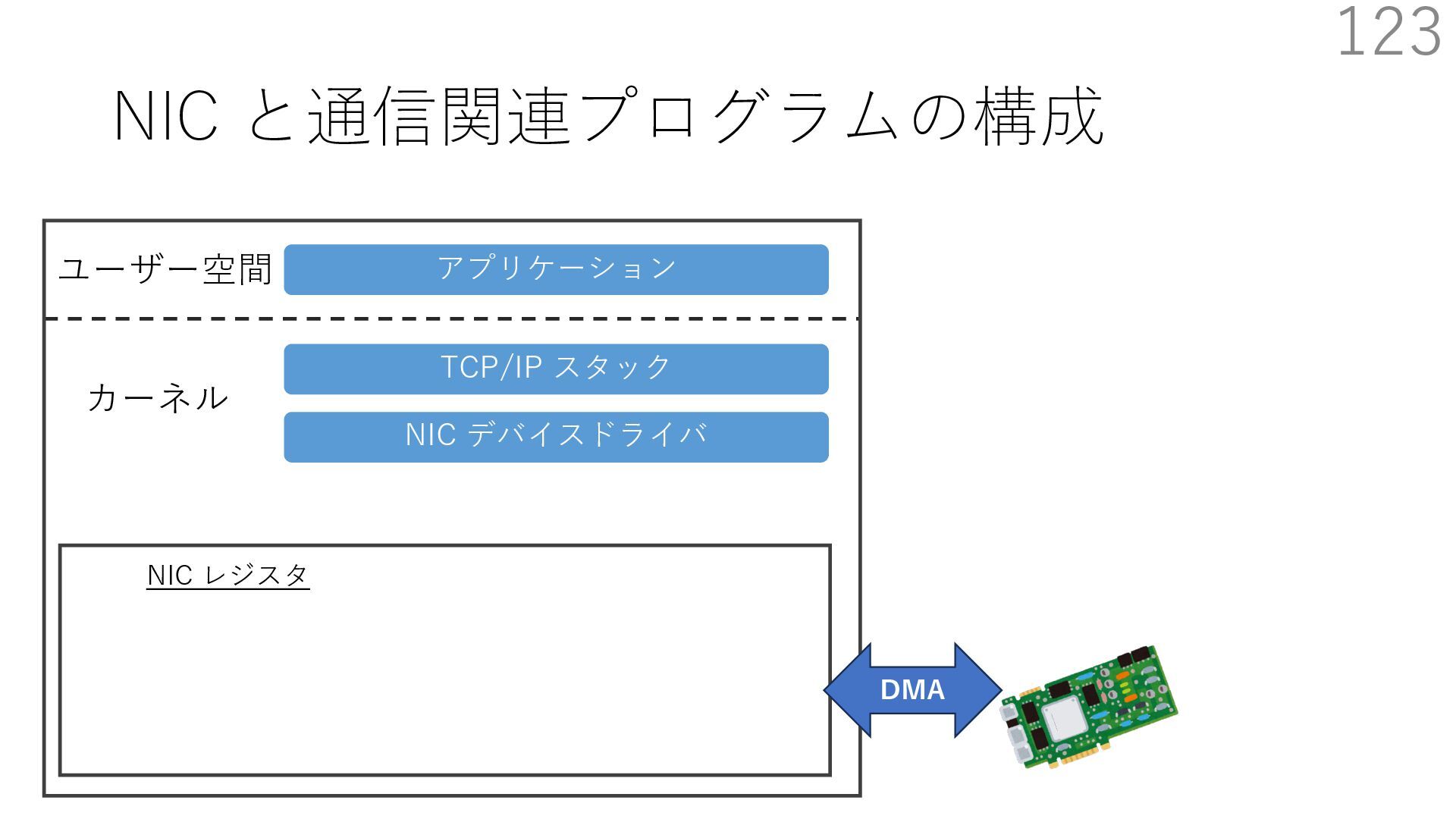 (SIGCOMM 2014) • mTCP (NSDI 2014) • Arrakis (OSDI 2014) • IX (OSDI 2014) • StackMap (USENIX ATC 2016) • Atlas (SIGCOMM 2017) • ZygOS (SOSP 2017) • Shenango (NSDI 2019) • Shinjuku (NSDI 2019) • TAS (EuroSys 2019) • Caladan (OSDI 2020) • Demikernel (SOSP 2021) 427 into a single library for both devices (e.g., RDMAxSPDK). We implemented the bulk of our library OS code in Rust. We initially prototyped several libOSes in C++; however, we found that Rust performs competitively with C++ and achieves ns-scale latencies while offering additional benefits. First, Rust enforces memory safety through language fea- tures and its compiler. Though our libOSes use unsafe code to bind to C/C++ kernel-bypass libraries and applications, User-space Software Kernel-space Software I/O Hardware I/O Device ??? libFuture ??? DPDK User I/O Buf. Mgmt libRDMA RDMA User I/O Buf. Mgmt Net. Trans. OS Kernel Control Path Demikernel Datapath Architecture App libPOSIX libDPDK SPDK User I/O Buf. Mgmt libSPDK Future Demikernel PDPIX Datapath API Figure 3. Demikernel kernel-bypass architecture. Demikernel ac- commodates heterogenous kernel-bypass devices, including poten- tial future hardware, with a flexible library OS-based datapath ar- chitecture.We include a libOS that goes through the OS kernel for 提案:異なるタイプのデバイスへ 共通のインターフェースからアクセス可能にする Irene Zhang, Amanda Raybuck, Pratyush Patel, Kirk Olynyk, Jacob Nelson, Omar S. Navarro Leija, Ashlie Martinez, Jing Liu, Anna Kornfeld Simpson, Sujay Jayakar, Pedro Henrique Penna, Max Demoulin, Piali Choudhury, and Anirudh Badam. 2021. The Demikernel Datapath OS Architecture for Microsecond-Scale Datacenter Systems. In Proceedings of the ACM Sigops 28th Symposium on Operating Systems Principles (SOSP ʼ21), 195-211.(https://doi.org/10.1145/3477132.3483569)