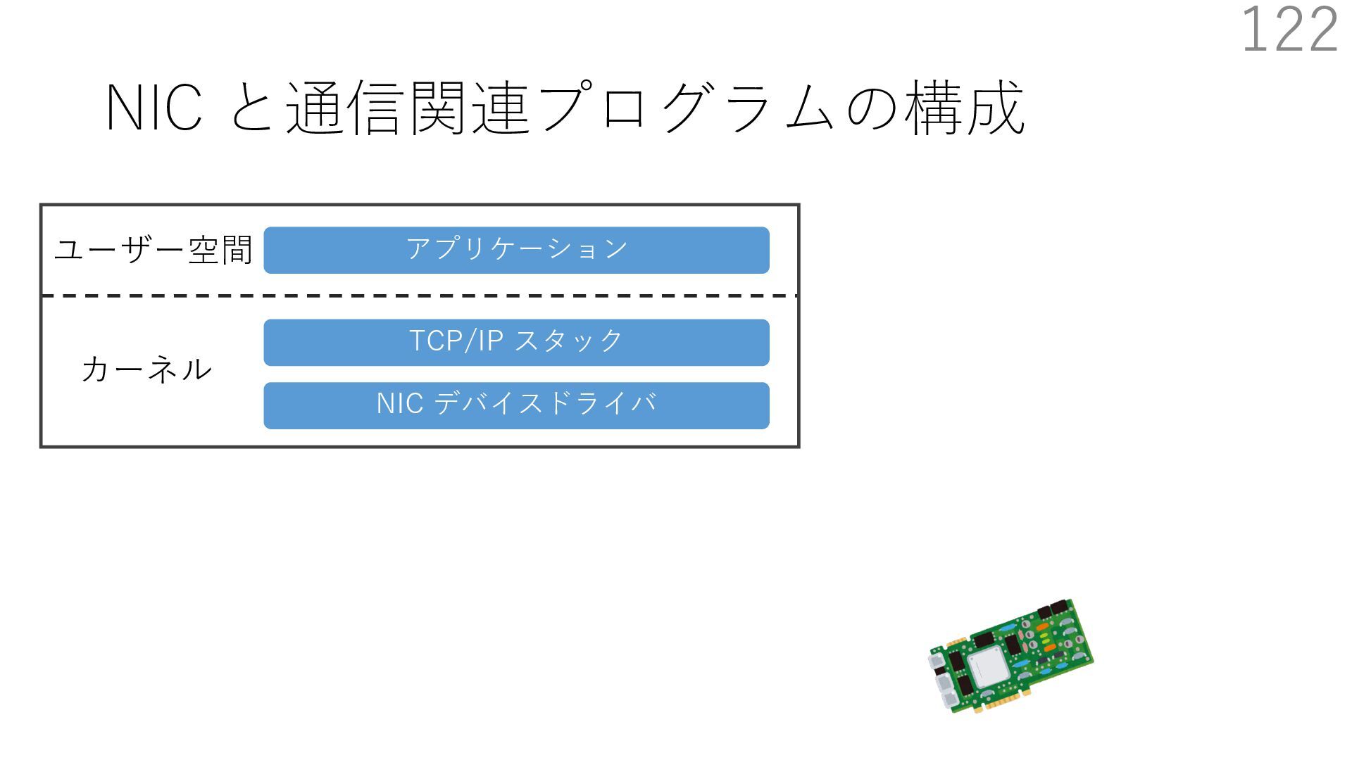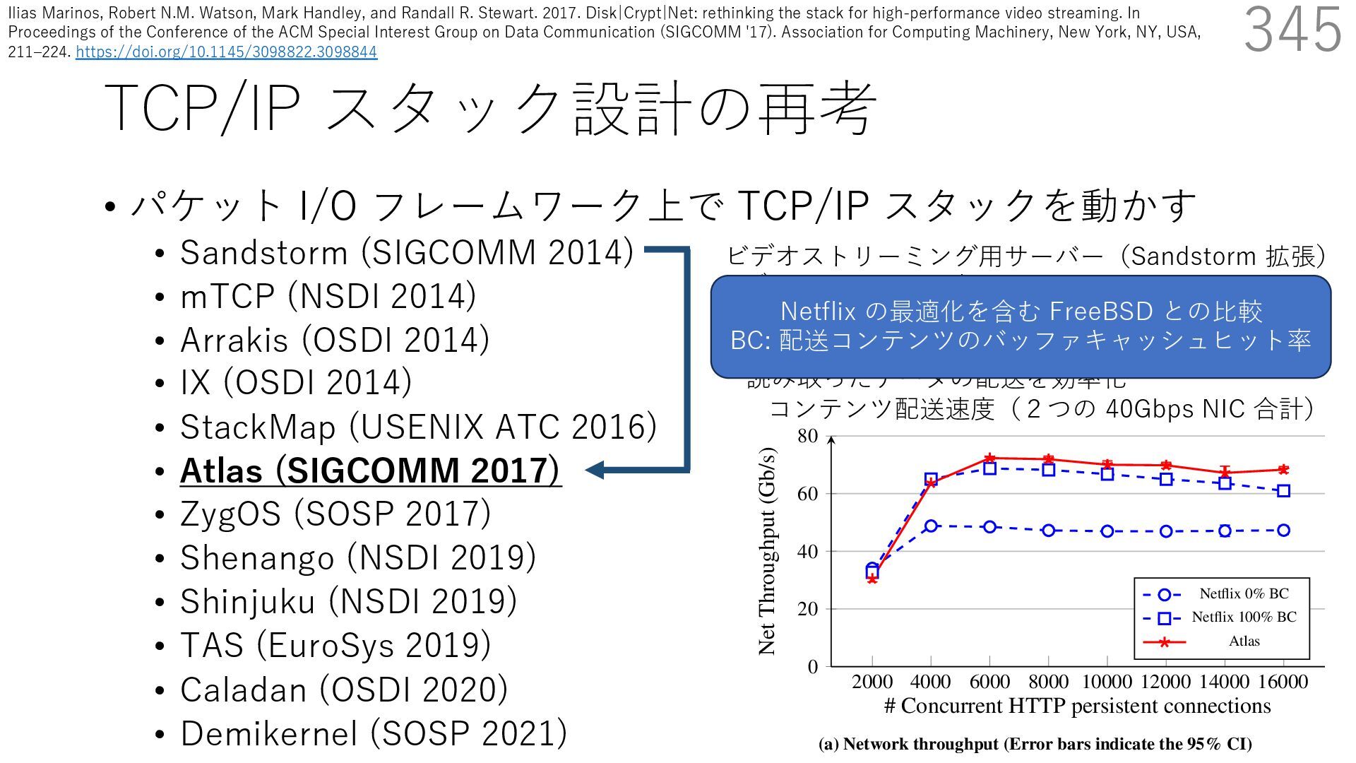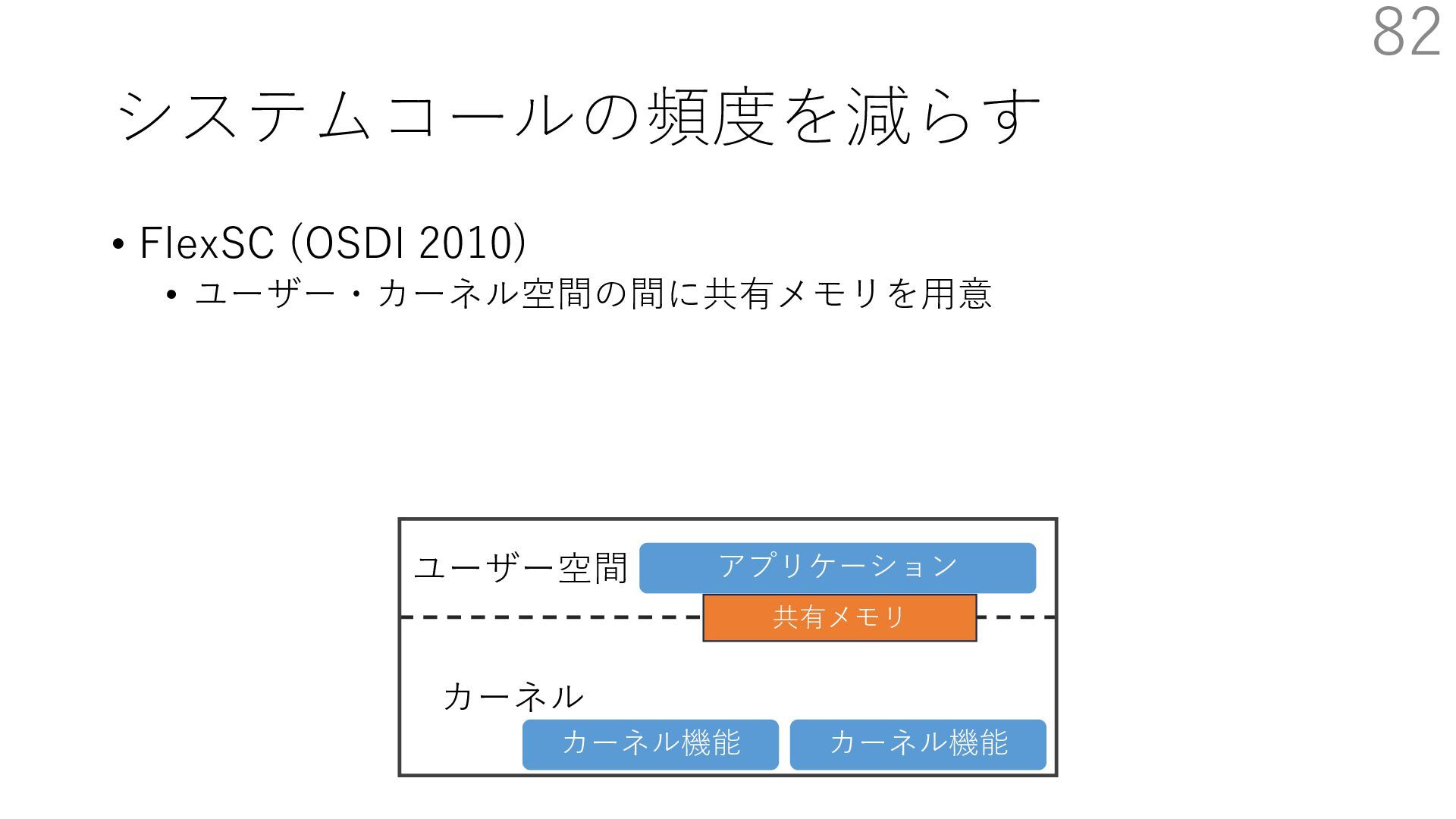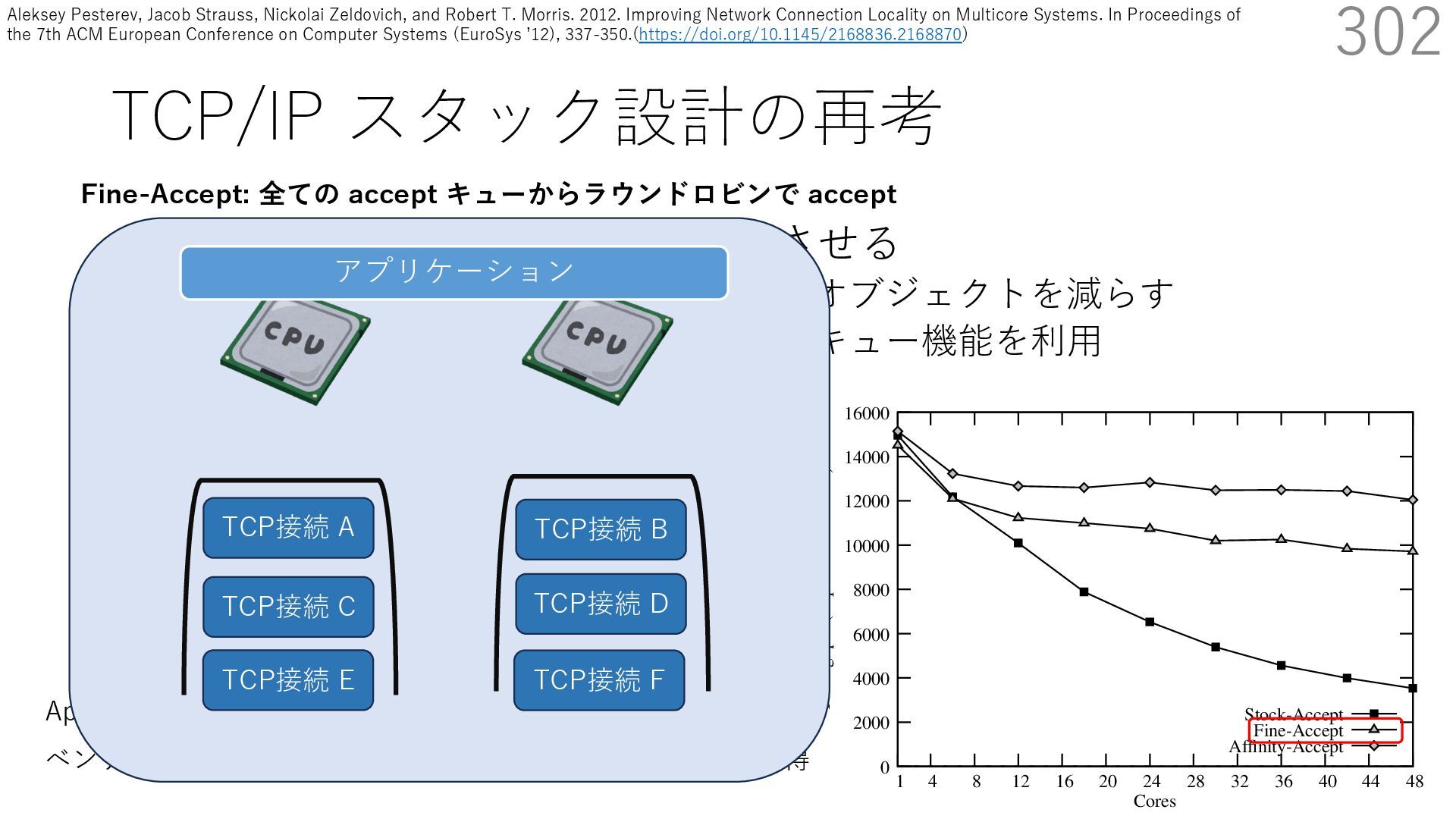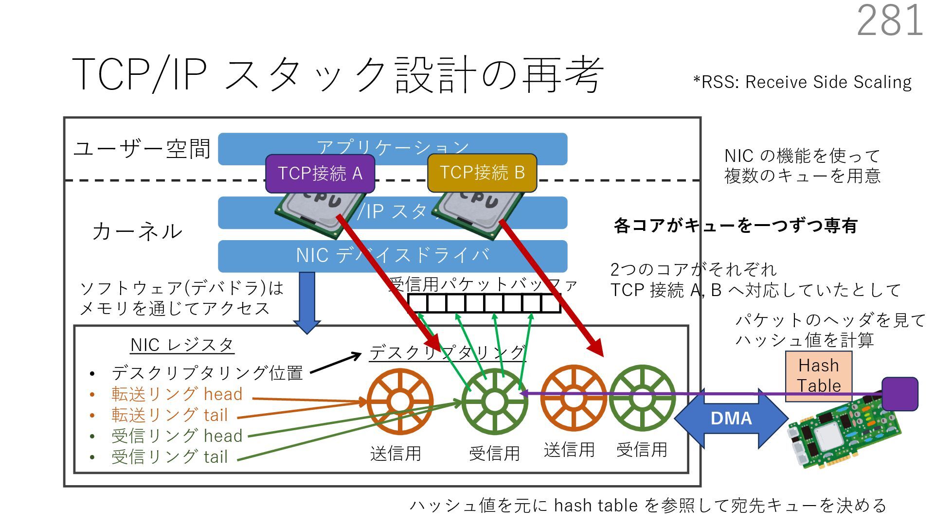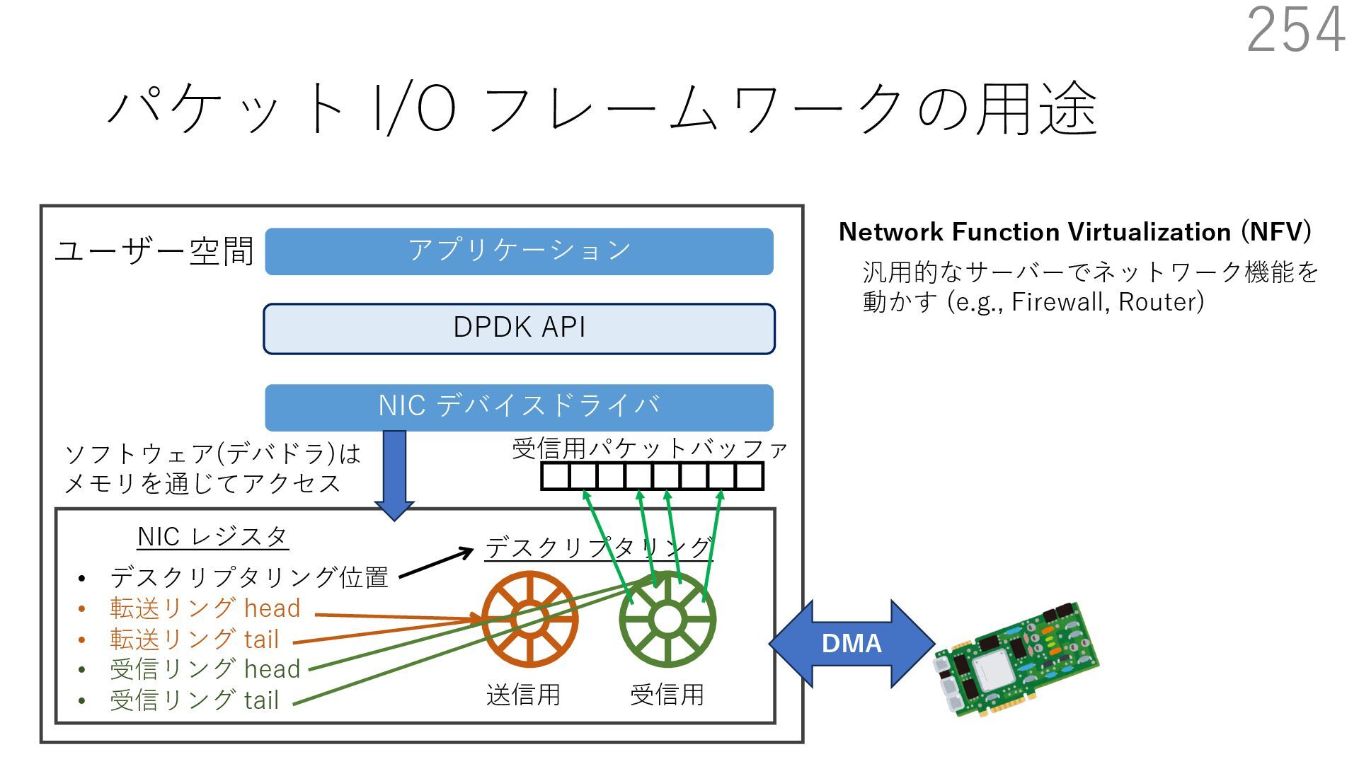 (SIGCOMM 2014) • mTCP (NSDI 2014) • Arrakis (OSDI 2014) • IX (OSDI 2014) • StackMap (USENIX ATC 2016) • Atlas (SIGCOMM 2017) • ZygOS (SOSP 2017) • Shenango (NSDI 2019) • Shinjuku (NSDI 2019) • TAS (EuroSys 2019) • Caladan (OSDI 2020) • Demikernel (SOSP 2021) 427 into a single library for both devices (e.g., RDMAxSPDK). We implemented the bulk of our library OS code in Rust. We initially prototyped several libOSes in C++; however, we found that Rust performs competitively with C++ and achieves ns-scale latencies while offering additional benefits. First, Rust enforces memory safety through language fea- tures and its compiler. Though our libOSes use unsafe code to bind to C/C++ kernel-bypass libraries and applications, User-space Software Kernel-space Software I/O Hardware I/O Device ??? libFuture ??? DPDK User I/O Buf. Mgmt libRDMA RDMA User I/O Buf. Mgmt Net. Trans. OS Kernel Control Path Demikernel Datapath Architecture App libPOSIX libDPDK SPDK User I/O Buf. Mgmt libSPDK Future Demikernel PDPIX Datapath API Figure 3. Demikernel kernel-bypass architecture. Demikernel ac- commodates heterogenous kernel-bypass devices, including poten- tial future hardware, with a flexible library OS-based datapath ar- chitecture.We include a libOS that goes through the OS kernel for 提案:異なるタイプのデバイスへ 共通のインターフェースからアクセス可能にする Irene Zhang, Amanda Raybuck, Pratyush Patel, Kirk Olynyk, Jacob Nelson, Omar S. Navarro Leija, Ashlie Martinez, Jing Liu, Anna Kornfeld Simpson, Sujay Jayakar, Pedro Henrique Penna, Max Demoulin, Piali Choudhury, and Anirudh Badam. 2021. The Demikernel Datapath OS Architecture for Microsecond-Scale Datacenter Systems. In Proceedings of the ACM Sigops 28th Symposium on Operating Systems Principles (SOSP ʼ21), 195-211.(https://doi.org/10.1145/3477132.3483569)