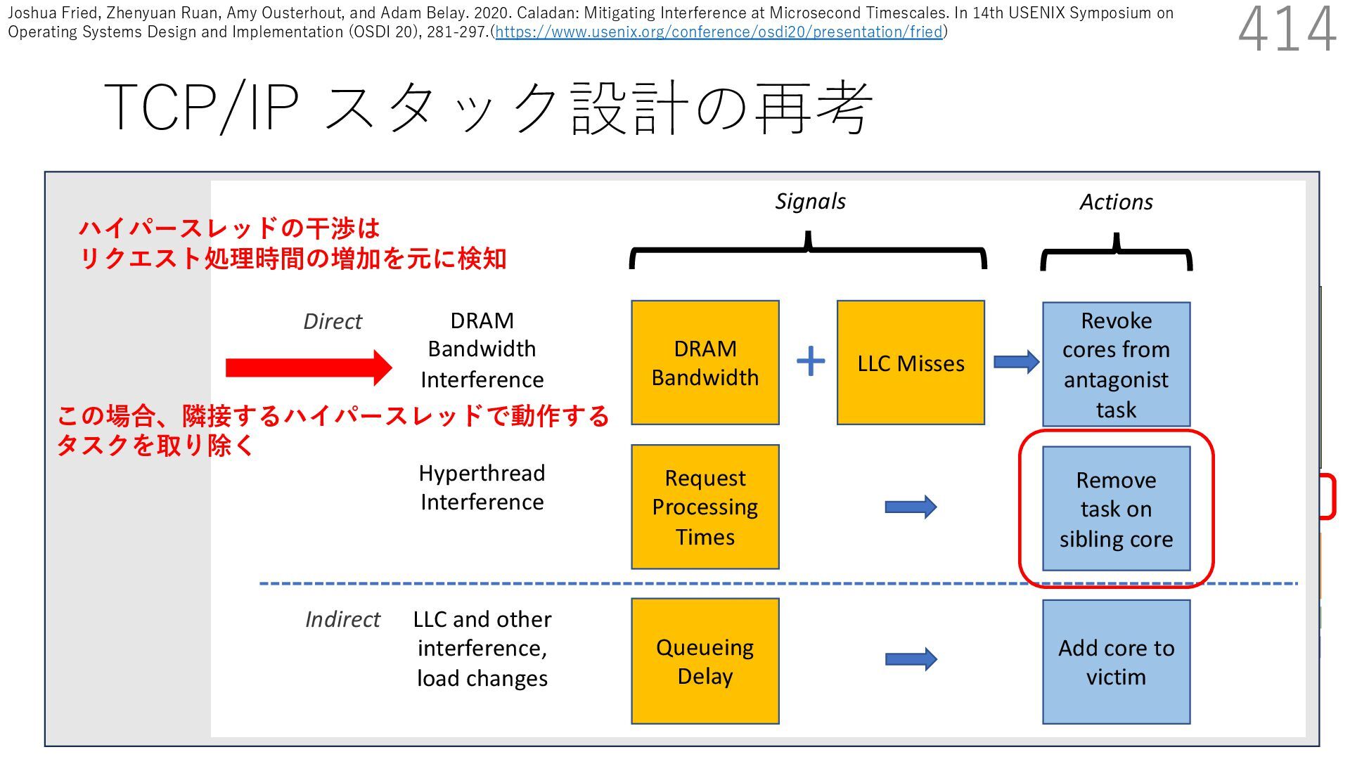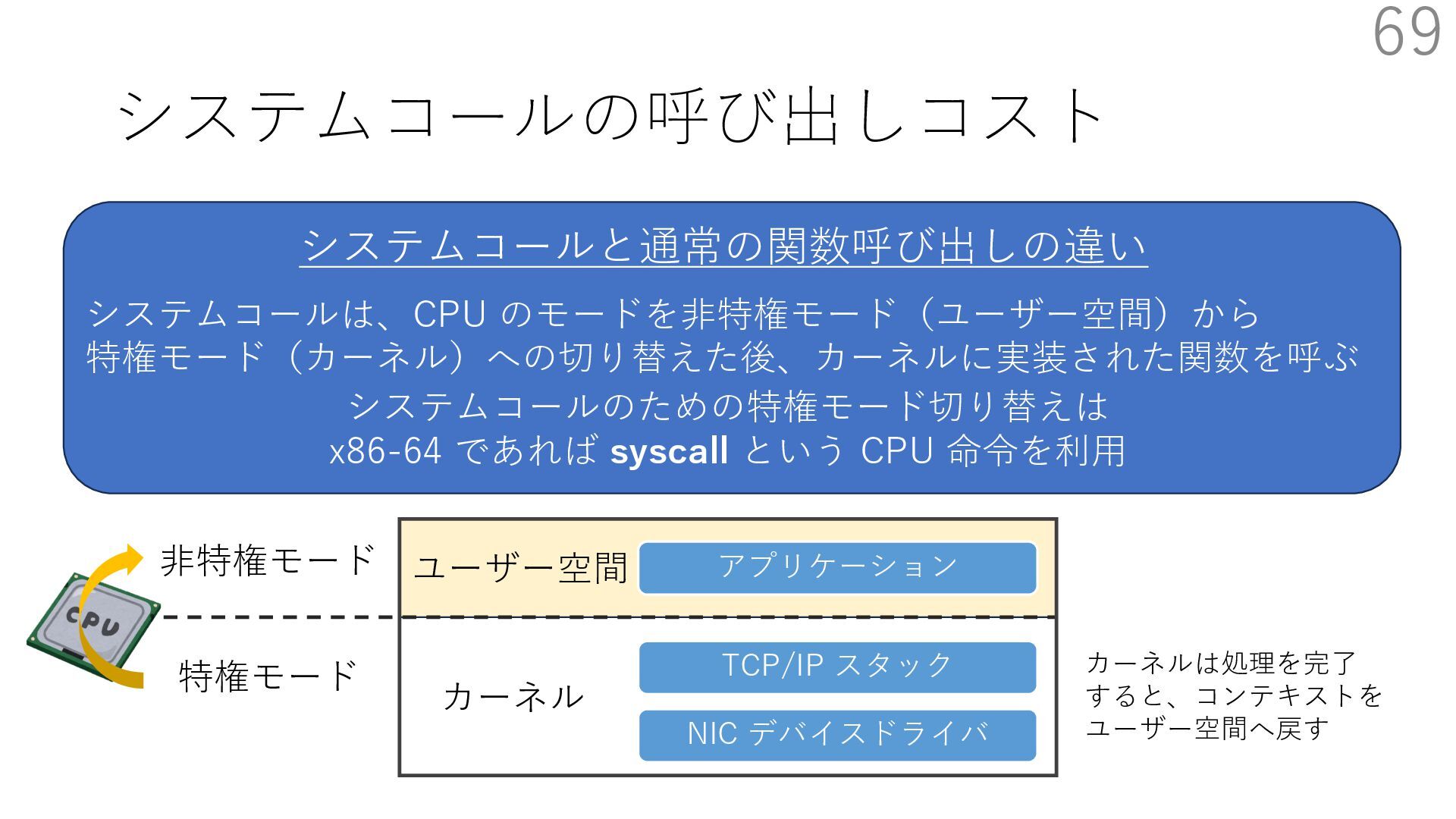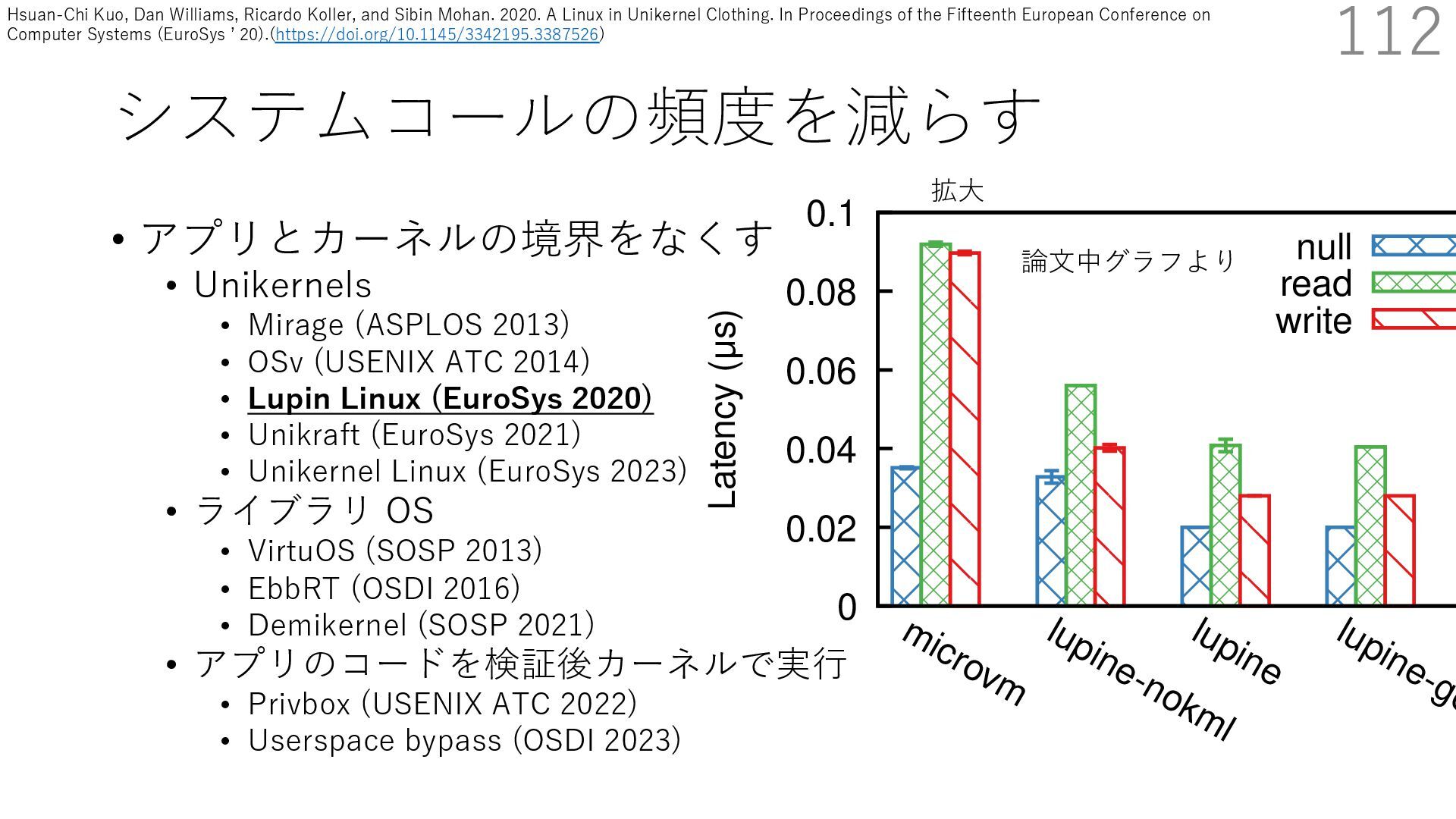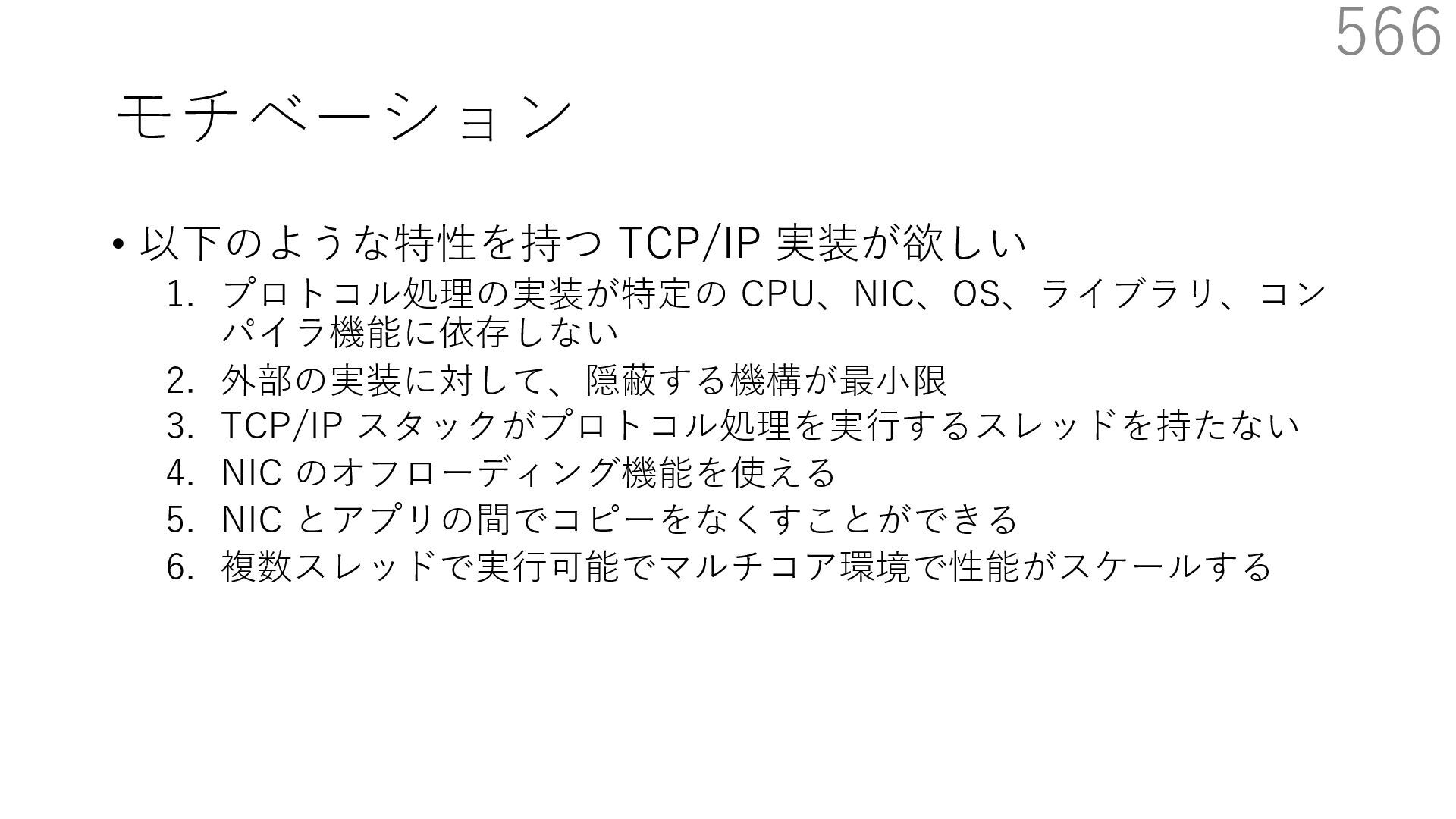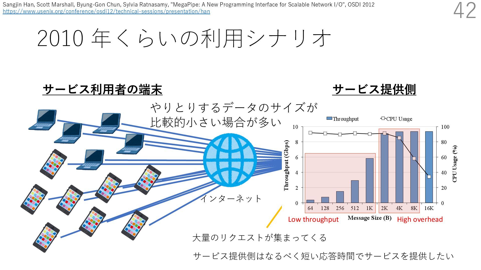 (SIGCOMM 2014) • mTCP (NSDI 2014) • Arrakis (OSDI 2014) • IX (OSDI 2014) • StackMap (USENIX ATC 2016) • Atlas (SIGCOMM 2017) • ZygOS (SOSP 2017) • Shenango (NSDI 2019) • Shinjuku (NSDI 2019) • TAS (EuroSys 2019) • Caladan (OSDI 2020) • Demikernel (SOSP 2021) 427 into a single library for both devices (e.g., RDMAxSPDK). We implemented the bulk of our library OS code in Rust. We initially prototyped several libOSes in C++; however, we found that Rust performs competitively with C++ and achieves ns-scale latencies while offering additional benefits. First, Rust enforces memory safety through language fea- tures and its compiler. Though our libOSes use unsafe code to bind to C/C++ kernel-bypass libraries and applications, User-space Software Kernel-space Software I/O Hardware I/O Device ??? libFuture ??? DPDK User I/O Buf. Mgmt libRDMA RDMA User I/O Buf. Mgmt Net. Trans. OS Kernel Control Path Demikernel Datapath Architecture App libPOSIX libDPDK SPDK User I/O Buf. Mgmt libSPDK Future Demikernel PDPIX Datapath API Figure 3. Demikernel kernel-bypass architecture. Demikernel ac- commodates heterogenous kernel-bypass devices, including poten- tial future hardware, with a flexible library OS-based datapath ar- chitecture.We include a libOS that goes through the OS kernel for 提案:異なるタイプのデバイスへ 共通のインターフェースからアクセス可能にする Irene Zhang, Amanda Raybuck, Pratyush Patel, Kirk Olynyk, Jacob Nelson, Omar S. Navarro Leija, Ashlie Martinez, Jing Liu, Anna Kornfeld Simpson, Sujay Jayakar, Pedro Henrique Penna, Max Demoulin, Piali Choudhury, and Anirudh Badam. 2021. The Demikernel Datapath OS Architecture for Microsecond-Scale Datacenter Systems. In Proceedings of the ACM Sigops 28th Symposium on Operating Systems Principles (SOSP ʼ21), 195-211.(https://doi.org/10.1145/3477132.3483569)