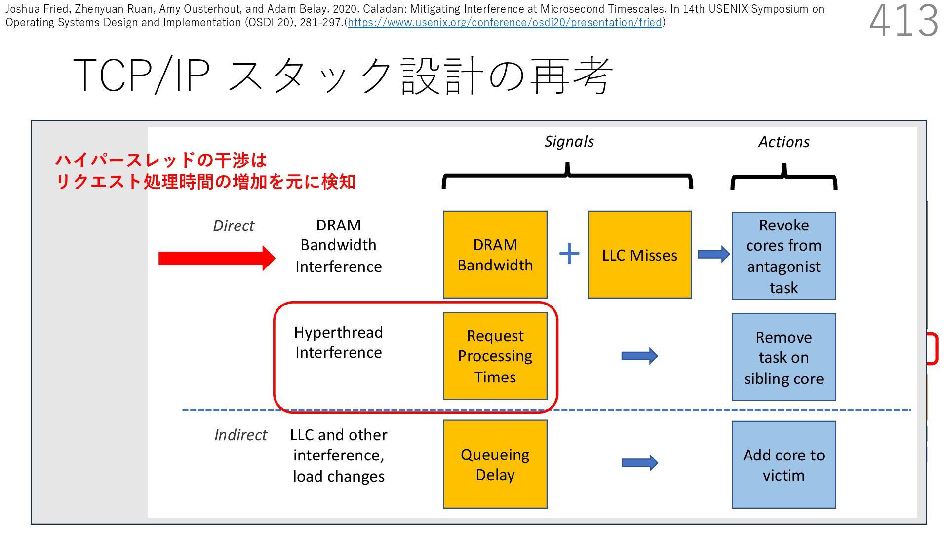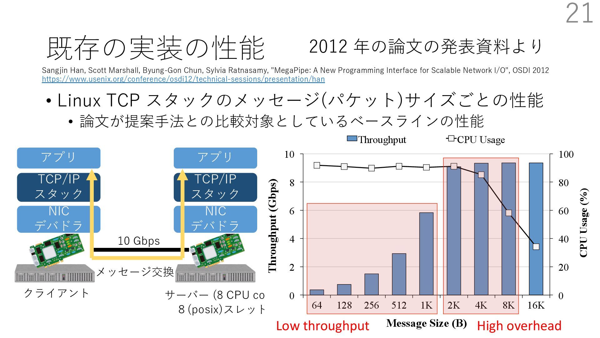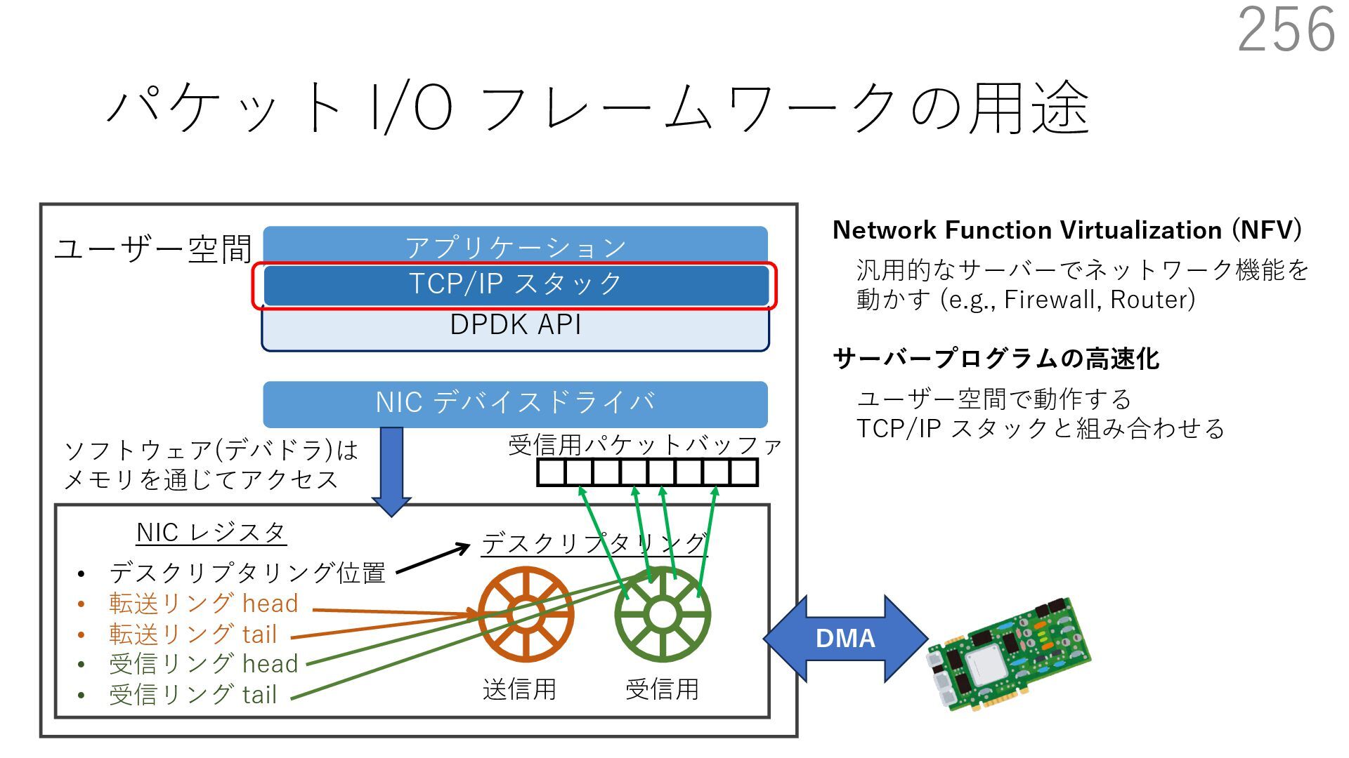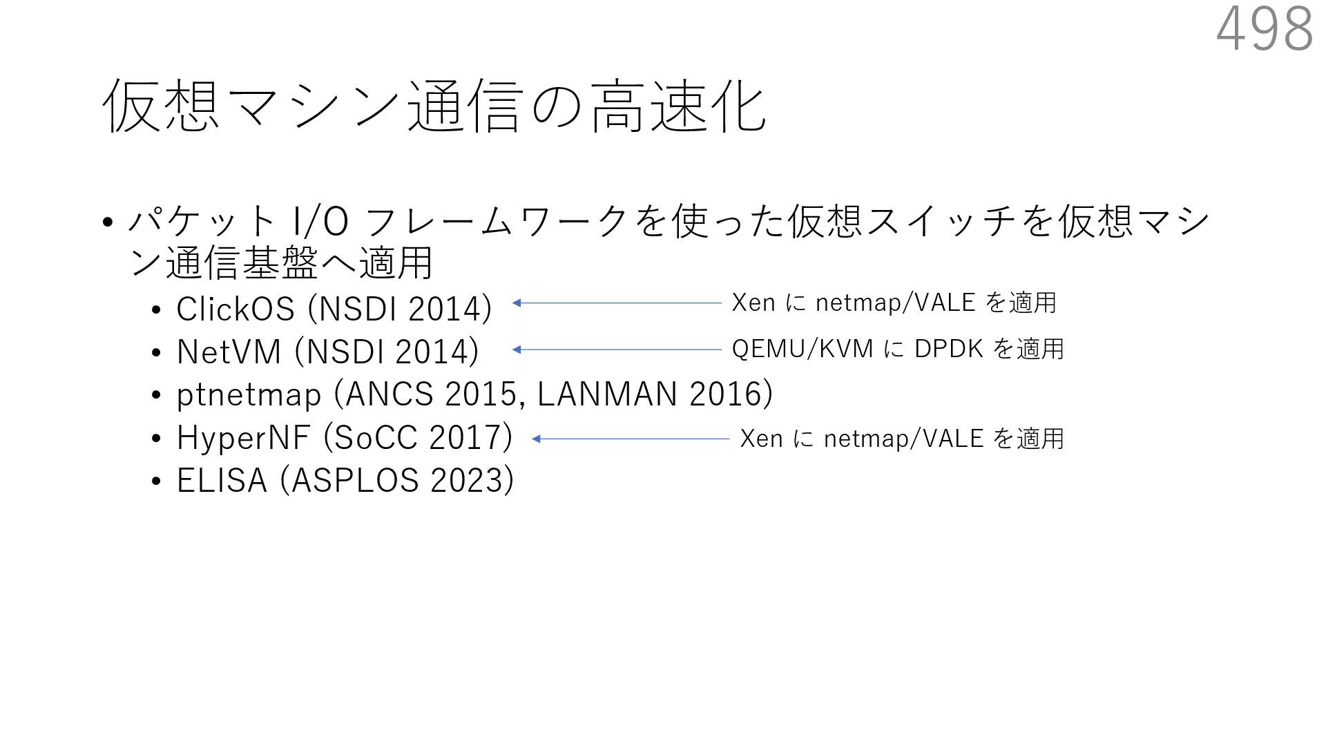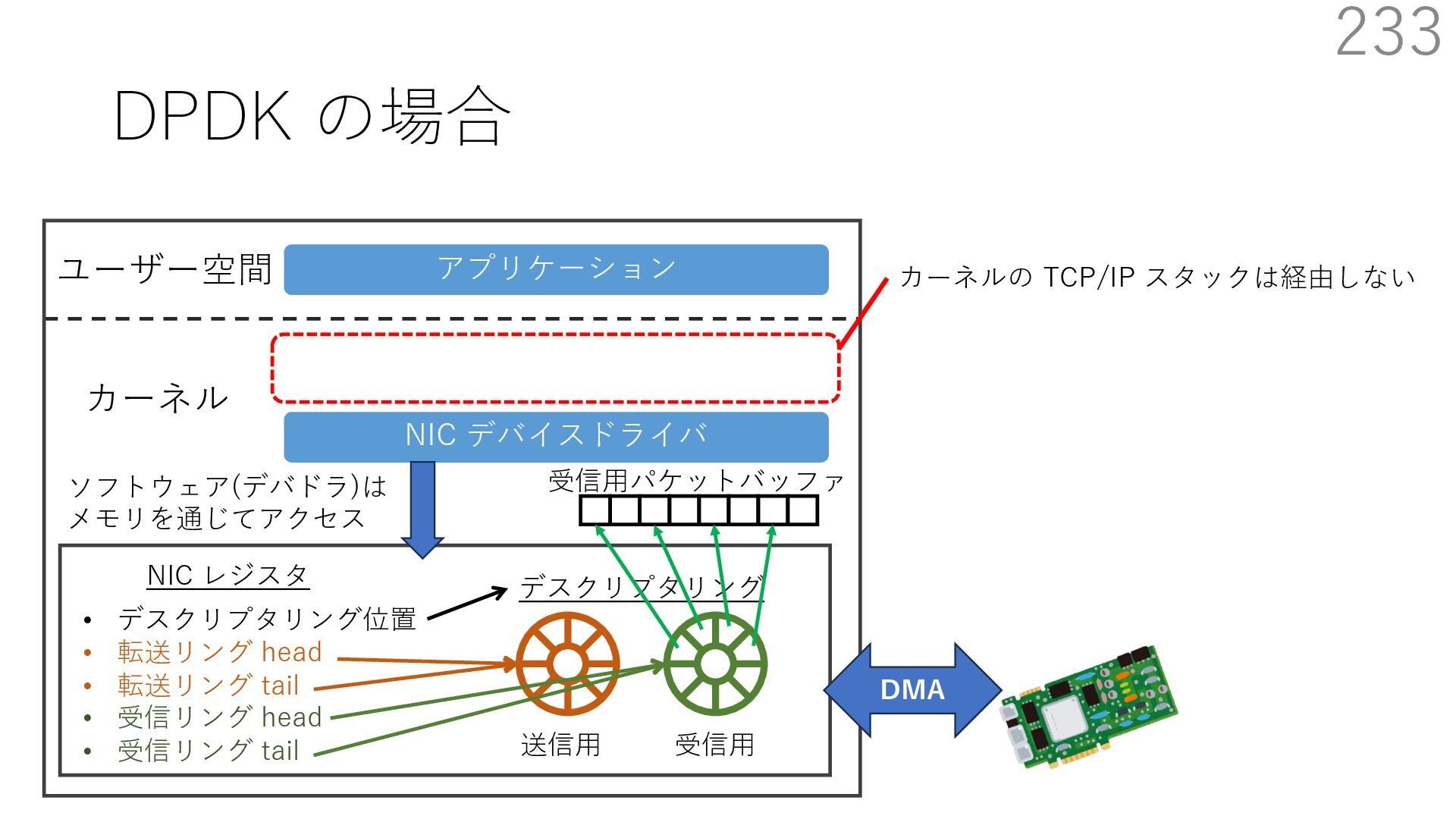 (SIGCOMM 2014) • mTCP (NSDI 2014) • Arrakis (OSDI 2014) • IX (OSDI 2014) • StackMap (USENIX ATC 2016) • Atlas (SIGCOMM 2017) • ZygOS (SOSP 2017) • Shenango (NSDI 2019) • Shinjuku (NSDI 2019) • TAS (EuroSys 2019) • Caladan (OSDI 2020) • Demikernel (SOSP 2021) 427 into a single library for both devices (e.g., RDMAxSPDK). We implemented the bulk of our library OS code in Rust. We initially prototyped several libOSes in C++; however, we found that Rust performs competitively with C++ and achieves ns-scale latencies while offering additional benefits. First, Rust enforces memory safety through language fea- tures and its compiler. Though our libOSes use unsafe code to bind to C/C++ kernel-bypass libraries and applications, User-space Software Kernel-space Software I/O Hardware I/O Device ??? libFuture ??? DPDK User I/O Buf. Mgmt libRDMA RDMA User I/O Buf. Mgmt Net. Trans. OS Kernel Control Path Demikernel Datapath Architecture App libPOSIX libDPDK SPDK User I/O Buf. Mgmt libSPDK Future Demikernel PDPIX Datapath API Figure 3. Demikernel kernel-bypass architecture. Demikernel ac- commodates heterogenous kernel-bypass devices, including poten- tial future hardware, with a flexible library OS-based datapath ar- chitecture.We include a libOS that goes through the OS kernel for 提案:異なるタイプのデバイスへ 共通のインターフェースからアクセス可能にする Irene Zhang, Amanda Raybuck, Pratyush Patel, Kirk Olynyk, Jacob Nelson, Omar S. Navarro Leija, Ashlie Martinez, Jing Liu, Anna Kornfeld Simpson, Sujay Jayakar, Pedro Henrique Penna, Max Demoulin, Piali Choudhury, and Anirudh Badam. 2021. The Demikernel Datapath OS Architecture for Microsecond-Scale Datacenter Systems. In Proceedings of the ACM Sigops 28th Symposium on Operating Systems Principles (SOSP ʼ21), 195-211.(https://doi.org/10.1145/3477132.3483569)