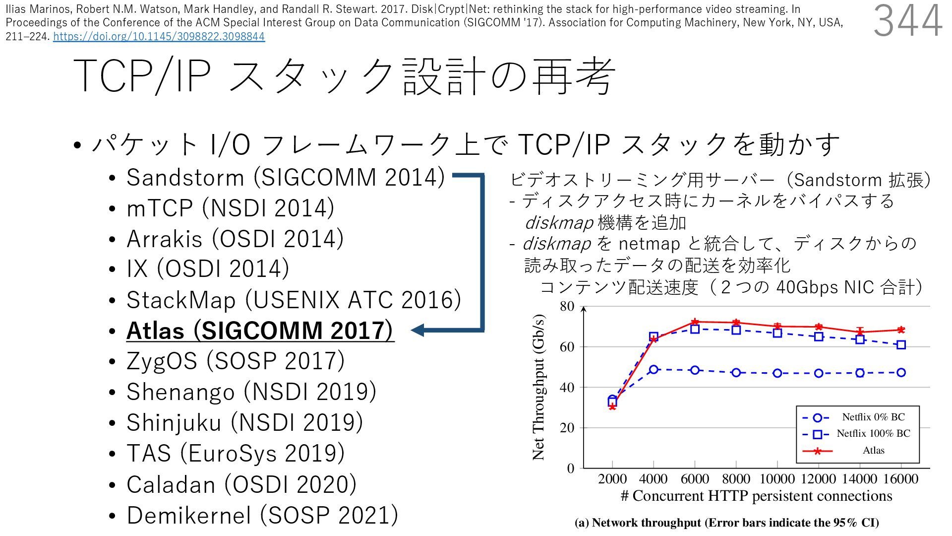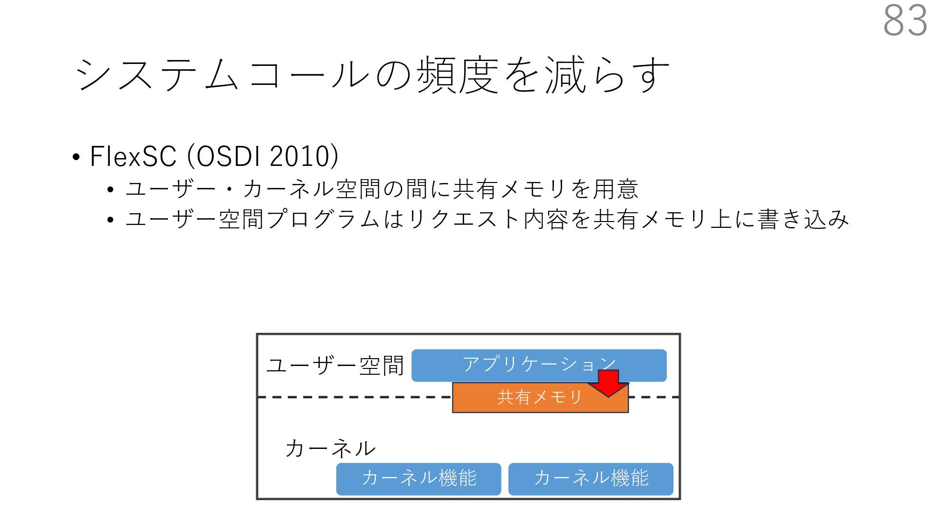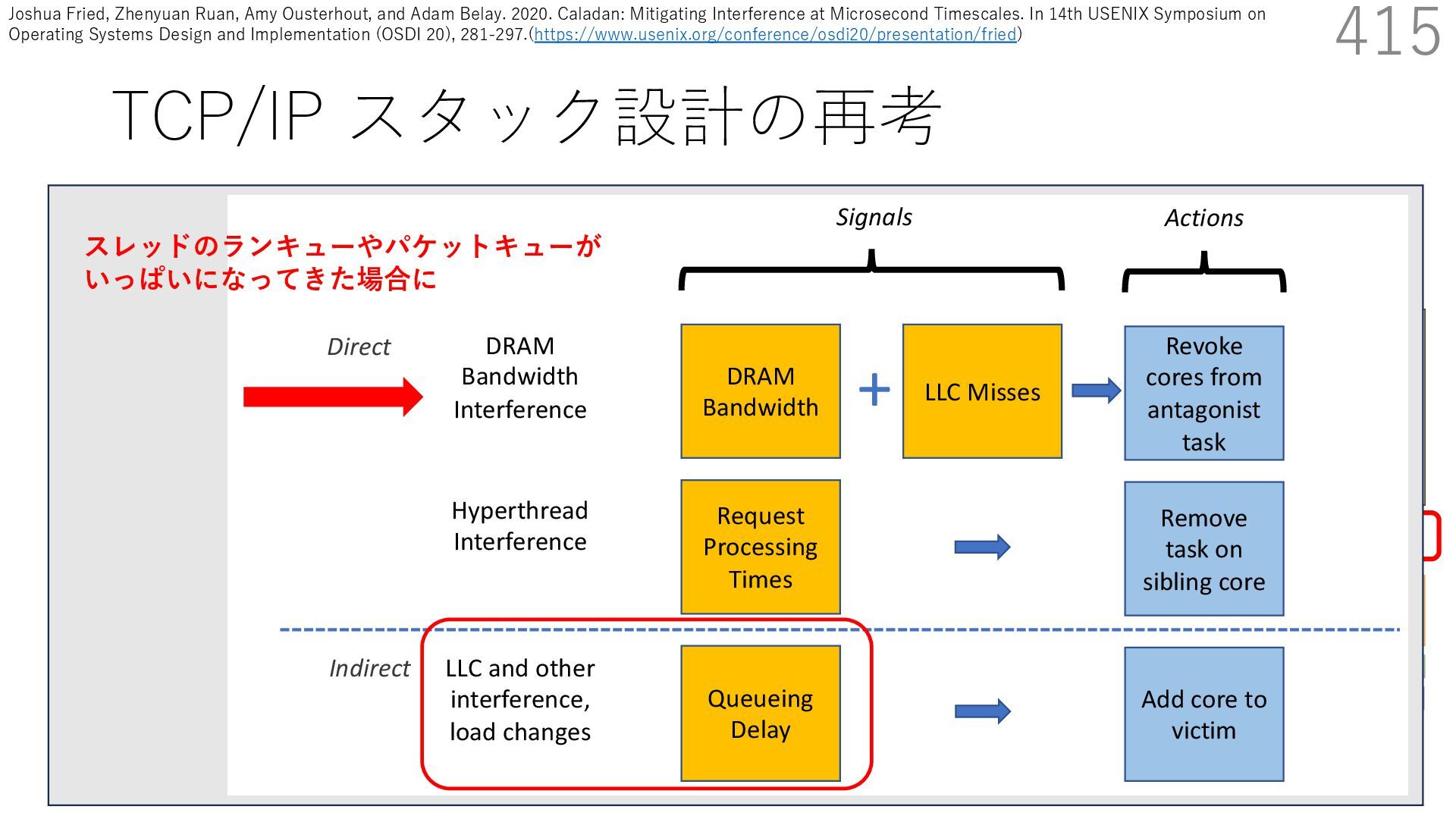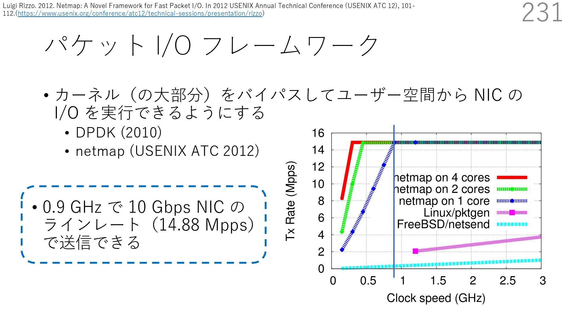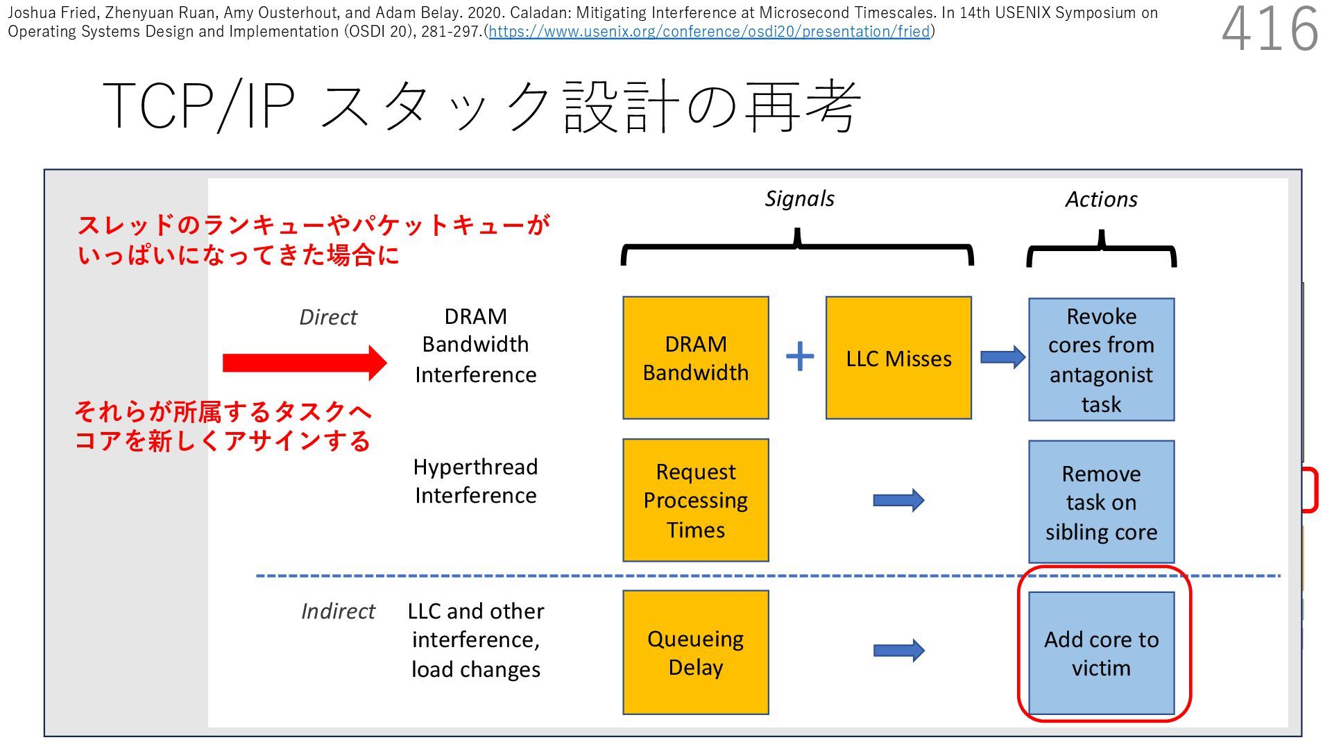 (SIGCOMM 2014) • mTCP (NSDI 2014) • Arrakis (OSDI 2014) • IX (OSDI 2014) • StackMap (USENIX ATC 2016) • Atlas (SIGCOMM 2017) • ZygOS (SOSP 2017) • Shenango (NSDI 2019) • Shinjuku (NSDI 2019) • TAS (EuroSys 2019) • Caladan (OSDI 2020) • Demikernel (SOSP 2021) 427 into a single library for both devices (e.g., RDMAxSPDK). We implemented the bulk of our library OS code in Rust. We initially prototyped several libOSes in C++; however, we found that Rust performs competitively with C++ and achieves ns-scale latencies while offering additional benefits. First, Rust enforces memory safety through language fea- tures and its compiler. Though our libOSes use unsafe code to bind to C/C++ kernel-bypass libraries and applications, User-space Software Kernel-space Software I/O Hardware I/O Device ??? libFuture ??? DPDK User I/O Buf. Mgmt libRDMA RDMA User I/O Buf. Mgmt Net. Trans. OS Kernel Control Path Demikernel Datapath Architecture App libPOSIX libDPDK SPDK User I/O Buf. Mgmt libSPDK Future Demikernel PDPIX Datapath API Figure 3. Demikernel kernel-bypass architecture. Demikernel ac- commodates heterogenous kernel-bypass devices, including poten- tial future hardware, with a flexible library OS-based datapath ar- chitecture.We include a libOS that goes through the OS kernel for 提案:異なるタイプのデバイスへ 共通のインターフェースからアクセス可能にする Irene Zhang, Amanda Raybuck, Pratyush Patel, Kirk Olynyk, Jacob Nelson, Omar S. Navarro Leija, Ashlie Martinez, Jing Liu, Anna Kornfeld Simpson, Sujay Jayakar, Pedro Henrique Penna, Max Demoulin, Piali Choudhury, and Anirudh Badam. 2021. The Demikernel Datapath OS Architecture for Microsecond-Scale Datacenter Systems. In Proceedings of the ACM Sigops 28th Symposium on Operating Systems Principles (SOSP ʼ21), 195-211.(https://doi.org/10.1145/3477132.3483569)