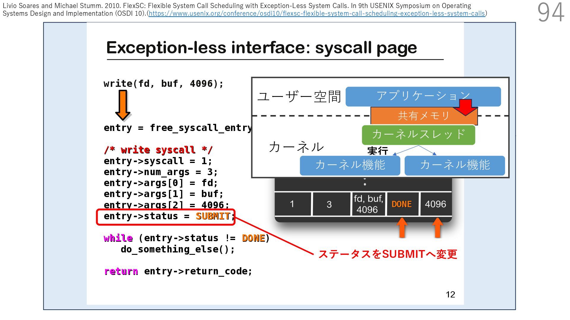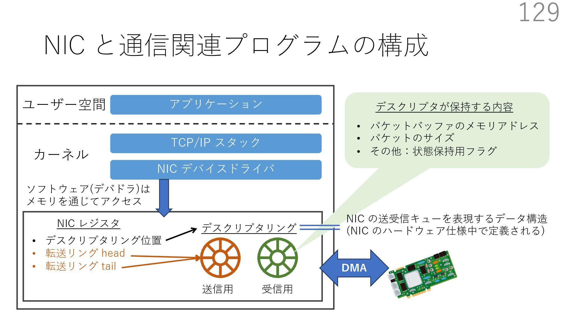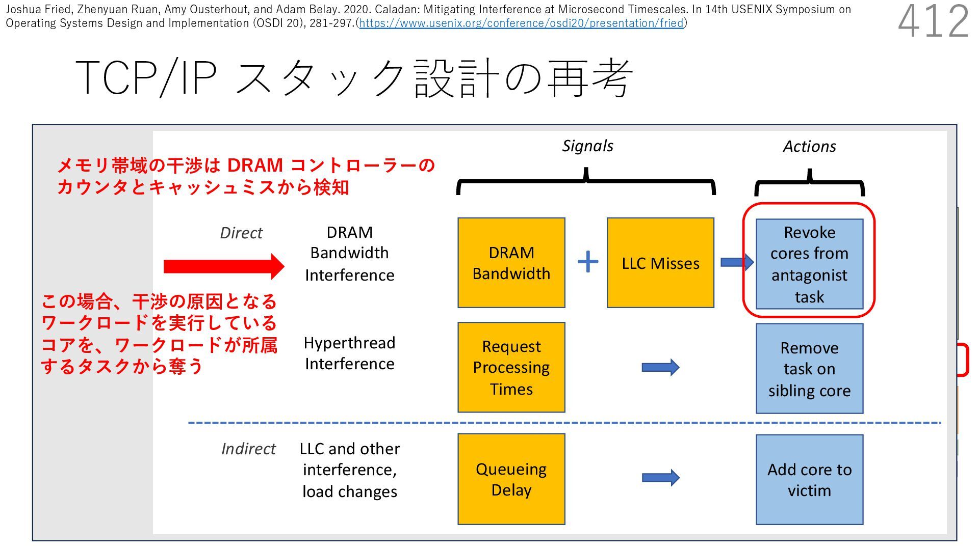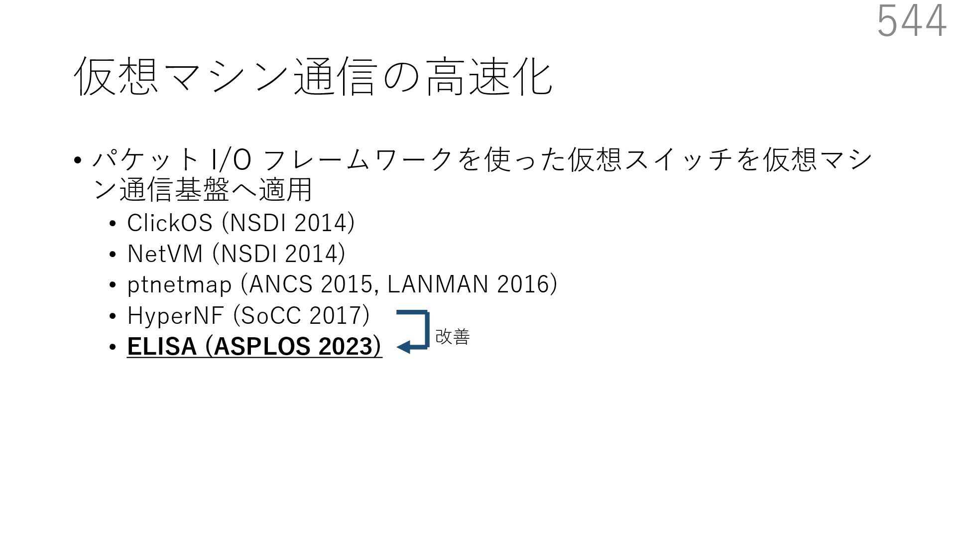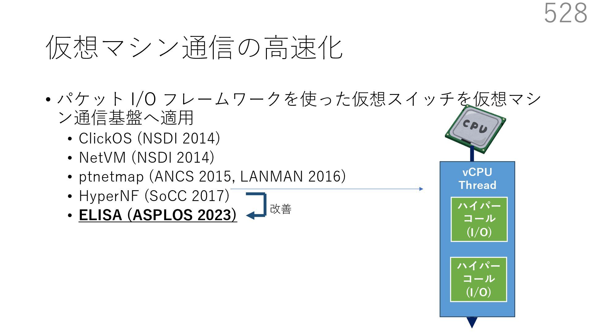 (SIGCOMM 2014) • mTCP (NSDI 2014) • Arrakis (OSDI 2014) • IX (OSDI 2014) • StackMap (USENIX ATC 2016) • Atlas (SIGCOMM 2017) • ZygOS (SOSP 2017) • Shenango (NSDI 2019) • Shinjuku (NSDI 2019) • TAS (EuroSys 2019) • Caladan (OSDI 2020) • Demikernel (SOSP 2021) 427 into a single library for both devices (e.g., RDMAxSPDK). We implemented the bulk of our library OS code in Rust. We initially prototyped several libOSes in C++; however, we found that Rust performs competitively with C++ and achieves ns-scale latencies while offering additional benefits. First, Rust enforces memory safety through language fea- tures and its compiler. Though our libOSes use unsafe code to bind to C/C++ kernel-bypass libraries and applications, User-space Software Kernel-space Software I/O Hardware I/O Device ??? libFuture ??? DPDK User I/O Buf. Mgmt libRDMA RDMA User I/O Buf. Mgmt Net. Trans. OS Kernel Control Path Demikernel Datapath Architecture App libPOSIX libDPDK SPDK User I/O Buf. Mgmt libSPDK Future Demikernel PDPIX Datapath API Figure 3. Demikernel kernel-bypass architecture. Demikernel ac- commodates heterogenous kernel-bypass devices, including poten- tial future hardware, with a flexible library OS-based datapath ar- chitecture.We include a libOS that goes through the OS kernel for 提案:異なるタイプのデバイスへ 共通のインターフェースからアクセス可能にする Irene Zhang, Amanda Raybuck, Pratyush Patel, Kirk Olynyk, Jacob Nelson, Omar S. Navarro Leija, Ashlie Martinez, Jing Liu, Anna Kornfeld Simpson, Sujay Jayakar, Pedro Henrique Penna, Max Demoulin, Piali Choudhury, and Anirudh Badam. 2021. The Demikernel Datapath OS Architecture for Microsecond-Scale Datacenter Systems. In Proceedings of the ACM Sigops 28th Symposium on Operating Systems Principles (SOSP ʼ21), 195-211.(https://doi.org/10.1145/3477132.3483569)