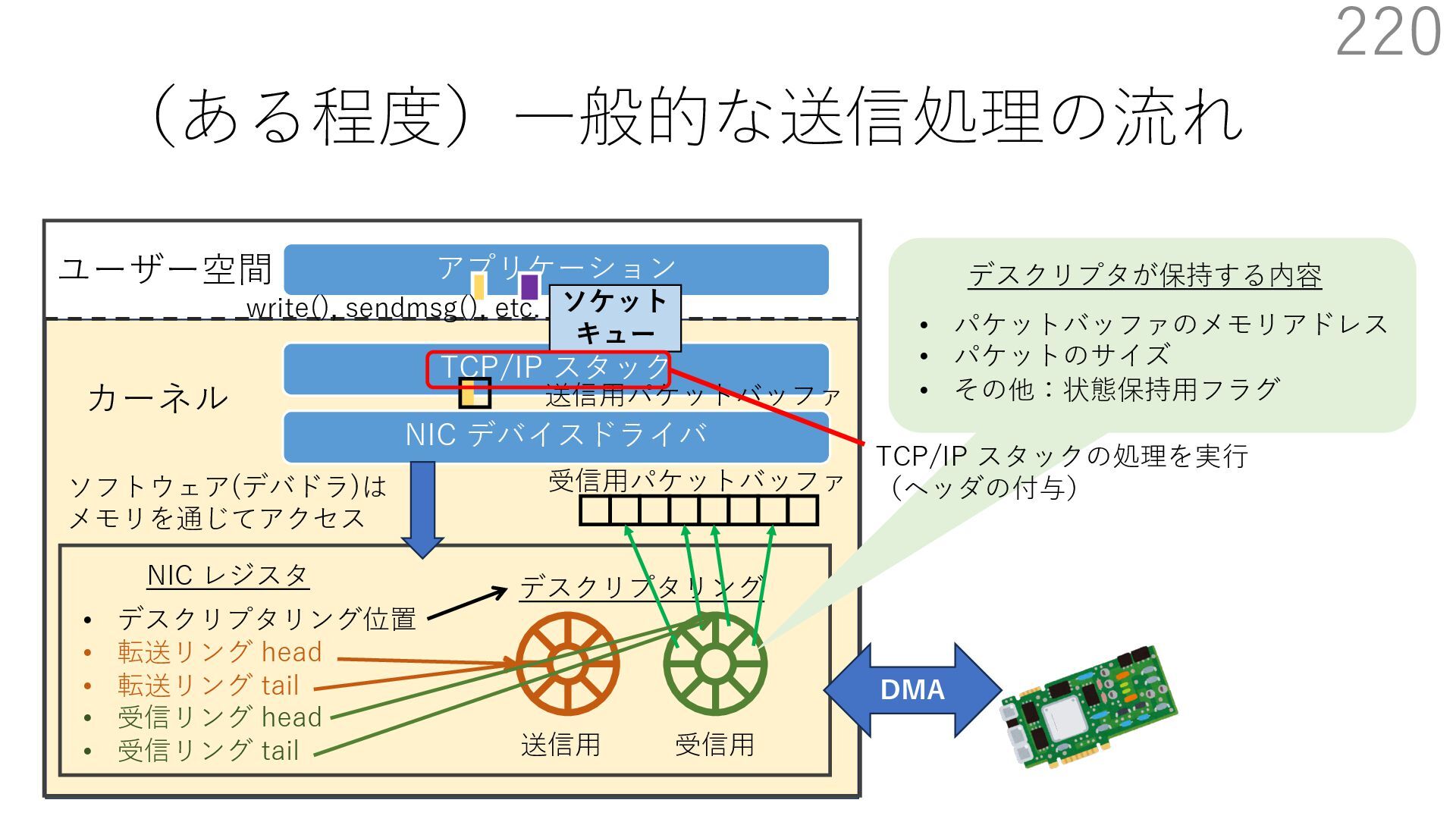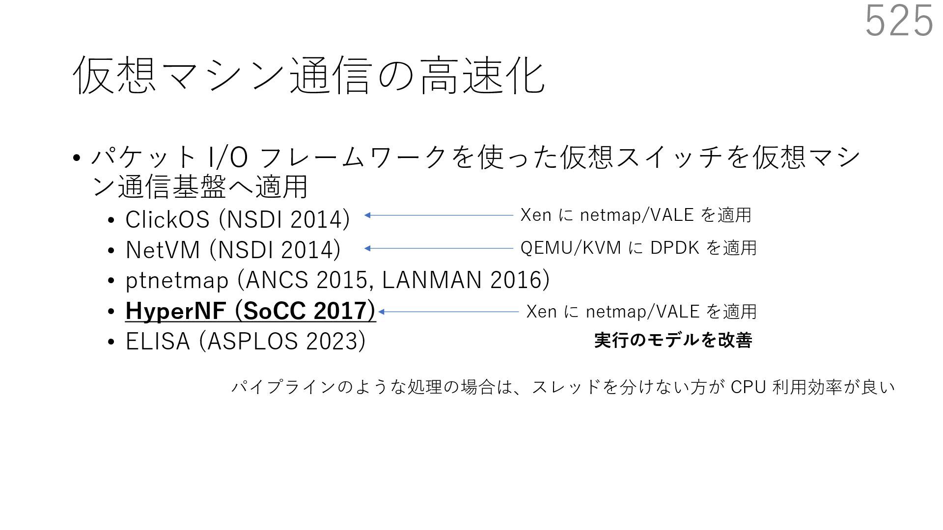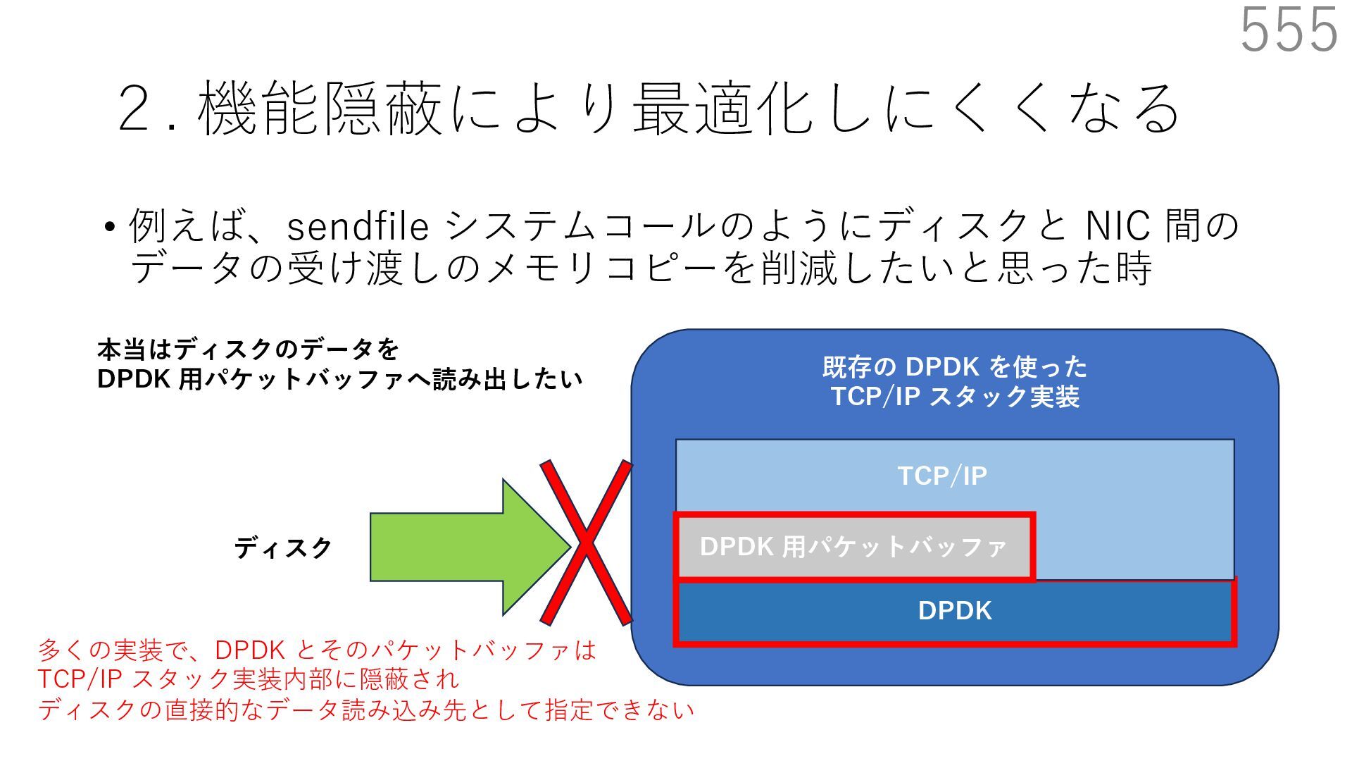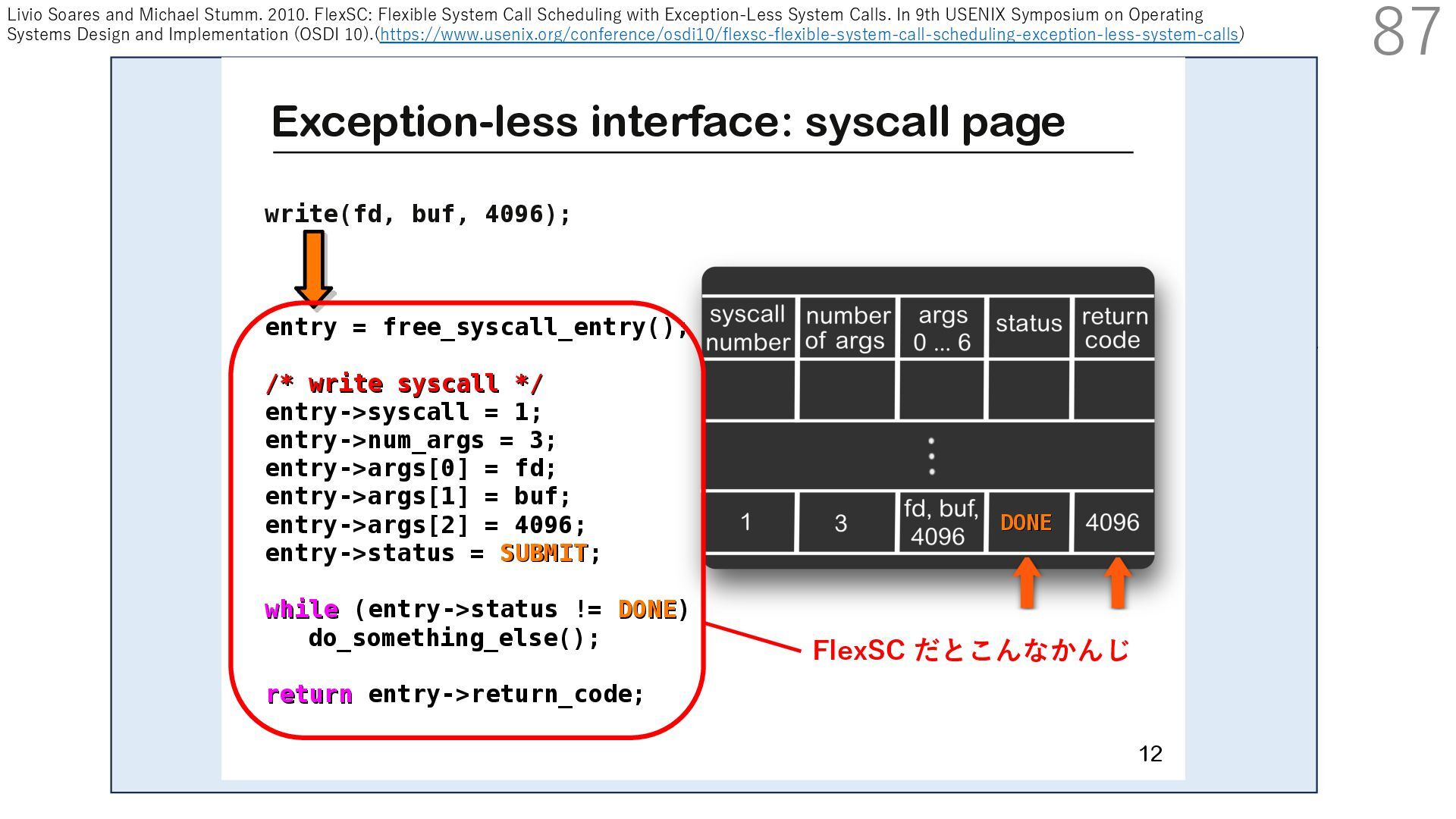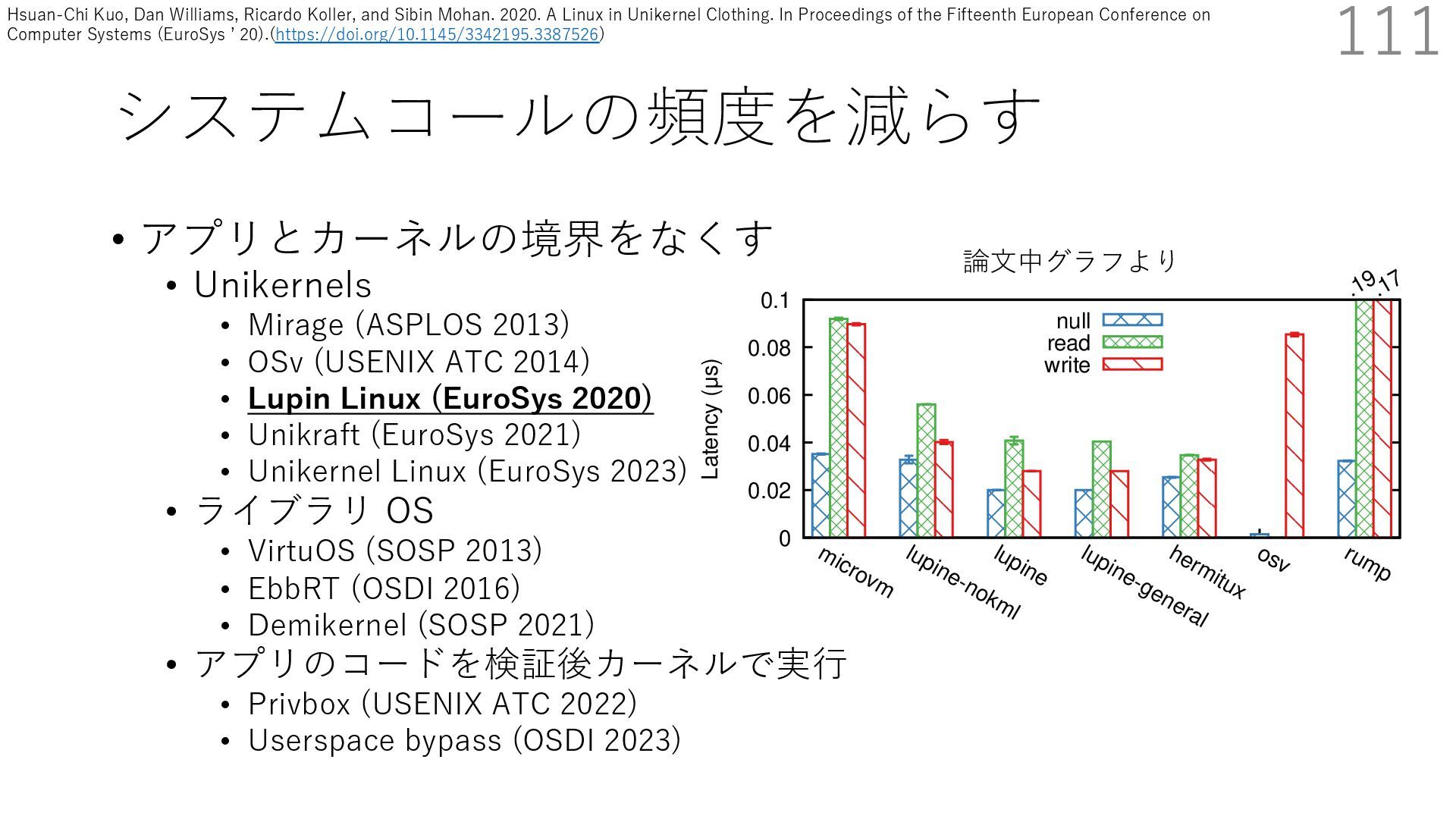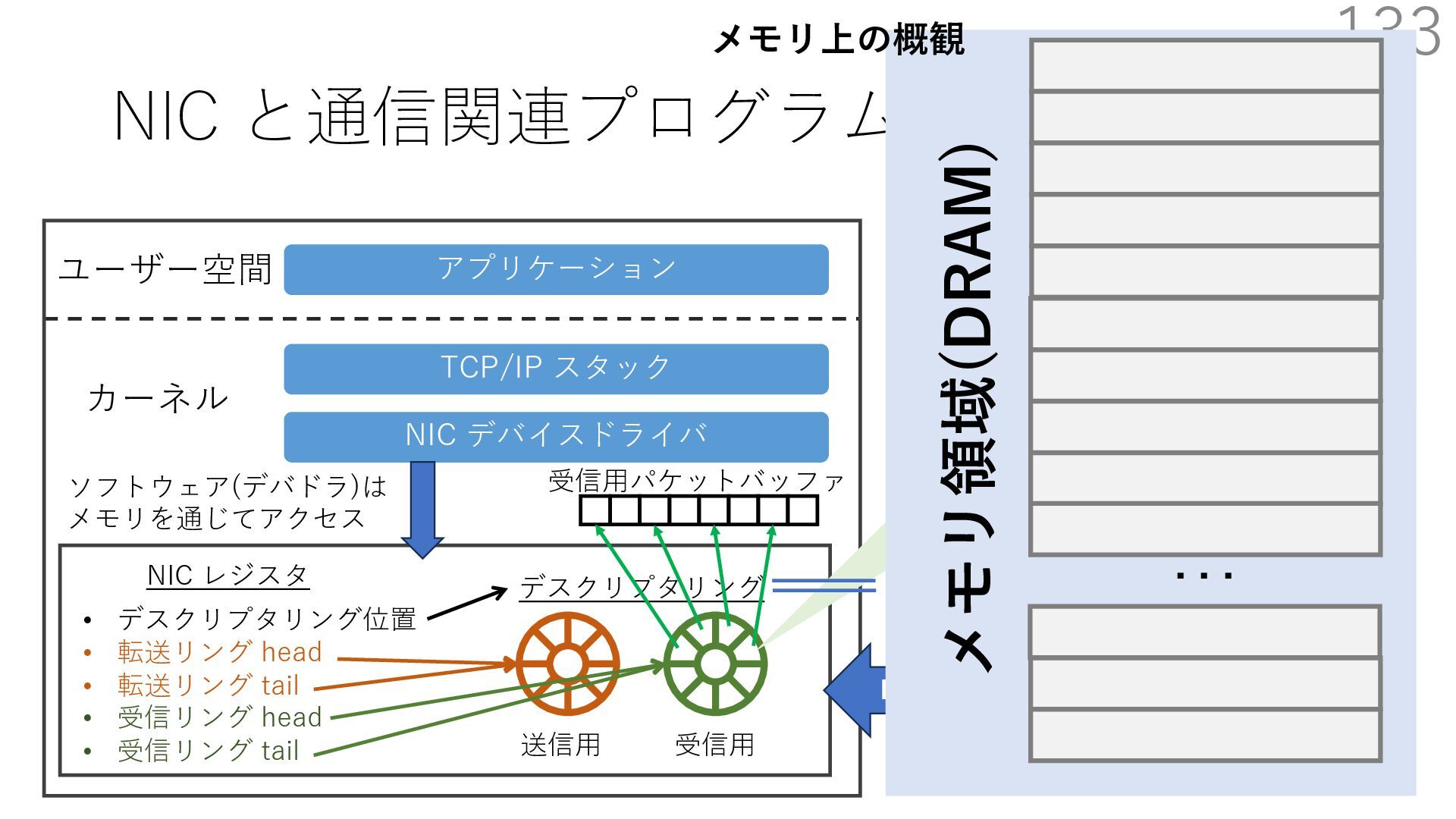 (SIGCOMM 2014) • mTCP (NSDI 2014) • Arrakis (OSDI 2014) • IX (OSDI 2014) • StackMap (USENIX ATC 2016) • Atlas (SIGCOMM 2017) • ZygOS (SOSP 2017) • Shenango (NSDI 2019) • Shinjuku (NSDI 2019) • TAS (EuroSys 2019) • Caladan (OSDI 2020) • Demikernel (SOSP 2021) 427 into a single library for both devices (e.g., RDMAxSPDK). We implemented the bulk of our library OS code in Rust. We initially prototyped several libOSes in C++; however, we found that Rust performs competitively with C++ and achieves ns-scale latencies while offering additional benefits. First, Rust enforces memory safety through language fea- tures and its compiler. Though our libOSes use unsafe code to bind to C/C++ kernel-bypass libraries and applications, User-space Software Kernel-space Software I/O Hardware I/O Device ??? libFuture ??? DPDK User I/O Buf. Mgmt libRDMA RDMA User I/O Buf. Mgmt Net. Trans. OS Kernel Control Path Demikernel Datapath Architecture App libPOSIX libDPDK SPDK User I/O Buf. Mgmt libSPDK Future Demikernel PDPIX Datapath API Figure 3. Demikernel kernel-bypass architecture. Demikernel ac- commodates heterogenous kernel-bypass devices, including poten- tial future hardware, with a flexible library OS-based datapath ar- chitecture.We include a libOS that goes through the OS kernel for 提案:異なるタイプのデバイスへ 共通のインターフェースからアクセス可能にする Irene Zhang, Amanda Raybuck, Pratyush Patel, Kirk Olynyk, Jacob Nelson, Omar S. Navarro Leija, Ashlie Martinez, Jing Liu, Anna Kornfeld Simpson, Sujay Jayakar, Pedro Henrique Penna, Max Demoulin, Piali Choudhury, and Anirudh Badam. 2021. The Demikernel Datapath OS Architecture for Microsecond-Scale Datacenter Systems. In Proceedings of the ACM Sigops 28th Symposium on Operating Systems Principles (SOSP ʼ21), 195-211.(https://doi.org/10.1145/3477132.3483569)