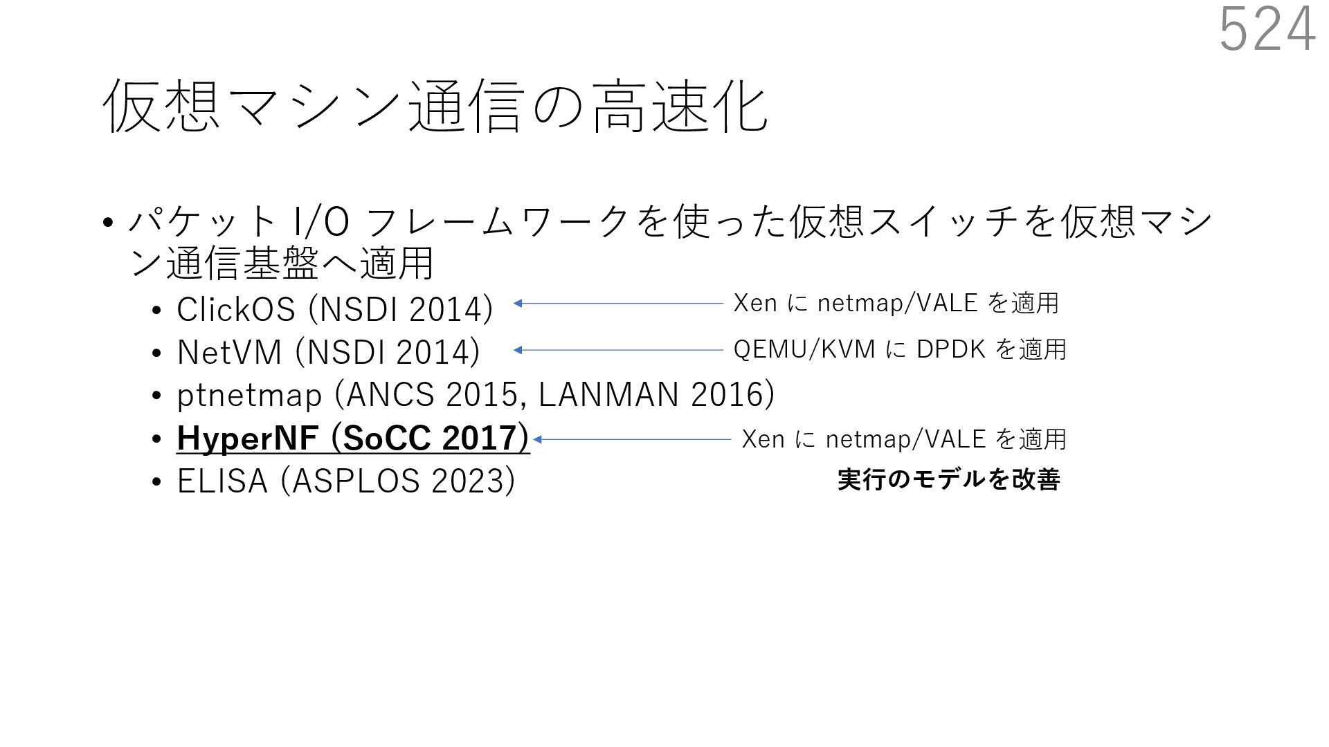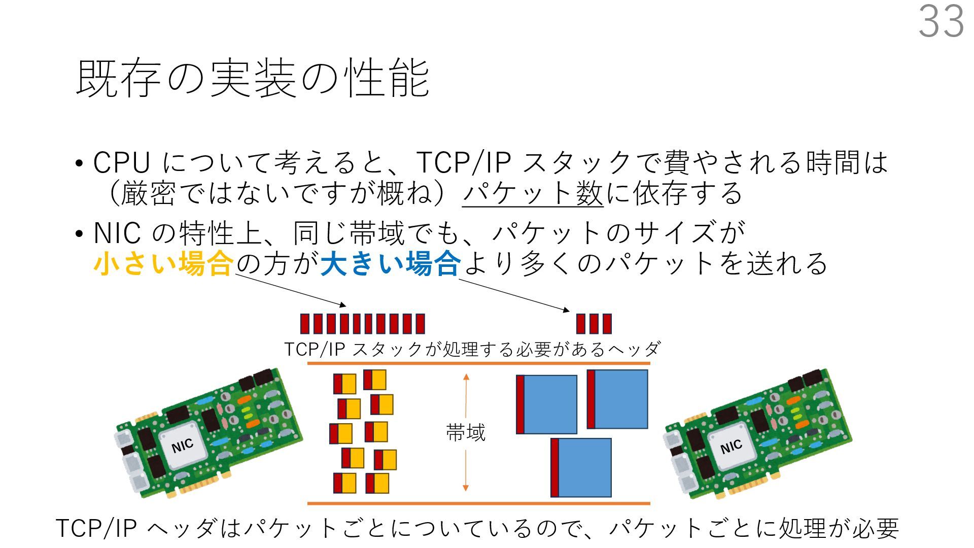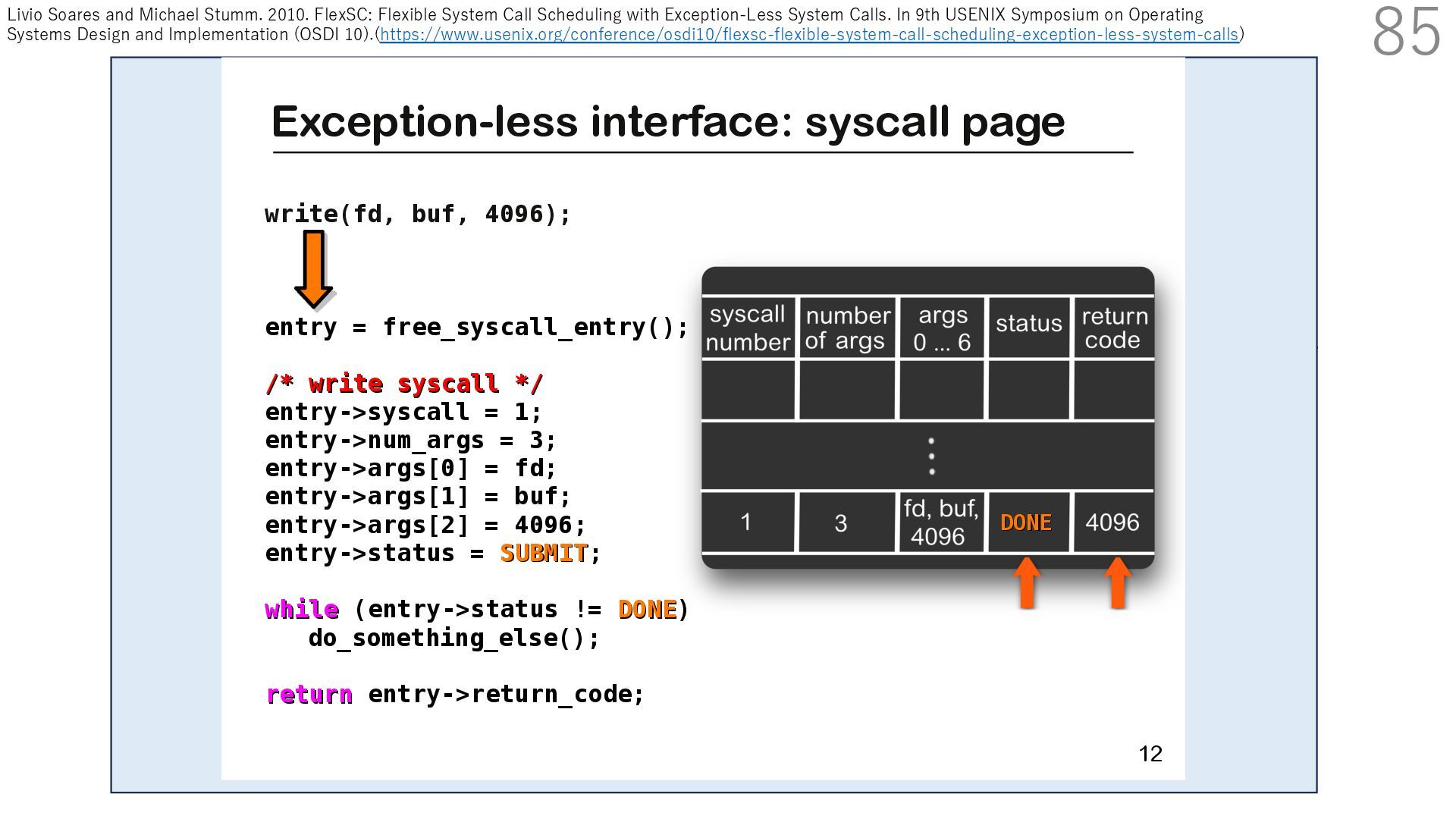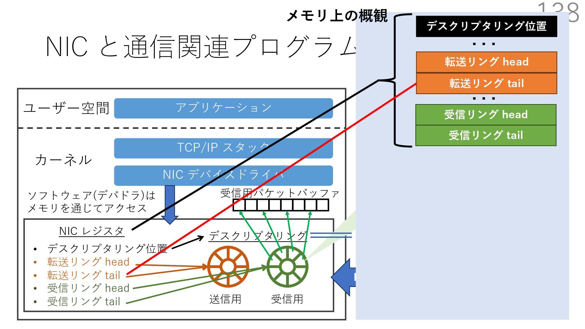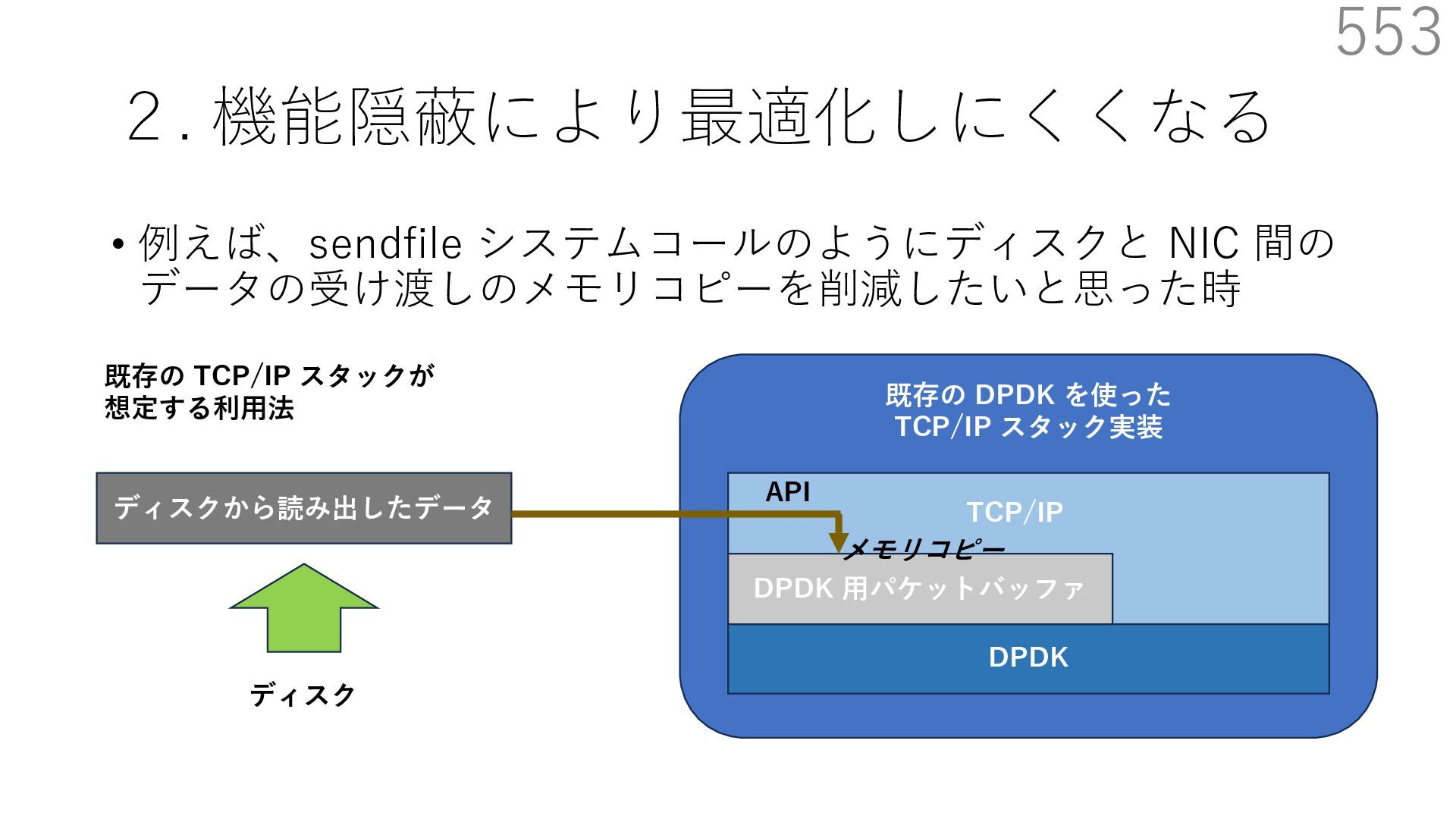 (SIGCOMM 2014) • mTCP (NSDI 2014) • Arrakis (OSDI 2014) • IX (OSDI 2014) • StackMap (USENIX ATC 2016) • Atlas (SIGCOMM 2017) • ZygOS (SOSP 2017) • Shenango (NSDI 2019) • Shinjuku (NSDI 2019) • TAS (EuroSys 2019) • Caladan (OSDI 2020) • Demikernel (SOSP 2021) 427 into a single library for both devices (e.g., RDMAxSPDK). We implemented the bulk of our library OS code in Rust. We initially prototyped several libOSes in C++; however, we found that Rust performs competitively with C++ and achieves ns-scale latencies while offering additional benefits. First, Rust enforces memory safety through language fea- tures and its compiler. Though our libOSes use unsafe code to bind to C/C++ kernel-bypass libraries and applications, User-space Software Kernel-space Software I/O Hardware I/O Device ??? libFuture ??? DPDK User I/O Buf. Mgmt libRDMA RDMA User I/O Buf. Mgmt Net. Trans. OS Kernel Control Path Demikernel Datapath Architecture App libPOSIX libDPDK SPDK User I/O Buf. Mgmt libSPDK Future Demikernel PDPIX Datapath API Figure 3. Demikernel kernel-bypass architecture. Demikernel ac- commodates heterogenous kernel-bypass devices, including poten- tial future hardware, with a flexible library OS-based datapath ar- chitecture.We include a libOS that goes through the OS kernel for 提案:異なるタイプのデバイスへ 共通のインターフェースからアクセス可能にする Irene Zhang, Amanda Raybuck, Pratyush Patel, Kirk Olynyk, Jacob Nelson, Omar S. Navarro Leija, Ashlie Martinez, Jing Liu, Anna Kornfeld Simpson, Sujay Jayakar, Pedro Henrique Penna, Max Demoulin, Piali Choudhury, and Anirudh Badam. 2021. The Demikernel Datapath OS Architecture for Microsecond-Scale Datacenter Systems. In Proceedings of the ACM Sigops 28th Symposium on Operating Systems Principles (SOSP ʼ21), 195-211.(https://doi.org/10.1145/3477132.3483569)