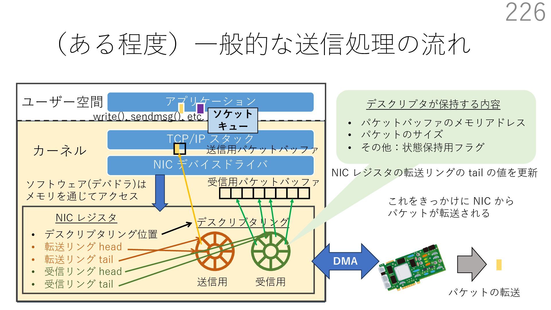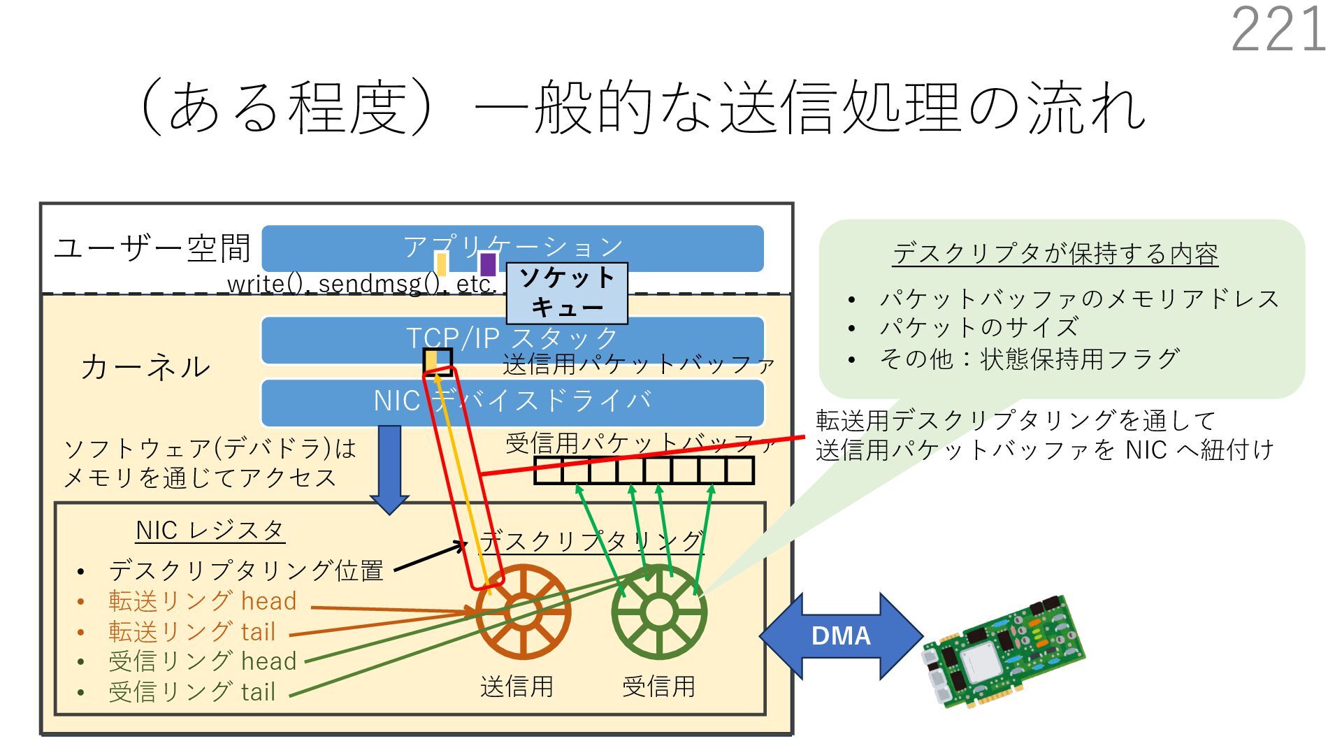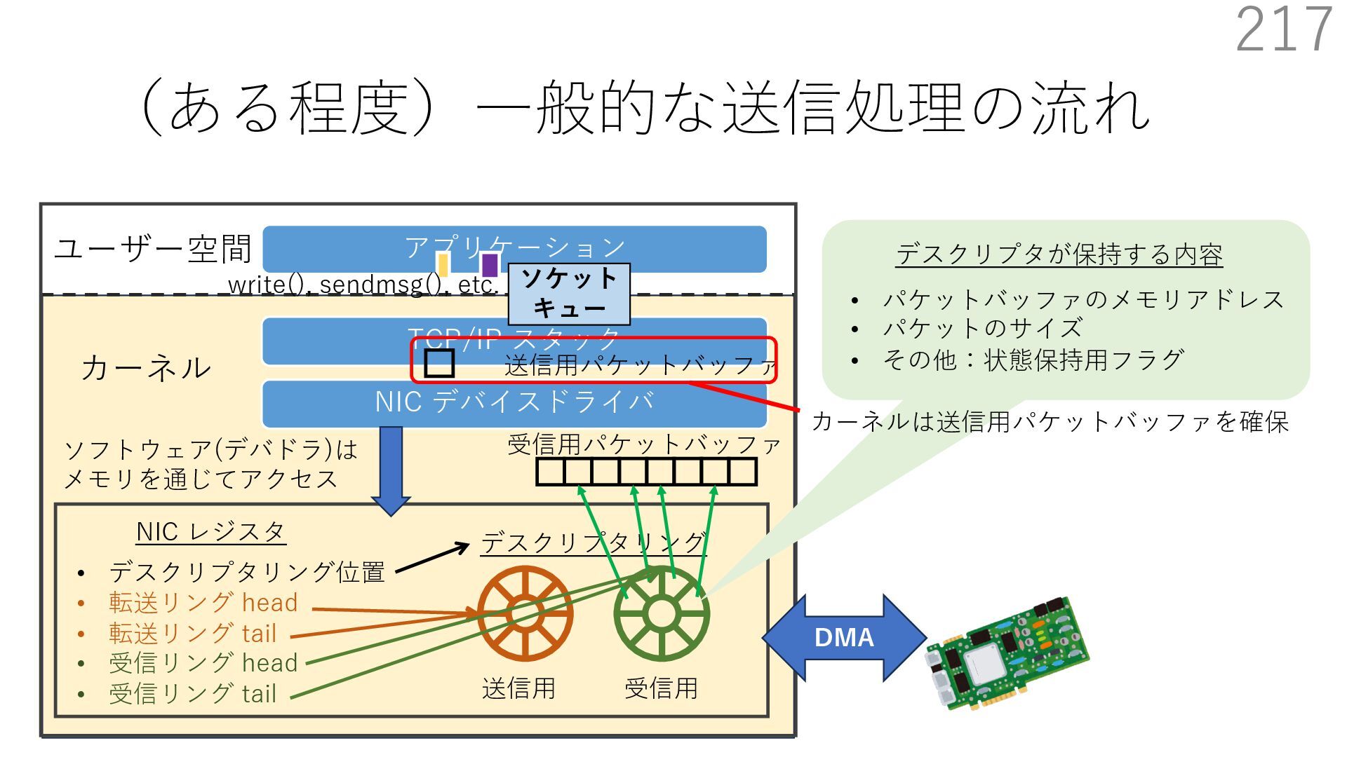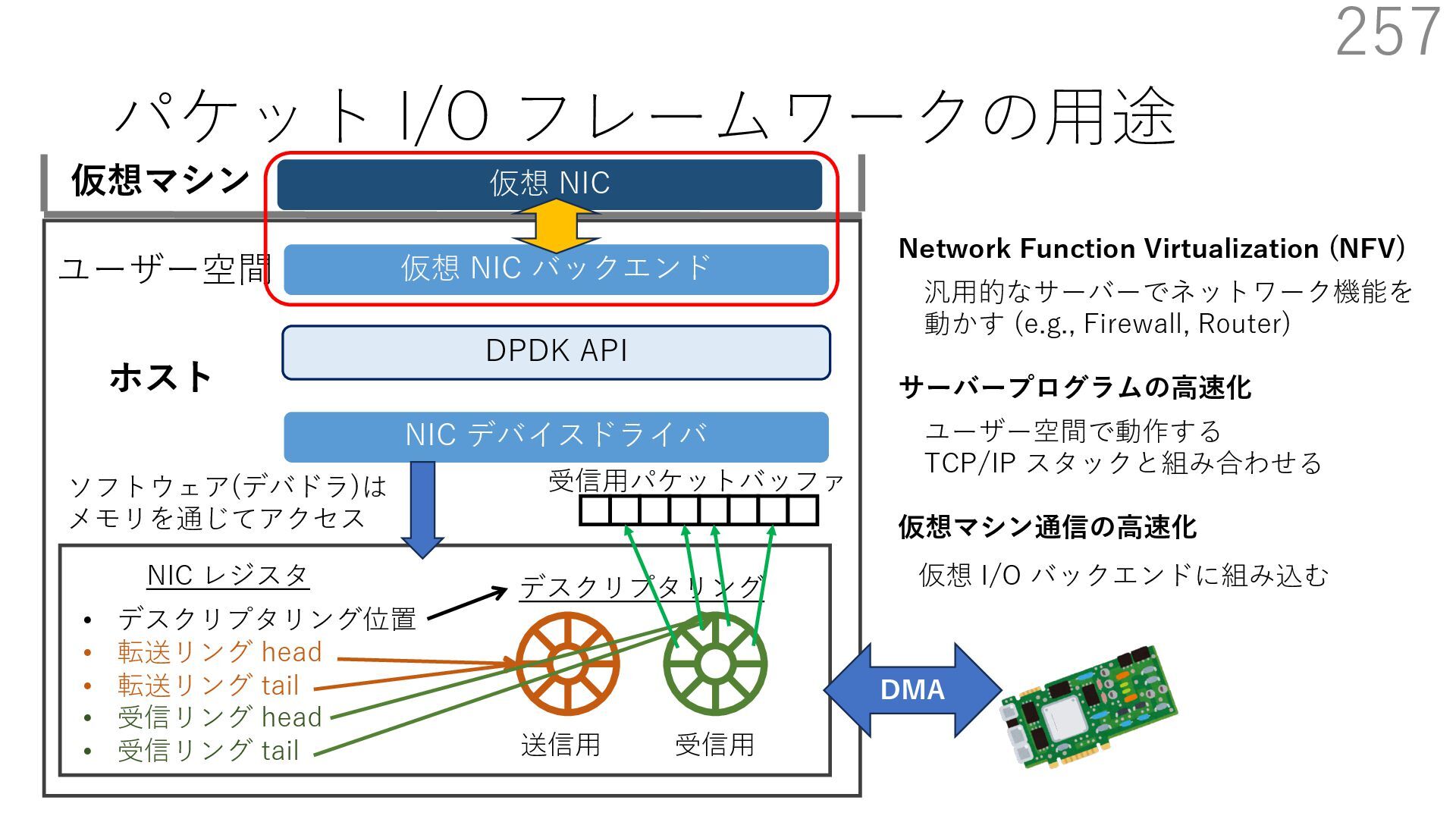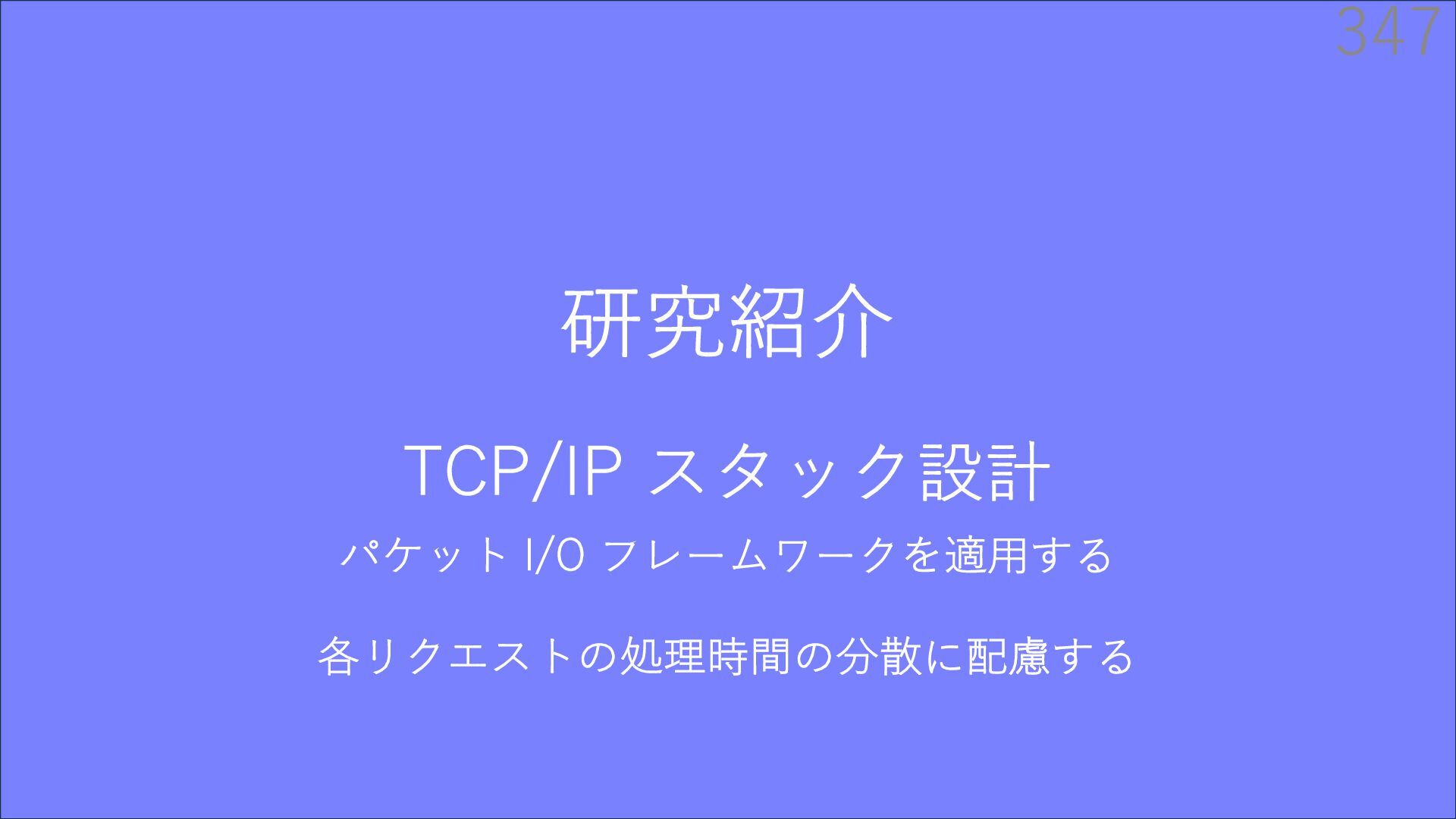 (SIGCOMM 2014) • mTCP (NSDI 2014) • Arrakis (OSDI 2014) • IX (OSDI 2014) • StackMap (USENIX ATC 2016) • Atlas (SIGCOMM 2017) • ZygOS (SOSP 2017) • Shenango (NSDI 2019) • Shinjuku (NSDI 2019) • TAS (EuroSys 2019) • Caladan (OSDI 2020) • Demikernel (SOSP 2021) 427 into a single library for both devices (e.g., RDMAxSPDK). We implemented the bulk of our library OS code in Rust. We initially prototyped several libOSes in C++; however, we found that Rust performs competitively with C++ and achieves ns-scale latencies while offering additional benefits. First, Rust enforces memory safety through language fea- tures and its compiler. Though our libOSes use unsafe code to bind to C/C++ kernel-bypass libraries and applications, User-space Software Kernel-space Software I/O Hardware I/O Device ??? libFuture ??? DPDK User I/O Buf. Mgmt libRDMA RDMA User I/O Buf. Mgmt Net. Trans. OS Kernel Control Path Demikernel Datapath Architecture App libPOSIX libDPDK SPDK User I/O Buf. Mgmt libSPDK Future Demikernel PDPIX Datapath API Figure 3. Demikernel kernel-bypass architecture. Demikernel ac- commodates heterogenous kernel-bypass devices, including poten- tial future hardware, with a flexible library OS-based datapath ar- chitecture.We include a libOS that goes through the OS kernel for 提案:異なるタイプのデバイスへ 共通のインターフェースからアクセス可能にする Irene Zhang, Amanda Raybuck, Pratyush Patel, Kirk Olynyk, Jacob Nelson, Omar S. Navarro Leija, Ashlie Martinez, Jing Liu, Anna Kornfeld Simpson, Sujay Jayakar, Pedro Henrique Penna, Max Demoulin, Piali Choudhury, and Anirudh Badam. 2021. The Demikernel Datapath OS Architecture for Microsecond-Scale Datacenter Systems. In Proceedings of the ACM Sigops 28th Symposium on Operating Systems Principles (SOSP ʼ21), 195-211.(https://doi.org/10.1145/3477132.3483569)