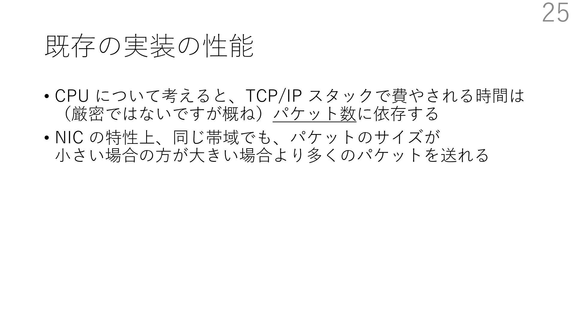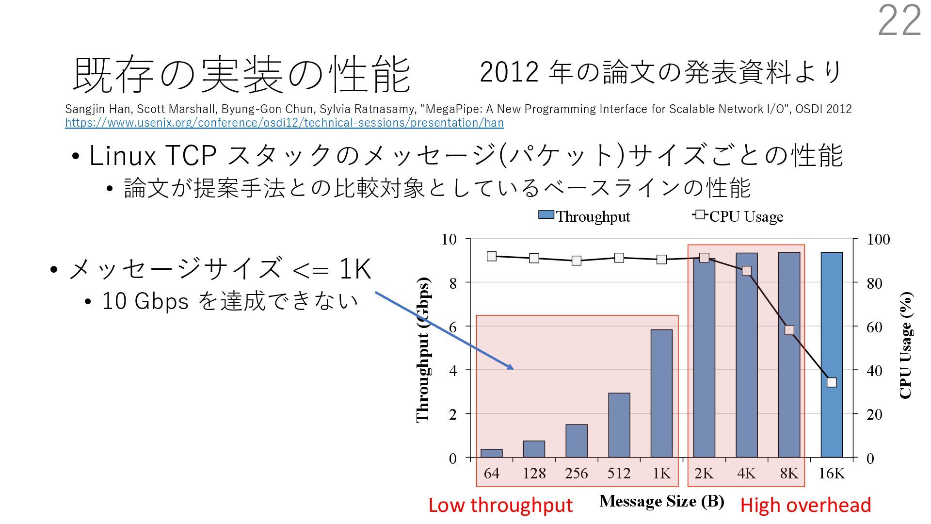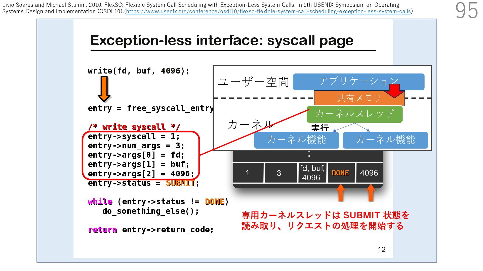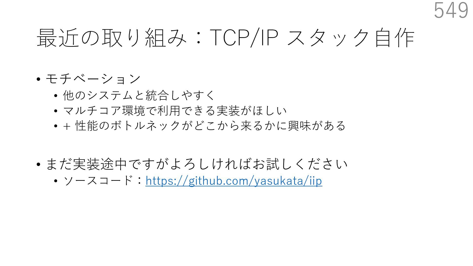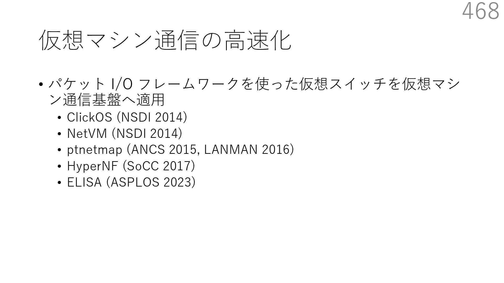 (SIGCOMM 2014) • mTCP (NSDI 2014) • Arrakis (OSDI 2014) • IX (OSDI 2014) • StackMap (USENIX ATC 2016) • Atlas (SIGCOMM 2017) • ZygOS (SOSP 2017) • Shenango (NSDI 2019) • Shinjuku (NSDI 2019) • TAS (EuroSys 2019) • Caladan (OSDI 2020) • Demikernel (SOSP 2021) 427 into a single library for both devices (e.g., RDMAxSPDK). We implemented the bulk of our library OS code in Rust. We initially prototyped several libOSes in C++; however, we found that Rust performs competitively with C++ and achieves ns-scale latencies while offering additional benefits. First, Rust enforces memory safety through language fea- tures and its compiler. Though our libOSes use unsafe code to bind to C/C++ kernel-bypass libraries and applications, User-space Software Kernel-space Software I/O Hardware I/O Device ??? libFuture ??? DPDK User I/O Buf. Mgmt libRDMA RDMA User I/O Buf. Mgmt Net. Trans. OS Kernel Control Path Demikernel Datapath Architecture App libPOSIX libDPDK SPDK User I/O Buf. Mgmt libSPDK Future Demikernel PDPIX Datapath API Figure 3. Demikernel kernel-bypass architecture. Demikernel ac- commodates heterogenous kernel-bypass devices, including poten- tial future hardware, with a flexible library OS-based datapath ar- chitecture.We include a libOS that goes through the OS kernel for 提案:異なるタイプのデバイスへ 共通のインターフェースからアクセス可能にする Irene Zhang, Amanda Raybuck, Pratyush Patel, Kirk Olynyk, Jacob Nelson, Omar S. Navarro Leija, Ashlie Martinez, Jing Liu, Anna Kornfeld Simpson, Sujay Jayakar, Pedro Henrique Penna, Max Demoulin, Piali Choudhury, and Anirudh Badam. 2021. The Demikernel Datapath OS Architecture for Microsecond-Scale Datacenter Systems. In Proceedings of the ACM Sigops 28th Symposium on Operating Systems Principles (SOSP ʼ21), 195-211.(https://doi.org/10.1145/3477132.3483569)