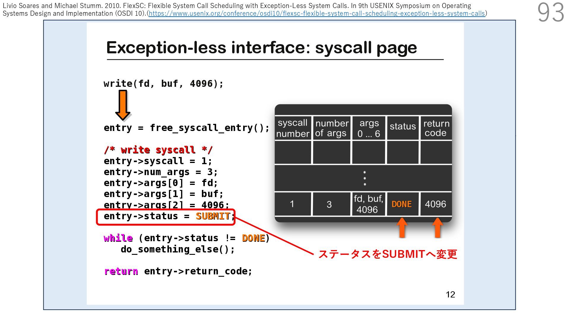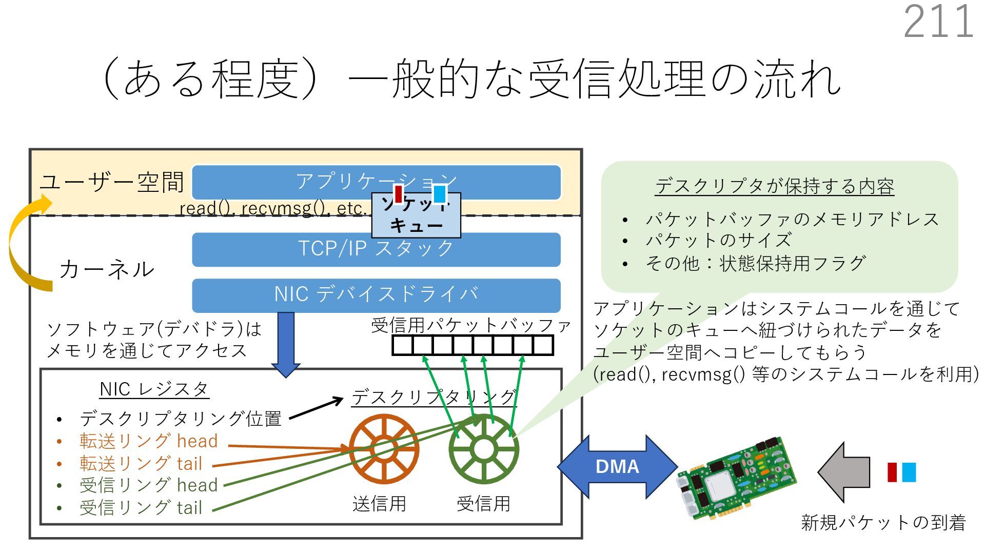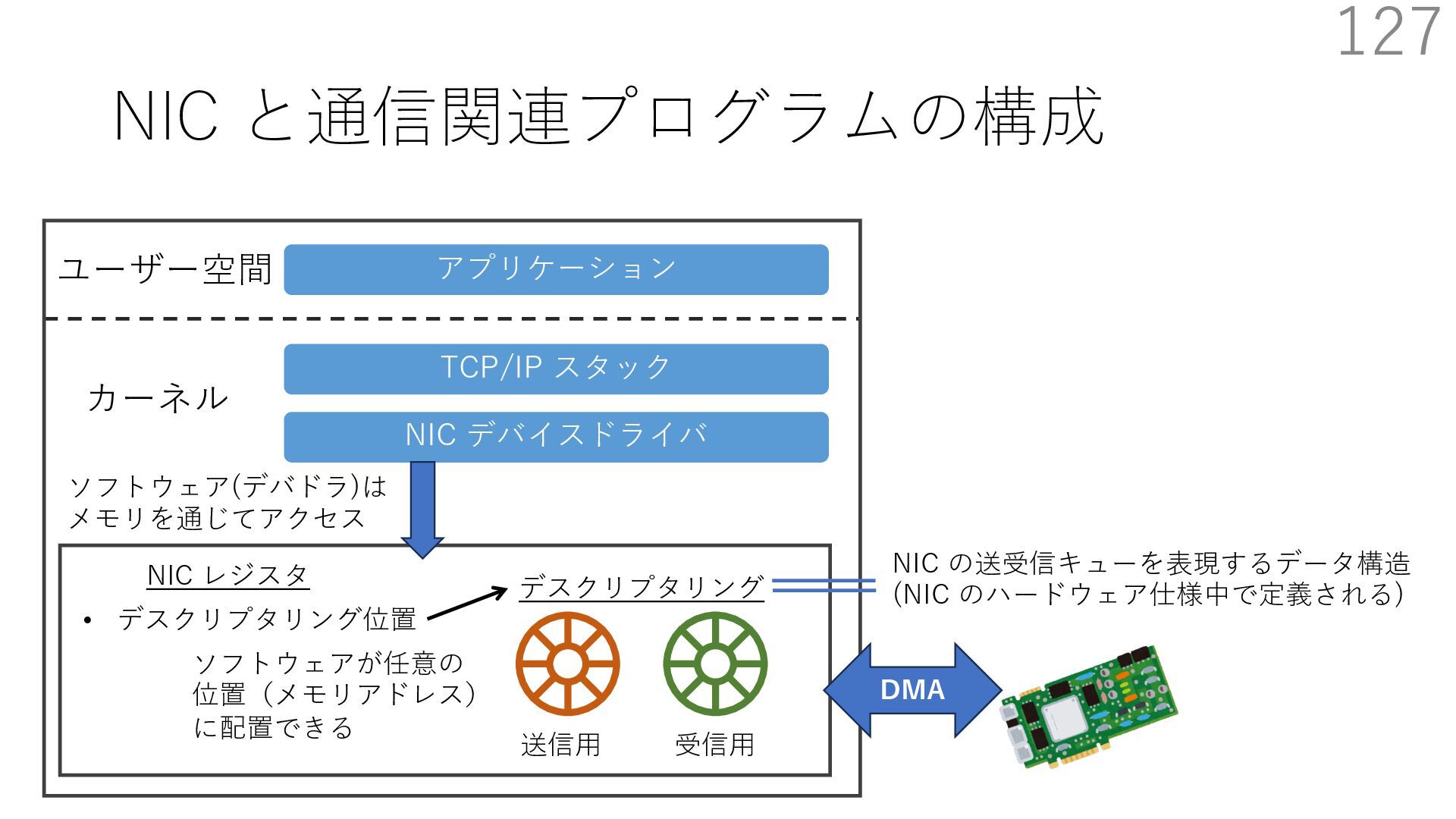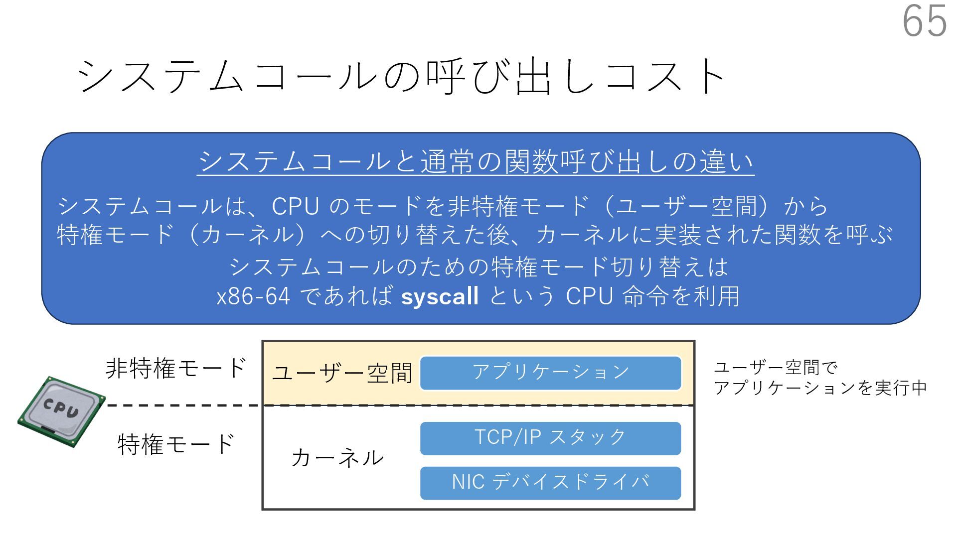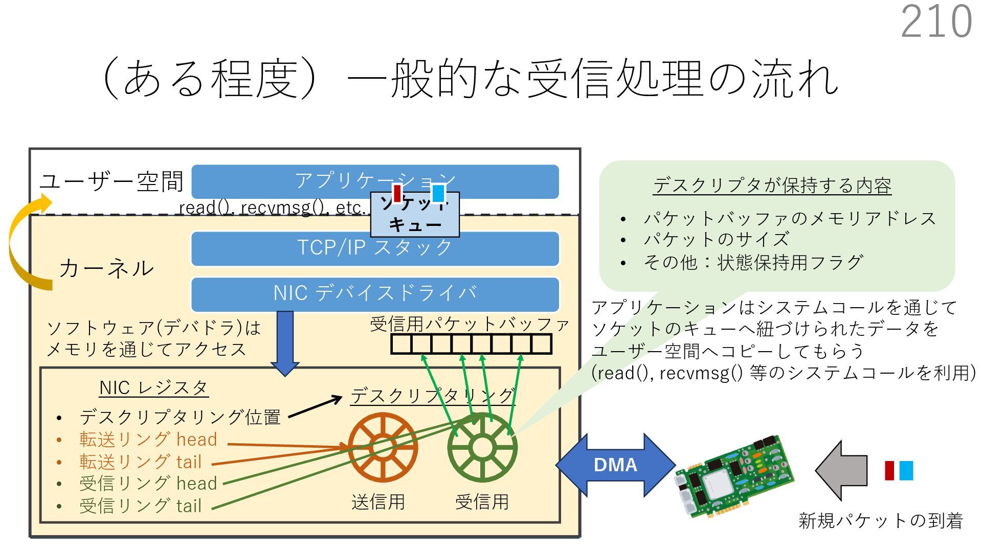 (SIGCOMM 2014) • mTCP (NSDI 2014) • Arrakis (OSDI 2014) • IX (OSDI 2014) • StackMap (USENIX ATC 2016) • Atlas (SIGCOMM 2017) • ZygOS (SOSP 2017) • Shenango (NSDI 2019) • Shinjuku (NSDI 2019) • TAS (EuroSys 2019) • Caladan (OSDI 2020) • Demikernel (SOSP 2021) 427 into a single library for both devices (e.g., RDMAxSPDK). We implemented the bulk of our library OS code in Rust. We initially prototyped several libOSes in C++; however, we found that Rust performs competitively with C++ and achieves ns-scale latencies while offering additional benefits. First, Rust enforces memory safety through language fea- tures and its compiler. Though our libOSes use unsafe code to bind to C/C++ kernel-bypass libraries and applications, User-space Software Kernel-space Software I/O Hardware I/O Device ??? libFuture ??? DPDK User I/O Buf. Mgmt libRDMA RDMA User I/O Buf. Mgmt Net. Trans. OS Kernel Control Path Demikernel Datapath Architecture App libPOSIX libDPDK SPDK User I/O Buf. Mgmt libSPDK Future Demikernel PDPIX Datapath API Figure 3. Demikernel kernel-bypass architecture. Demikernel ac- commodates heterogenous kernel-bypass devices, including poten- tial future hardware, with a flexible library OS-based datapath ar- chitecture.We include a libOS that goes through the OS kernel for 提案:異なるタイプのデバイスへ 共通のインターフェースからアクセス可能にする Irene Zhang, Amanda Raybuck, Pratyush Patel, Kirk Olynyk, Jacob Nelson, Omar S. Navarro Leija, Ashlie Martinez, Jing Liu, Anna Kornfeld Simpson, Sujay Jayakar, Pedro Henrique Penna, Max Demoulin, Piali Choudhury, and Anirudh Badam. 2021. The Demikernel Datapath OS Architecture for Microsecond-Scale Datacenter Systems. In Proceedings of the ACM Sigops 28th Symposium on Operating Systems Principles (SOSP ʼ21), 195-211.(https://doi.org/10.1145/3477132.3483569)