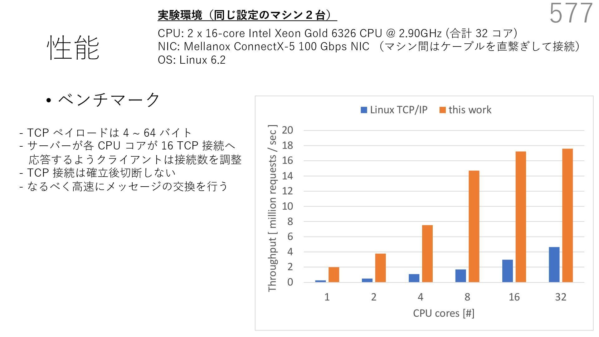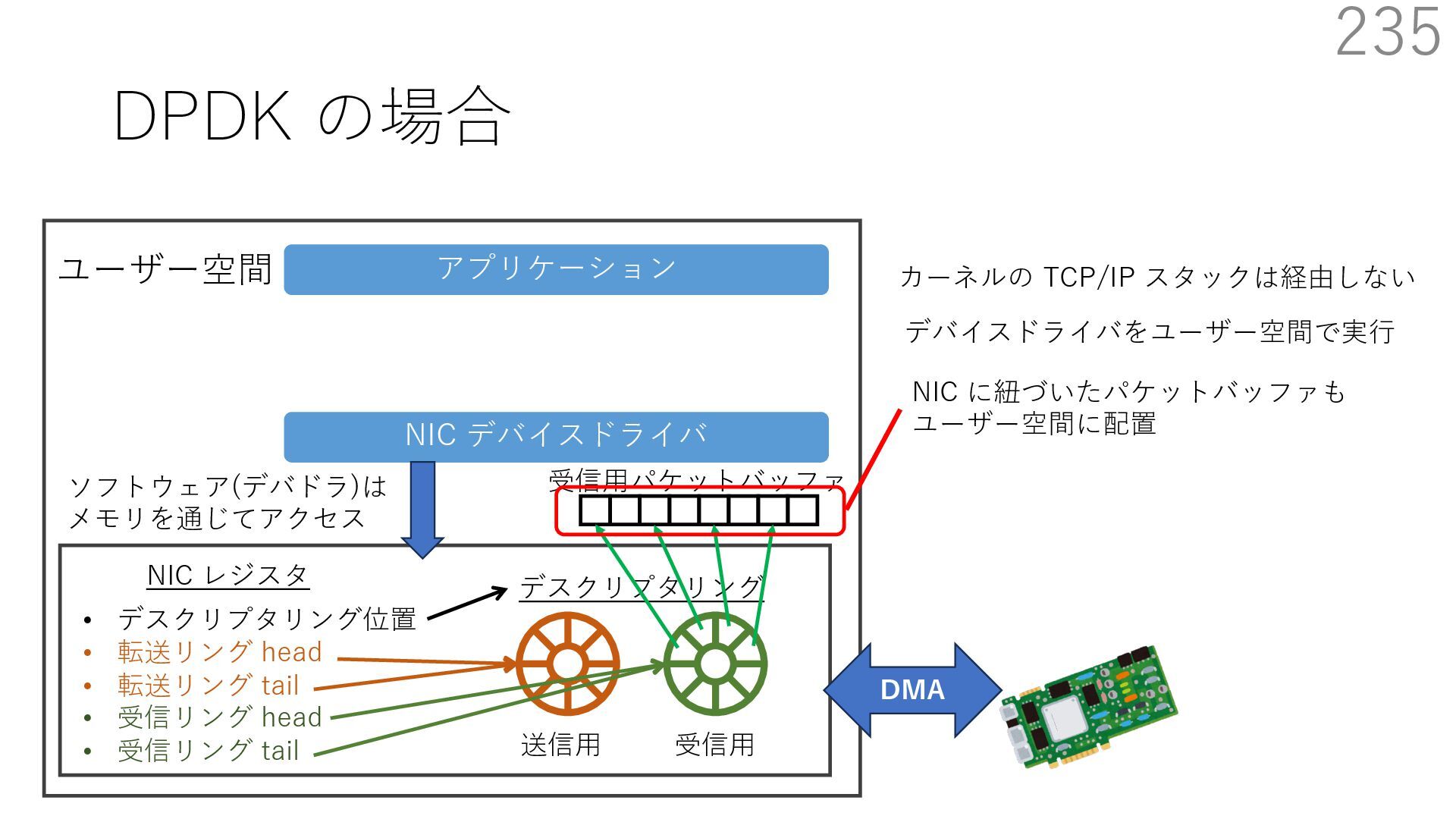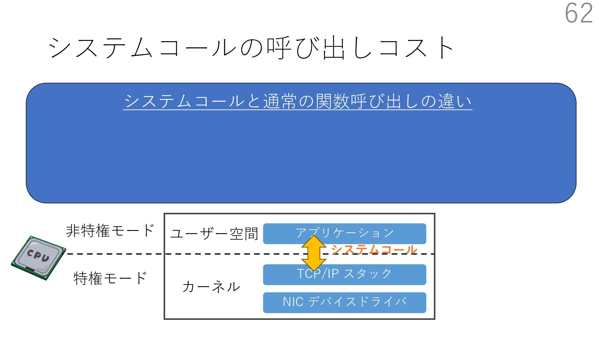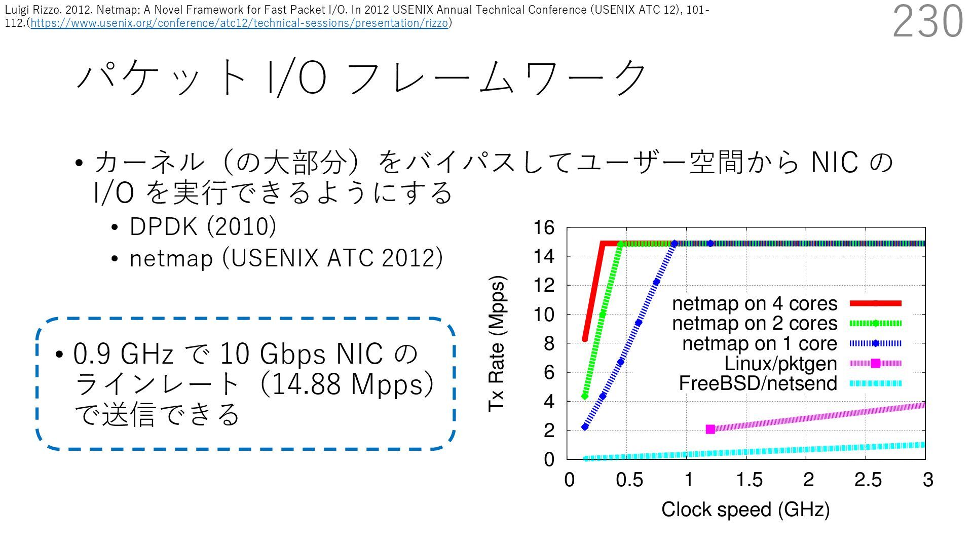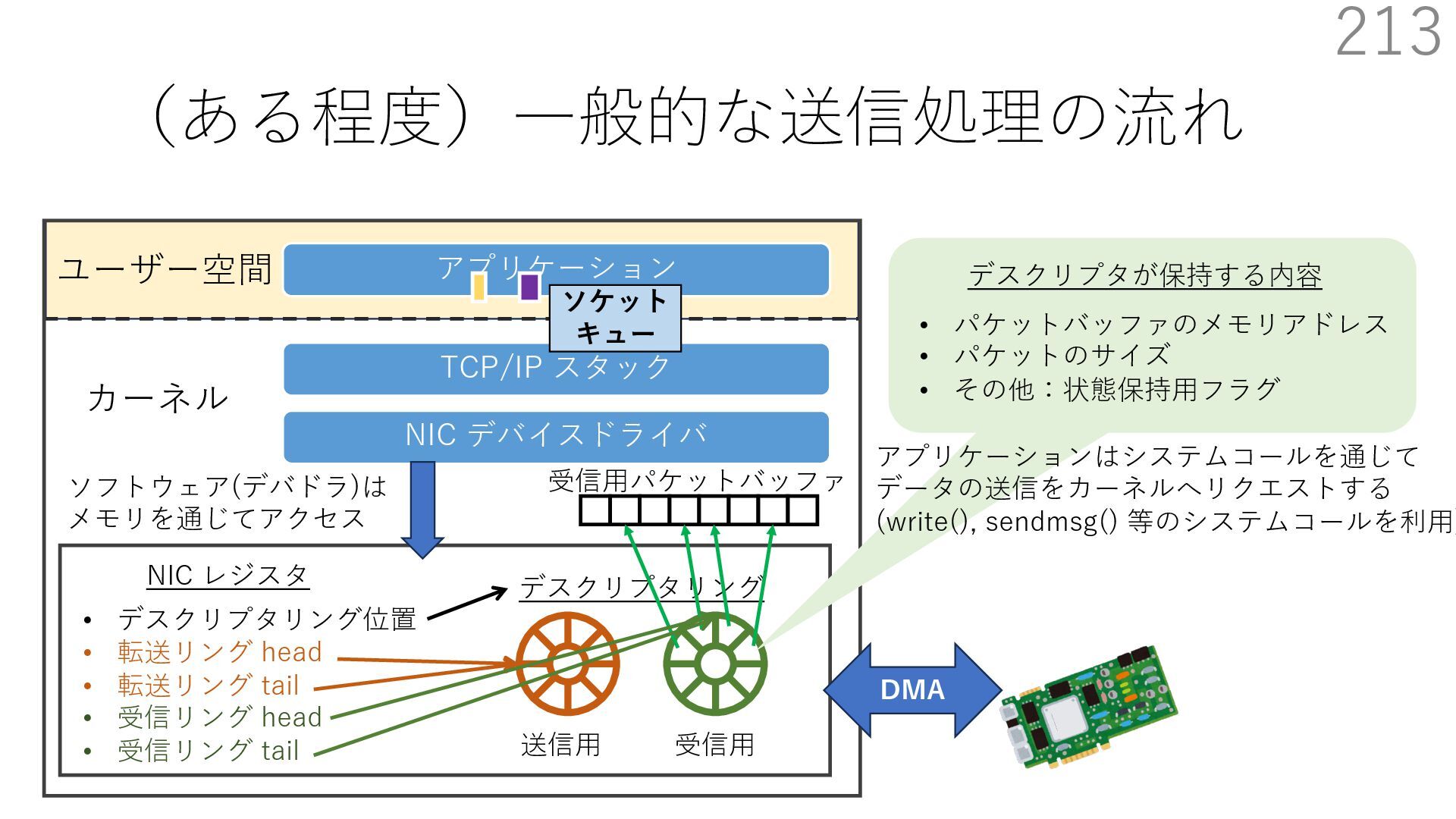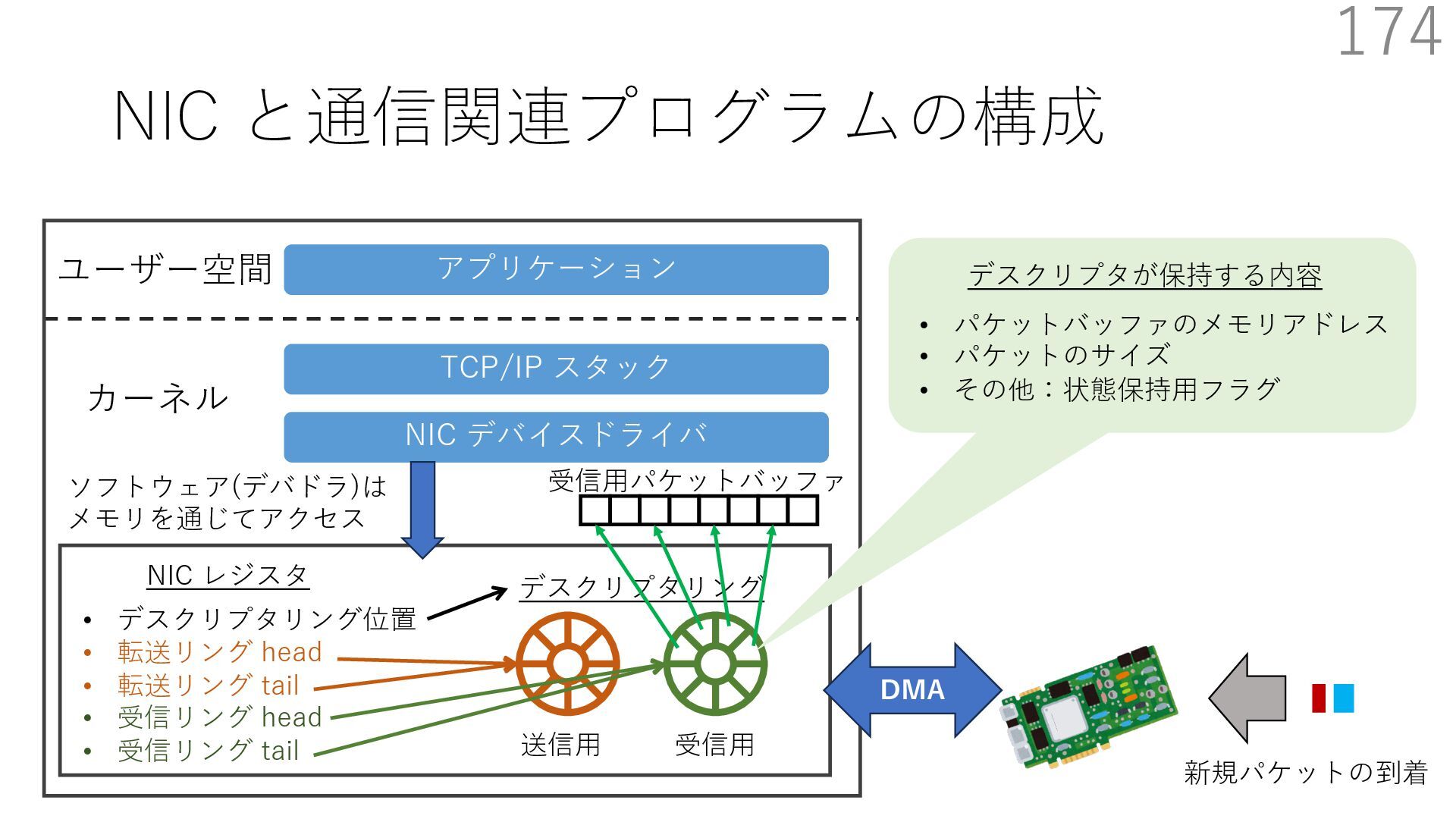(SIGCOMM 2014) • mTCP (NSDI 2014) • Arrakis (OSDI 2014) • IX (OSDI 2014) • StackMap (USENIX ATC 2016) • Atlas (SIGCOMM 2017) • ZygOS (SOSP 2017) • Shenango (NSDI 2019) • Shinjuku (NSDI 2019) • TAS (EuroSys 2019) • Caladan (OSDI 2020) • Demikernel (SOSP 2021) 427 into a single library for both devices (e.g., RDMAxSPDK). We implemented the bulk of our library OS code in Rust. We initially prototyped several libOSes in C++; however, we found that Rust performs competitively with C++ and achieves ns-scale latencies while offering additional benefits. First, Rust enforces memory safety through language fea- tures and its compiler. Though our libOSes use unsafe code to bind to C/C++ kernel-bypass libraries and applications, User-space Software Kernel-space Software I/O Hardware I/O Device ??? libFuture ??? DPDK User I/O Buf. Mgmt libRDMA RDMA User I/O Buf. Mgmt Net. Trans. OS Kernel Control Path Demikernel Datapath Architecture App libPOSIX libDPDK SPDK User I/O Buf. Mgmt libSPDK Future Demikernel PDPIX Datapath API Figure 3. Demikernel kernel-bypass architecture. Demikernel ac- commodates heterogenous kernel-bypass devices, including poten- tial future hardware, with a flexible library OS-based datapath ar- chitecture.We include a libOS that goes through the OS kernel for 提案:異なるタイプのデバイスへ 共通のインターフェースからアクセス可能にする Irene Zhang, Amanda Raybuck, Pratyush Patel, Kirk Olynyk, Jacob Nelson, Omar S. Navarro Leija, Ashlie Martinez, Jing Liu, Anna Kornfeld Simpson, Sujay Jayakar, Pedro Henrique Penna, Max Demoulin, Piali Choudhury, and Anirudh Badam. 2021. The Demikernel Datapath OS Architecture for Microsecond-Scale Datacenter Systems. In Proceedings of the ACM Sigops 28th Symposium on Operating Systems Principles (SOSP ʼ21), 195-211.(https://doi.org/10.1145/3477132.3483569)