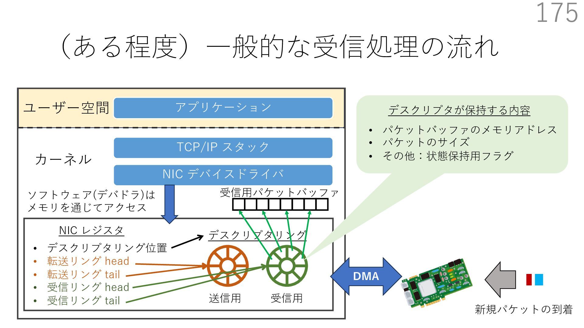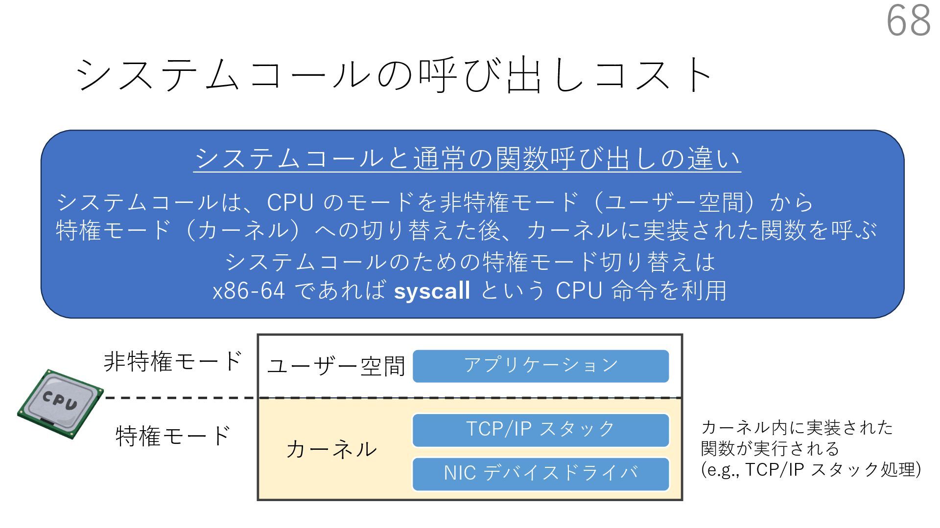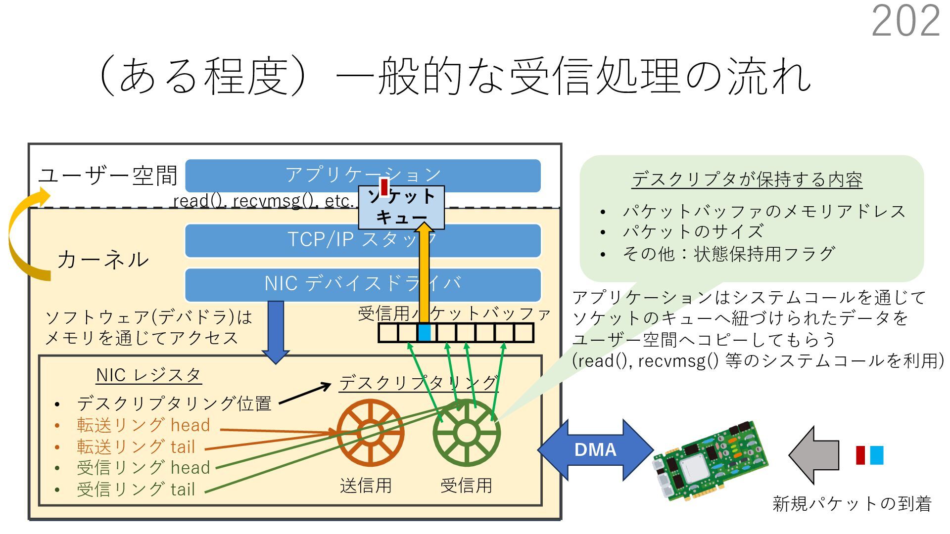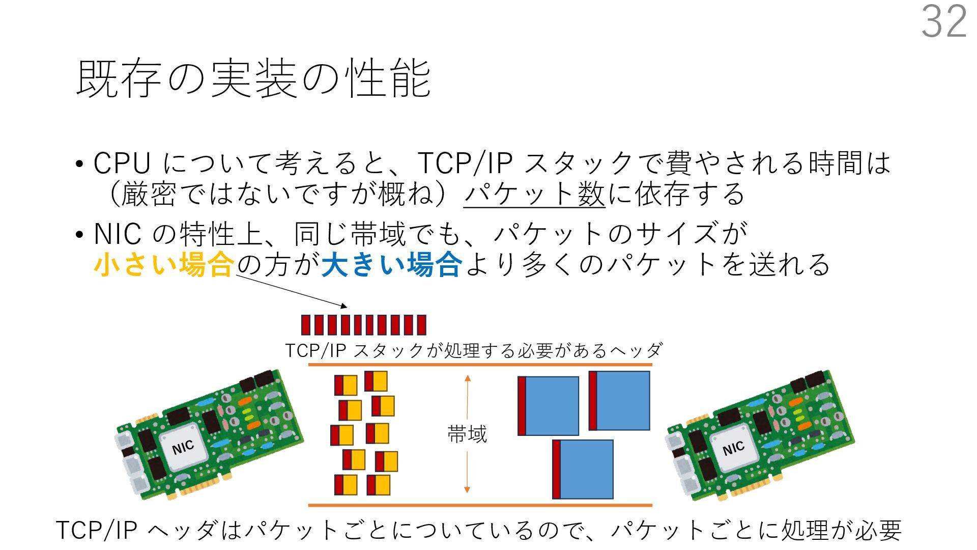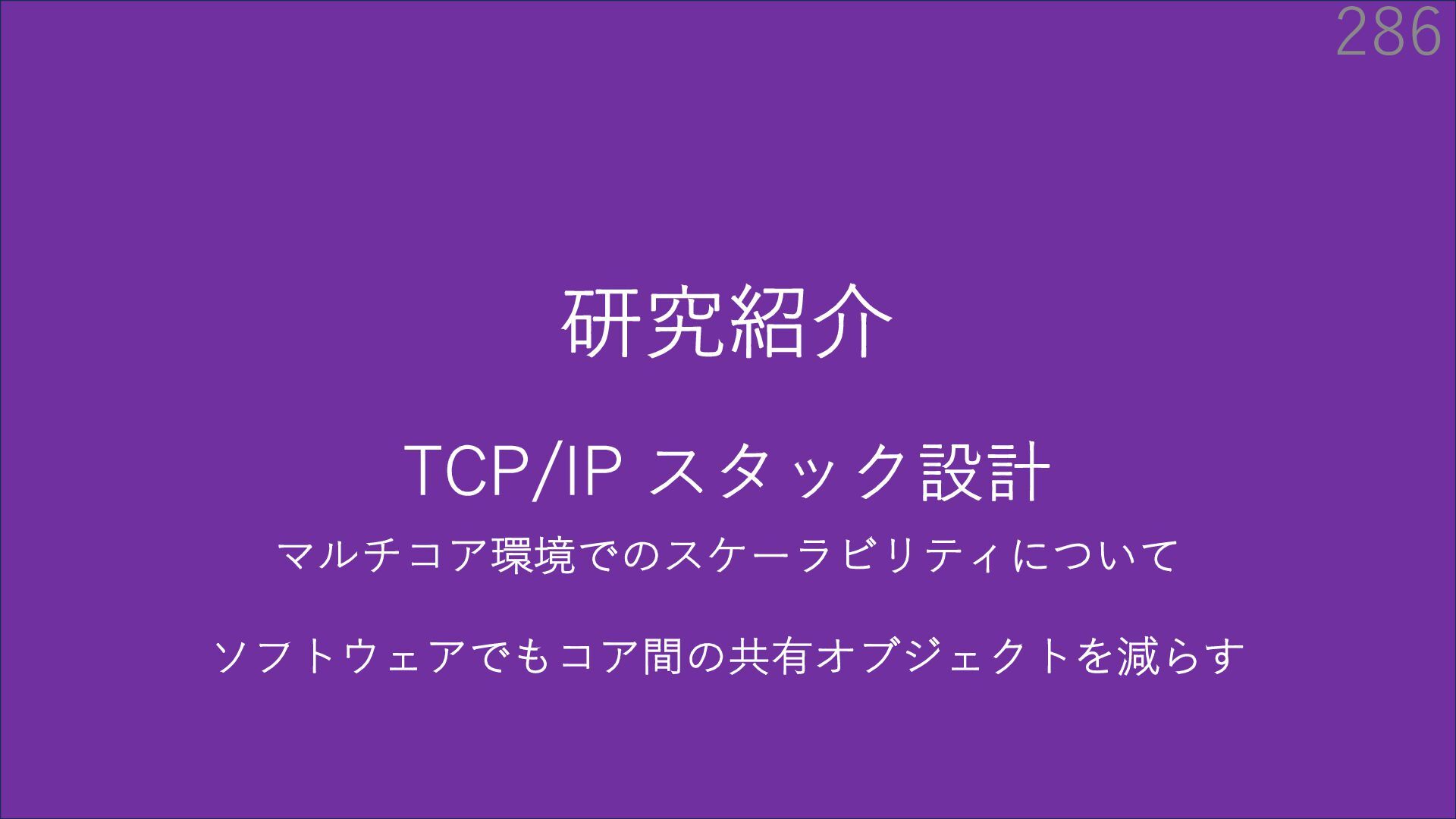 (SIGCOMM 2014) • mTCP (NSDI 2014) • Arrakis (OSDI 2014) • IX (OSDI 2014) • StackMap (USENIX ATC 2016) • Atlas (SIGCOMM 2017) • ZygOS (SOSP 2017) • Shenango (NSDI 2019) • Shinjuku (NSDI 2019) • TAS (EuroSys 2019) • Caladan (OSDI 2020) • Demikernel (SOSP 2021) 427 into a single library for both devices (e.g., RDMAxSPDK). We implemented the bulk of our library OS code in Rust. We initially prototyped several libOSes in C++; however, we found that Rust performs competitively with C++ and achieves ns-scale latencies while offering additional benefits. First, Rust enforces memory safety through language fea- tures and its compiler. Though our libOSes use unsafe code to bind to C/C++ kernel-bypass libraries and applications, User-space Software Kernel-space Software I/O Hardware I/O Device ??? libFuture ??? DPDK User I/O Buf. Mgmt libRDMA RDMA User I/O Buf. Mgmt Net. Trans. OS Kernel Control Path Demikernel Datapath Architecture App libPOSIX libDPDK SPDK User I/O Buf. Mgmt libSPDK Future Demikernel PDPIX Datapath API Figure 3. Demikernel kernel-bypass architecture. Demikernel ac- commodates heterogenous kernel-bypass devices, including poten- tial future hardware, with a flexible library OS-based datapath ar- chitecture.We include a libOS that goes through the OS kernel for 提案:異なるタイプのデバイスへ 共通のインターフェースからアクセス可能にする Irene Zhang, Amanda Raybuck, Pratyush Patel, Kirk Olynyk, Jacob Nelson, Omar S. Navarro Leija, Ashlie Martinez, Jing Liu, Anna Kornfeld Simpson, Sujay Jayakar, Pedro Henrique Penna, Max Demoulin, Piali Choudhury, and Anirudh Badam. 2021. The Demikernel Datapath OS Architecture for Microsecond-Scale Datacenter Systems. In Proceedings of the ACM Sigops 28th Symposium on Operating Systems Principles (SOSP ʼ21), 195-211.(https://doi.org/10.1145/3477132.3483569)