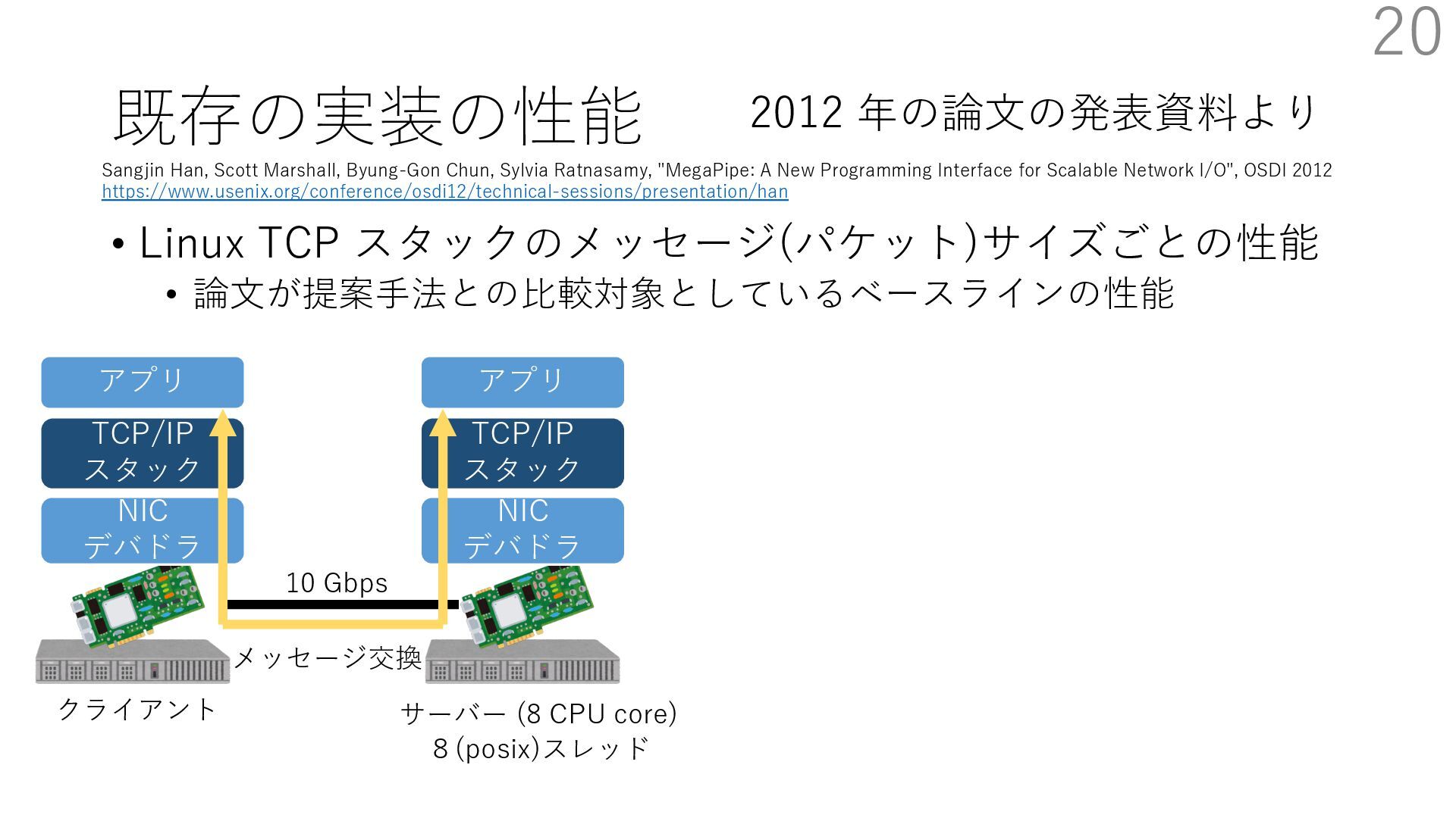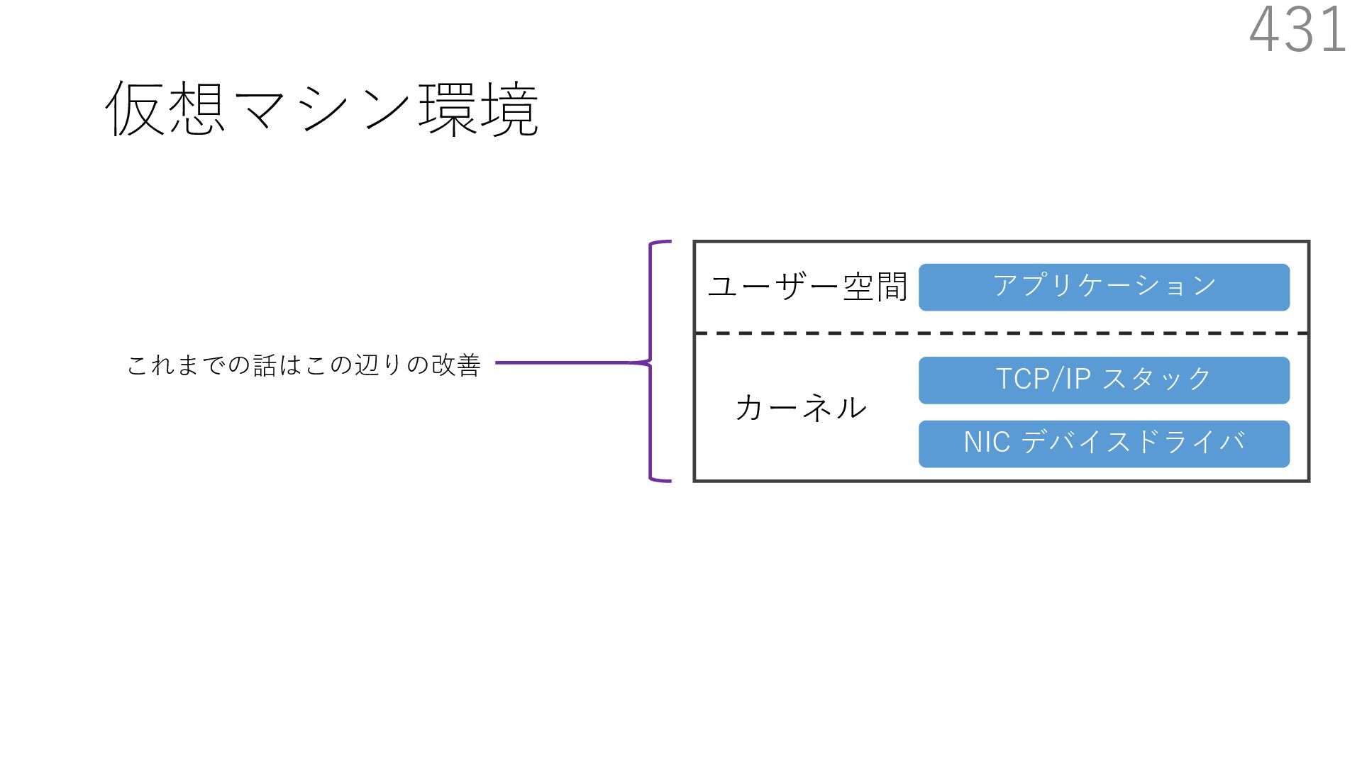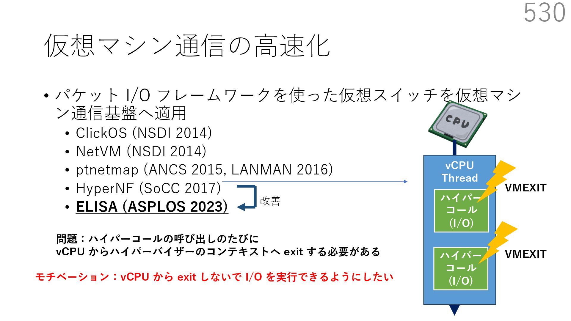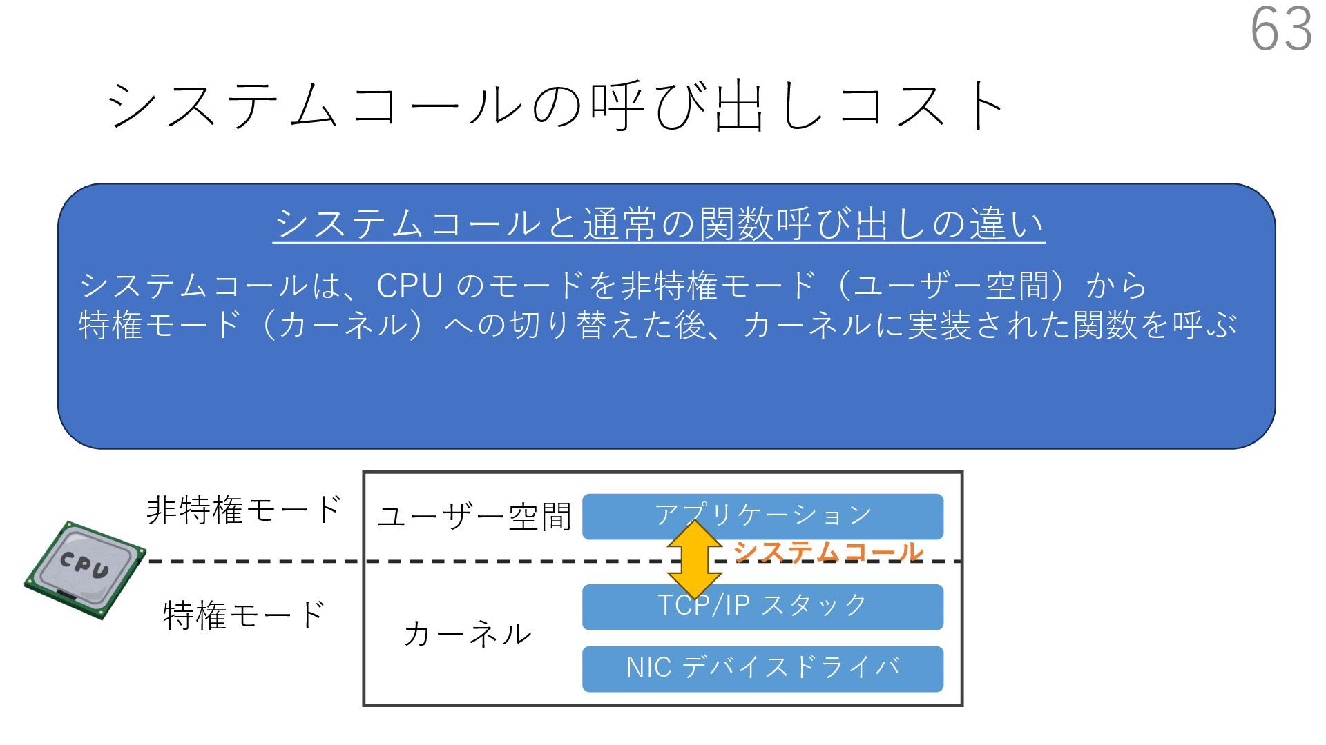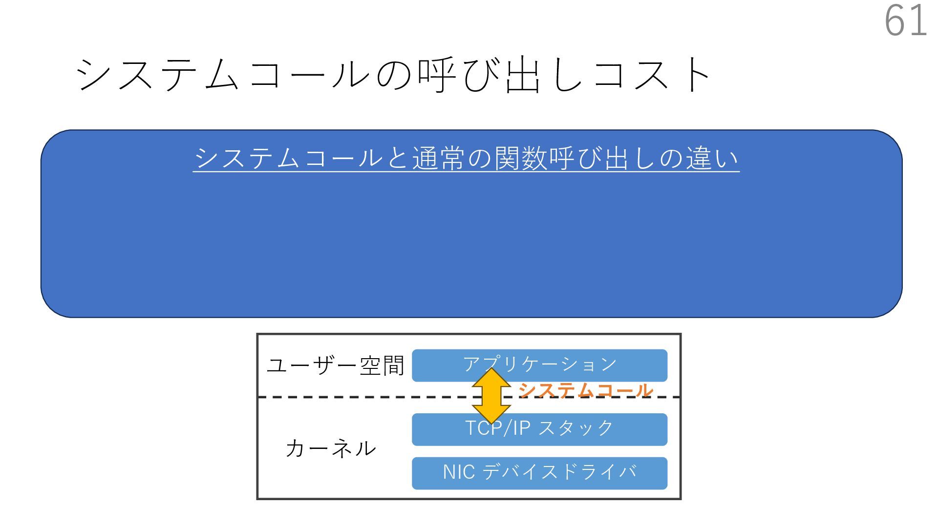 (SIGCOMM 2014) • mTCP (NSDI 2014) • Arrakis (OSDI 2014) • IX (OSDI 2014) • StackMap (USENIX ATC 2016) • Atlas (SIGCOMM 2017) • ZygOS (SOSP 2017) • Shenango (NSDI 2019) • Shinjuku (NSDI 2019) • TAS (EuroSys 2019) • Caladan (OSDI 2020) • Demikernel (SOSP 2021) 427 into a single library for both devices (e.g., RDMAxSPDK). We implemented the bulk of our library OS code in Rust. We initially prototyped several libOSes in C++; however, we found that Rust performs competitively with C++ and achieves ns-scale latencies while offering additional benefits. First, Rust enforces memory safety through language fea- tures and its compiler. Though our libOSes use unsafe code to bind to C/C++ kernel-bypass libraries and applications, User-space Software Kernel-space Software I/O Hardware I/O Device ??? libFuture ??? DPDK User I/O Buf. Mgmt libRDMA RDMA User I/O Buf. Mgmt Net. Trans. OS Kernel Control Path Demikernel Datapath Architecture App libPOSIX libDPDK SPDK User I/O Buf. Mgmt libSPDK Future Demikernel PDPIX Datapath API Figure 3. Demikernel kernel-bypass architecture. Demikernel ac- commodates heterogenous kernel-bypass devices, including poten- tial future hardware, with a flexible library OS-based datapath ar- chitecture.We include a libOS that goes through the OS kernel for 提案:異なるタイプのデバイスへ 共通のインターフェースからアクセス可能にする Irene Zhang, Amanda Raybuck, Pratyush Patel, Kirk Olynyk, Jacob Nelson, Omar S. Navarro Leija, Ashlie Martinez, Jing Liu, Anna Kornfeld Simpson, Sujay Jayakar, Pedro Henrique Penna, Max Demoulin, Piali Choudhury, and Anirudh Badam. 2021. The Demikernel Datapath OS Architecture for Microsecond-Scale Datacenter Systems. In Proceedings of the ACM Sigops 28th Symposium on Operating Systems Principles (SOSP ʼ21), 195-211.(https://doi.org/10.1145/3477132.3483569)