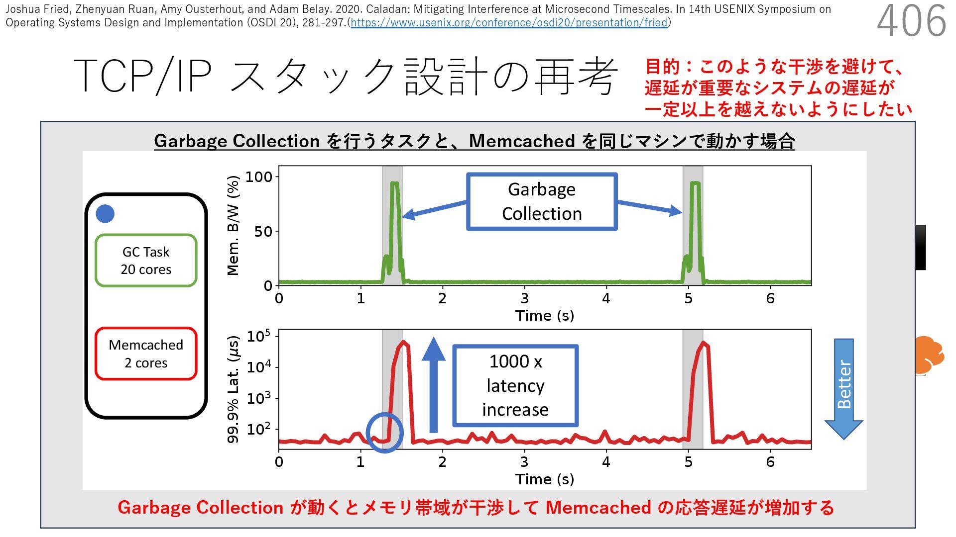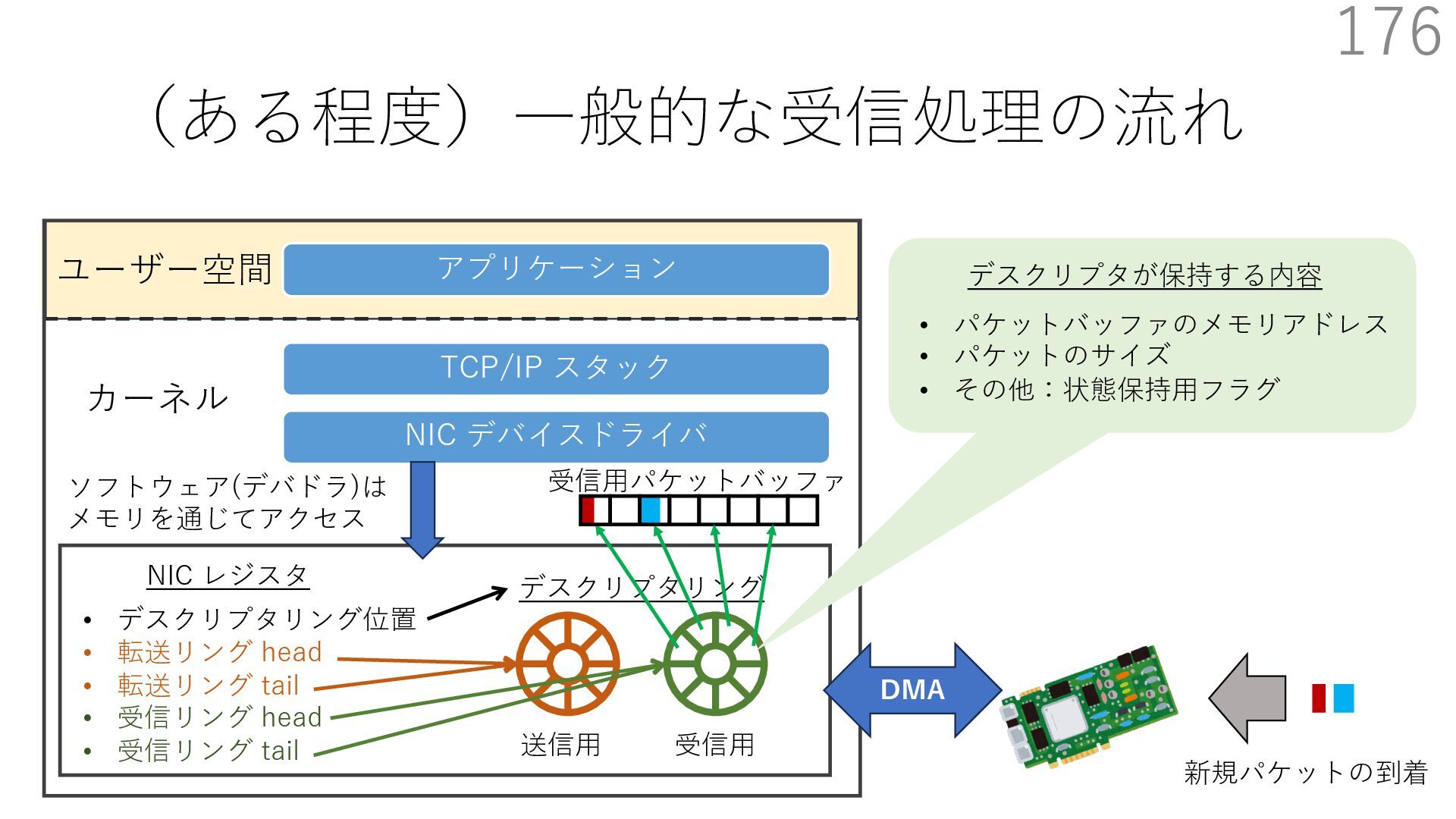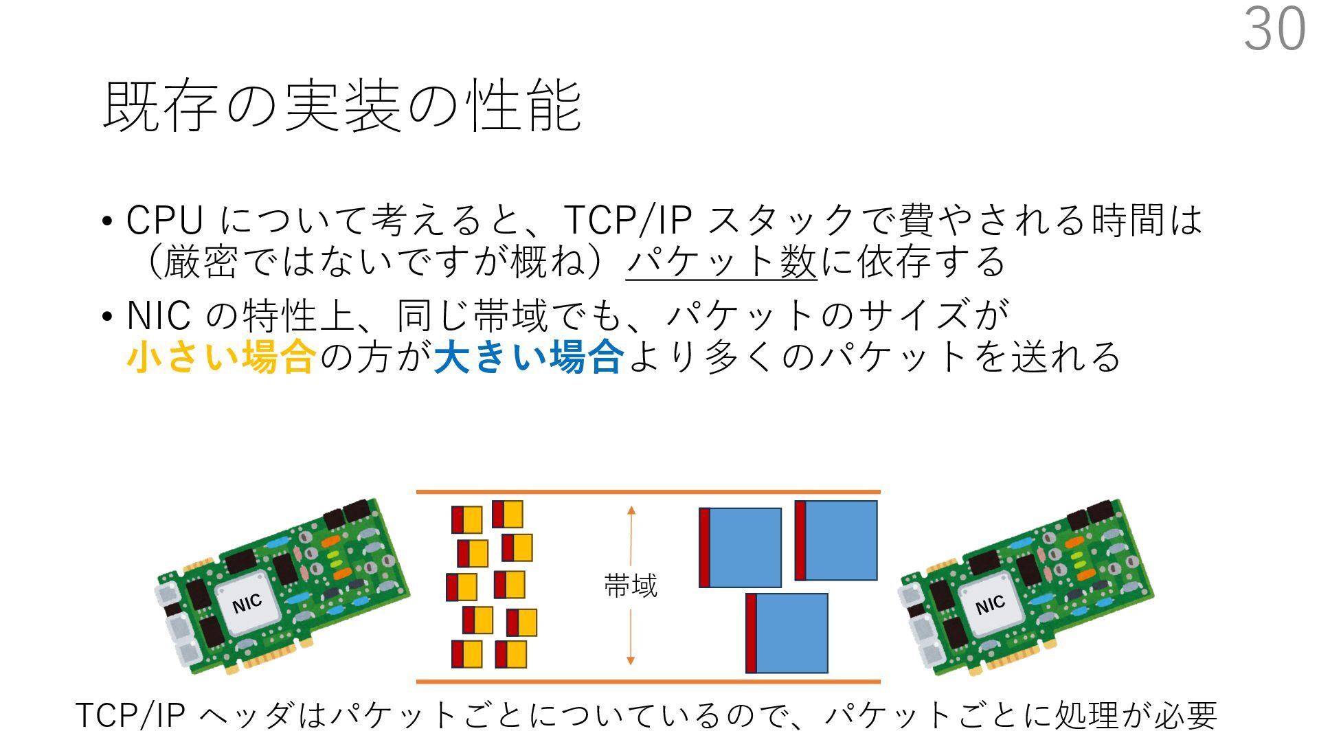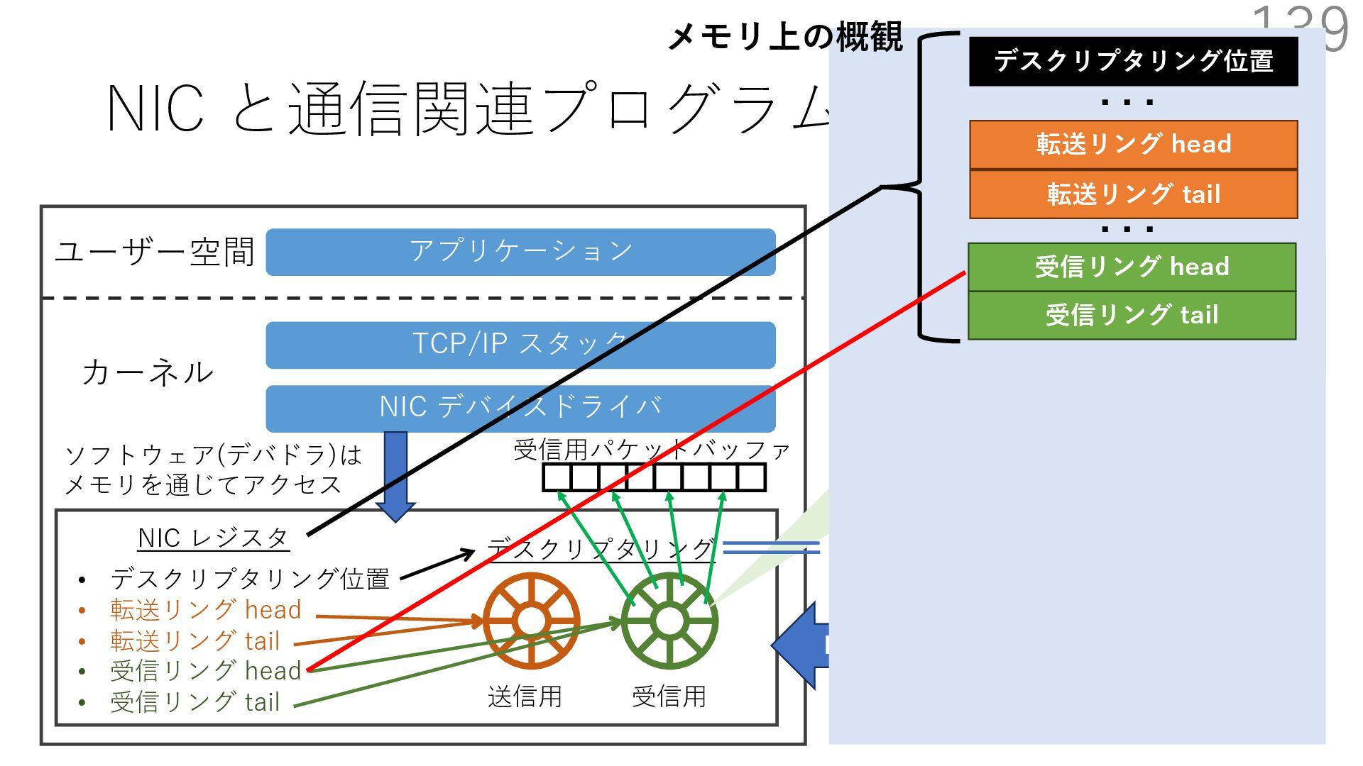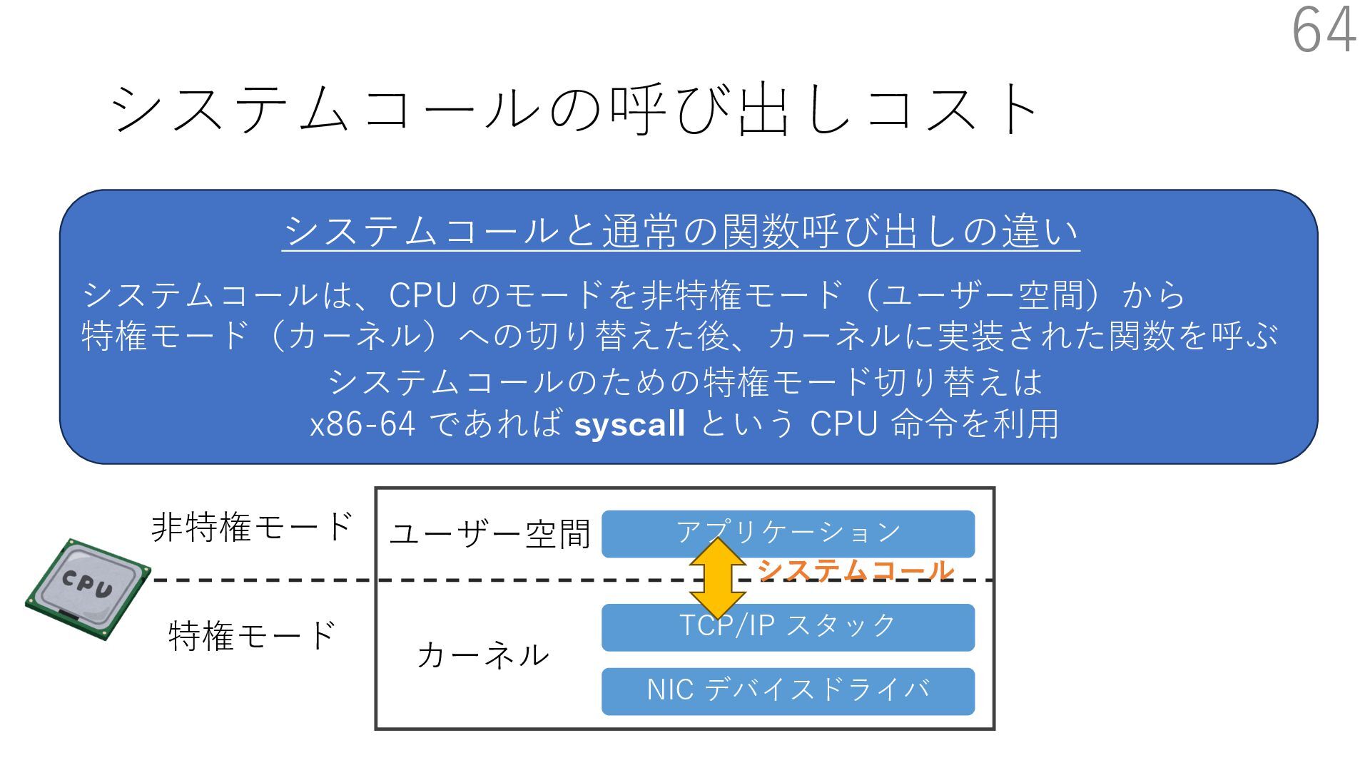 (SIGCOMM 2014) • mTCP (NSDI 2014) • Arrakis (OSDI 2014) • IX (OSDI 2014) • StackMap (USENIX ATC 2016) • Atlas (SIGCOMM 2017) • ZygOS (SOSP 2017) • Shenango (NSDI 2019) • Shinjuku (NSDI 2019) • TAS (EuroSys 2019) • Caladan (OSDI 2020) • Demikernel (SOSP 2021) 427 into a single library for both devices (e.g., RDMAxSPDK). We implemented the bulk of our library OS code in Rust. We initially prototyped several libOSes in C++; however, we found that Rust performs competitively with C++ and achieves ns-scale latencies while offering additional benefits. First, Rust enforces memory safety through language fea- tures and its compiler. Though our libOSes use unsafe code to bind to C/C++ kernel-bypass libraries and applications, User-space Software Kernel-space Software I/O Hardware I/O Device ??? libFuture ??? DPDK User I/O Buf. Mgmt libRDMA RDMA User I/O Buf. Mgmt Net. Trans. OS Kernel Control Path Demikernel Datapath Architecture App libPOSIX libDPDK SPDK User I/O Buf. Mgmt libSPDK Future Demikernel PDPIX Datapath API Figure 3. Demikernel kernel-bypass architecture. Demikernel ac- commodates heterogenous kernel-bypass devices, including poten- tial future hardware, with a flexible library OS-based datapath ar- chitecture.We include a libOS that goes through the OS kernel for 提案:異なるタイプのデバイスへ 共通のインターフェースからアクセス可能にする Irene Zhang, Amanda Raybuck, Pratyush Patel, Kirk Olynyk, Jacob Nelson, Omar S. Navarro Leija, Ashlie Martinez, Jing Liu, Anna Kornfeld Simpson, Sujay Jayakar, Pedro Henrique Penna, Max Demoulin, Piali Choudhury, and Anirudh Badam. 2021. The Demikernel Datapath OS Architecture for Microsecond-Scale Datacenter Systems. In Proceedings of the ACM Sigops 28th Symposium on Operating Systems Principles (SOSP ʼ21), 195-211.(https://doi.org/10.1145/3477132.3483569)