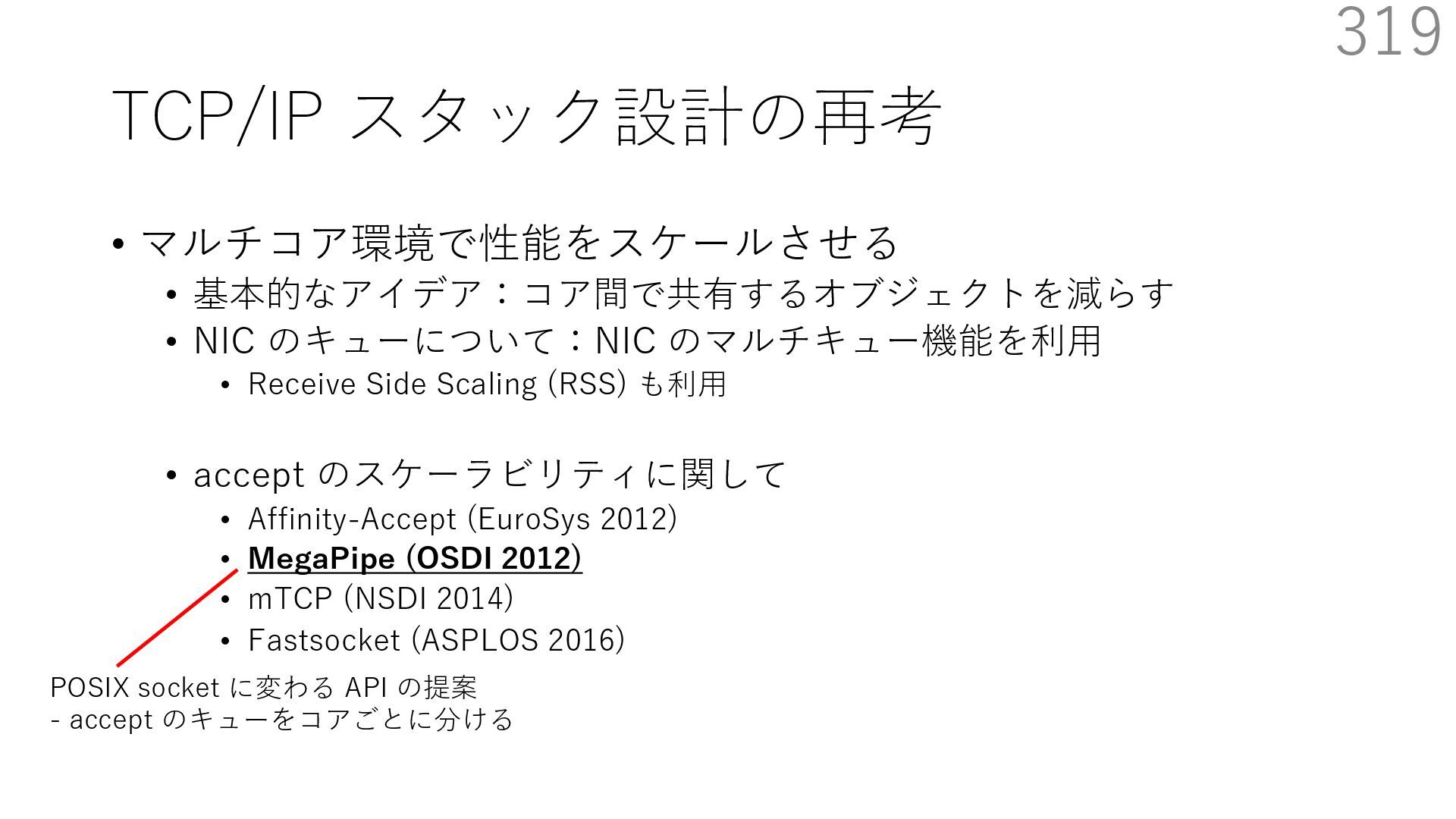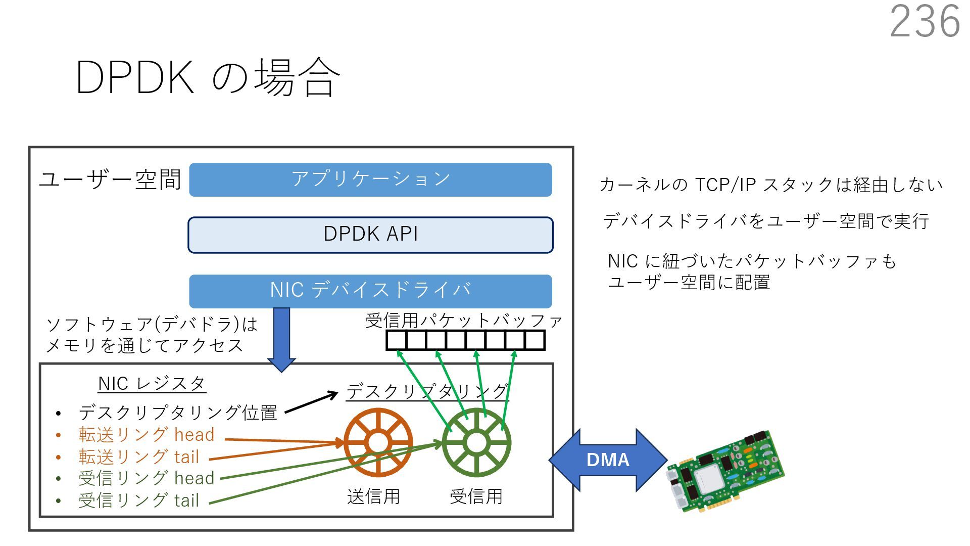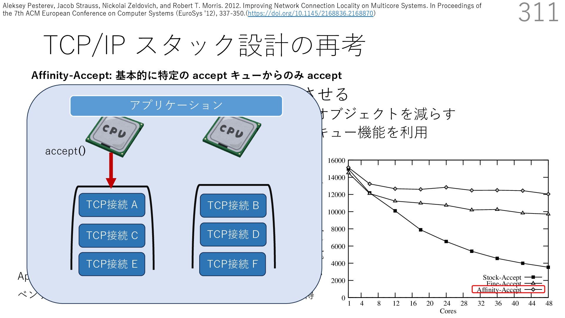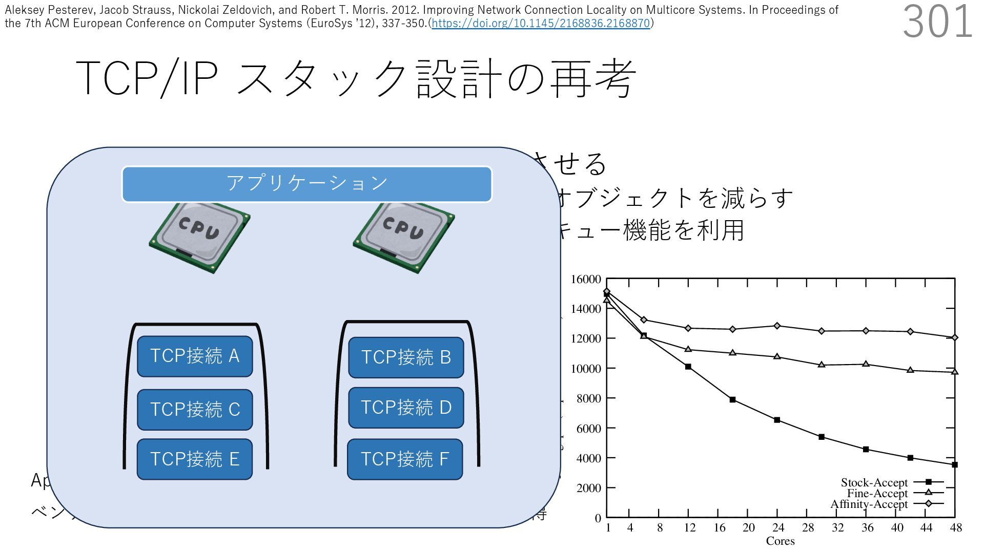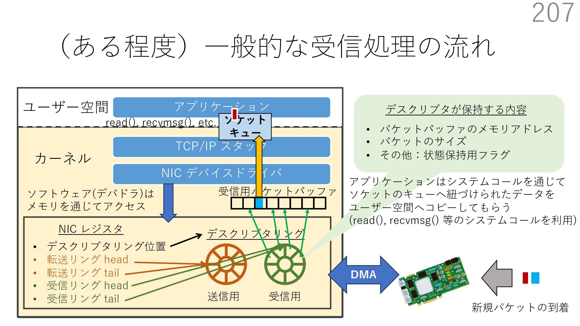 (SIGCOMM 2014) • mTCP (NSDI 2014) • Arrakis (OSDI 2014) • IX (OSDI 2014) • StackMap (USENIX ATC 2016) • Atlas (SIGCOMM 2017) • ZygOS (SOSP 2017) • Shenango (NSDI 2019) • Shinjuku (NSDI 2019) • TAS (EuroSys 2019) • Caladan (OSDI 2020) • Demikernel (SOSP 2021) 427 into a single library for both devices (e.g., RDMAxSPDK). We implemented the bulk of our library OS code in Rust. We initially prototyped several libOSes in C++; however, we found that Rust performs competitively with C++ and achieves ns-scale latencies while offering additional benefits. First, Rust enforces memory safety through language fea- tures and its compiler. Though our libOSes use unsafe code to bind to C/C++ kernel-bypass libraries and applications, User-space Software Kernel-space Software I/O Hardware I/O Device ??? libFuture ??? DPDK User I/O Buf. Mgmt libRDMA RDMA User I/O Buf. Mgmt Net. Trans. OS Kernel Control Path Demikernel Datapath Architecture App libPOSIX libDPDK SPDK User I/O Buf. Mgmt libSPDK Future Demikernel PDPIX Datapath API Figure 3. Demikernel kernel-bypass architecture. Demikernel ac- commodates heterogenous kernel-bypass devices, including poten- tial future hardware, with a flexible library OS-based datapath ar- chitecture.We include a libOS that goes through the OS kernel for 提案:異なるタイプのデバイスへ 共通のインターフェースからアクセス可能にする Irene Zhang, Amanda Raybuck, Pratyush Patel, Kirk Olynyk, Jacob Nelson, Omar S. Navarro Leija, Ashlie Martinez, Jing Liu, Anna Kornfeld Simpson, Sujay Jayakar, Pedro Henrique Penna, Max Demoulin, Piali Choudhury, and Anirudh Badam. 2021. The Demikernel Datapath OS Architecture for Microsecond-Scale Datacenter Systems. In Proceedings of the ACM Sigops 28th Symposium on Operating Systems Principles (SOSP ʼ21), 195-211.(https://doi.org/10.1145/3477132.3483569)
