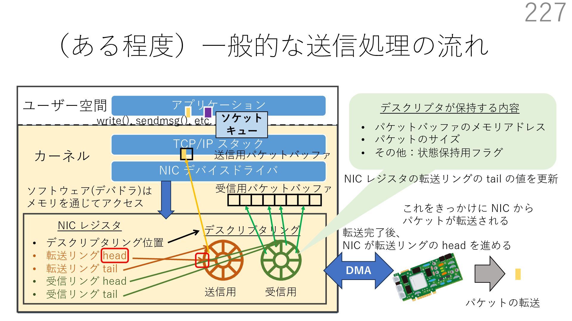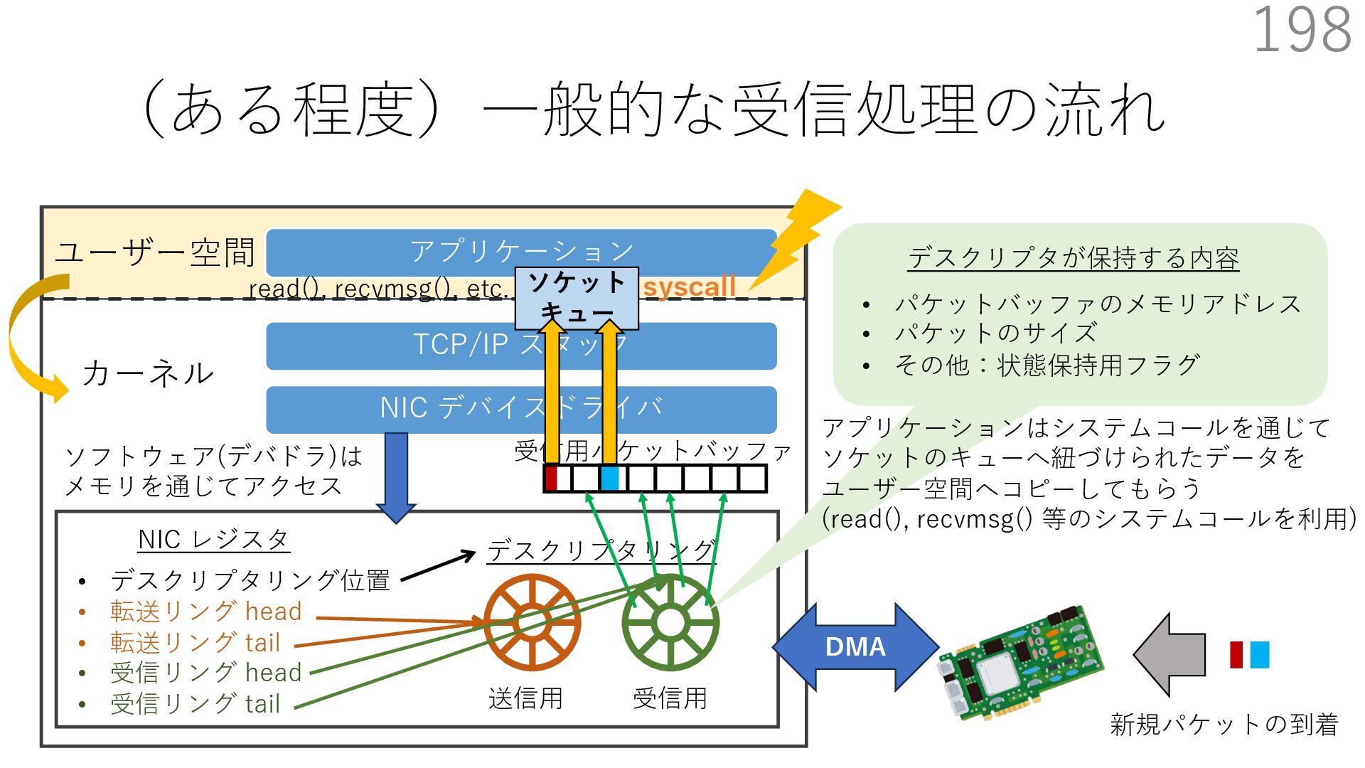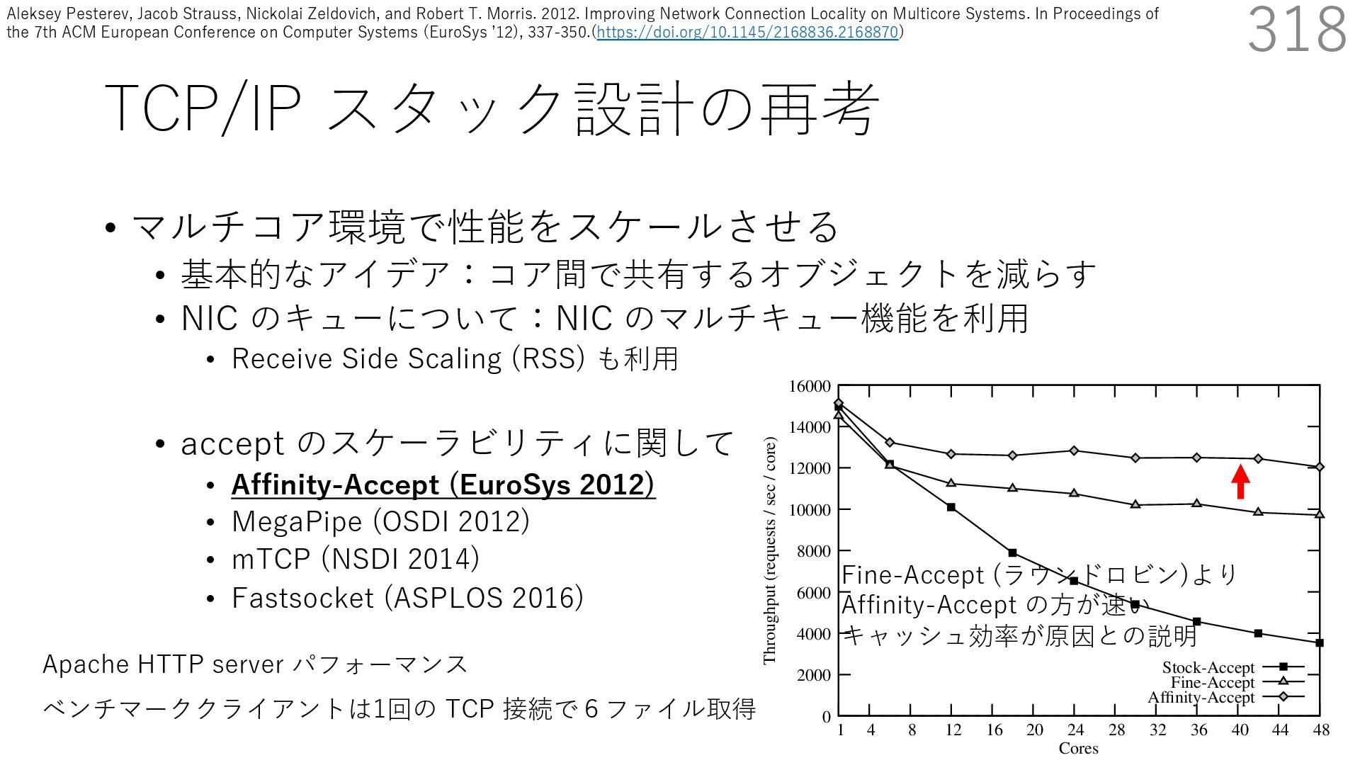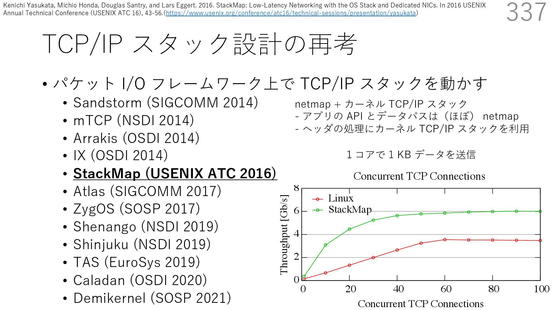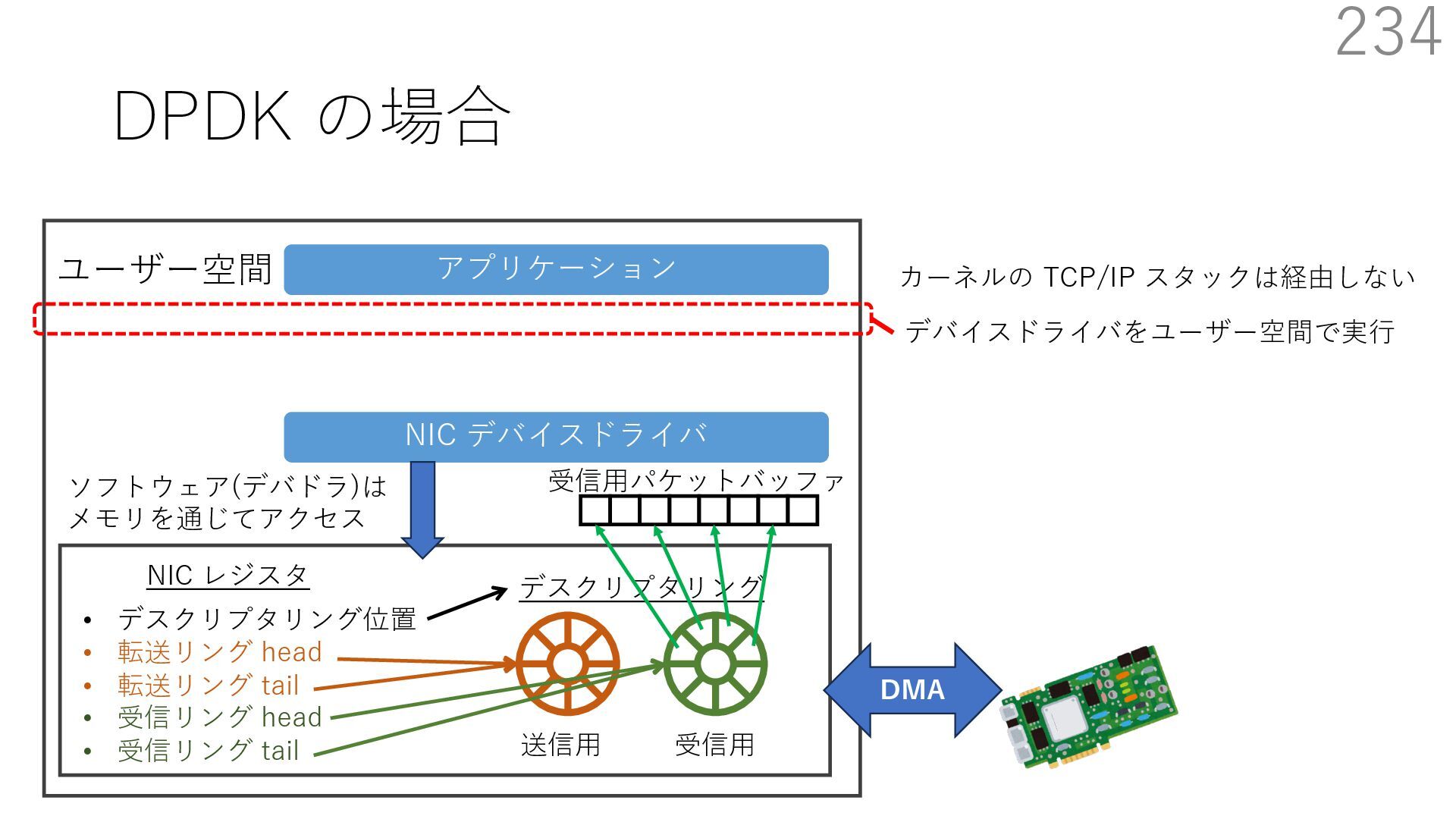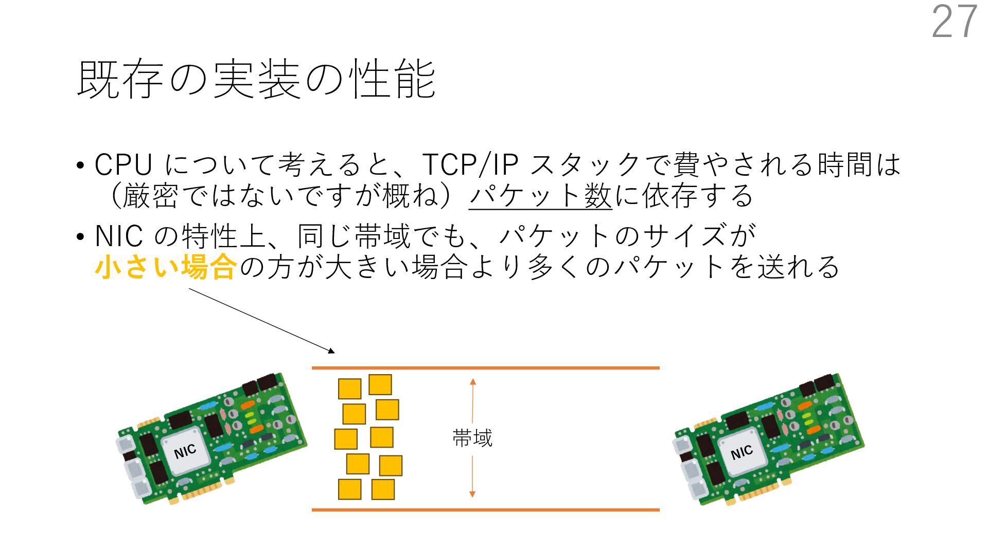 (SIGCOMM 2014) • mTCP (NSDI 2014) • Arrakis (OSDI 2014) • IX (OSDI 2014) • StackMap (USENIX ATC 2016) • Atlas (SIGCOMM 2017) • ZygOS (SOSP 2017) • Shenango (NSDI 2019) • Shinjuku (NSDI 2019) • TAS (EuroSys 2019) • Caladan (OSDI 2020) • Demikernel (SOSP 2021) 427 into a single library for both devices (e.g., RDMAxSPDK). We implemented the bulk of our library OS code in Rust. We initially prototyped several libOSes in C++; however, we found that Rust performs competitively with C++ and achieves ns-scale latencies while offering additional benefits. First, Rust enforces memory safety through language fea- tures and its compiler. Though our libOSes use unsafe code to bind to C/C++ kernel-bypass libraries and applications, User-space Software Kernel-space Software I/O Hardware I/O Device ??? libFuture ??? DPDK User I/O Buf. Mgmt libRDMA RDMA User I/O Buf. Mgmt Net. Trans. OS Kernel Control Path Demikernel Datapath Architecture App libPOSIX libDPDK SPDK User I/O Buf. Mgmt libSPDK Future Demikernel PDPIX Datapath API Figure 3. Demikernel kernel-bypass architecture. Demikernel ac- commodates heterogenous kernel-bypass devices, including poten- tial future hardware, with a flexible library OS-based datapath ar- chitecture.We include a libOS that goes through the OS kernel for 提案:異なるタイプのデバイスへ 共通のインターフェースからアクセス可能にする Irene Zhang, Amanda Raybuck, Pratyush Patel, Kirk Olynyk, Jacob Nelson, Omar S. Navarro Leija, Ashlie Martinez, Jing Liu, Anna Kornfeld Simpson, Sujay Jayakar, Pedro Henrique Penna, Max Demoulin, Piali Choudhury, and Anirudh Badam. 2021. The Demikernel Datapath OS Architecture for Microsecond-Scale Datacenter Systems. In Proceedings of the ACM Sigops 28th Symposium on Operating Systems Principles (SOSP ʼ21), 195-211.(https://doi.org/10.1145/3477132.3483569)