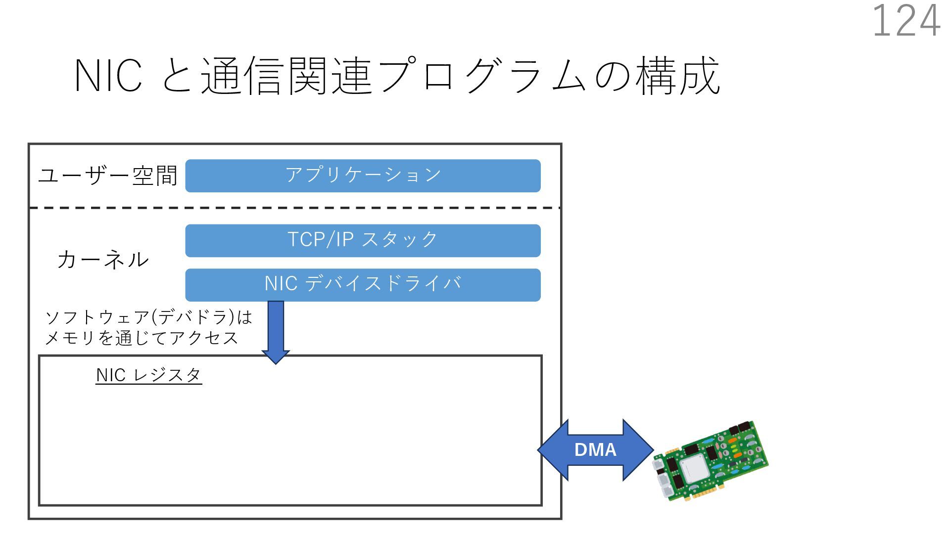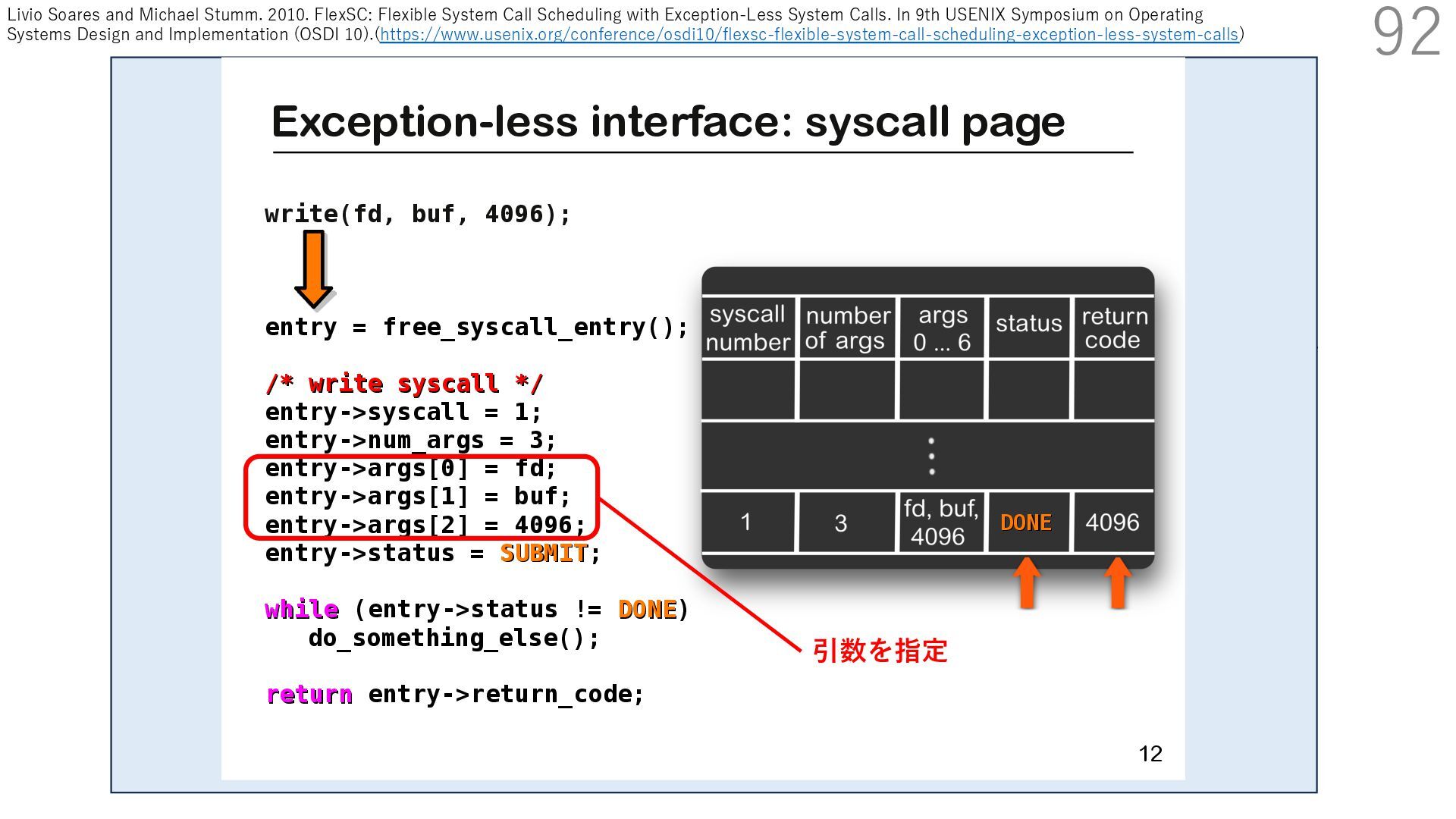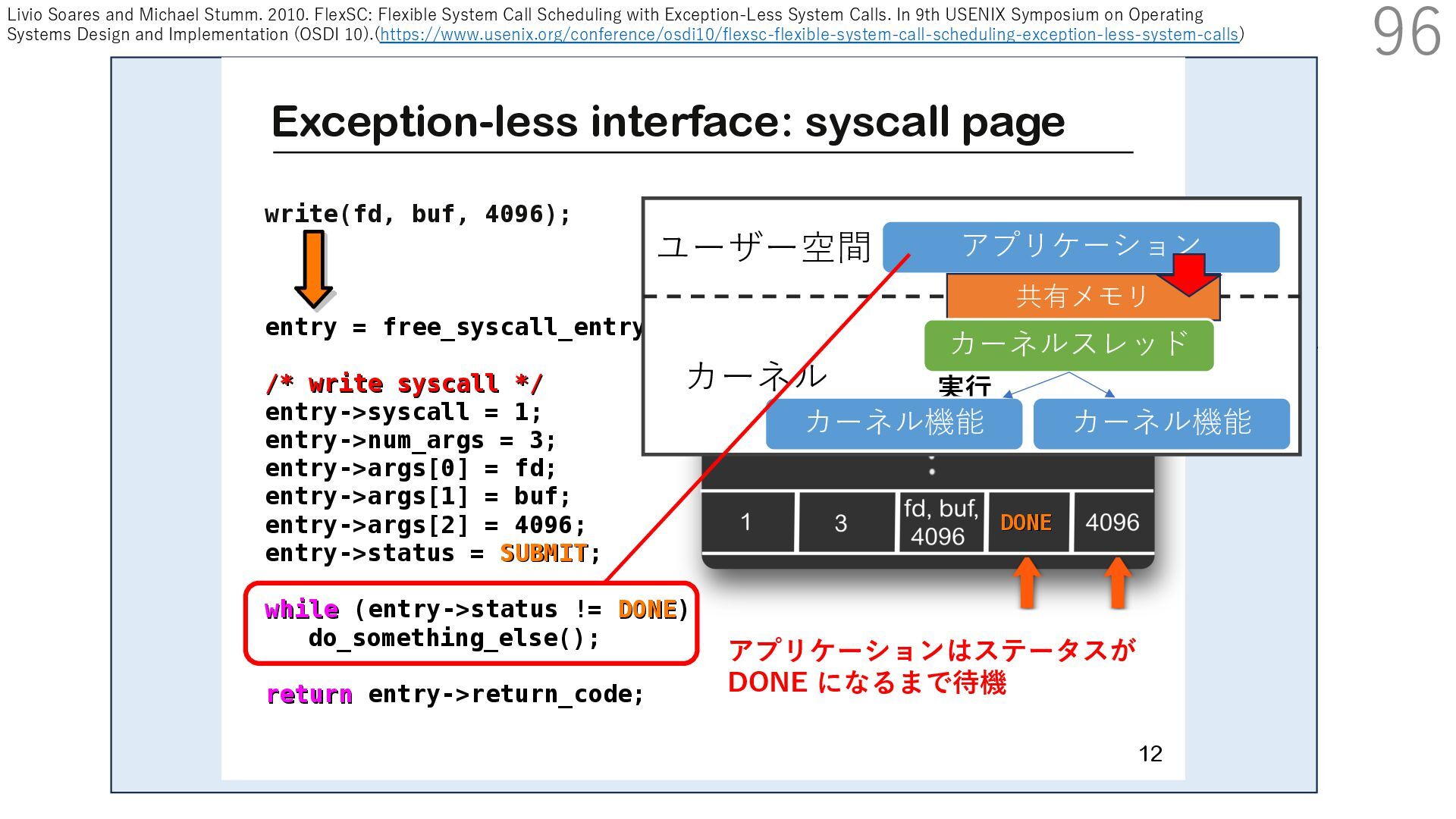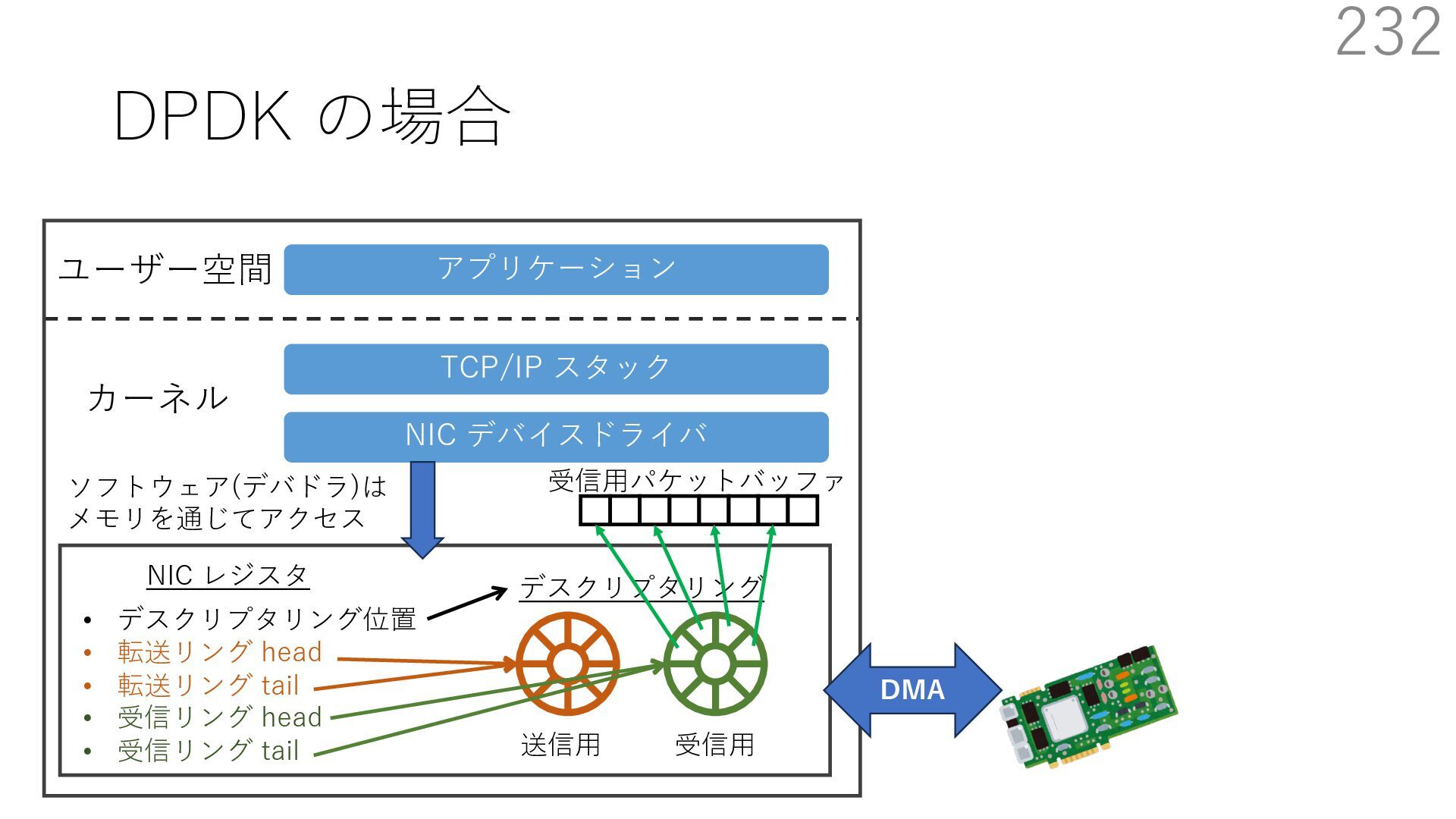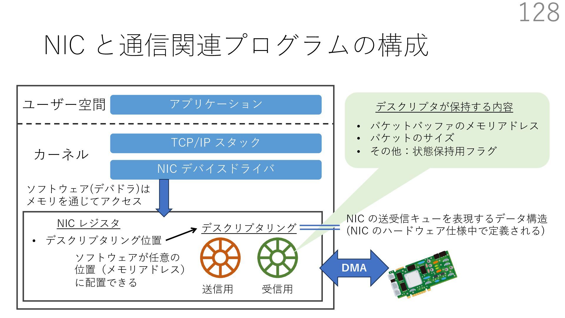 (SIGCOMM 2014) • mTCP (NSDI 2014) • Arrakis (OSDI 2014) • IX (OSDI 2014) • StackMap (USENIX ATC 2016) • Atlas (SIGCOMM 2017) • ZygOS (SOSP 2017) • Shenango (NSDI 2019) • Shinjuku (NSDI 2019) • TAS (EuroSys 2019) • Caladan (OSDI 2020) • Demikernel (SOSP 2021) 427 into a single library for both devices (e.g., RDMAxSPDK). We implemented the bulk of our library OS code in Rust. We initially prototyped several libOSes in C++; however, we found that Rust performs competitively with C++ and achieves ns-scale latencies while offering additional benefits. First, Rust enforces memory safety through language fea- tures and its compiler. Though our libOSes use unsafe code to bind to C/C++ kernel-bypass libraries and applications, User-space Software Kernel-space Software I/O Hardware I/O Device ??? libFuture ??? DPDK User I/O Buf. Mgmt libRDMA RDMA User I/O Buf. Mgmt Net. Trans. OS Kernel Control Path Demikernel Datapath Architecture App libPOSIX libDPDK SPDK User I/O Buf. Mgmt libSPDK Future Demikernel PDPIX Datapath API Figure 3. Demikernel kernel-bypass architecture. Demikernel ac- commodates heterogenous kernel-bypass devices, including poten- tial future hardware, with a flexible library OS-based datapath ar- chitecture.We include a libOS that goes through the OS kernel for 提案:異なるタイプのデバイスへ 共通のインターフェースからアクセス可能にする Irene Zhang, Amanda Raybuck, Pratyush Patel, Kirk Olynyk, Jacob Nelson, Omar S. Navarro Leija, Ashlie Martinez, Jing Liu, Anna Kornfeld Simpson, Sujay Jayakar, Pedro Henrique Penna, Max Demoulin, Piali Choudhury, and Anirudh Badam. 2021. The Demikernel Datapath OS Architecture for Microsecond-Scale Datacenter Systems. In Proceedings of the ACM Sigops 28th Symposium on Operating Systems Principles (SOSP ʼ21), 195-211.(https://doi.org/10.1145/3477132.3483569)