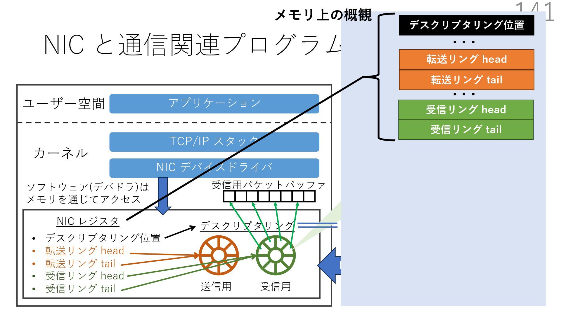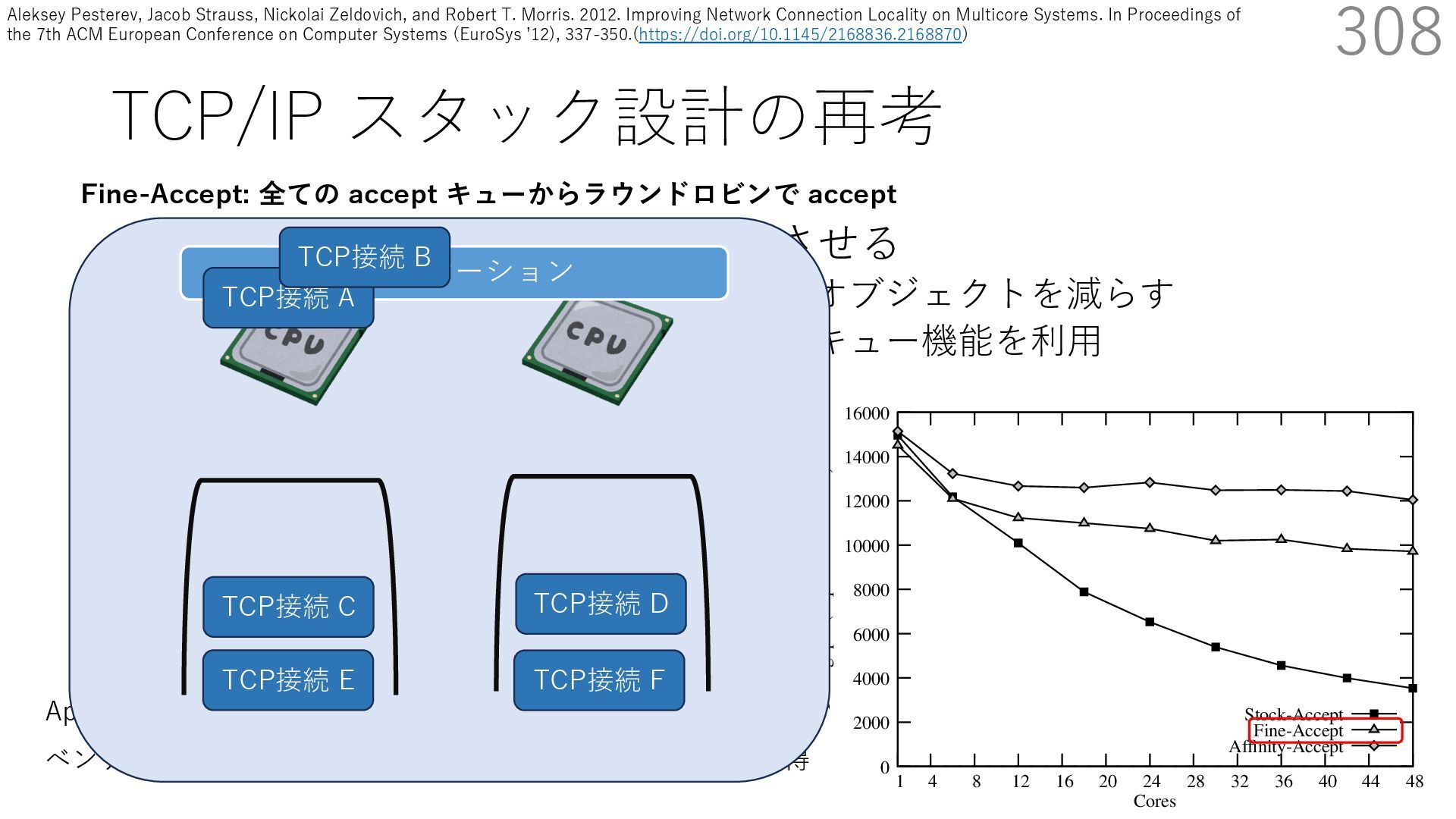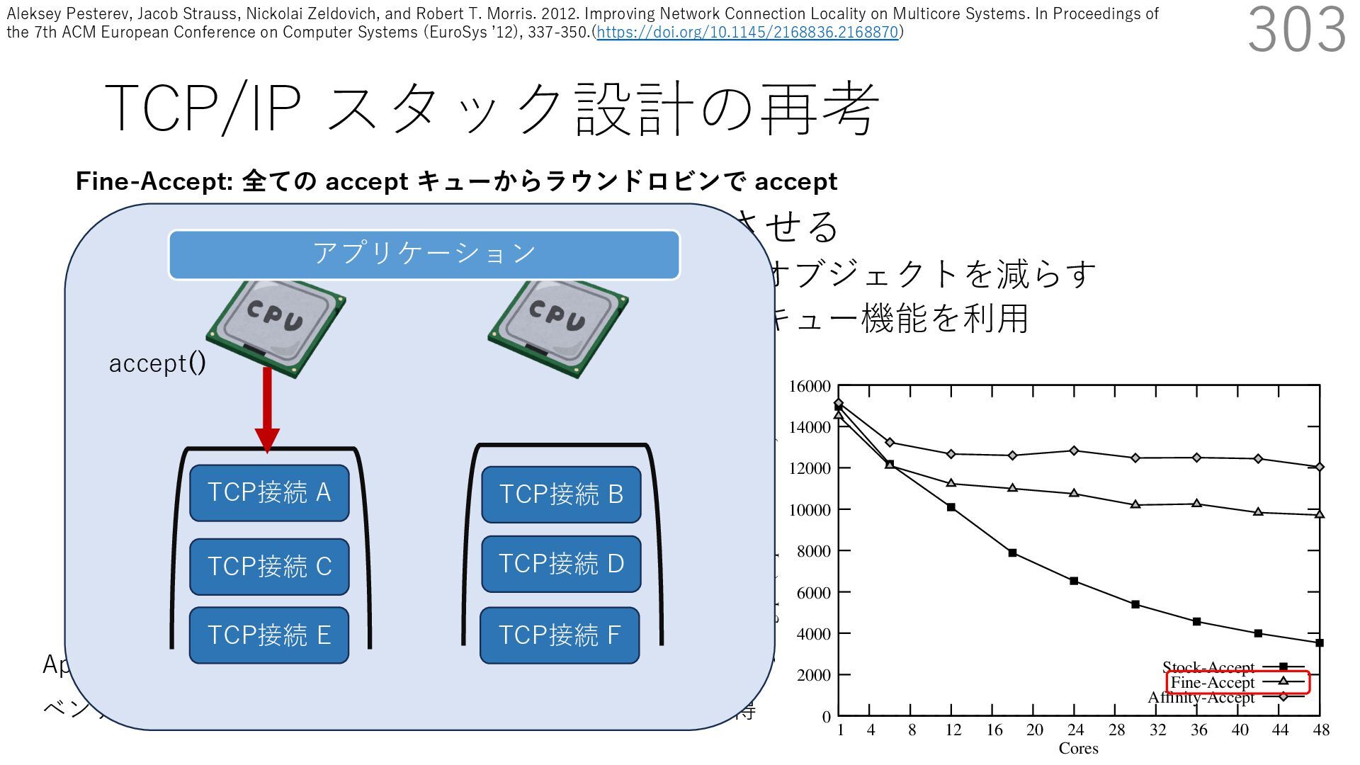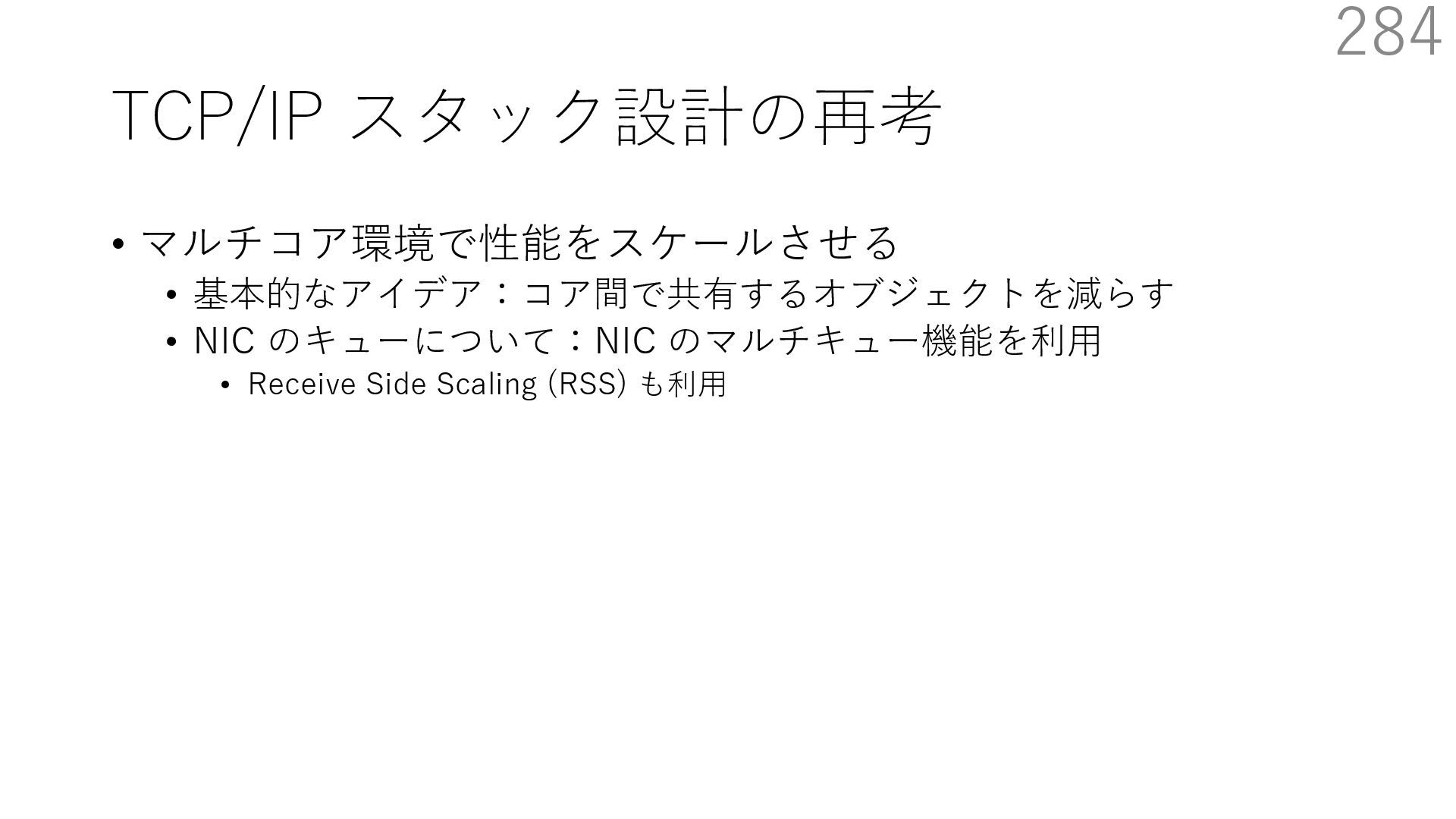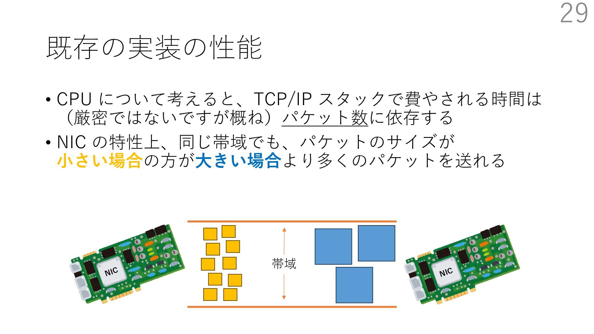 (SIGCOMM 2014) • mTCP (NSDI 2014) • Arrakis (OSDI 2014) • IX (OSDI 2014) • StackMap (USENIX ATC 2016) • Atlas (SIGCOMM 2017) • ZygOS (SOSP 2017) • Shenango (NSDI 2019) • Shinjuku (NSDI 2019) • TAS (EuroSys 2019) • Caladan (OSDI 2020) • Demikernel (SOSP 2021) 427 into a single library for both devices (e.g., RDMAxSPDK). We implemented the bulk of our library OS code in Rust. We initially prototyped several libOSes in C++; however, we found that Rust performs competitively with C++ and achieves ns-scale latencies while offering additional benefits. First, Rust enforces memory safety through language fea- tures and its compiler. Though our libOSes use unsafe code to bind to C/C++ kernel-bypass libraries and applications, User-space Software Kernel-space Software I/O Hardware I/O Device ??? libFuture ??? DPDK User I/O Buf. Mgmt libRDMA RDMA User I/O Buf. Mgmt Net. Trans. OS Kernel Control Path Demikernel Datapath Architecture App libPOSIX libDPDK SPDK User I/O Buf. Mgmt libSPDK Future Demikernel PDPIX Datapath API Figure 3. Demikernel kernel-bypass architecture. Demikernel ac- commodates heterogenous kernel-bypass devices, including poten- tial future hardware, with a flexible library OS-based datapath ar- chitecture.We include a libOS that goes through the OS kernel for 提案:異なるタイプのデバイスへ 共通のインターフェースからアクセス可能にする Irene Zhang, Amanda Raybuck, Pratyush Patel, Kirk Olynyk, Jacob Nelson, Omar S. Navarro Leija, Ashlie Martinez, Jing Liu, Anna Kornfeld Simpson, Sujay Jayakar, Pedro Henrique Penna, Max Demoulin, Piali Choudhury, and Anirudh Badam. 2021. The Demikernel Datapath OS Architecture for Microsecond-Scale Datacenter Systems. In Proceedings of the ACM Sigops 28th Symposium on Operating Systems Principles (SOSP ʼ21), 195-211.(https://doi.org/10.1145/3477132.3483569)
