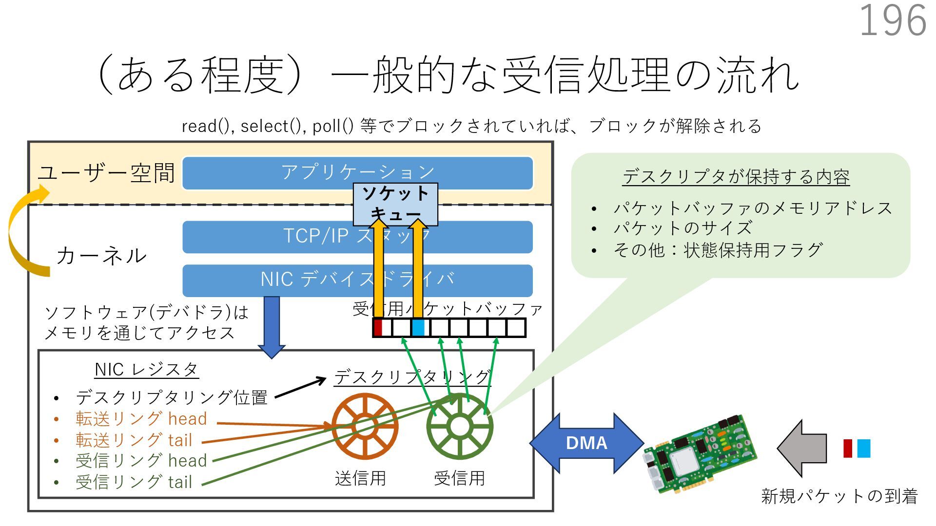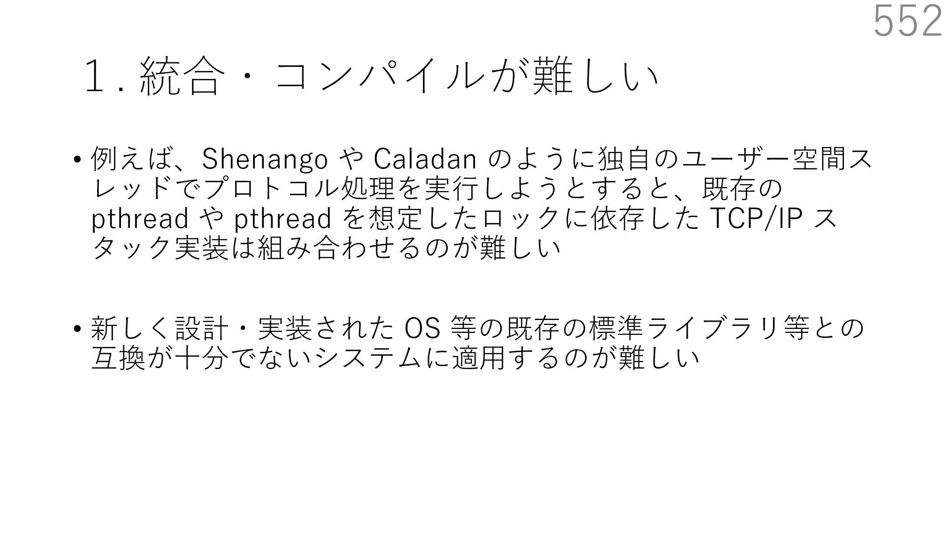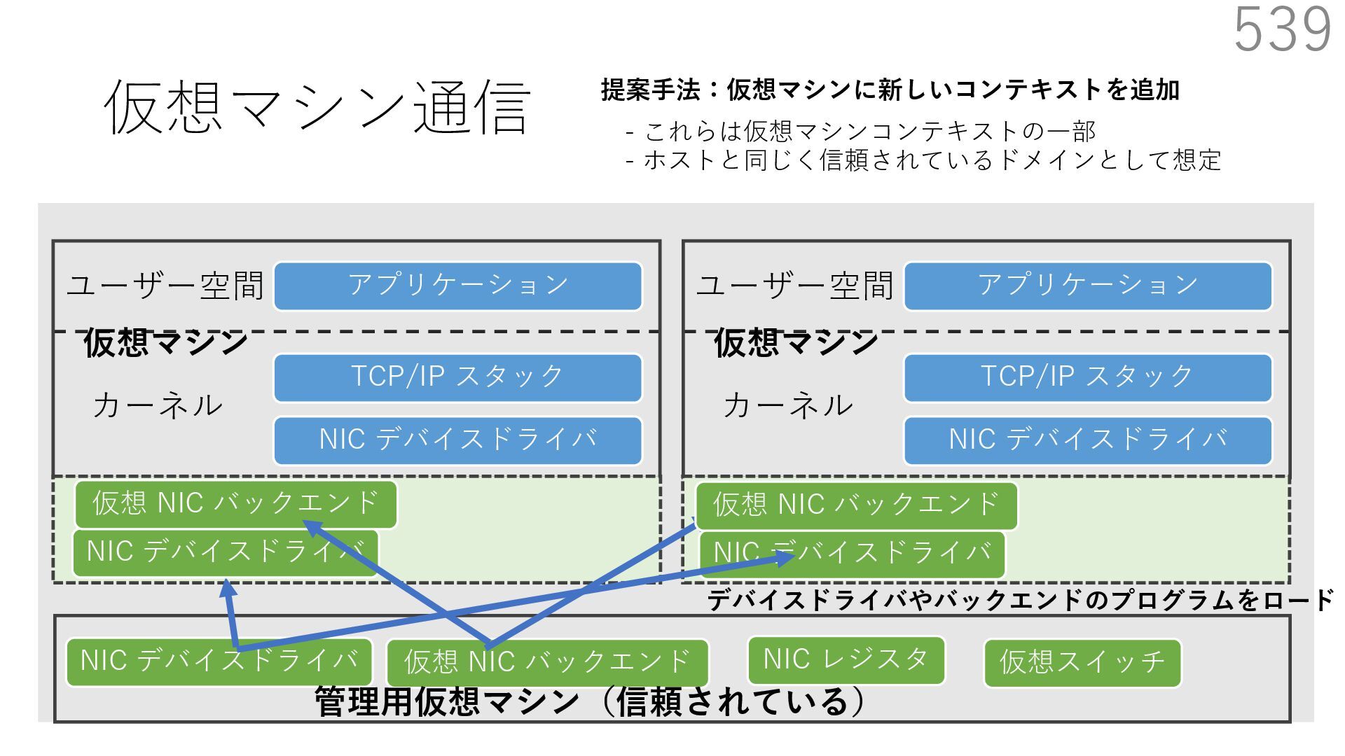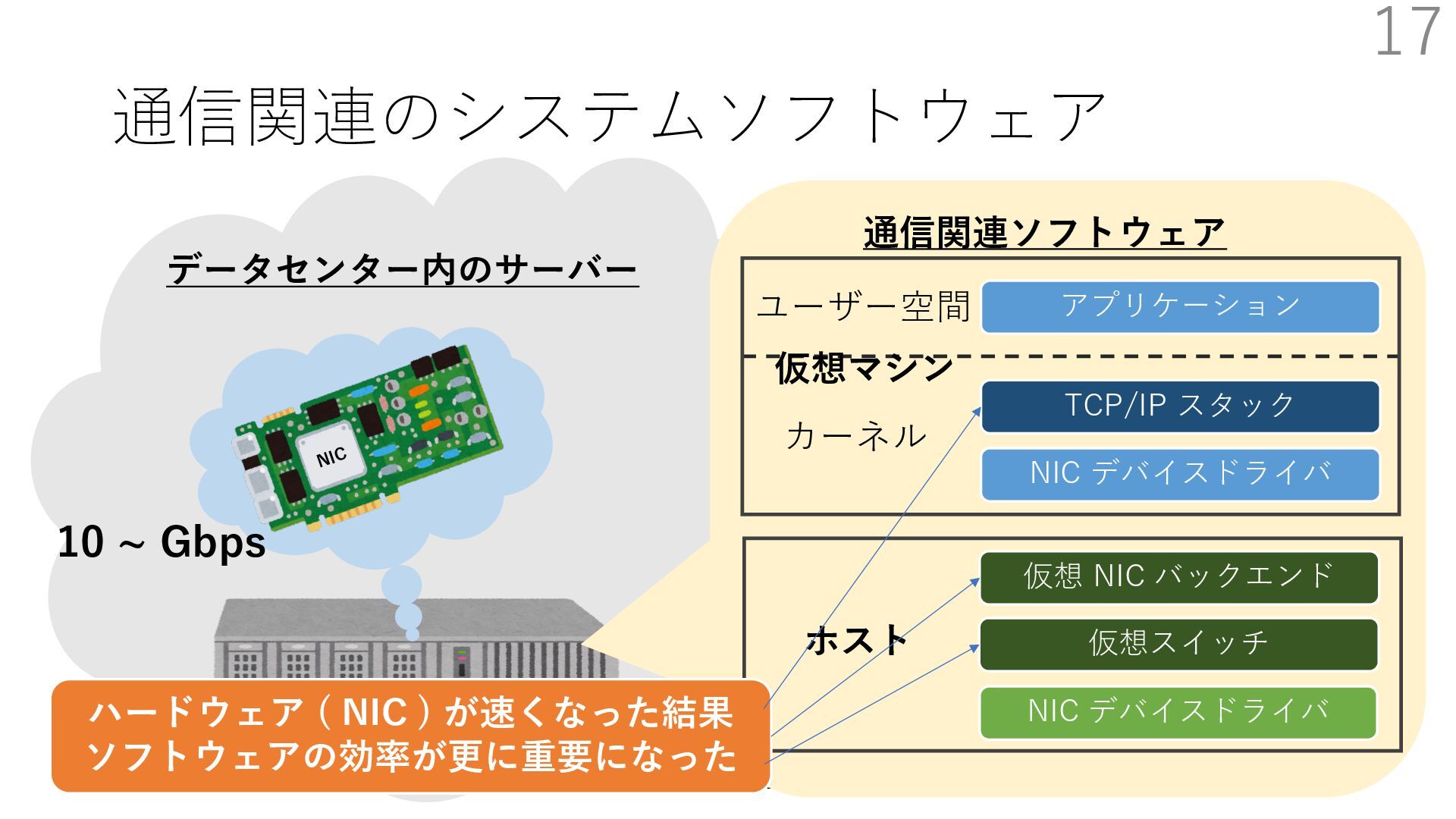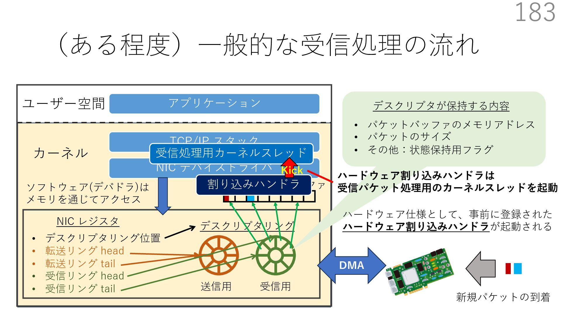 (SIGCOMM 2014) • mTCP (NSDI 2014) • Arrakis (OSDI 2014) • IX (OSDI 2014) • StackMap (USENIX ATC 2016) • Atlas (SIGCOMM 2017) • ZygOS (SOSP 2017) • Shenango (NSDI 2019) • Shinjuku (NSDI 2019) • TAS (EuroSys 2019) • Caladan (OSDI 2020) • Demikernel (SOSP 2021) 427 into a single library for both devices (e.g., RDMAxSPDK). We implemented the bulk of our library OS code in Rust. We initially prototyped several libOSes in C++; however, we found that Rust performs competitively with C++ and achieves ns-scale latencies while offering additional benefits. First, Rust enforces memory safety through language fea- tures and its compiler. Though our libOSes use unsafe code to bind to C/C++ kernel-bypass libraries and applications, User-space Software Kernel-space Software I/O Hardware I/O Device ??? libFuture ??? DPDK User I/O Buf. Mgmt libRDMA RDMA User I/O Buf. Mgmt Net. Trans. OS Kernel Control Path Demikernel Datapath Architecture App libPOSIX libDPDK SPDK User I/O Buf. Mgmt libSPDK Future Demikernel PDPIX Datapath API Figure 3. Demikernel kernel-bypass architecture. Demikernel ac- commodates heterogenous kernel-bypass devices, including poten- tial future hardware, with a flexible library OS-based datapath ar- chitecture.We include a libOS that goes through the OS kernel for 提案:異なるタイプのデバイスへ 共通のインターフェースからアクセス可能にする Irene Zhang, Amanda Raybuck, Pratyush Patel, Kirk Olynyk, Jacob Nelson, Omar S. Navarro Leija, Ashlie Martinez, Jing Liu, Anna Kornfeld Simpson, Sujay Jayakar, Pedro Henrique Penna, Max Demoulin, Piali Choudhury, and Anirudh Badam. 2021. The Demikernel Datapath OS Architecture for Microsecond-Scale Datacenter Systems. In Proceedings of the ACM Sigops 28th Symposium on Operating Systems Principles (SOSP ʼ21), 195-211.(https://doi.org/10.1145/3477132.3483569)