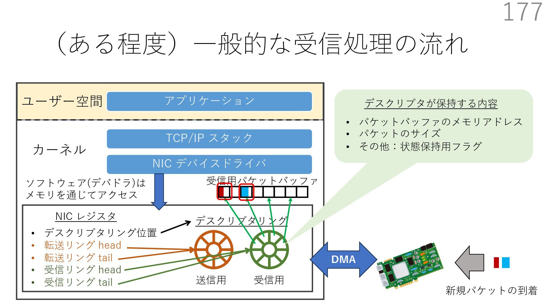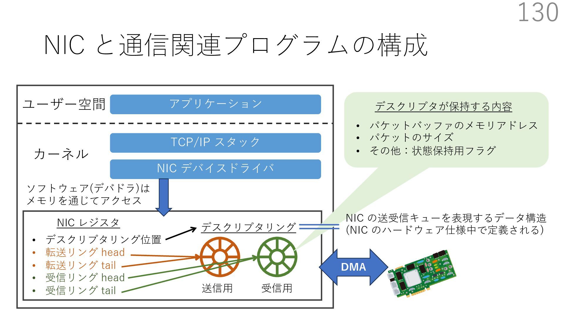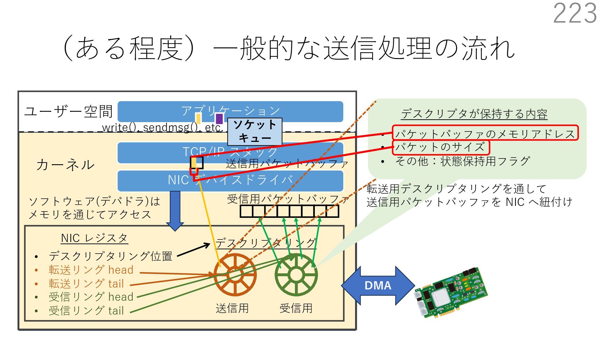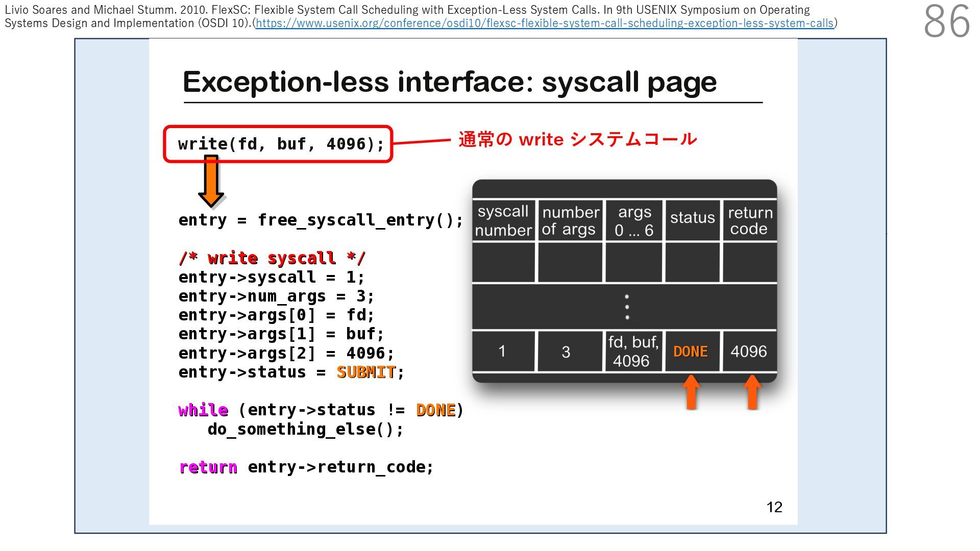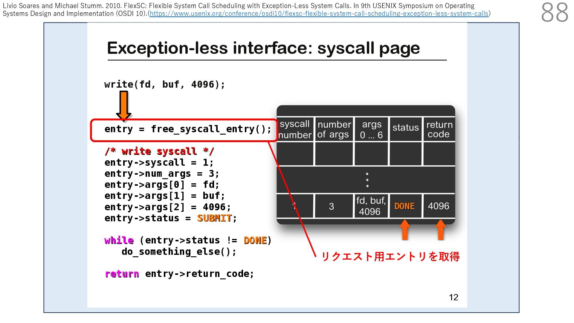 (SIGCOMM 2014) • mTCP (NSDI 2014) • Arrakis (OSDI 2014) • IX (OSDI 2014) • StackMap (USENIX ATC 2016) • Atlas (SIGCOMM 2017) • ZygOS (SOSP 2017) • Shenango (NSDI 2019) • Shinjuku (NSDI 2019) • TAS (EuroSys 2019) • Caladan (OSDI 2020) • Demikernel (SOSP 2021) 427 into a single library for both devices (e.g., RDMAxSPDK). We implemented the bulk of our library OS code in Rust. We initially prototyped several libOSes in C++; however, we found that Rust performs competitively with C++ and achieves ns-scale latencies while offering additional benefits. First, Rust enforces memory safety through language fea- tures and its compiler. Though our libOSes use unsafe code to bind to C/C++ kernel-bypass libraries and applications, User-space Software Kernel-space Software I/O Hardware I/O Device ??? libFuture ??? DPDK User I/O Buf. Mgmt libRDMA RDMA User I/O Buf. Mgmt Net. Trans. OS Kernel Control Path Demikernel Datapath Architecture App libPOSIX libDPDK SPDK User I/O Buf. Mgmt libSPDK Future Demikernel PDPIX Datapath API Figure 3. Demikernel kernel-bypass architecture. Demikernel ac- commodates heterogenous kernel-bypass devices, including poten- tial future hardware, with a flexible library OS-based datapath ar- chitecture.We include a libOS that goes through the OS kernel for 提案:異なるタイプのデバイスへ 共通のインターフェースからアクセス可能にする Irene Zhang, Amanda Raybuck, Pratyush Patel, Kirk Olynyk, Jacob Nelson, Omar S. Navarro Leija, Ashlie Martinez, Jing Liu, Anna Kornfeld Simpson, Sujay Jayakar, Pedro Henrique Penna, Max Demoulin, Piali Choudhury, and Anirudh Badam. 2021. The Demikernel Datapath OS Architecture for Microsecond-Scale Datacenter Systems. In Proceedings of the ACM Sigops 28th Symposium on Operating Systems Principles (SOSP ʼ21), 195-211.(https://doi.org/10.1145/3477132.3483569)