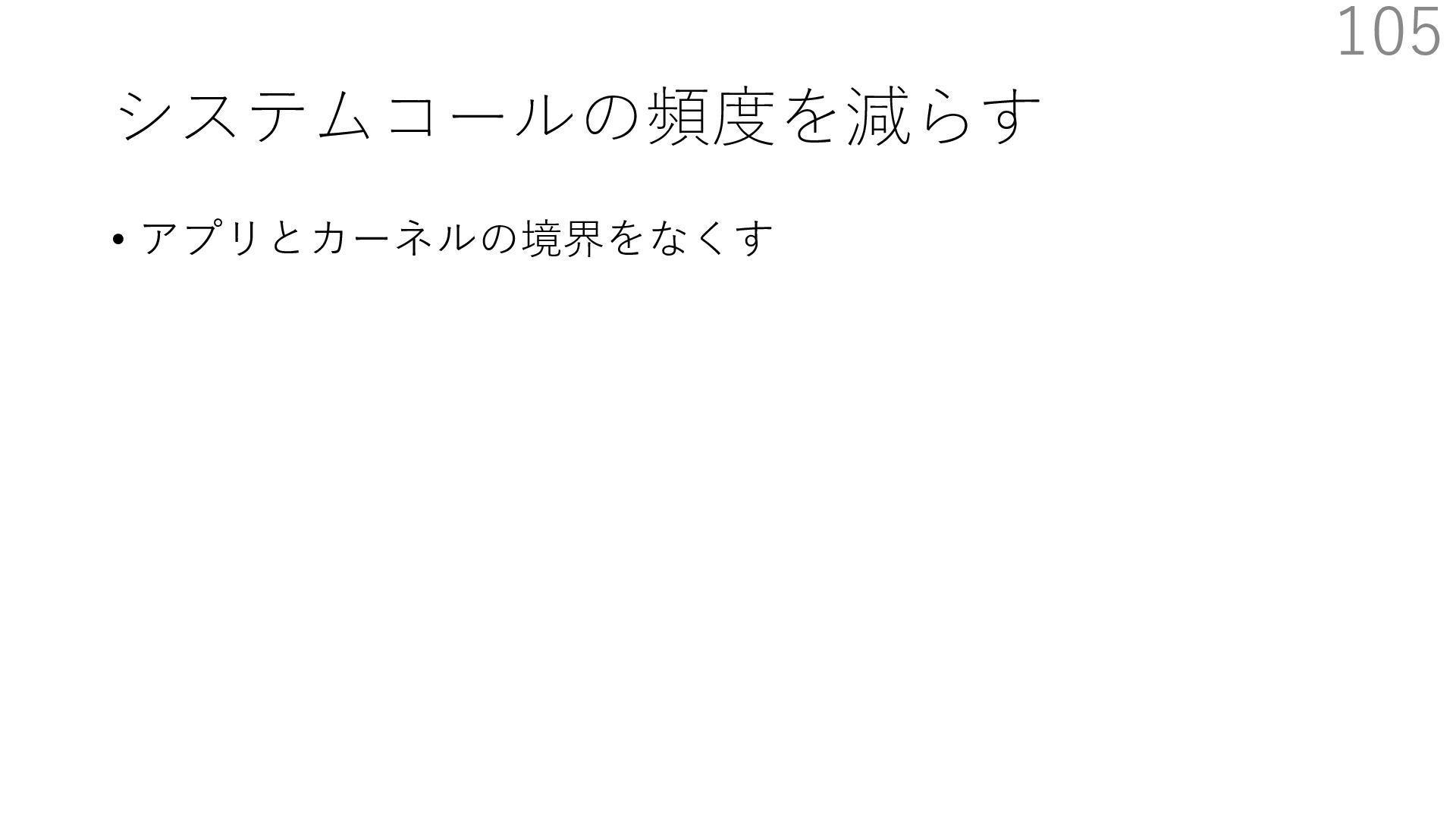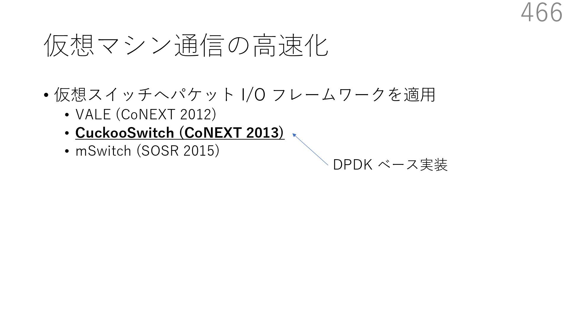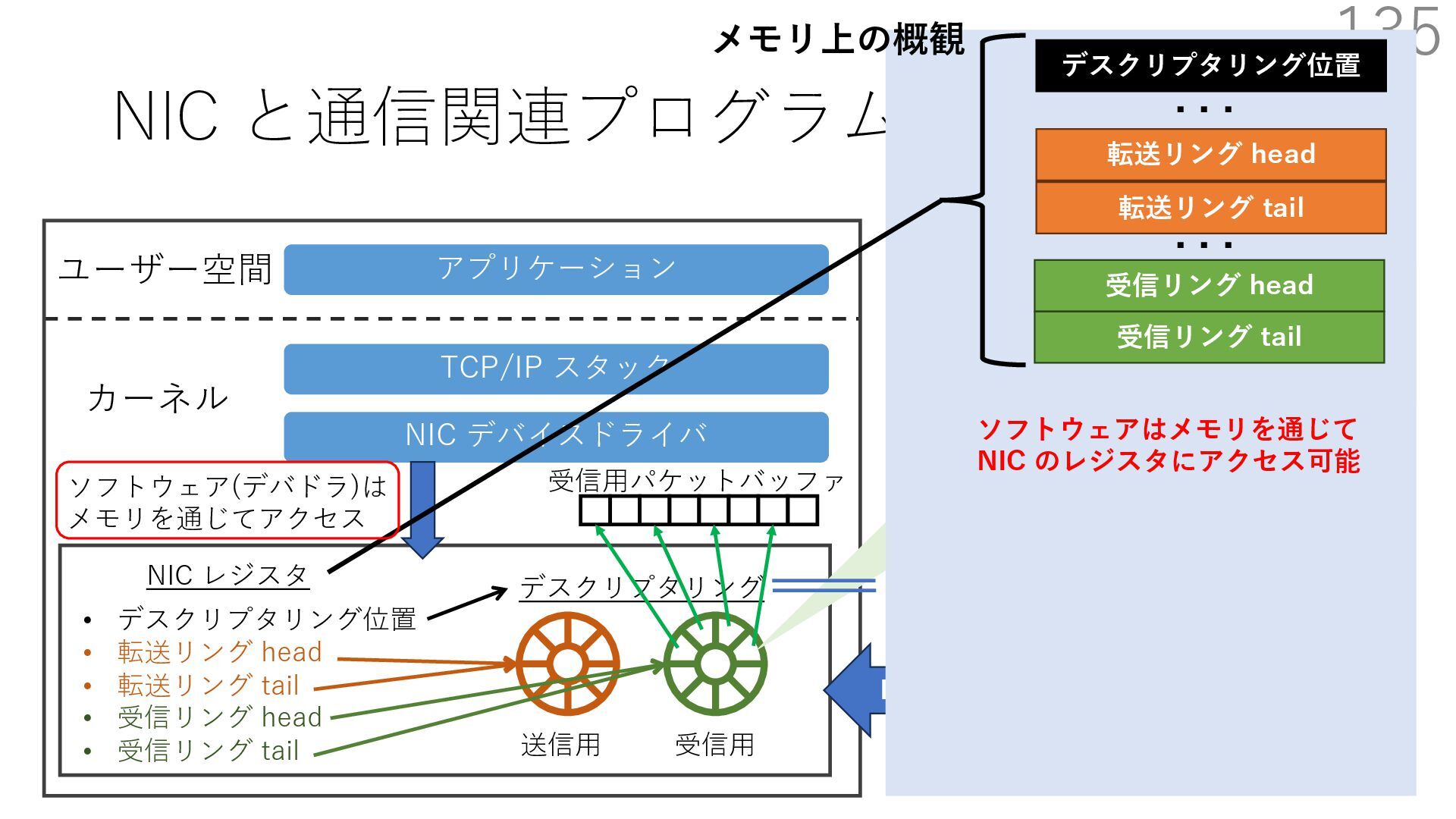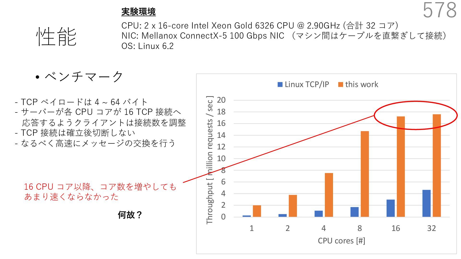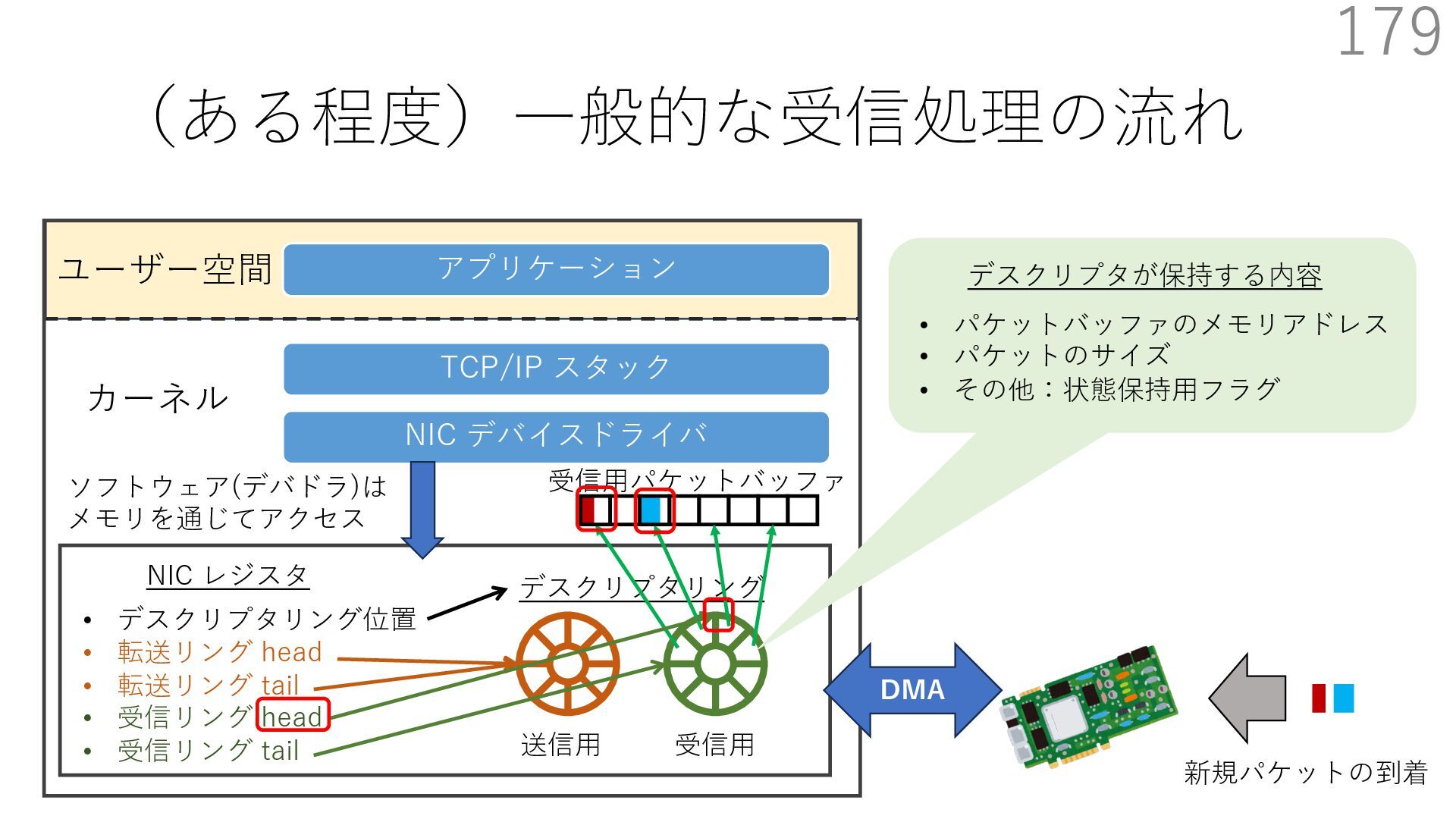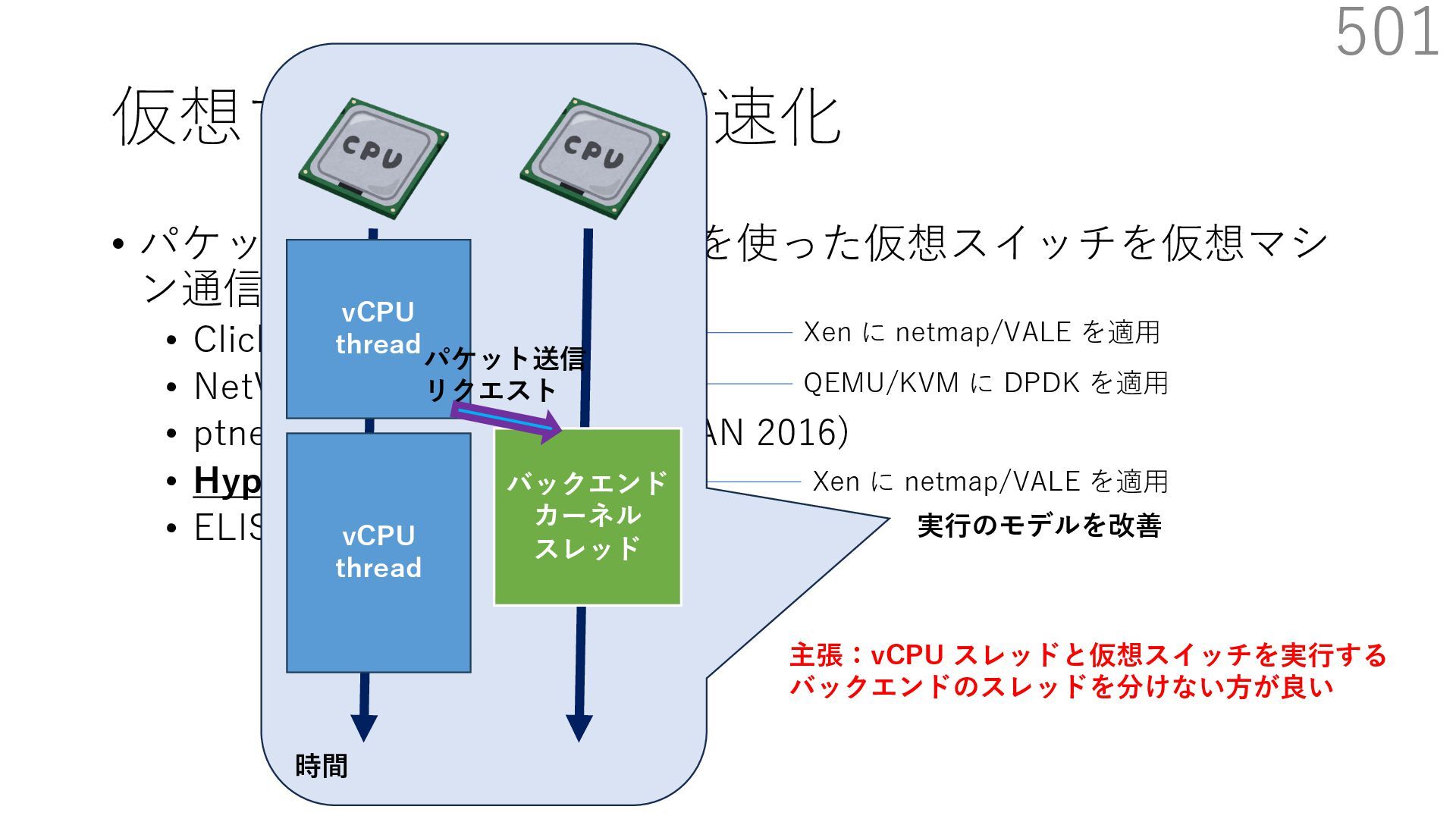 (SIGCOMM 2014) • mTCP (NSDI 2014) • Arrakis (OSDI 2014) • IX (OSDI 2014) • StackMap (USENIX ATC 2016) • Atlas (SIGCOMM 2017) • ZygOS (SOSP 2017) • Shenango (NSDI 2019) • Shinjuku (NSDI 2019) • TAS (EuroSys 2019) • Caladan (OSDI 2020) • Demikernel (SOSP 2021) 427 into a single library for both devices (e.g., RDMAxSPDK). We implemented the bulk of our library OS code in Rust. We initially prototyped several libOSes in C++; however, we found that Rust performs competitively with C++ and achieves ns-scale latencies while offering additional benefits. First, Rust enforces memory safety through language fea- tures and its compiler. Though our libOSes use unsafe code to bind to C/C++ kernel-bypass libraries and applications, User-space Software Kernel-space Software I/O Hardware I/O Device ??? libFuture ??? DPDK User I/O Buf. Mgmt libRDMA RDMA User I/O Buf. Mgmt Net. Trans. OS Kernel Control Path Demikernel Datapath Architecture App libPOSIX libDPDK SPDK User I/O Buf. Mgmt libSPDK Future Demikernel PDPIX Datapath API Figure 3. Demikernel kernel-bypass architecture. Demikernel ac- commodates heterogenous kernel-bypass devices, including poten- tial future hardware, with a flexible library OS-based datapath ar- chitecture.We include a libOS that goes through the OS kernel for 提案:異なるタイプのデバイスへ 共通のインターフェースからアクセス可能にする Irene Zhang, Amanda Raybuck, Pratyush Patel, Kirk Olynyk, Jacob Nelson, Omar S. Navarro Leija, Ashlie Martinez, Jing Liu, Anna Kornfeld Simpson, Sujay Jayakar, Pedro Henrique Penna, Max Demoulin, Piali Choudhury, and Anirudh Badam. 2021. The Demikernel Datapath OS Architecture for Microsecond-Scale Datacenter Systems. In Proceedings of the ACM Sigops 28th Symposium on Operating Systems Principles (SOSP ʼ21), 195-211.(https://doi.org/10.1145/3477132.3483569)