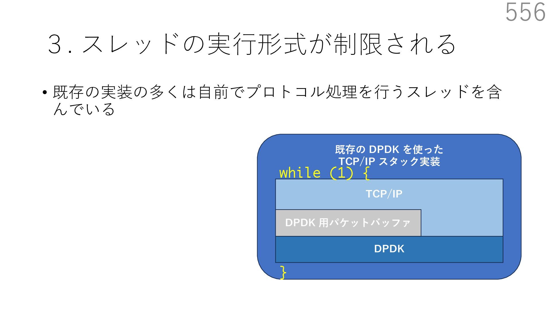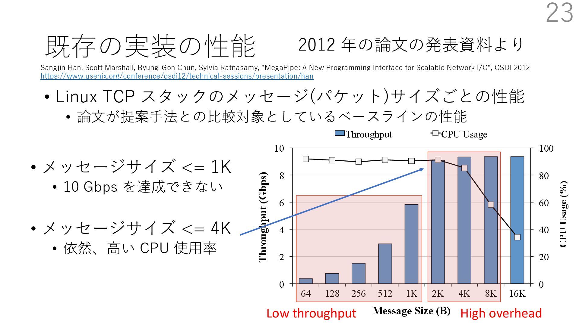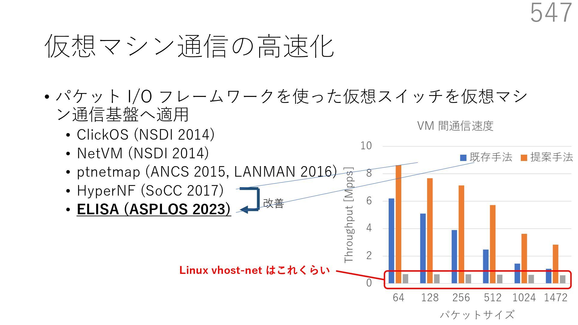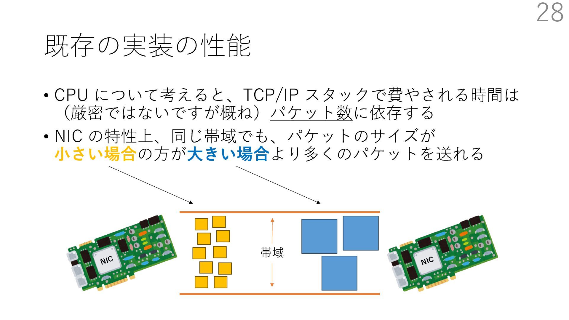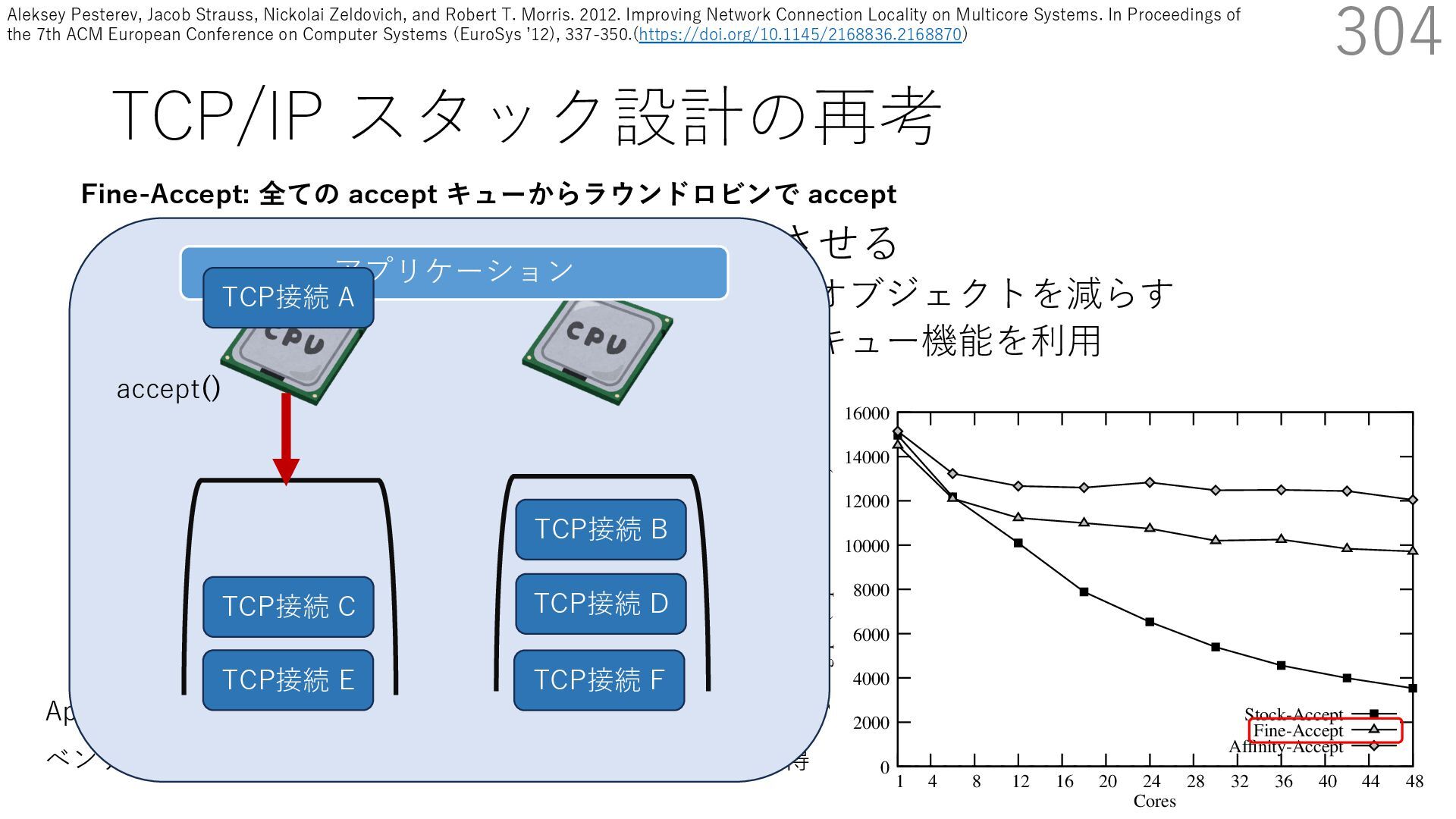 (SIGCOMM 2014) • mTCP (NSDI 2014) • Arrakis (OSDI 2014) • IX (OSDI 2014) • StackMap (USENIX ATC 2016) • Atlas (SIGCOMM 2017) • ZygOS (SOSP 2017) • Shenango (NSDI 2019) • Shinjuku (NSDI 2019) • TAS (EuroSys 2019) • Caladan (OSDI 2020) • Demikernel (SOSP 2021) 427 into a single library for both devices (e.g., RDMAxSPDK). We implemented the bulk of our library OS code in Rust. We initially prototyped several libOSes in C++; however, we found that Rust performs competitively with C++ and achieves ns-scale latencies while offering additional benefits. First, Rust enforces memory safety through language fea- tures and its compiler. Though our libOSes use unsafe code to bind to C/C++ kernel-bypass libraries and applications, User-space Software Kernel-space Software I/O Hardware I/O Device ??? libFuture ??? DPDK User I/O Buf. Mgmt libRDMA RDMA User I/O Buf. Mgmt Net. Trans. OS Kernel Control Path Demikernel Datapath Architecture App libPOSIX libDPDK SPDK User I/O Buf. Mgmt libSPDK Future Demikernel PDPIX Datapath API Figure 3. Demikernel kernel-bypass architecture. Demikernel ac- commodates heterogenous kernel-bypass devices, including poten- tial future hardware, with a flexible library OS-based datapath ar- chitecture.We include a libOS that goes through the OS kernel for 提案:異なるタイプのデバイスへ 共通のインターフェースからアクセス可能にする Irene Zhang, Amanda Raybuck, Pratyush Patel, Kirk Olynyk, Jacob Nelson, Omar S. Navarro Leija, Ashlie Martinez, Jing Liu, Anna Kornfeld Simpson, Sujay Jayakar, Pedro Henrique Penna, Max Demoulin, Piali Choudhury, and Anirudh Badam. 2021. The Demikernel Datapath OS Architecture for Microsecond-Scale Datacenter Systems. In Proceedings of the ACM Sigops 28th Symposium on Operating Systems Principles (SOSP ʼ21), 195-211.(https://doi.org/10.1145/3477132.3483569)