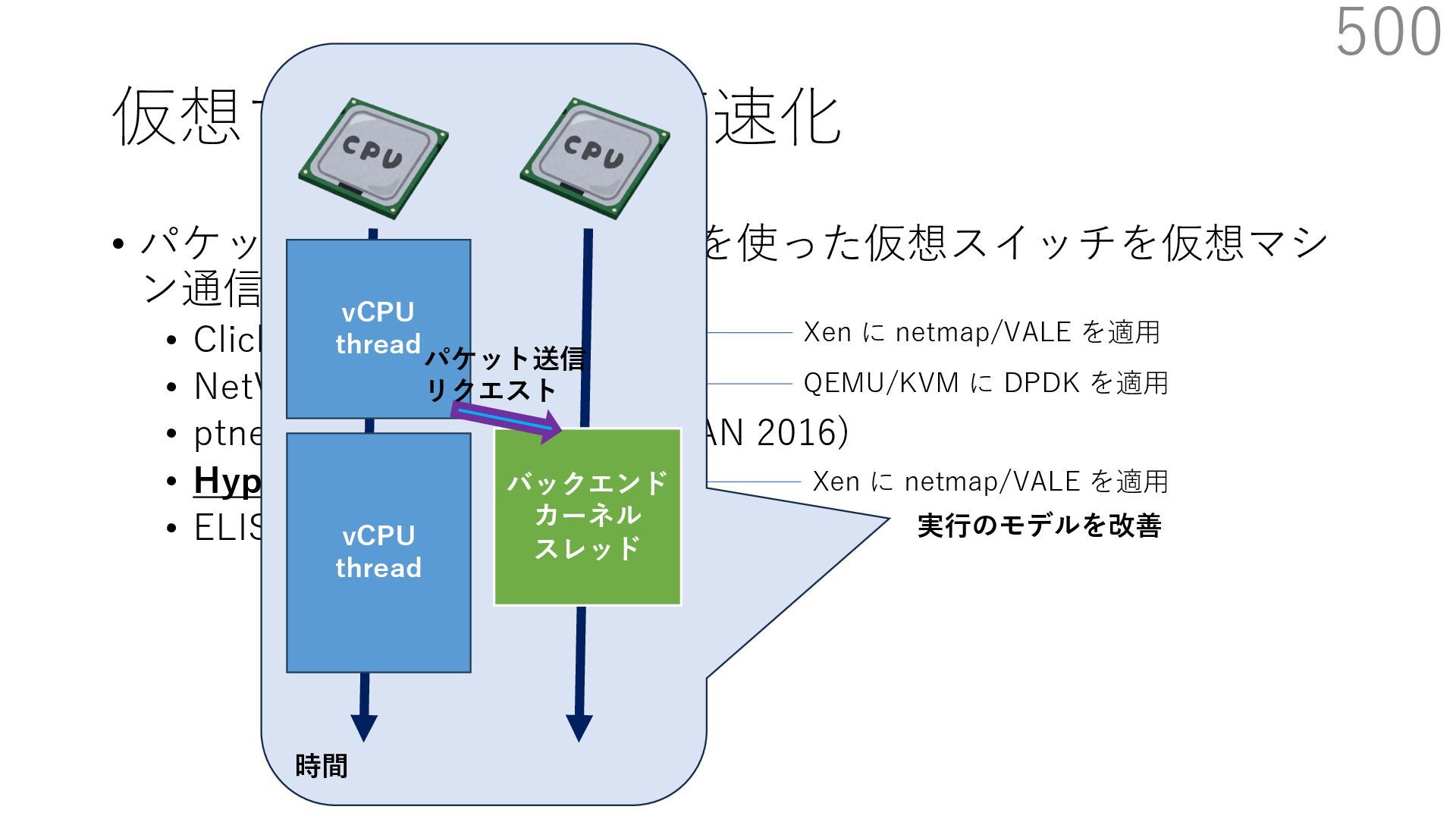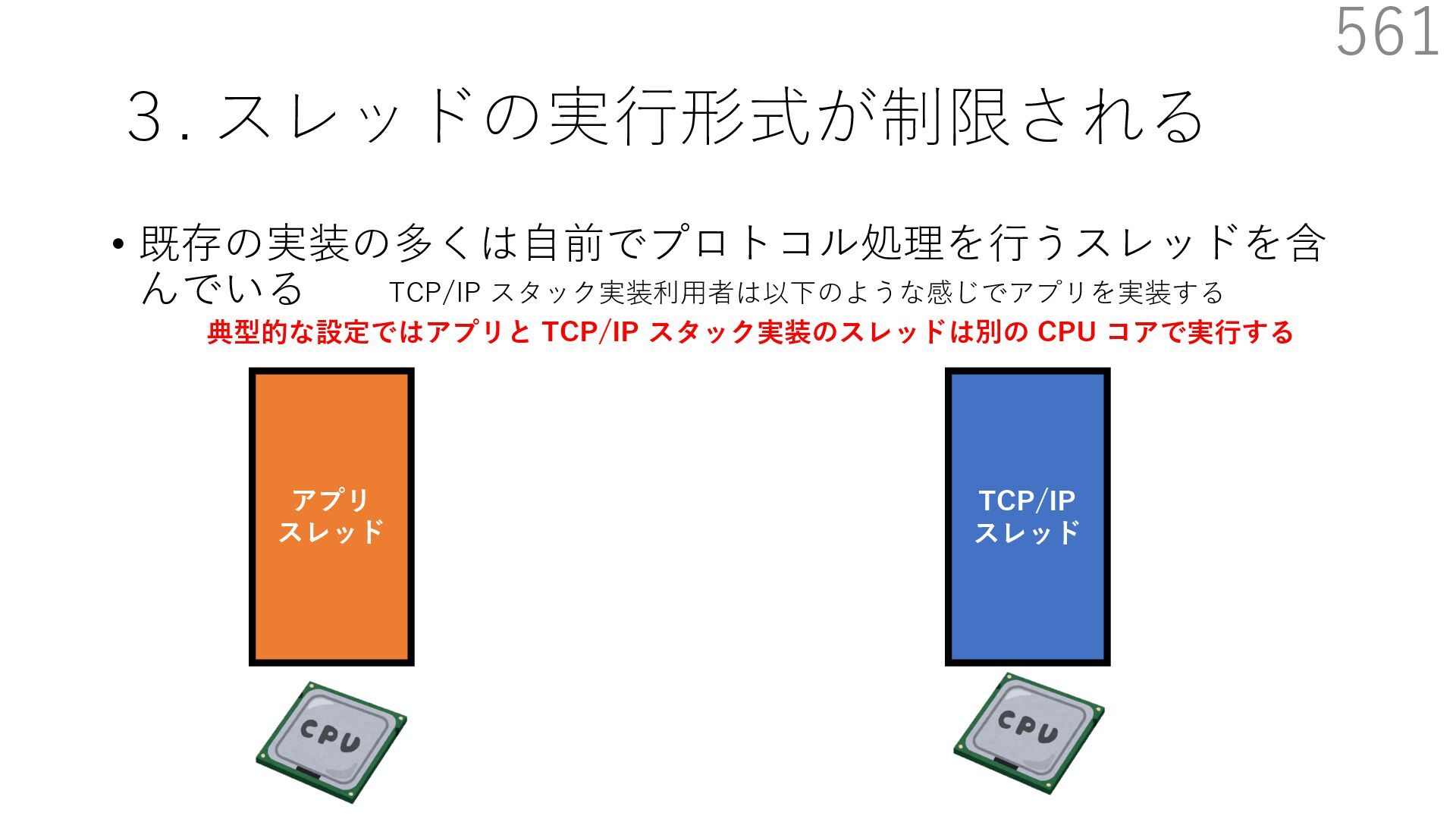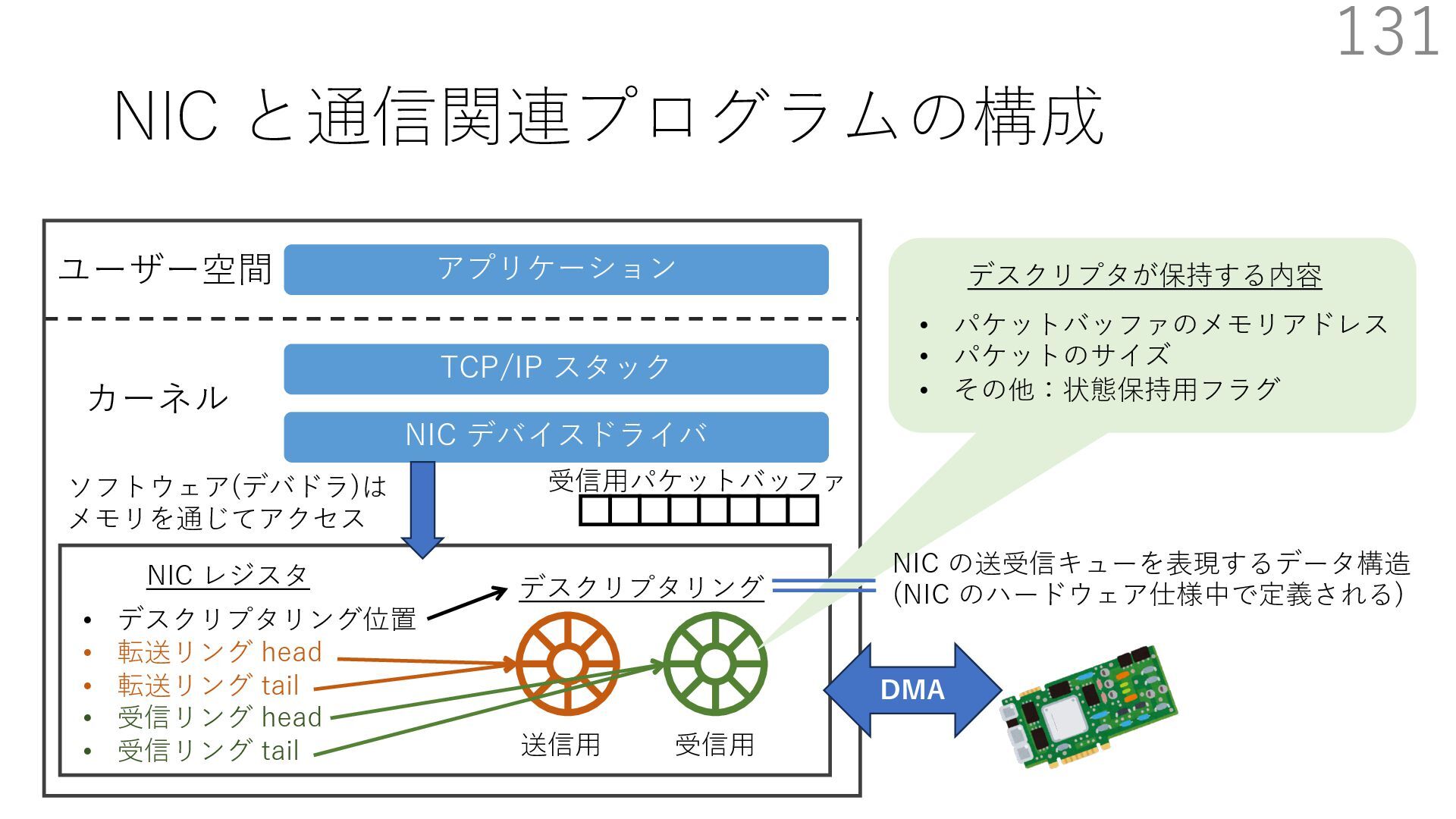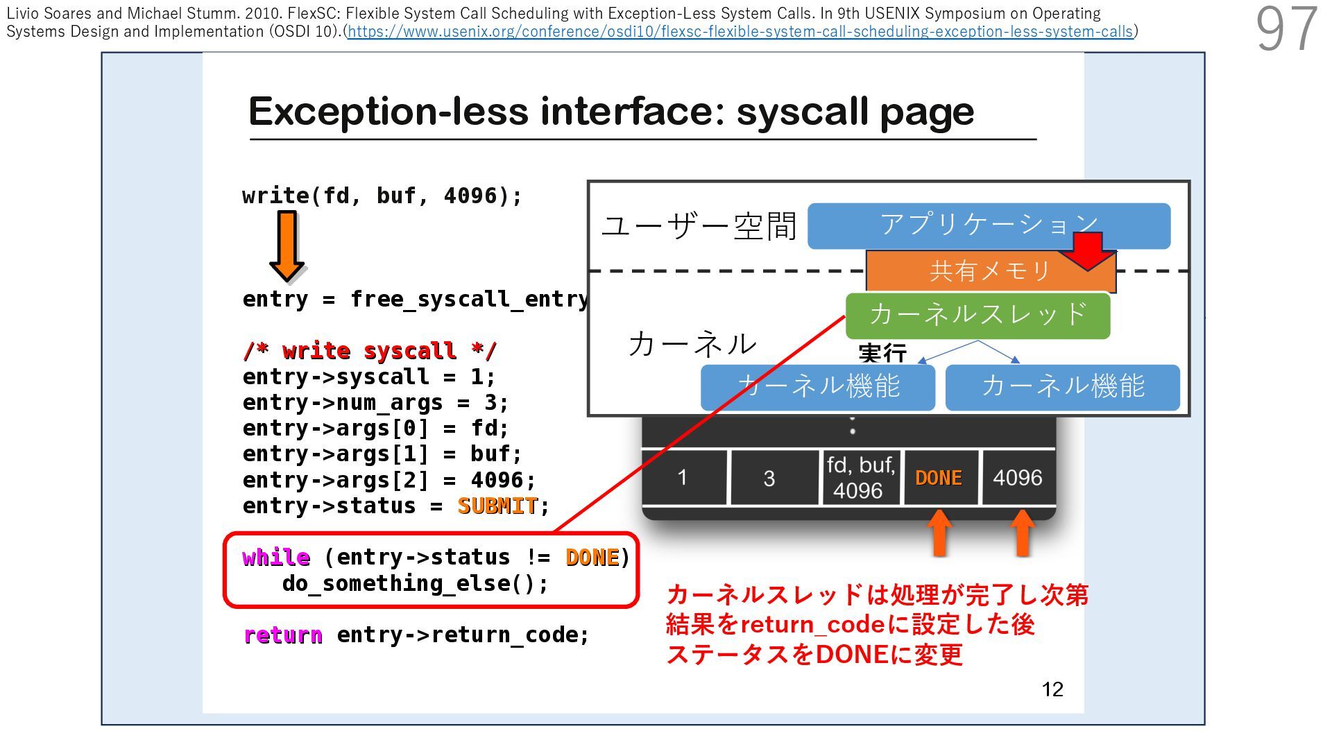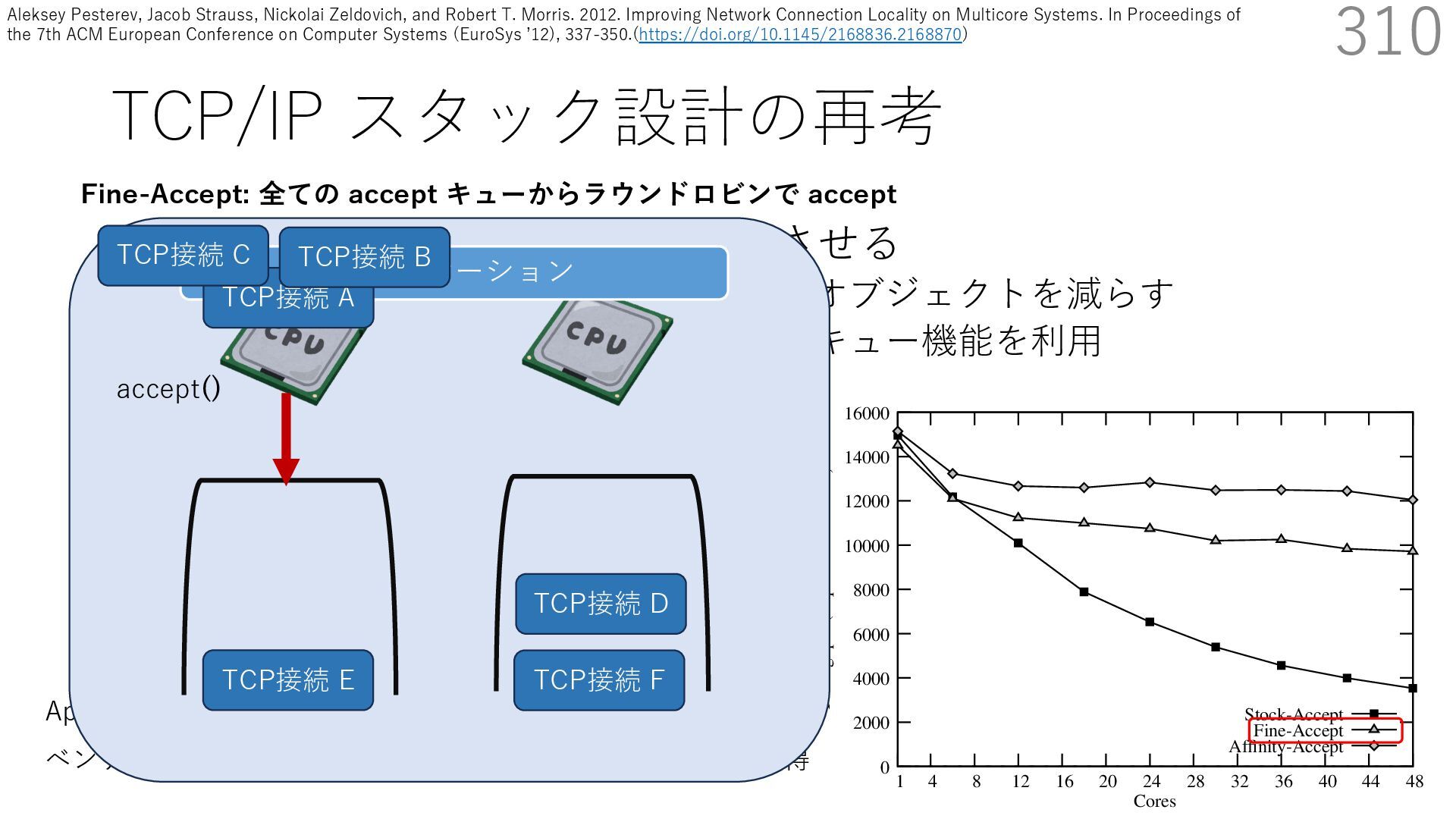 (SIGCOMM 2014) • mTCP (NSDI 2014) • Arrakis (OSDI 2014) • IX (OSDI 2014) • StackMap (USENIX ATC 2016) • Atlas (SIGCOMM 2017) • ZygOS (SOSP 2017) • Shenango (NSDI 2019) • Shinjuku (NSDI 2019) • TAS (EuroSys 2019) • Caladan (OSDI 2020) • Demikernel (SOSP 2021) 427 into a single library for both devices (e.g., RDMAxSPDK). We implemented the bulk of our library OS code in Rust. We initially prototyped several libOSes in C++; however, we found that Rust performs competitively with C++ and achieves ns-scale latencies while offering additional benefits. First, Rust enforces memory safety through language fea- tures and its compiler. Though our libOSes use unsafe code to bind to C/C++ kernel-bypass libraries and applications, User-space Software Kernel-space Software I/O Hardware I/O Device ??? libFuture ??? DPDK User I/O Buf. Mgmt libRDMA RDMA User I/O Buf. Mgmt Net. Trans. OS Kernel Control Path Demikernel Datapath Architecture App libPOSIX libDPDK SPDK User I/O Buf. Mgmt libSPDK Future Demikernel PDPIX Datapath API Figure 3. Demikernel kernel-bypass architecture. Demikernel ac- commodates heterogenous kernel-bypass devices, including poten- tial future hardware, with a flexible library OS-based datapath ar- chitecture.We include a libOS that goes through the OS kernel for 提案:異なるタイプのデバイスへ 共通のインターフェースからアクセス可能にする Irene Zhang, Amanda Raybuck, Pratyush Patel, Kirk Olynyk, Jacob Nelson, Omar S. Navarro Leija, Ashlie Martinez, Jing Liu, Anna Kornfeld Simpson, Sujay Jayakar, Pedro Henrique Penna, Max Demoulin, Piali Choudhury, and Anirudh Badam. 2021. The Demikernel Datapath OS Architecture for Microsecond-Scale Datacenter Systems. In Proceedings of the ACM Sigops 28th Symposium on Operating Systems Principles (SOSP ʼ21), 195-211.(https://doi.org/10.1145/3477132.3483569)