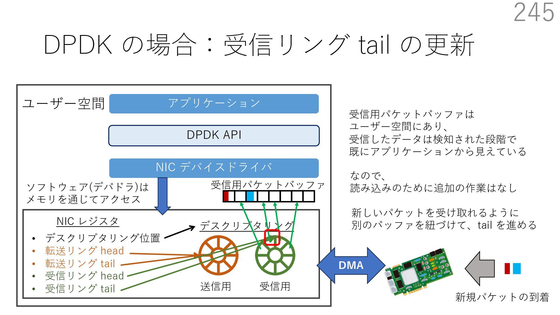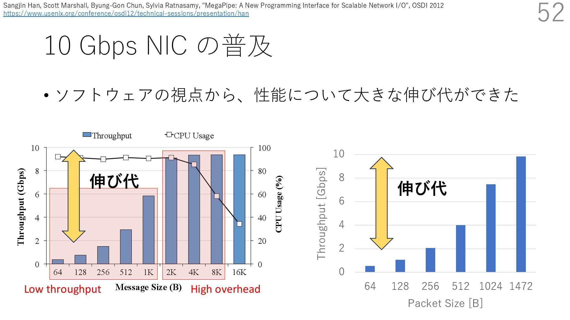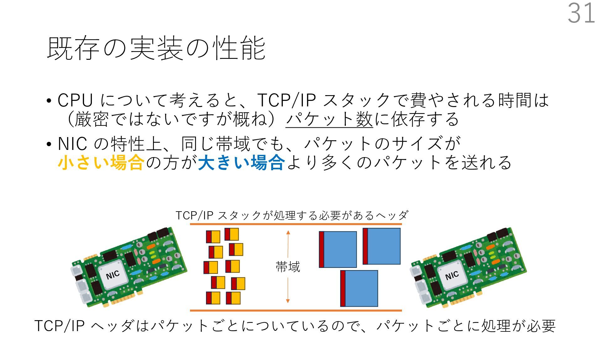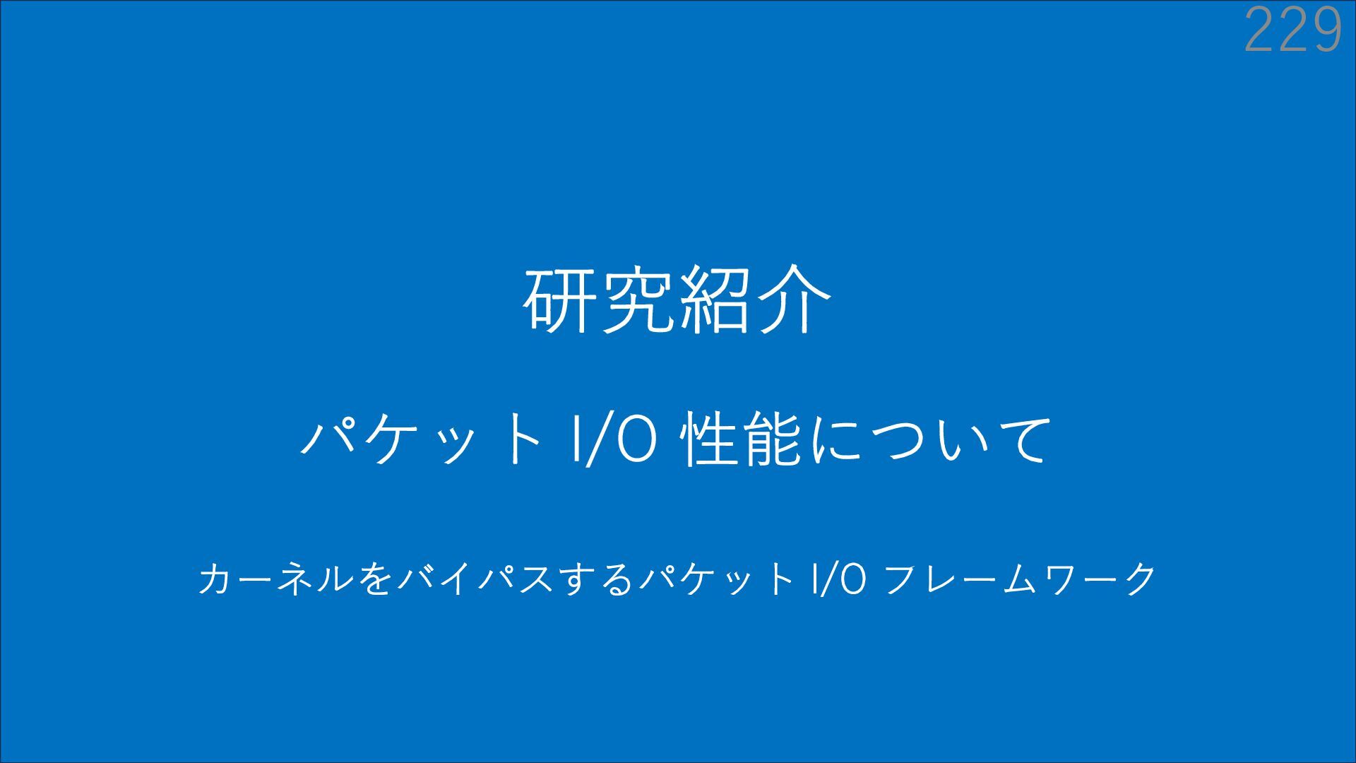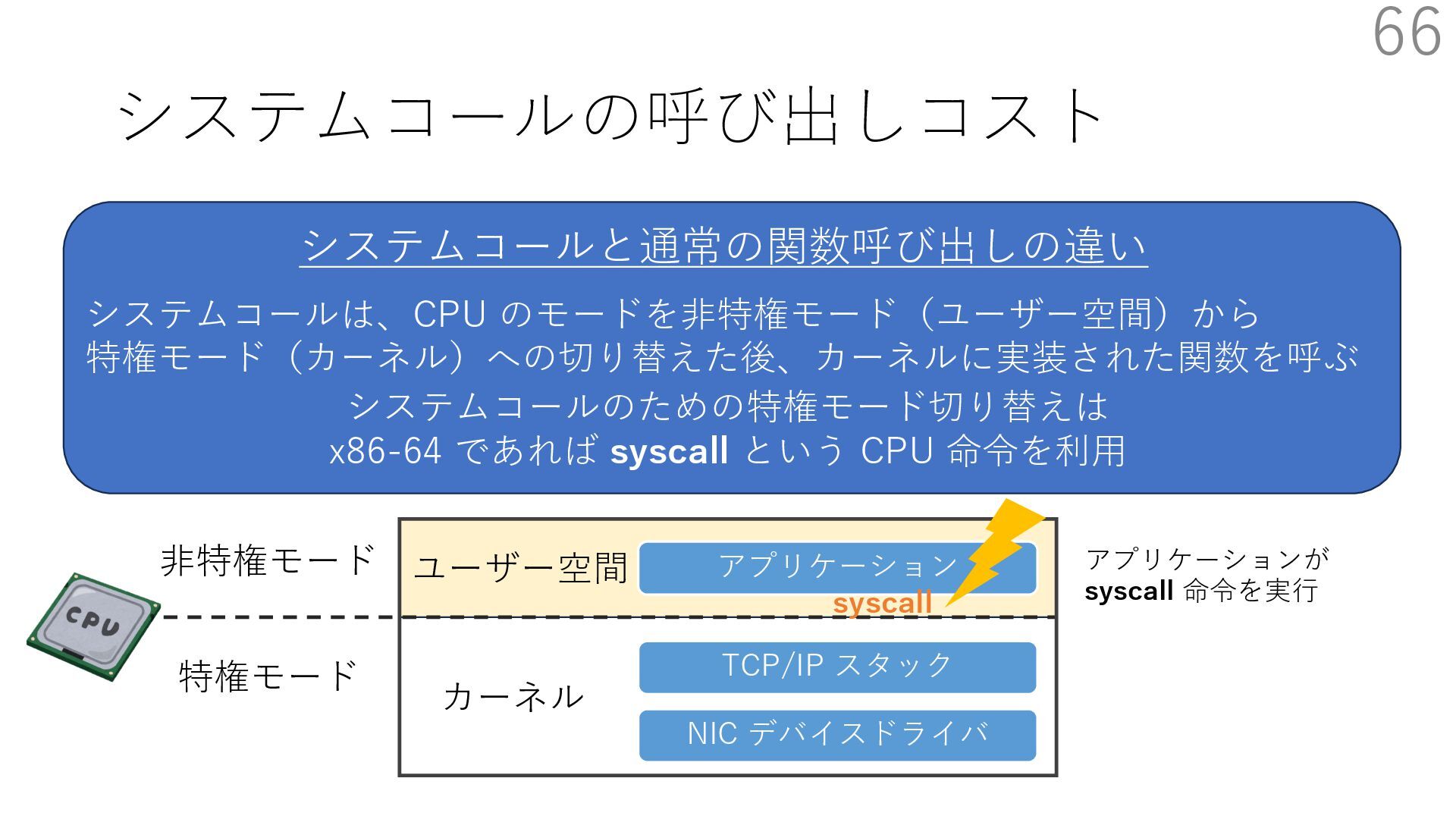 (SIGCOMM 2014) • mTCP (NSDI 2014) • Arrakis (OSDI 2014) • IX (OSDI 2014) • StackMap (USENIX ATC 2016) • Atlas (SIGCOMM 2017) • ZygOS (SOSP 2017) • Shenango (NSDI 2019) • Shinjuku (NSDI 2019) • TAS (EuroSys 2019) • Caladan (OSDI 2020) • Demikernel (SOSP 2021) 427 into a single library for both devices (e.g., RDMAxSPDK). We implemented the bulk of our library OS code in Rust. We initially prototyped several libOSes in C++; however, we found that Rust performs competitively with C++ and achieves ns-scale latencies while offering additional benefits. First, Rust enforces memory safety through language fea- tures and its compiler. Though our libOSes use unsafe code to bind to C/C++ kernel-bypass libraries and applications, User-space Software Kernel-space Software I/O Hardware I/O Device ??? libFuture ??? DPDK User I/O Buf. Mgmt libRDMA RDMA User I/O Buf. Mgmt Net. Trans. OS Kernel Control Path Demikernel Datapath Architecture App libPOSIX libDPDK SPDK User I/O Buf. Mgmt libSPDK Future Demikernel PDPIX Datapath API Figure 3. Demikernel kernel-bypass architecture. Demikernel ac- commodates heterogenous kernel-bypass devices, including poten- tial future hardware, with a flexible library OS-based datapath ar- chitecture.We include a libOS that goes through the OS kernel for 提案:異なるタイプのデバイスへ 共通のインターフェースからアクセス可能にする Irene Zhang, Amanda Raybuck, Pratyush Patel, Kirk Olynyk, Jacob Nelson, Omar S. Navarro Leija, Ashlie Martinez, Jing Liu, Anna Kornfeld Simpson, Sujay Jayakar, Pedro Henrique Penna, Max Demoulin, Piali Choudhury, and Anirudh Badam. 2021. The Demikernel Datapath OS Architecture for Microsecond-Scale Datacenter Systems. In Proceedings of the ACM Sigops 28th Symposium on Operating Systems Principles (SOSP ʼ21), 195-211.(https://doi.org/10.1145/3477132.3483569)