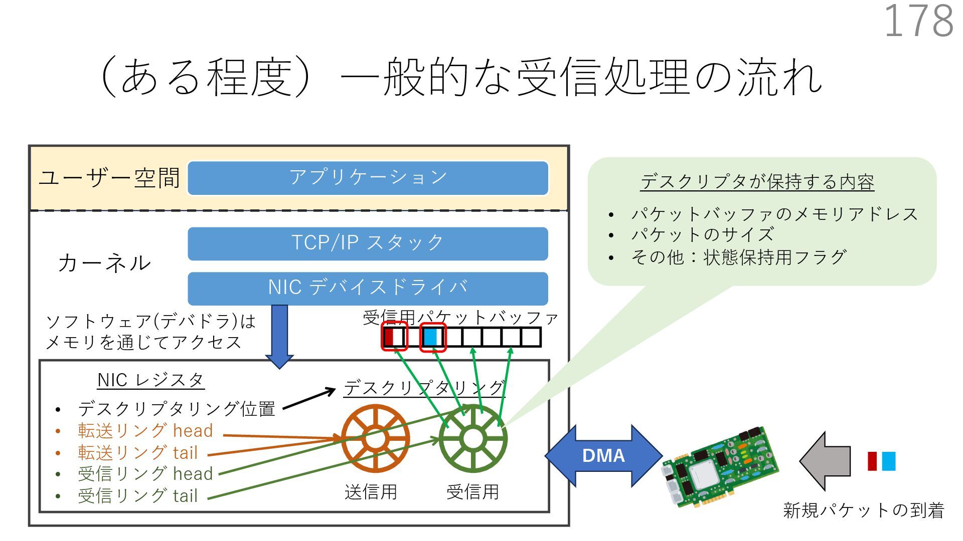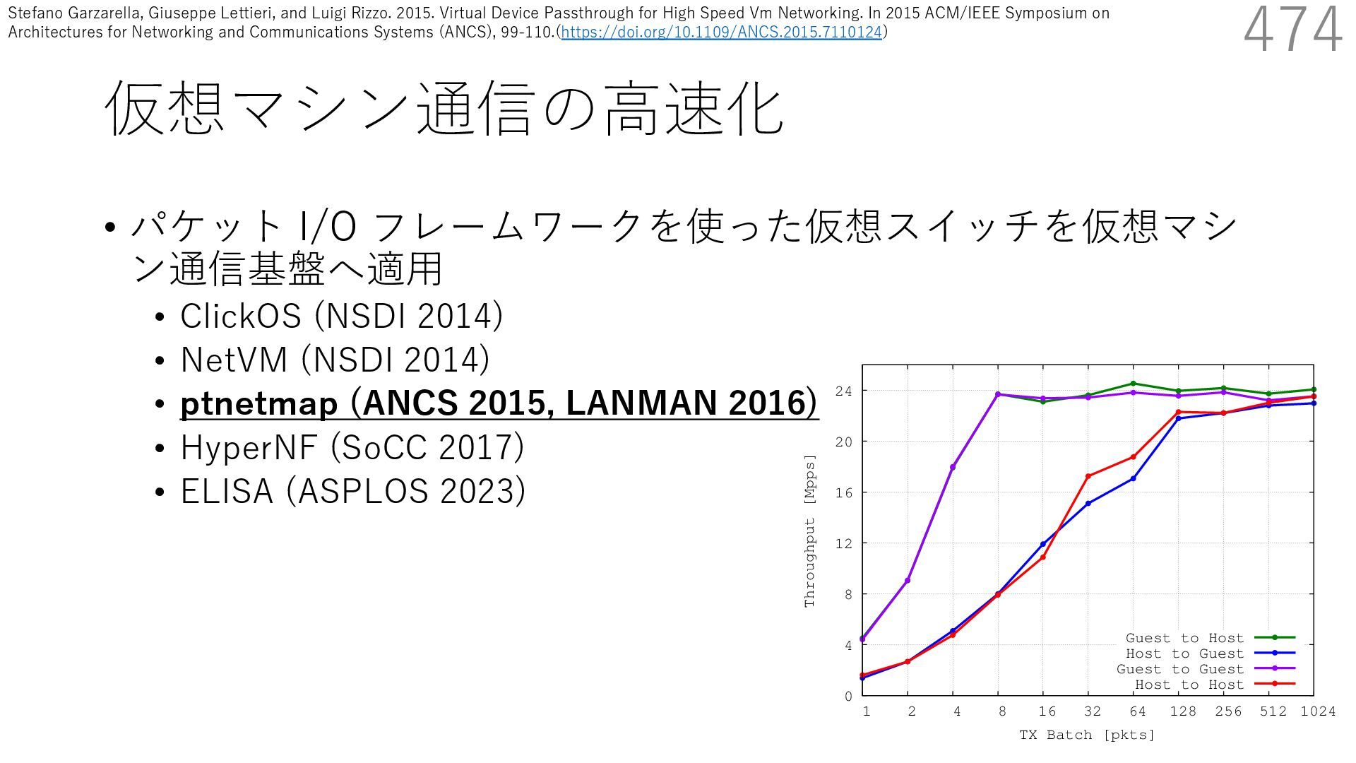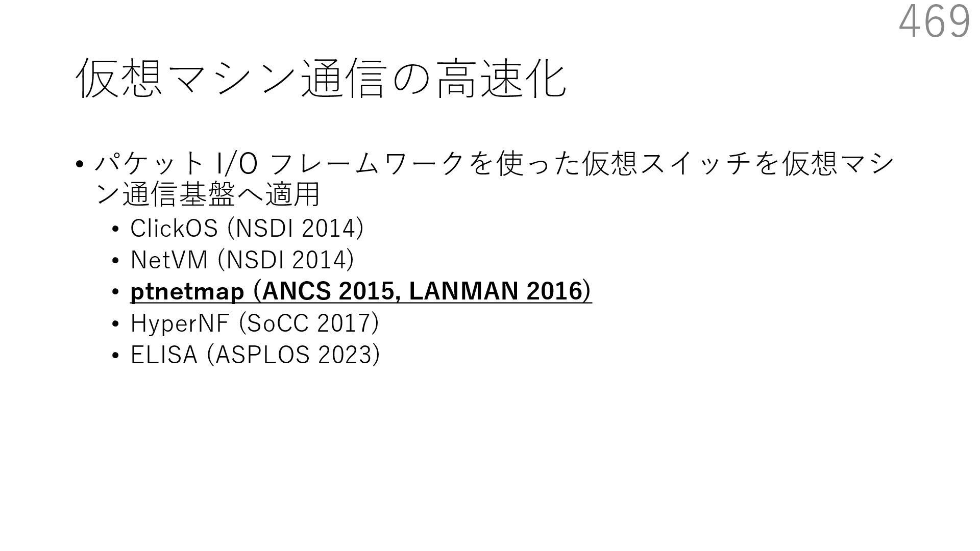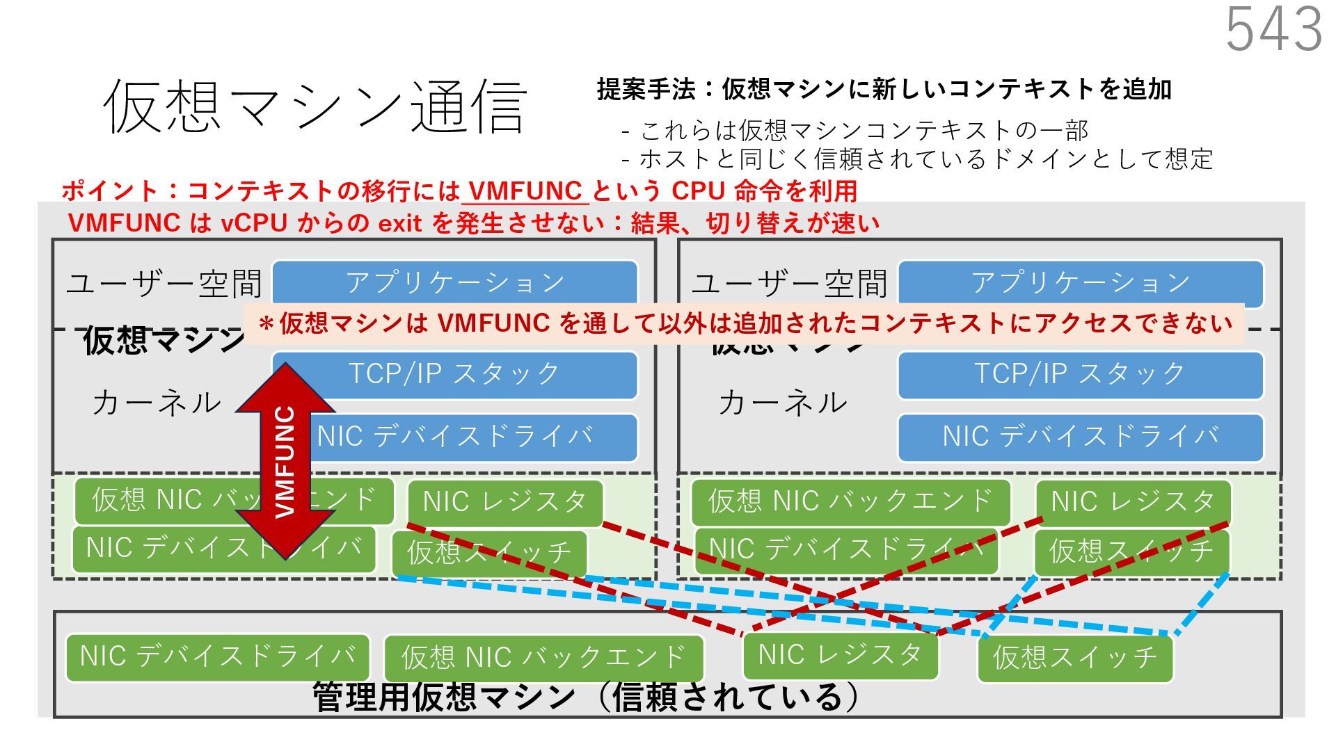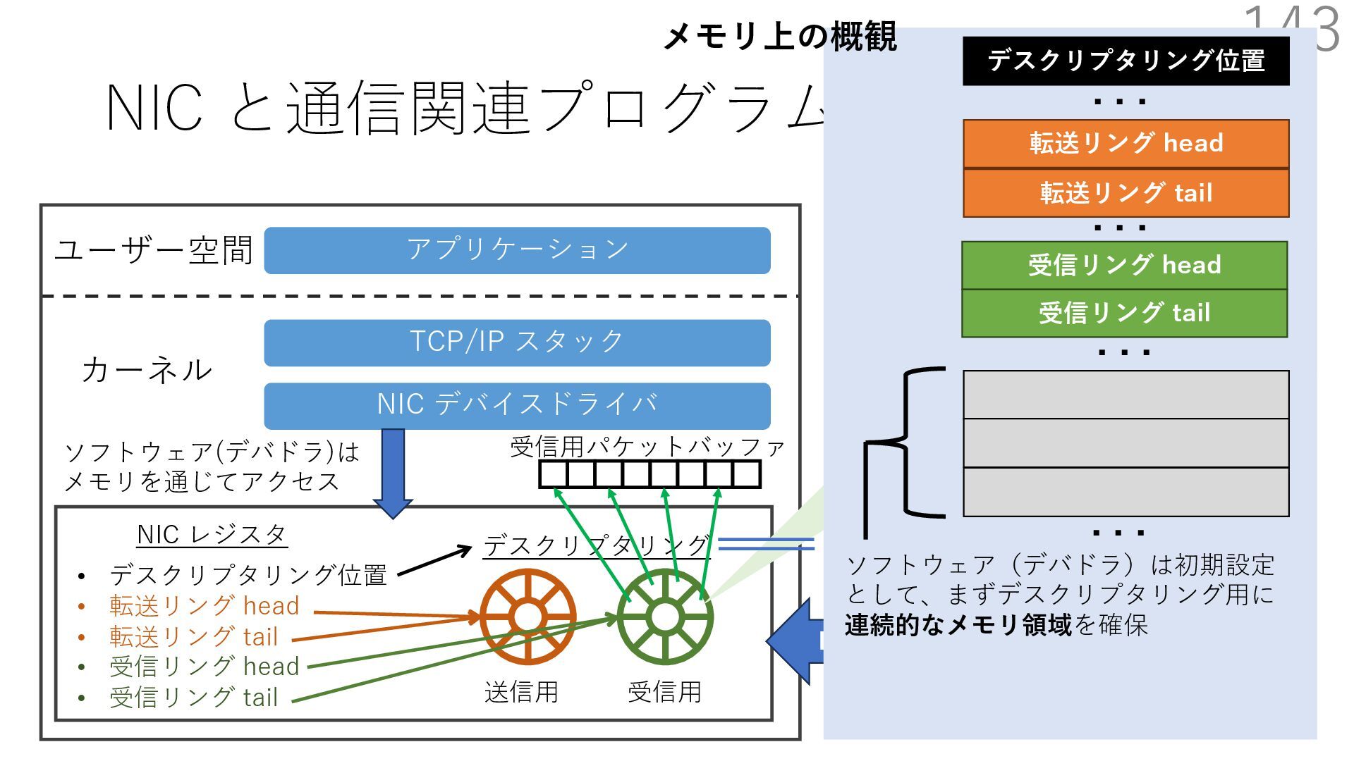 (SIGCOMM 2014) • mTCP (NSDI 2014) • Arrakis (OSDI 2014) • IX (OSDI 2014) • StackMap (USENIX ATC 2016) • Atlas (SIGCOMM 2017) • ZygOS (SOSP 2017) • Shenango (NSDI 2019) • Shinjuku (NSDI 2019) • TAS (EuroSys 2019) • Caladan (OSDI 2020) • Demikernel (SOSP 2021) 427 into a single library for both devices (e.g., RDMAxSPDK). We implemented the bulk of our library OS code in Rust. We initially prototyped several libOSes in C++; however, we found that Rust performs competitively with C++ and achieves ns-scale latencies while offering additional benefits. First, Rust enforces memory safety through language fea- tures and its compiler. Though our libOSes use unsafe code to bind to C/C++ kernel-bypass libraries and applications, User-space Software Kernel-space Software I/O Hardware I/O Device ??? libFuture ??? DPDK User I/O Buf. Mgmt libRDMA RDMA User I/O Buf. Mgmt Net. Trans. OS Kernel Control Path Demikernel Datapath Architecture App libPOSIX libDPDK SPDK User I/O Buf. Mgmt libSPDK Future Demikernel PDPIX Datapath API Figure 3. Demikernel kernel-bypass architecture. Demikernel ac- commodates heterogenous kernel-bypass devices, including poten- tial future hardware, with a flexible library OS-based datapath ar- chitecture.We include a libOS that goes through the OS kernel for 提案:異なるタイプのデバイスへ 共通のインターフェースからアクセス可能にする Irene Zhang, Amanda Raybuck, Pratyush Patel, Kirk Olynyk, Jacob Nelson, Omar S. Navarro Leija, Ashlie Martinez, Jing Liu, Anna Kornfeld Simpson, Sujay Jayakar, Pedro Henrique Penna, Max Demoulin, Piali Choudhury, and Anirudh Badam. 2021. The Demikernel Datapath OS Architecture for Microsecond-Scale Datacenter Systems. In Proceedings of the ACM Sigops 28th Symposium on Operating Systems Principles (SOSP ʼ21), 195-211.(https://doi.org/10.1145/3477132.3483569)
