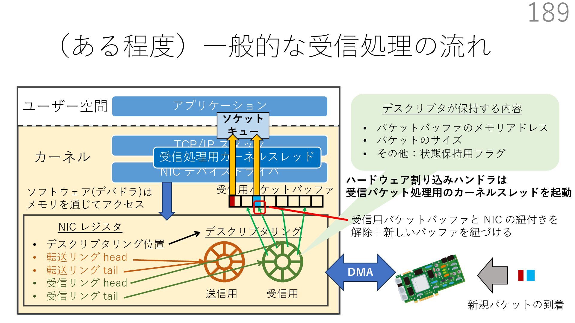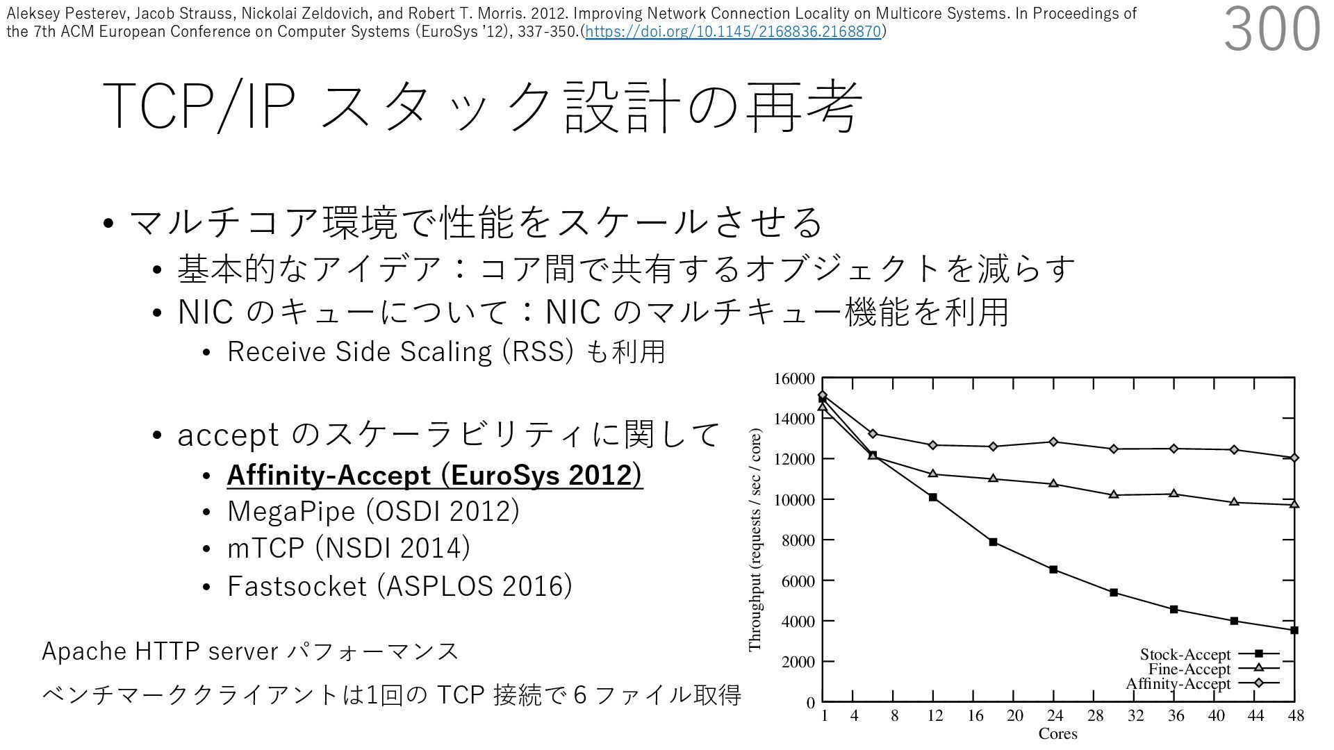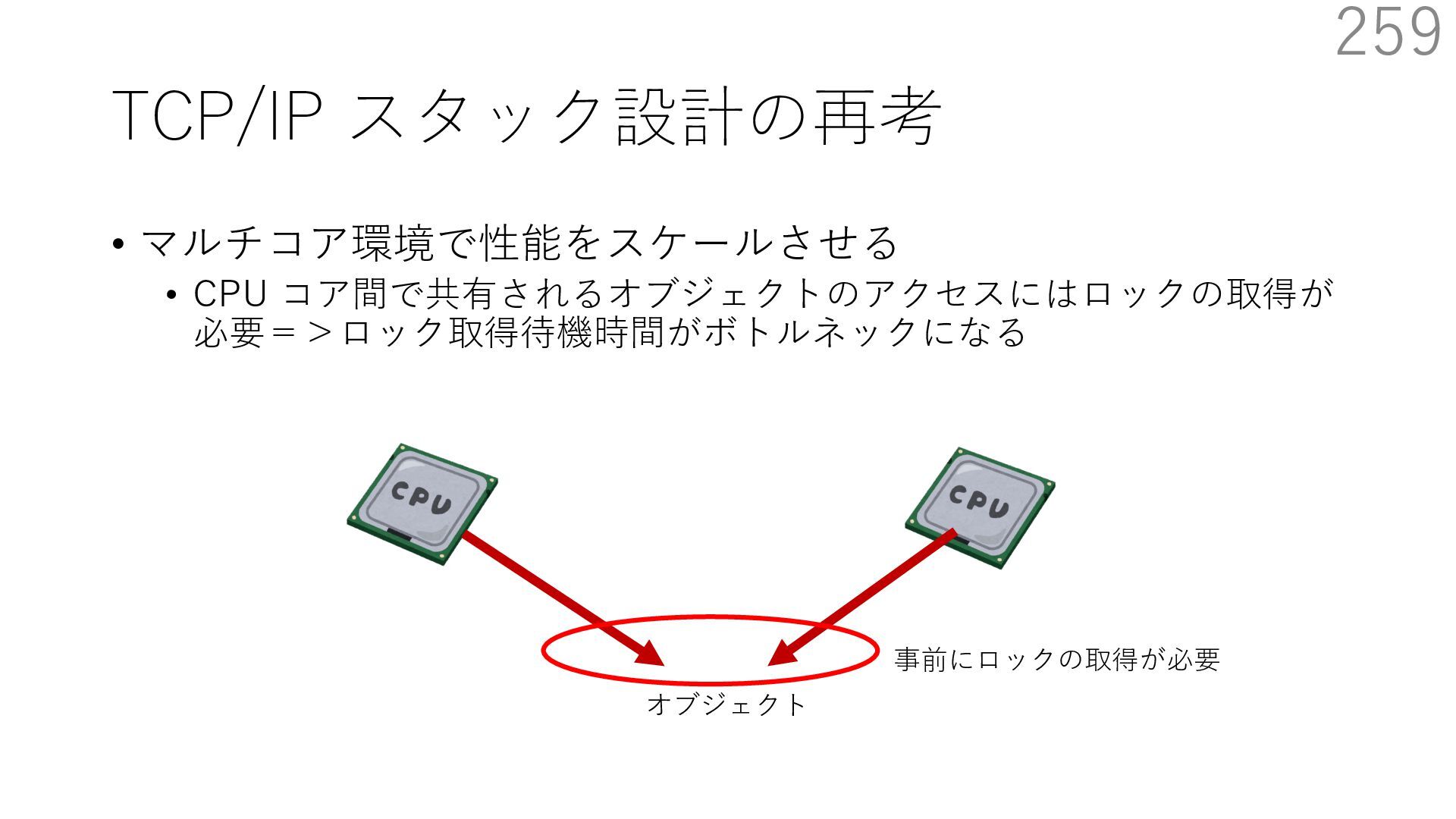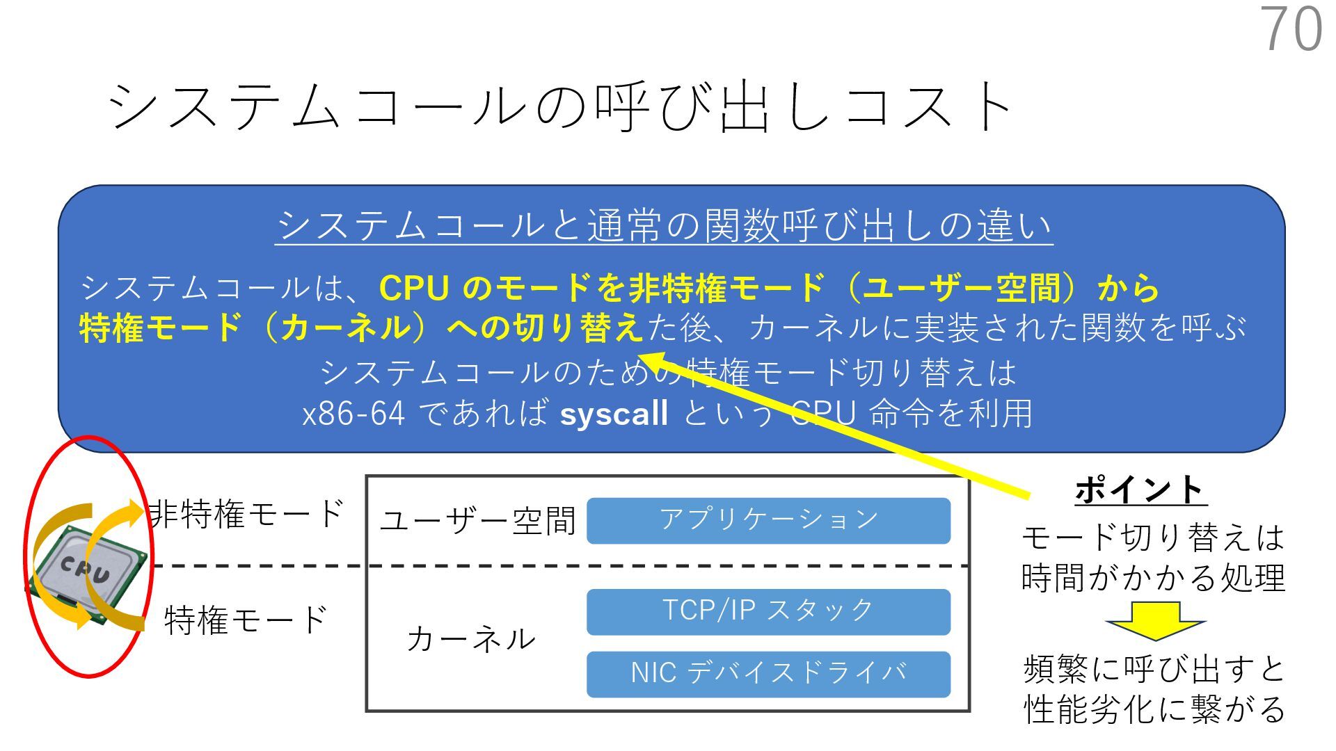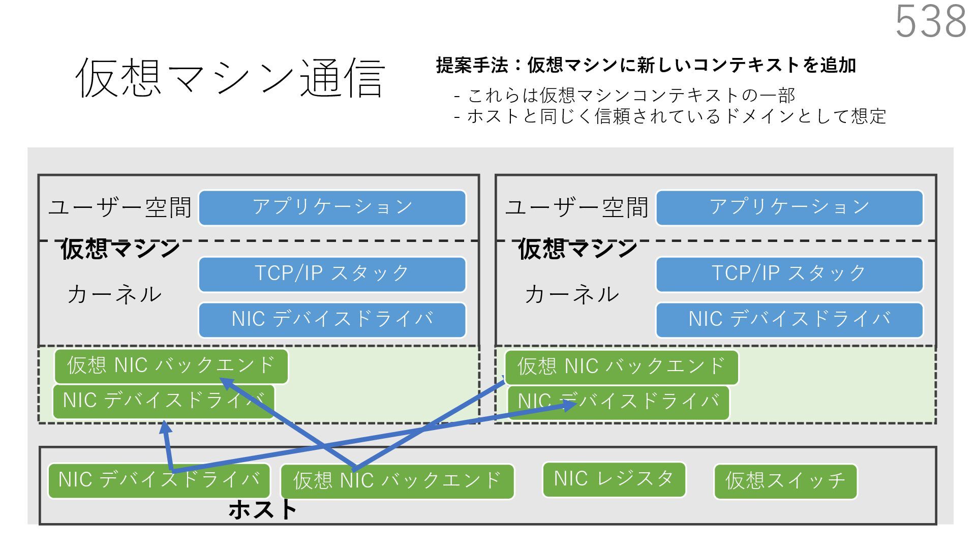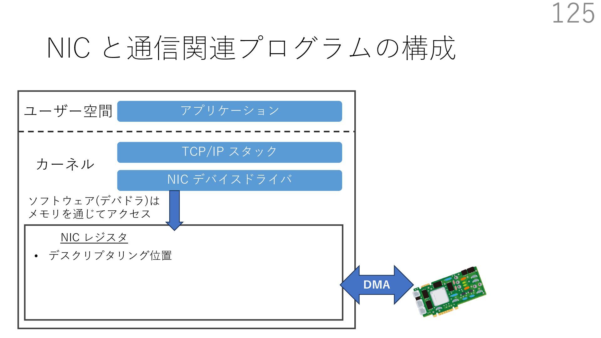 (SIGCOMM 2014) • mTCP (NSDI 2014) • Arrakis (OSDI 2014) • IX (OSDI 2014) • StackMap (USENIX ATC 2016) • Atlas (SIGCOMM 2017) • ZygOS (SOSP 2017) • Shenango (NSDI 2019) • Shinjuku (NSDI 2019) • TAS (EuroSys 2019) • Caladan (OSDI 2020) • Demikernel (SOSP 2021) 427 into a single library for both devices (e.g., RDMAxSPDK). We implemented the bulk of our library OS code in Rust. We initially prototyped several libOSes in C++; however, we found that Rust performs competitively with C++ and achieves ns-scale latencies while offering additional benefits. First, Rust enforces memory safety through language fea- tures and its compiler. Though our libOSes use unsafe code to bind to C/C++ kernel-bypass libraries and applications, User-space Software Kernel-space Software I/O Hardware I/O Device ??? libFuture ??? DPDK User I/O Buf. Mgmt libRDMA RDMA User I/O Buf. Mgmt Net. Trans. OS Kernel Control Path Demikernel Datapath Architecture App libPOSIX libDPDK SPDK User I/O Buf. Mgmt libSPDK Future Demikernel PDPIX Datapath API Figure 3. Demikernel kernel-bypass architecture. Demikernel ac- commodates heterogenous kernel-bypass devices, including poten- tial future hardware, with a flexible library OS-based datapath ar- chitecture.We include a libOS that goes through the OS kernel for 提案:異なるタイプのデバイスへ 共通のインターフェースからアクセス可能にする Irene Zhang, Amanda Raybuck, Pratyush Patel, Kirk Olynyk, Jacob Nelson, Omar S. Navarro Leija, Ashlie Martinez, Jing Liu, Anna Kornfeld Simpson, Sujay Jayakar, Pedro Henrique Penna, Max Demoulin, Piali Choudhury, and Anirudh Badam. 2021. The Demikernel Datapath OS Architecture for Microsecond-Scale Datacenter Systems. In Proceedings of the ACM Sigops 28th Symposium on Operating Systems Principles (SOSP ʼ21), 195-211.(https://doi.org/10.1145/3477132.3483569)
